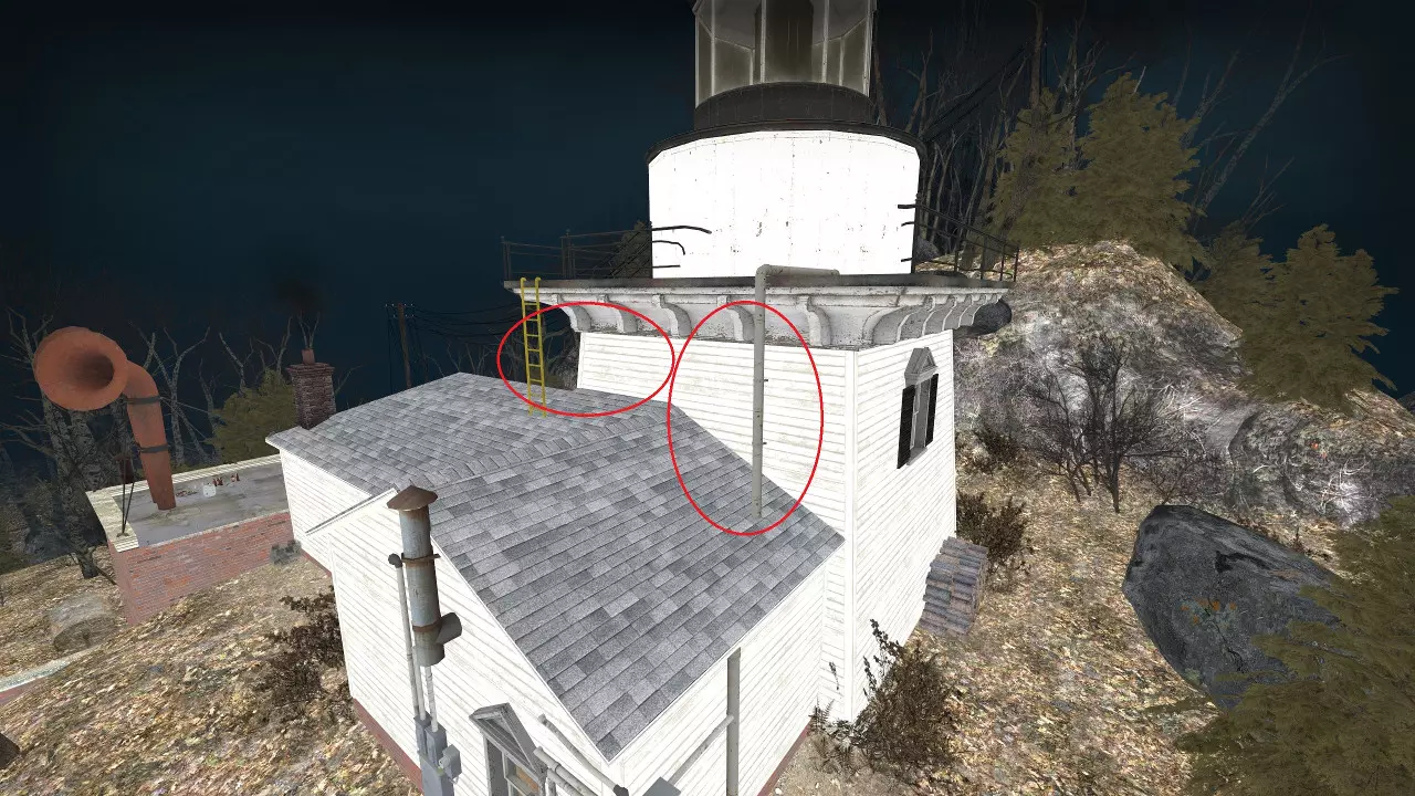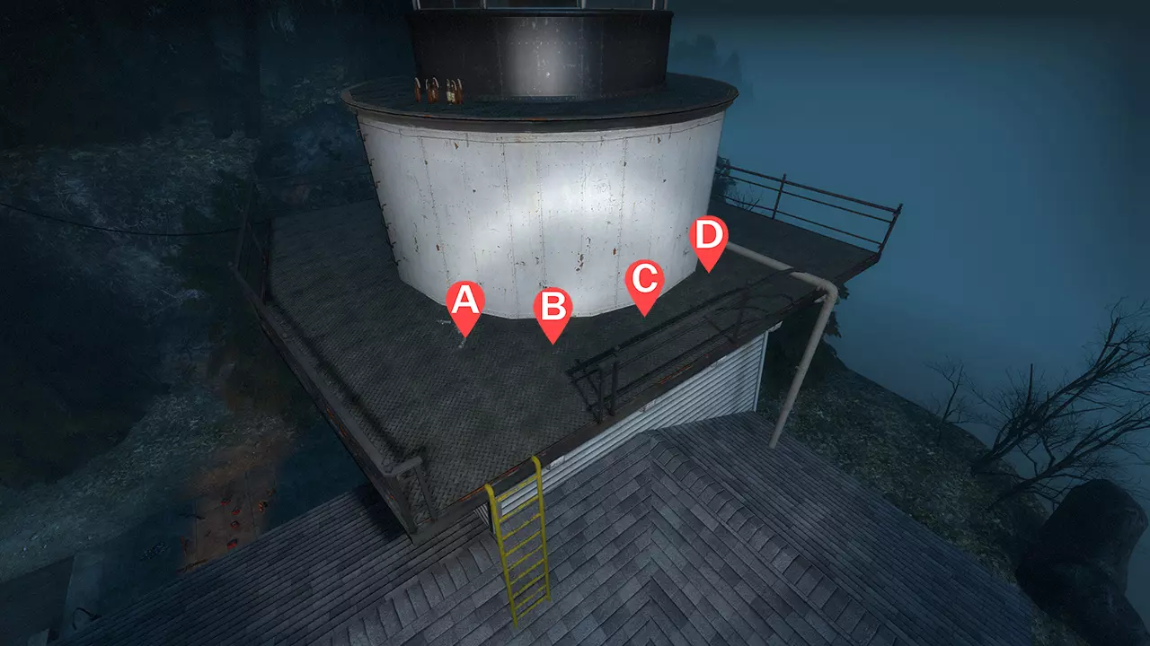 1名幸存者坐在炸药堆上(再往右会容易被屋顶的吸烟者抓住),负责掩护前方和右侧(A) 1名幸存者在旁边掩护,并负责推开吸烟者(以控制烟雾)(B) 1名幸存者同样站在左侧,负责掩护前方、右侧和左侧(C) 1名幸存者在最左侧,负责掩护前方和左侧(D) 注意:幸存者A要引导从最右侧或梯子出现的坦克,以顺时针方向绕着灯塔移动,保持在近战范围外,防止坦克将仇恨转移到其他幸存者身上。如果幸存者坐得比炸药堆更靠右,吸烟者可能会抓住他们。 幸存者B应该用近战攻击将平台上的吸烟者推开。大多数吸烟者会尝试爬梯子;在梯子顶端击杀它们会模糊幸存者A和B的视野。下方的特殊感染者可以在它们爬上来之前,通过地板用手枪击杀。当左侧出现坦克时,站到幸存者C的头顶上方进行射击。当幸存者A正在吸引坦克时,保持距离以免吸引仇恨。 幸存者C负责射击正在攀爬的普通感染者以及任何可能出现的坦克。如果可行,在右侧出现坦克时站立,从幸存者B的头顶上方进行射击。 幸存者D将专注于下方的管道,特殊感染者经常会被困在那里,可以通过地板用手枪击杀。左侧出现的坦克应被引导着绕灯塔逆时针移动。 当屏幕震动时,在看到坦克之前就拿出霰弹枪,因为它们会离得很近。弹药补给 幸存者应在霰弹枪子弹剩余50发时开始寻找弹药。在下去拿弹药前,务必清理梯子上卡住的特感,这一点极为重要(切勿不观察就跳下去)。前往事件开始发电机上方的屋顶获取弹药。幸存者应两人一组行动;队伍的后半部分需等待前半部分返回梯子处再行动。如果附近有坦克,就退回坚守位置。 卡住点位