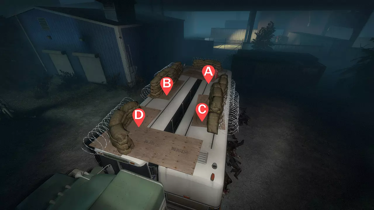 1名幸存者在后方(A) 1名幸存者在右前方沙袋处(B) 1名幸存者在左前方沙袋处(C) 1名幸存者在前方沙袋处(D) 注意事项:游戏进行到14分钟后,由于坦克出现频率高于平时,沟通变得至关重要。贸然攻击猎人相对危险;建议稳妥行事,从远处击杀,或在他们突进前对其造成伤害。不要依赖沙袋来防止被吸烟者拉拽,除非是在游戏后期他们被卡住的情况下。 幸存者A负责应对从后方沙袋间两个缺口出现的普通感染者。未被削弱的猎人会发动跳跃攻击,他们也可能从蓝色建筑的屋顶出现。Boomer有时会蹲在公交车底部,等待幸存者先行动(可通过公交车边缘射击他们)。后方的坦克,以及那些从砖房左侧窗户出现的敌人,在他们爬上公交车前,应尽可能对其造成伤害。永远不要退到其他幸存者身后——最好待在坦克对面的沙袋旁,这样只有一名幸存者会被击中。 幸存者B要像幸存者A一样警惕猎人。当坦克靠近时,退到左侧沙袋处,以便团队其他成员有良好的射击角度。 幸存者C负责观察公交车前方区域,同时也要留意左侧窗户。虽然不常见,但要小心车库门之间的管道——猎人可能会从管道顶部跳下来。幸存者D经常会成为坦克岩石的目标;如果岩石从屋顶(车库门右侧)袭来,要向公交车前方朝着卡车的方向闪避。 弹药补给 弹药补给过程通常很困难,因为很容易遭遇尸潮,更不用说尝试爬回公交车时可能会被普通感染者缠住。建议团队协调好,按特定顺序依次行动,这样留守的幸存者就能在高地上占据绝佳的观察位置。如果有坦克出现,应立即中止弹药补给。 卡住点