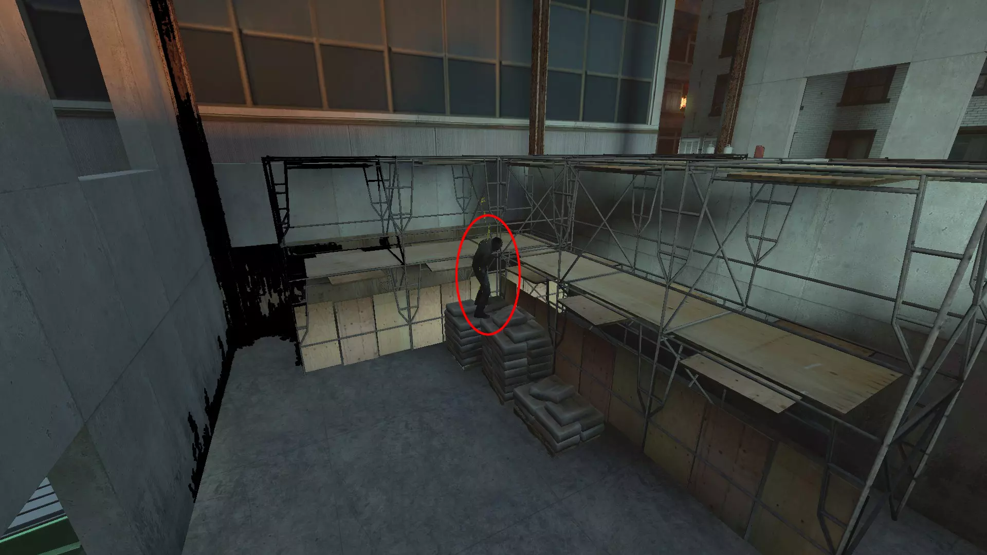 通往汽油罐事件的小巷;在右侧门口稍过去一点,特殊感染者可能会卡在脚手架旁的水泥袋上。终端