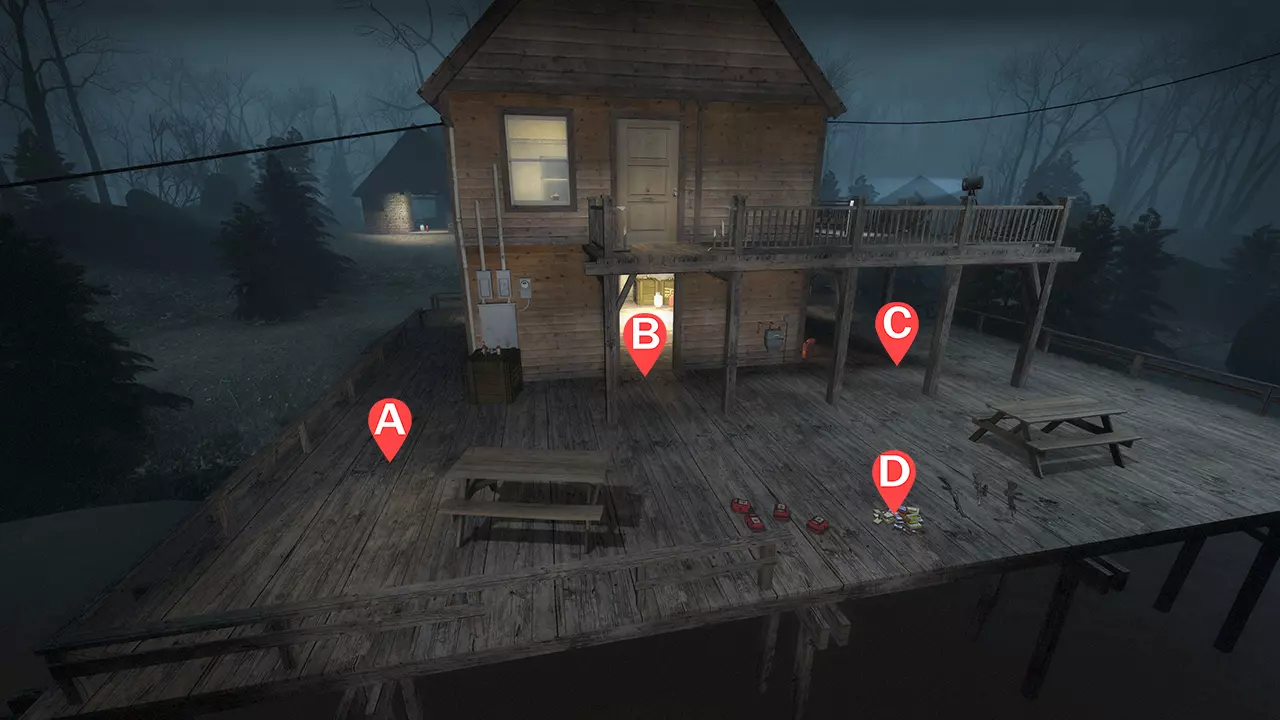 1名幸存者在左侧(A) 1名幸存者守住门口(B) 1名幸存者在右侧(C) 1名幸存者在弹药堆处提供支援(D) 注意事项 幸存者A需要留意来自左侧树林的坦克岩石和猎人。猎人也可能从甲板下方的水中或灌木丛中跳出。普通感染者可能会爬上左侧栏杆,也可能从上方窗户掉落,因此不宜站得太靠前。 幸存者B需要堵住门口,门口有时可能会被烟雾遮挡。必须能够躲避来自房屋前方的吸烟者舌头,并尽可能协助应对来自任何方向的坦克。 幸存者C待在阳台下方,以防止普通感染者攻击其他幸存者。这也让对付普通感染者变得更容易,因为它们会从楼梯上来,而不是从阳台掉落。吸烟者可以穿过左侧的破墙进行拉扯。 如果坦克从房子中间出现,协助击杀它。在对付右侧的坦克时,要注意岩石可以穿过阳台的支撑梁——不要试图引诱坦克向支撑梁投掷岩石。有时右侧的坦克会爬上机枪旁边的阳台,这种情况下,幸存者C可以保持对坦克的视线,将其引诱下来。 幸存者D的主要任务是消灭所有从后方出现和从上方掉落的普通感染者。随时准备支援其他幸存者,包括解救被特殊感染者困住的队友。注意坦克可能会从后方出现。卡住点