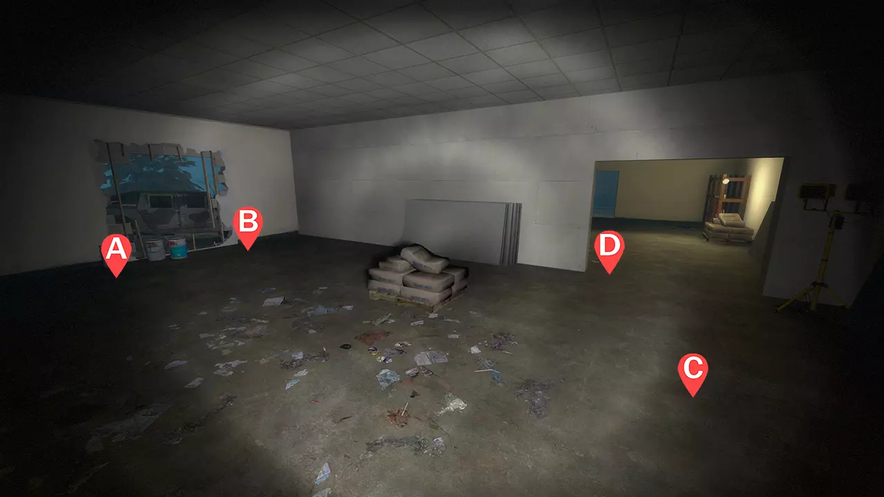 2名幸存者负责守住前方缺口(A和B) 1名幸存者负责守住墙上的洞口(C) 1名幸存者位于主入口后方(D) 注意事项:坚守区域内建筑的所有墙壁都足够薄,可以被射穿。 幸存者A需要不断躲避吸烟者的舌头。此外,幸存者A有时能听到Boomer被困在桥下方的声音。引导坦克沿左墙移动时,注意不要卡在木板封住的窗户边缘。可以利用桌子让坦克也爬上去,为团队争取更多时间。 幸存者B负责确保没有敌人从缺口进入。如果有坦克追击你,边后退边靠近右墙。注意水泥袋和干墙板堆,然后继续向桌子方向移动。如果有特殊感染者卡在大门处,一定要及时通报。与幸存者A交替进行弹药补给,洞口必须始终有人看守。 幸存者C的任务是处理三个主要位置卡住的特殊感染者,在幸存者A或B去拿弹药时负责掩护洞口,并协助击杀所有坦克。 幸存者D需要同时留意多个入口,后方洞口会出现猎人,另一个房间的窗户和破墙外也会有吸烟者。必须确保普通感染者不会从门口突破并干扰其他幸存者。当坦克出现时,和其他人一样,向桌子方向移动以争取时间。 卡住位置