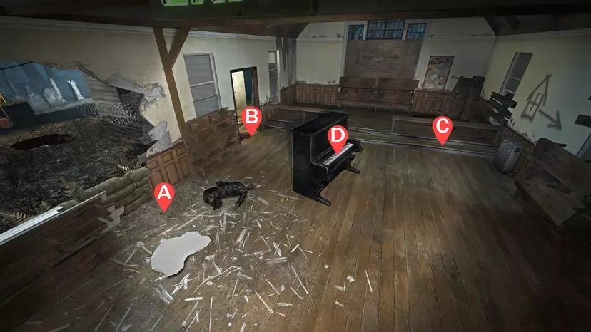 1名幸存者位于沙袋缺口处(A) 1名幸存者堵住门口(B) 1名幸存者守卫后方(C) 1名幸存者站在钢琴键上(D) 注意事项: 幸存者A负责消灭缺口前方的所有敌人,但不要直接站在缺口里。站在翻倒长凳的右侧,保持在沙袋后方。站在这里不仅能让普通感染者更集中,还能防止猎人直接向你扑来,并且向右移动时可以利用墙壁切断吸烟者的舌头。当坦克从缺口出现时,直接后退并绕着钢琴逆时针转圈,这样是为了避免将坦克引向幸存者B。 幸存者B在前方墙壁被破坏后要警惕吸烟者。断墙左边缘并非实体,吸烟者的舌头可以穿过。小房间里的铁栏窗也是如此。若坦克从门口出现,可像幸存者A那样引诱——径直后退,但这次要顺时针绕着钢琴移动。 幸存者C守在栏杆旁。80%~90%的感染者会从栏杆旁的窗户涌入。后方墙壁的任意位置都能穿透射击感染者。尽可能协助对付坦克。若坦克从后方窗户出现,将其引至幸存者B右侧的角落,或引向安全屋门口的燃烧瓶处。 幸存者D站在钢琴键上,担任支援角色。如果幸存者A和B之间的窗户被打破,吸烟者可能会尝试拉人,因此建议利用地图地形来切断舌头。 前往拿取弹药时,幸存者会从缺口离开并紧贴左墙。他们会在弹药堆处停留足够长的时间,让其中一名幸存者狙击被困的吸烟者。要注意感染者会从屋顶落下,并且当幸存者不在教堂内时会在内部生成。 汽油罐存放在无法进入的门和平台上方。 卡点:特殊感染者可能会卡在墓碑上,其中大多数可以通过射击破坏。 吸烟者可能会卡在弹药堆正前方的墙上,可以用步枪清除。