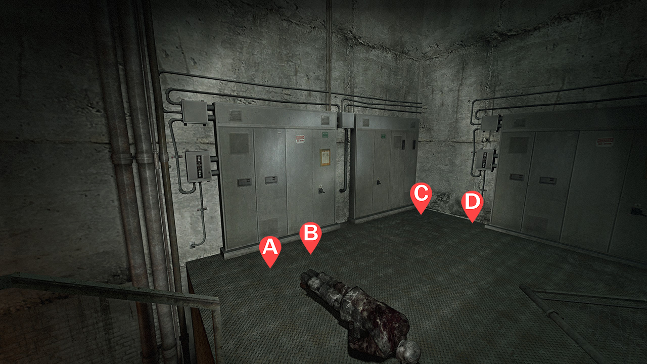 左侧1名幸存者(A) 中间2名幸存者(B和C) 右侧1名幸存者(D) 注意事项:坚守位置为407房间。要在回合开始前进入该房间,幸存者必须用近战攻击门直至门被破坏。12分钟后,建议切换为手枪策略以减少弹药补给的需求。 位置——手枪策略
