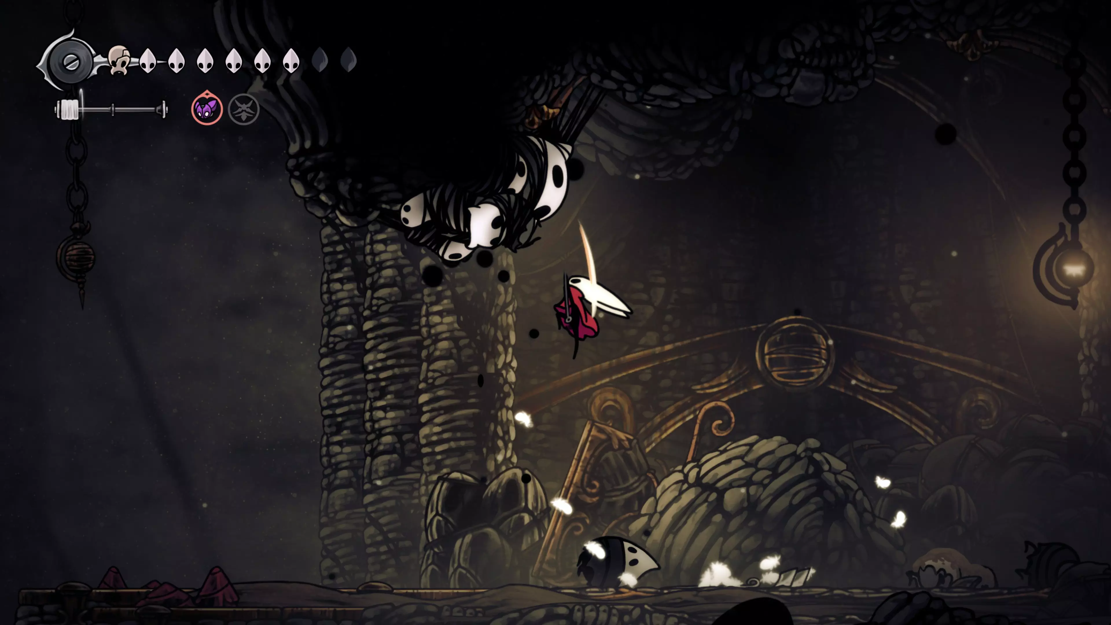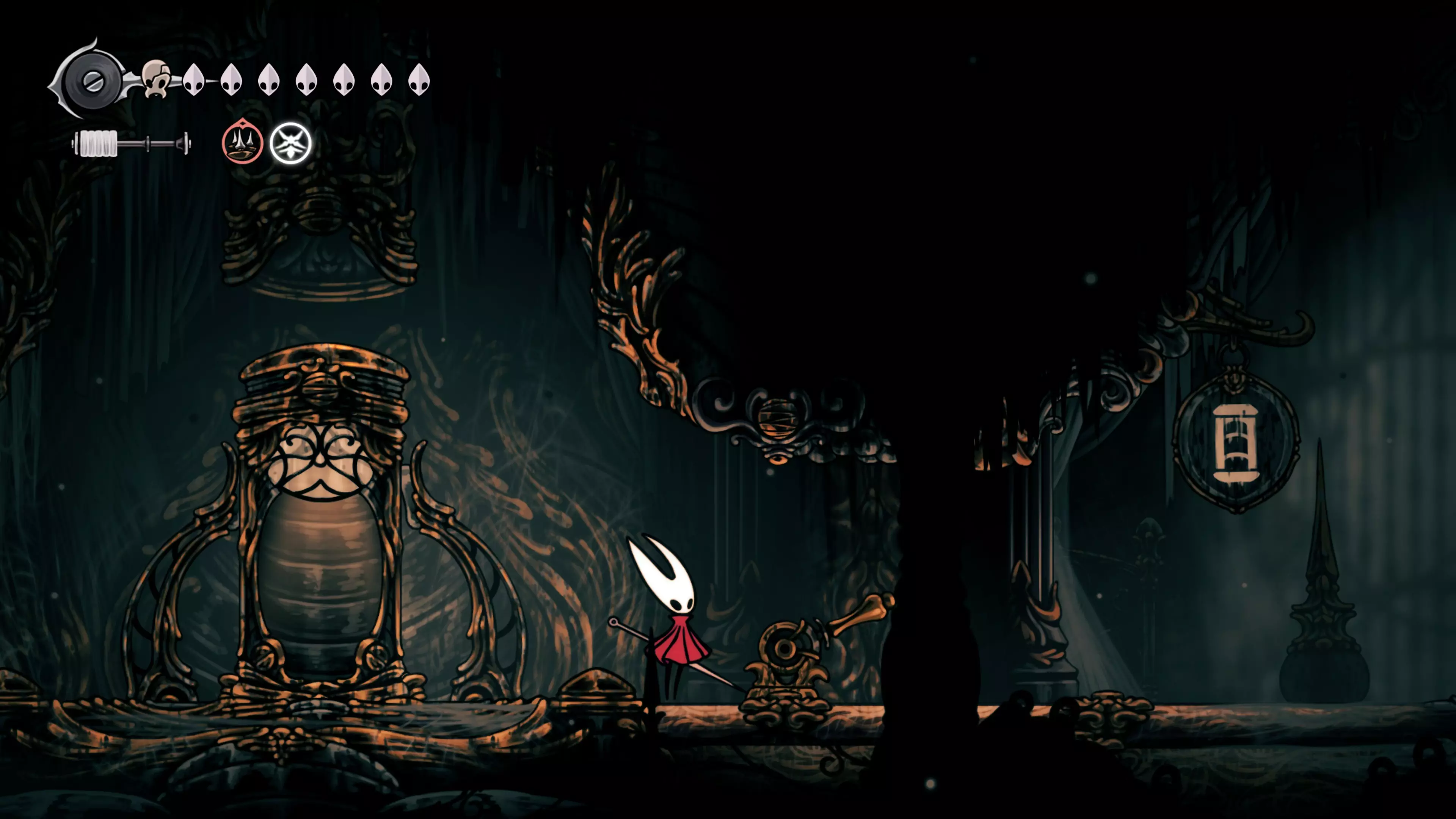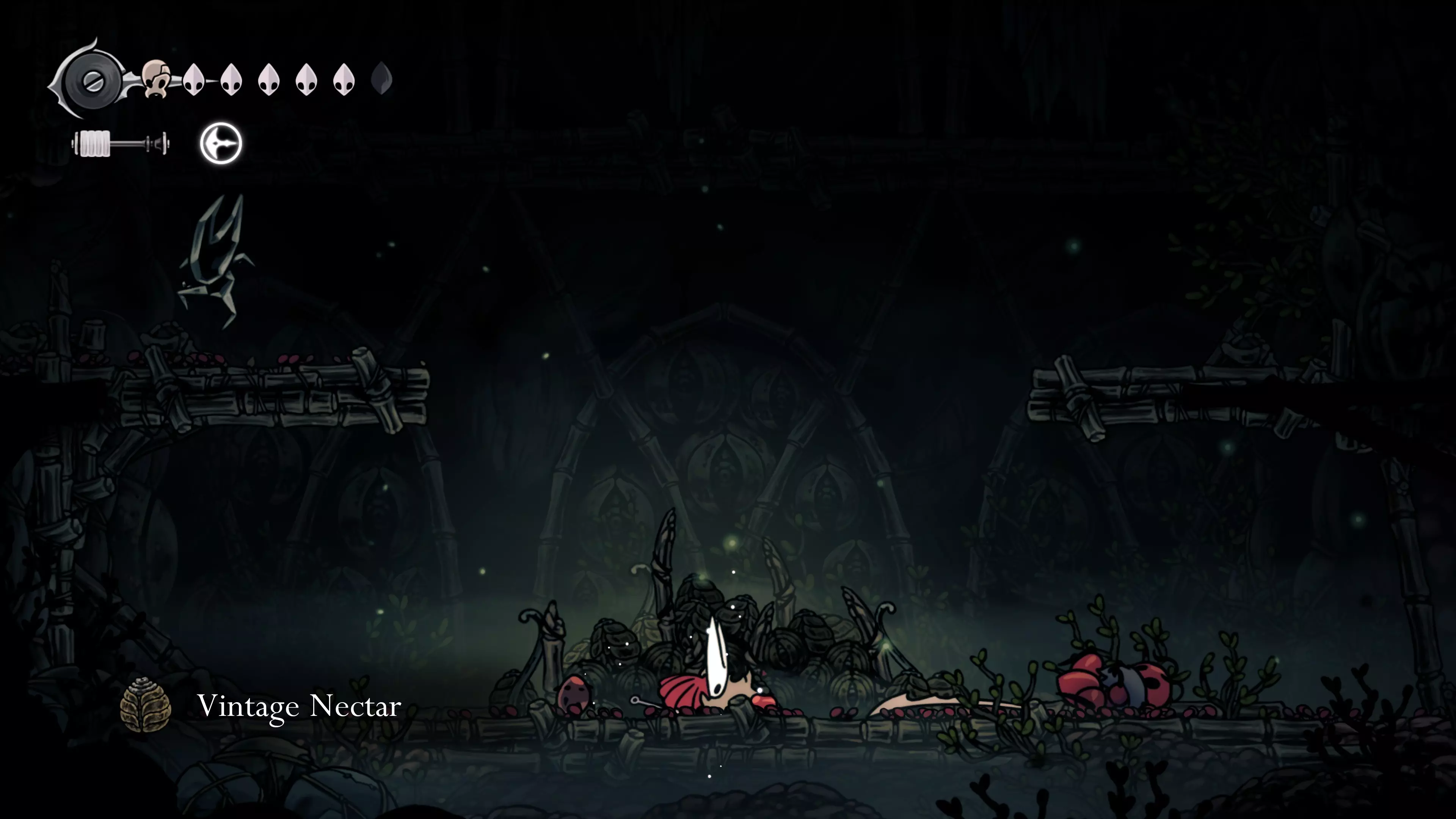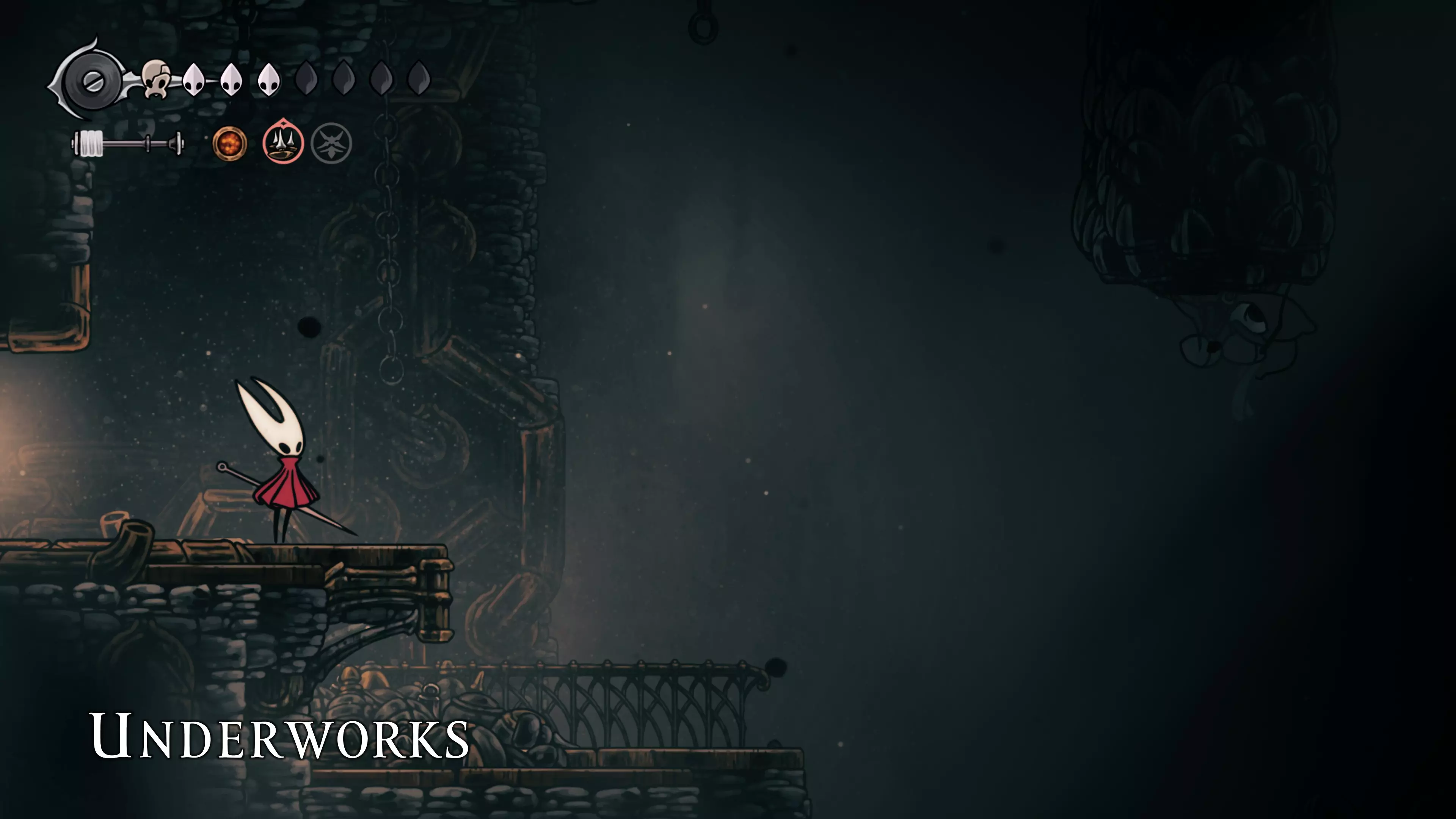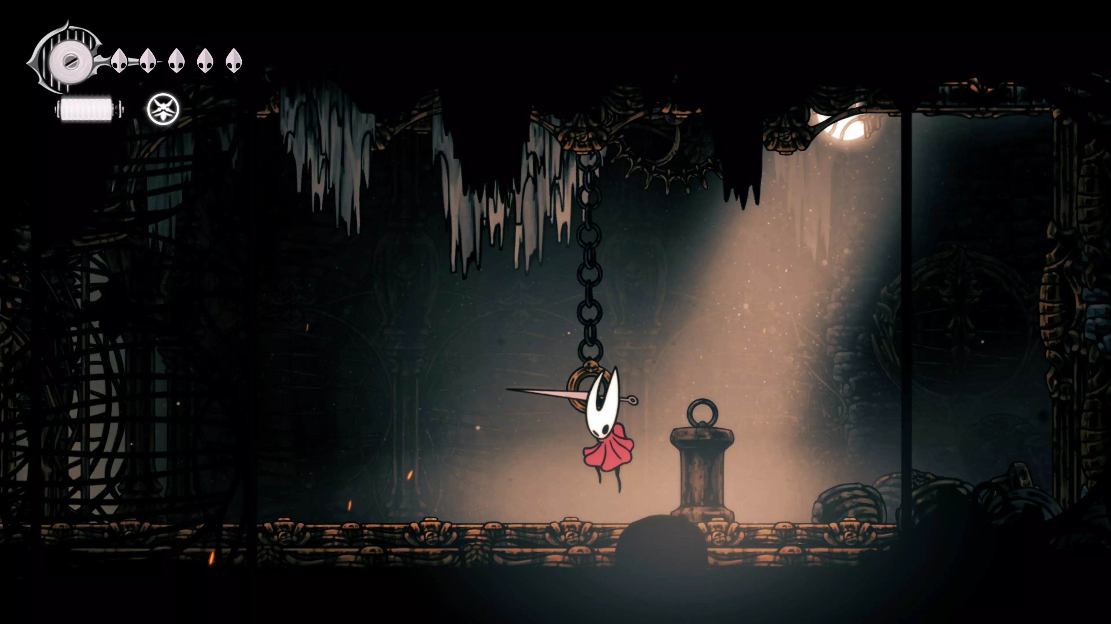 主要目标是前往下一个强化点,途中你会遇到蚂蚁,它们会掉落大量珠子。击败所有蚂蚁来获取一些资源。到达垂直区域后,你会在左下角看到一根管道,通向守护铃铛。这是一个实用的工具,常常能派上用场。