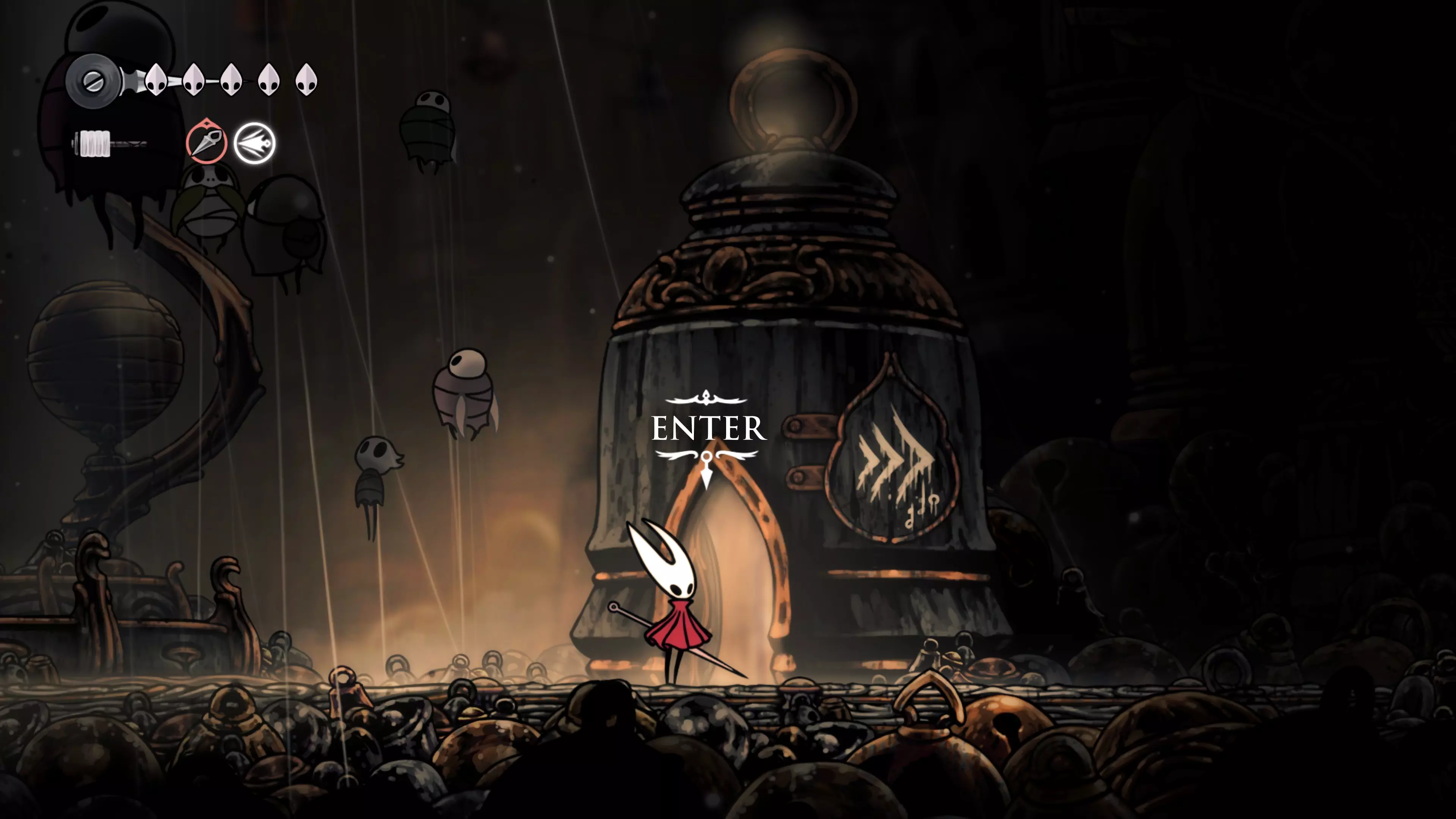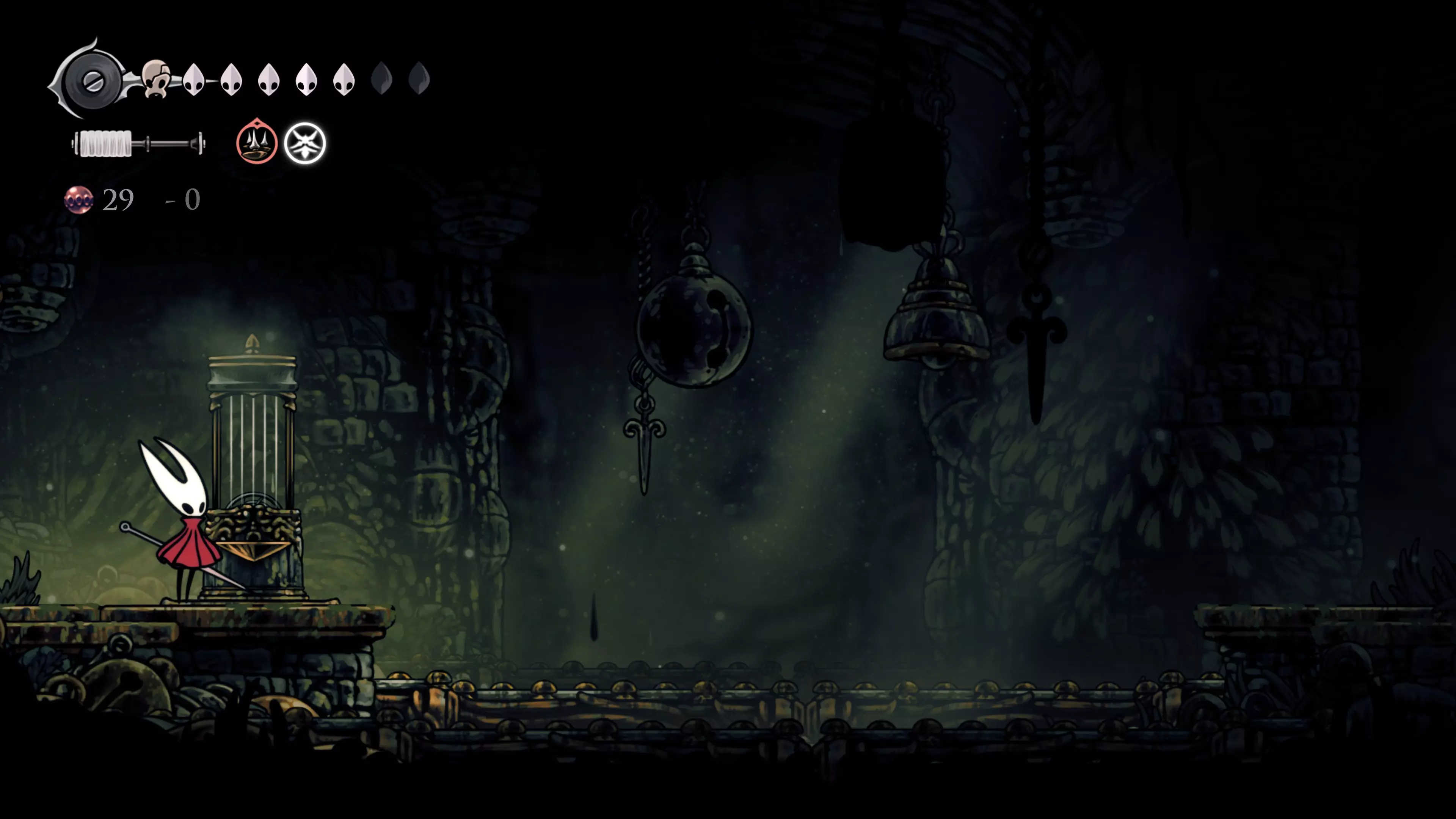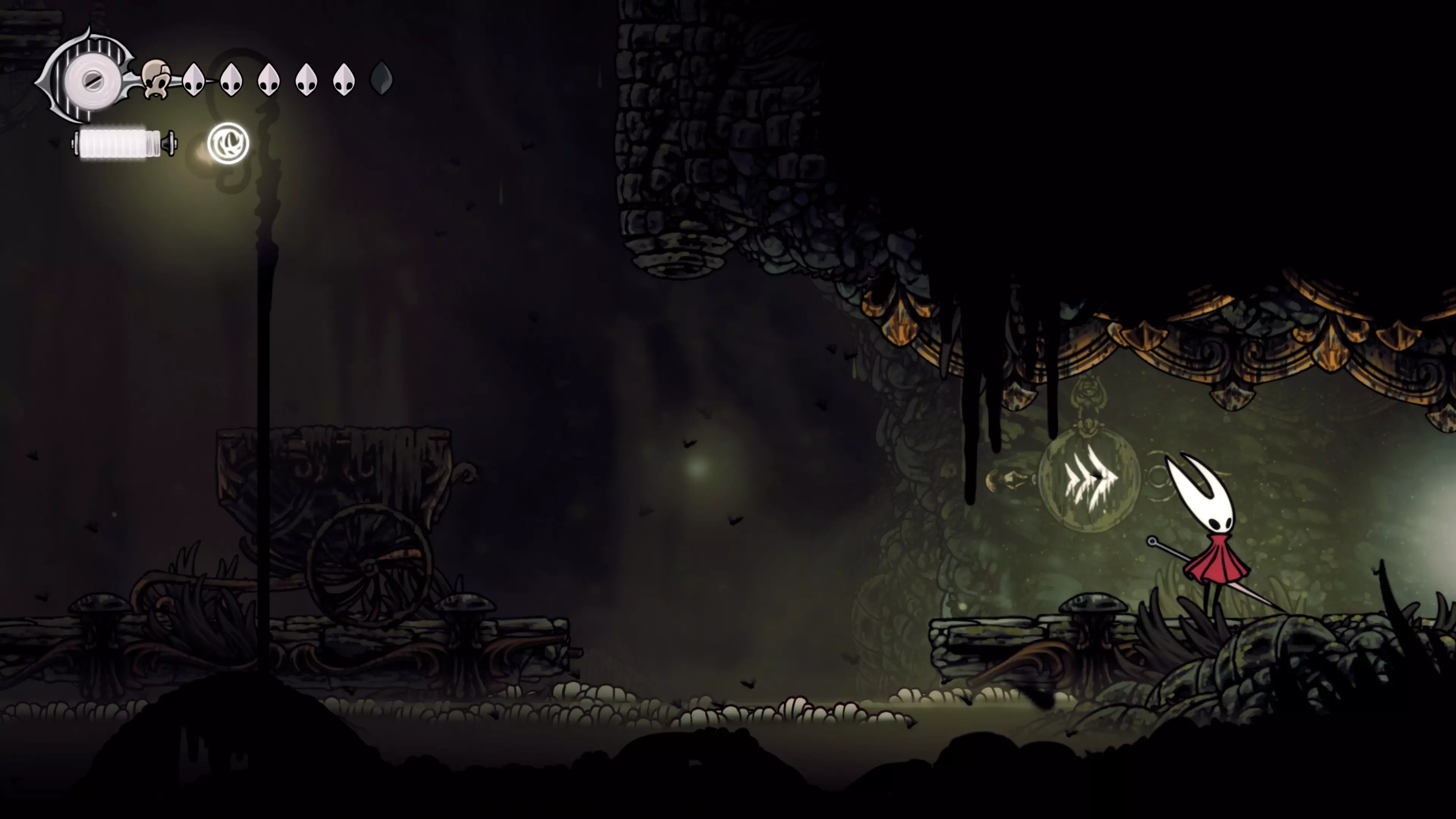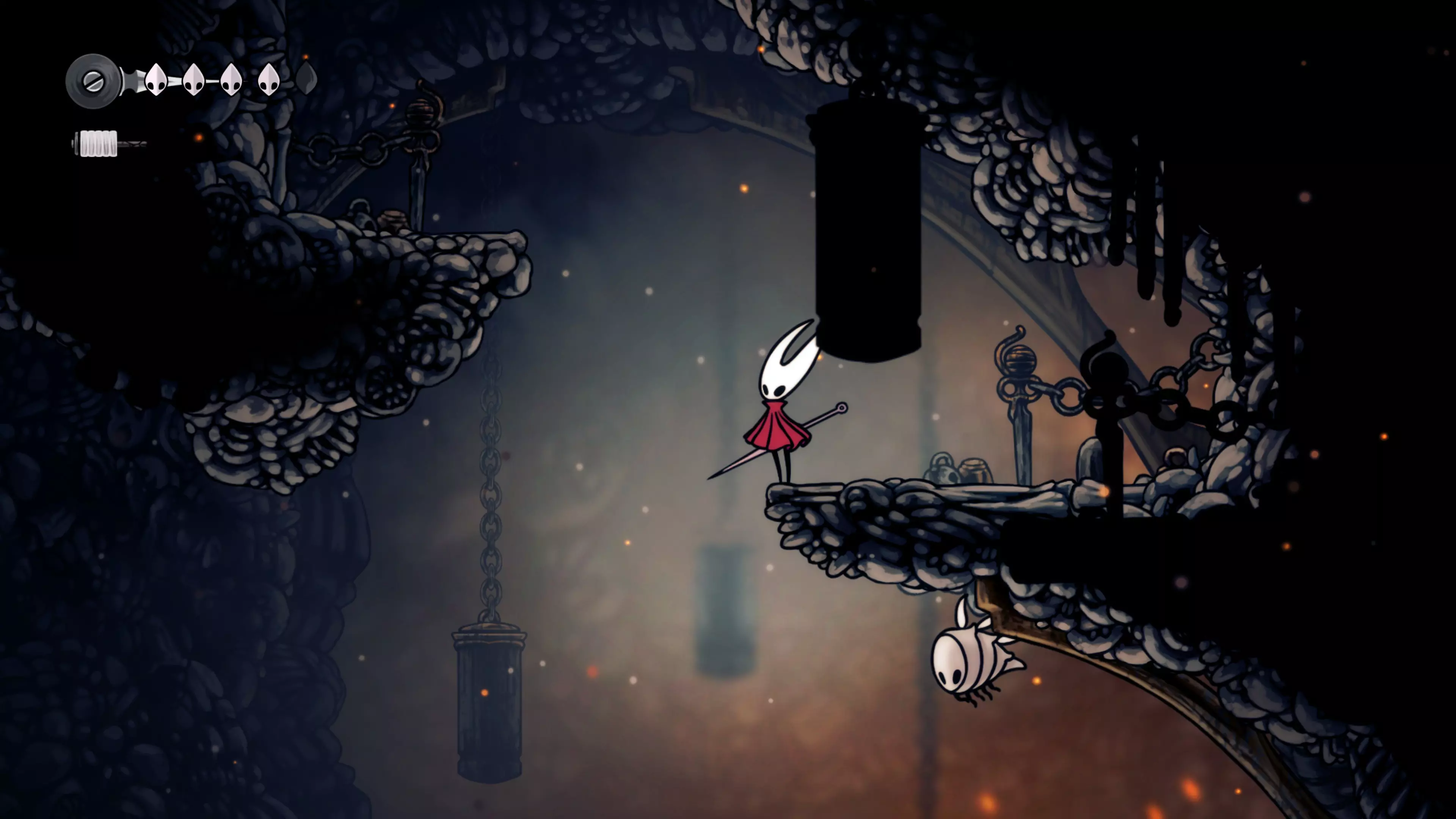 主要目标是前往下一个强化点,途中你会遇到蚂蚁,它们会掉落大量珠子。击败所有蚂蚁来获取一些资源。到达垂直区域后,你会在左下角看到一根管道,通向守护铃铛。这是一个实用的工具,常常能派上用场。