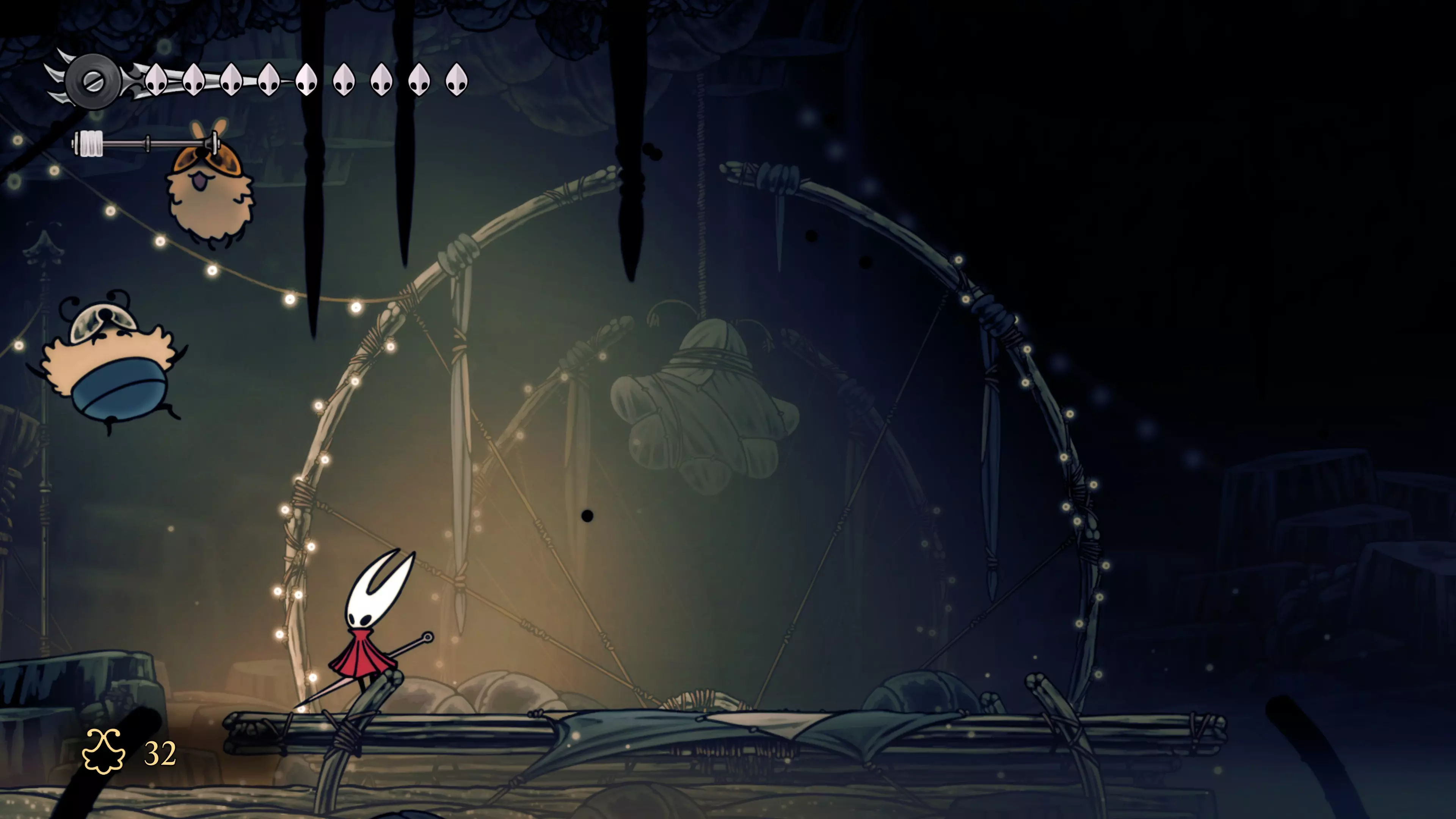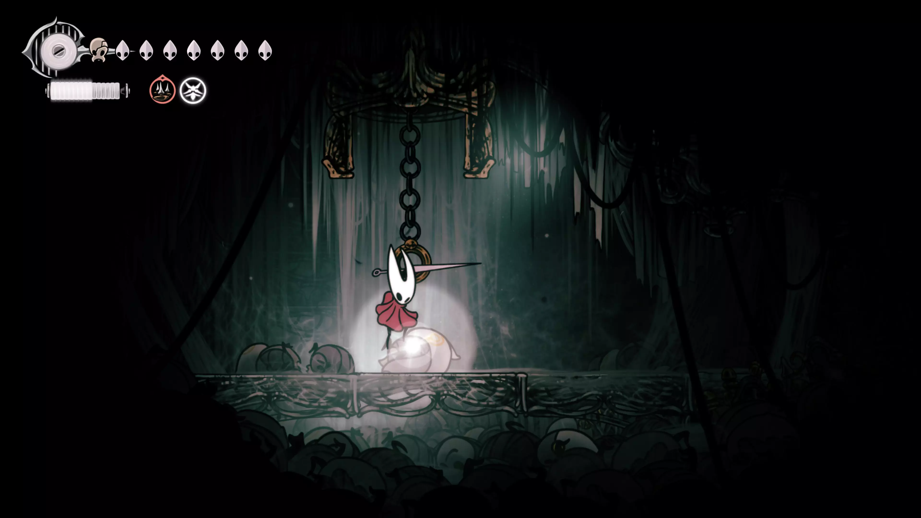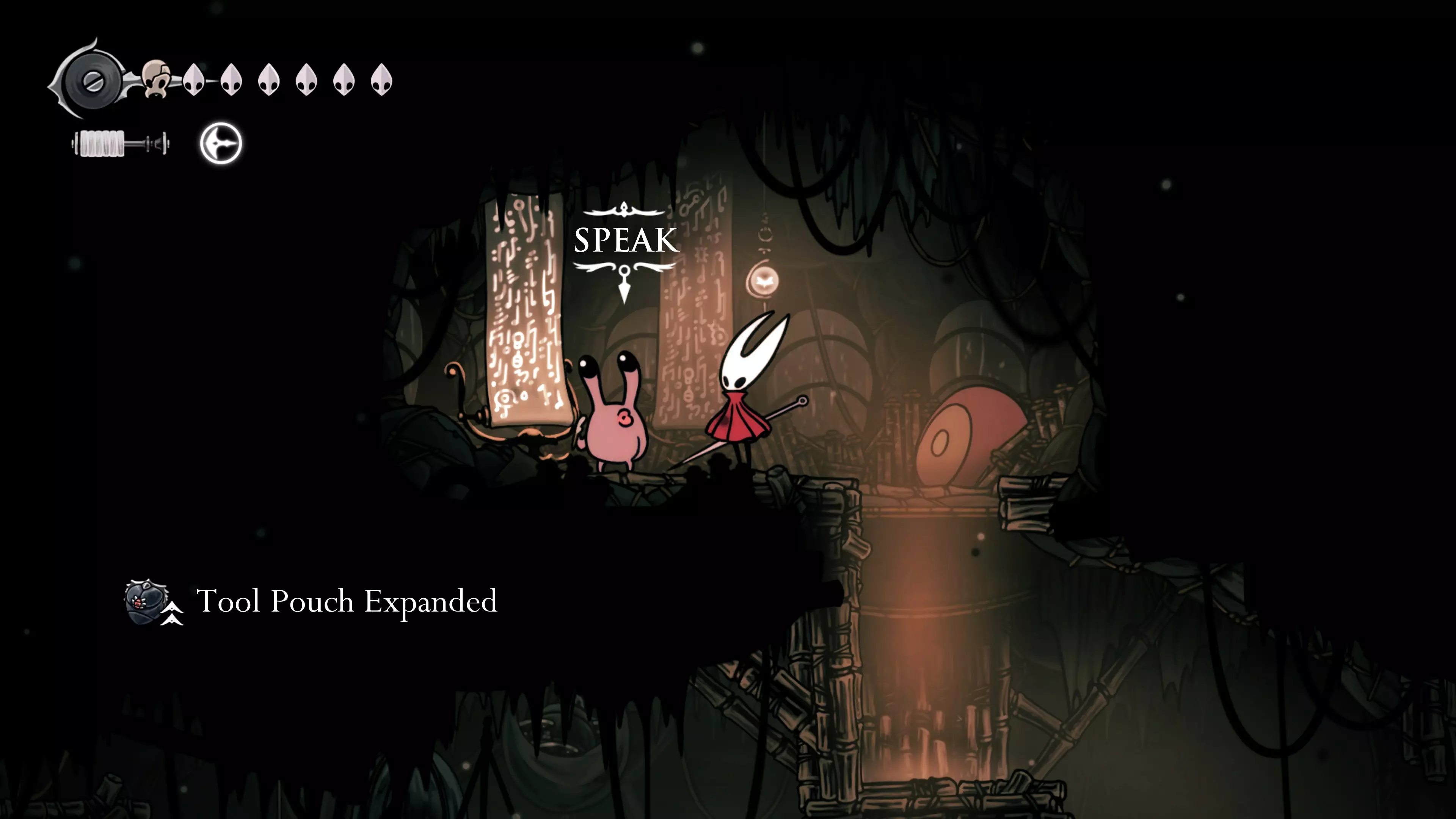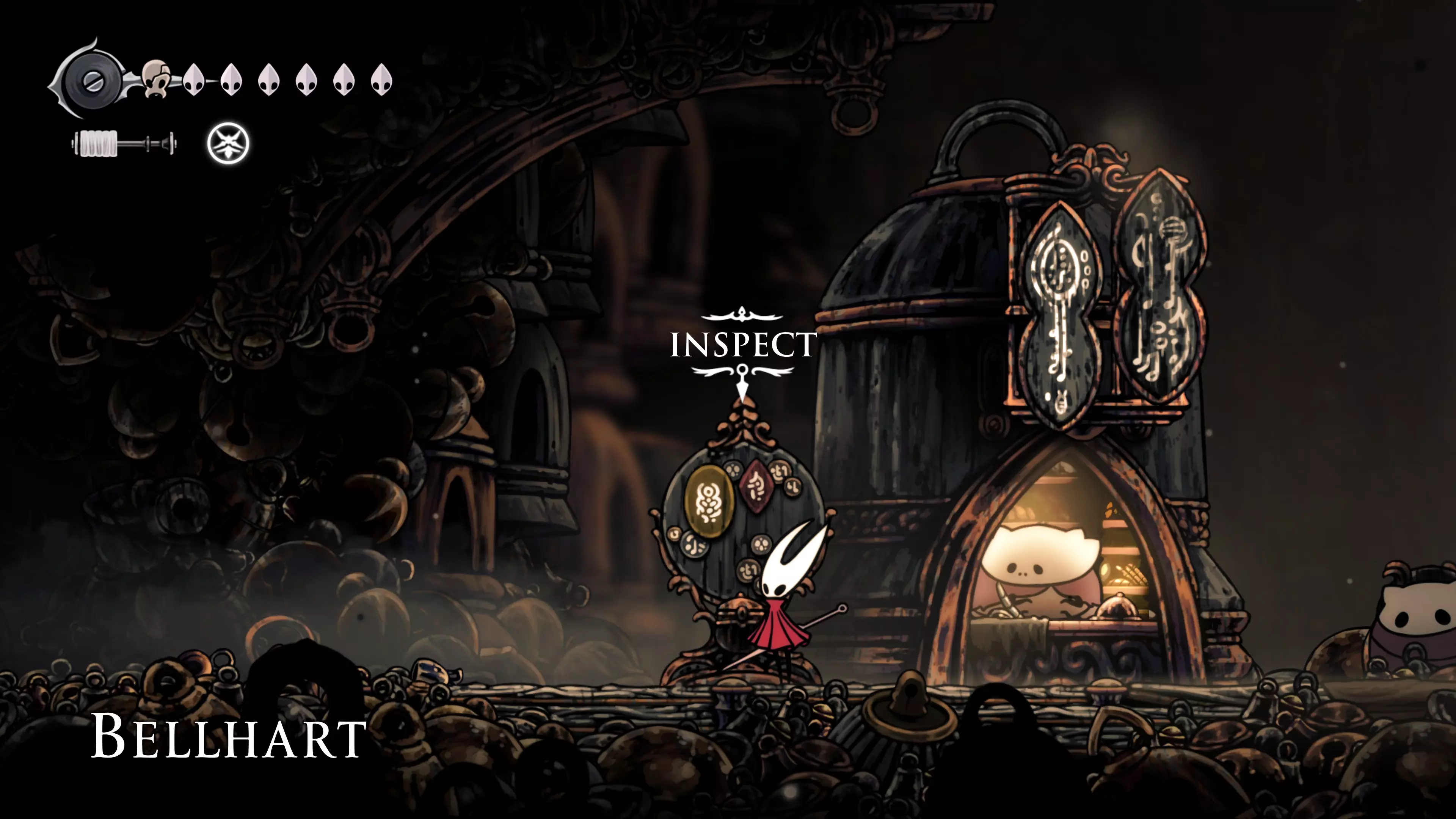 主要目标是前往下一个强化点,途中你会遇到蚂蚁,它们会掉落大量珠子。击败所有蚂蚁来获取一些资源。到达垂直区域后,你会在左下角看到一根管道,通向守护铃铛。这是一个实用的工具,常常能派上用场。