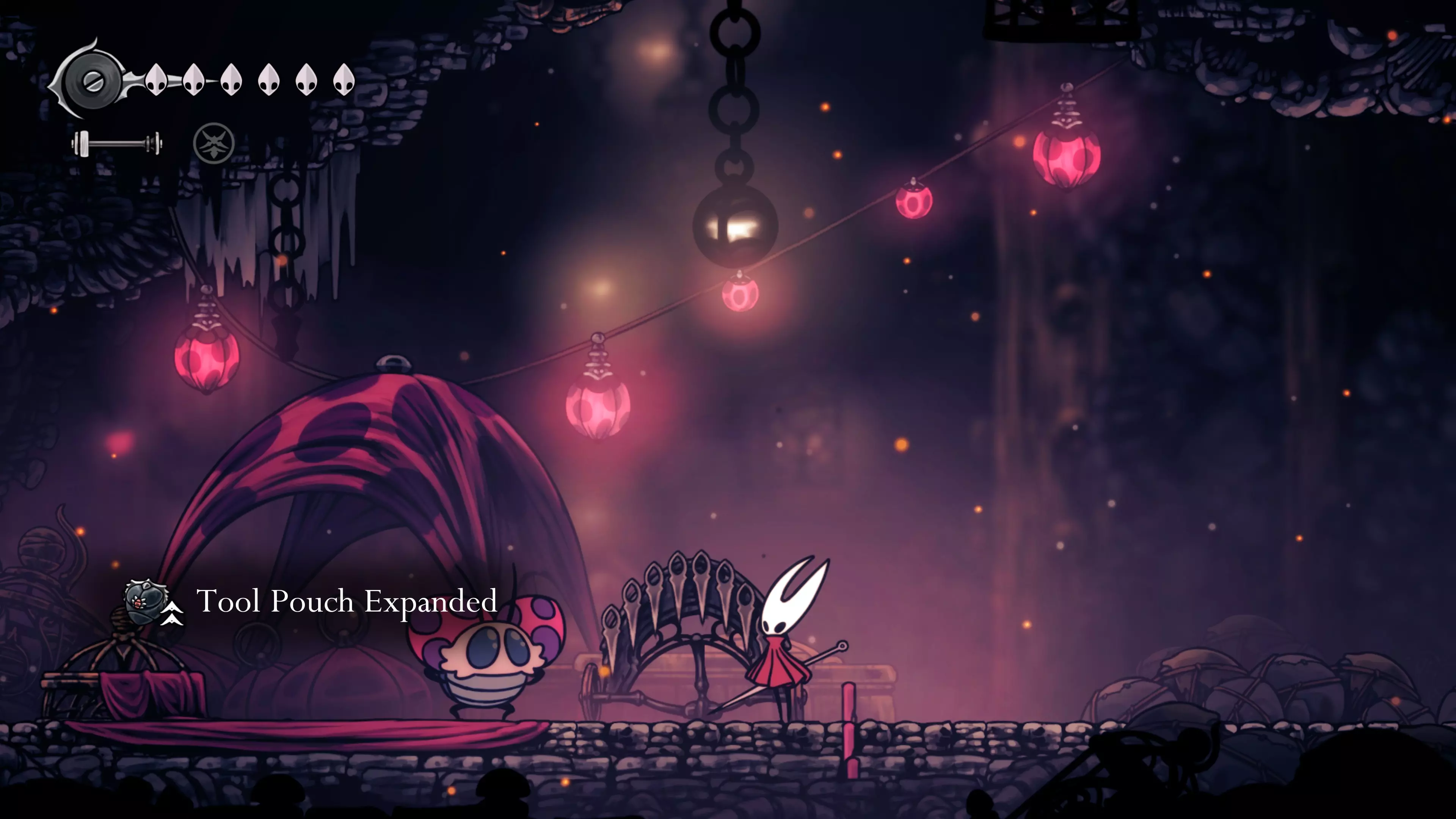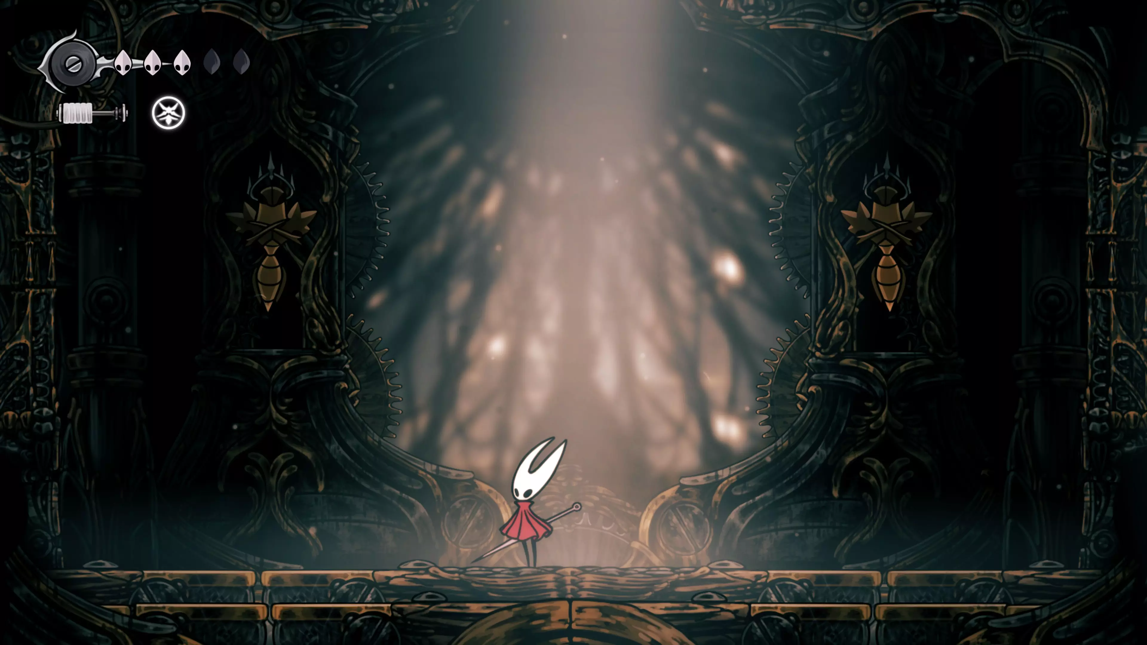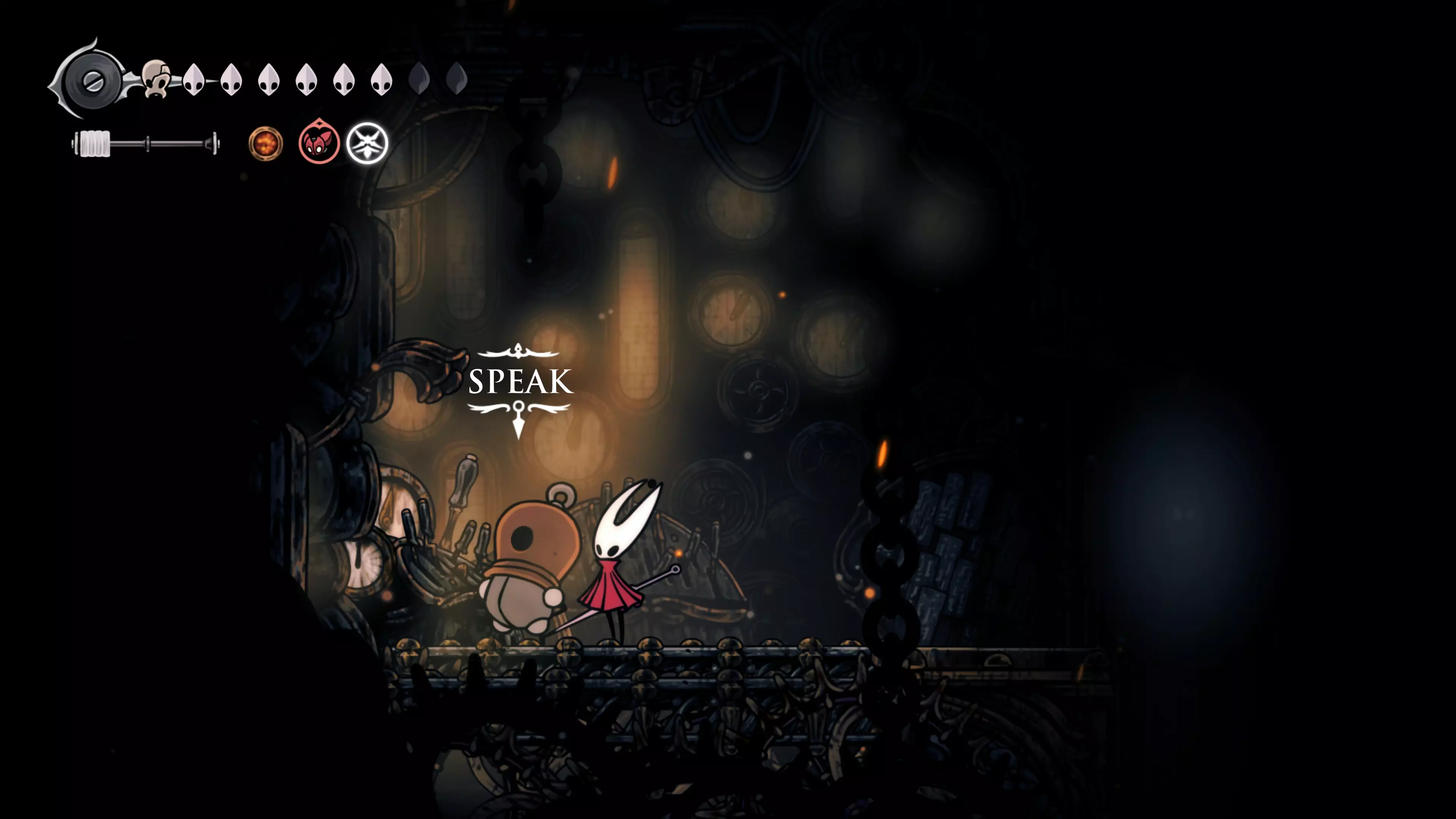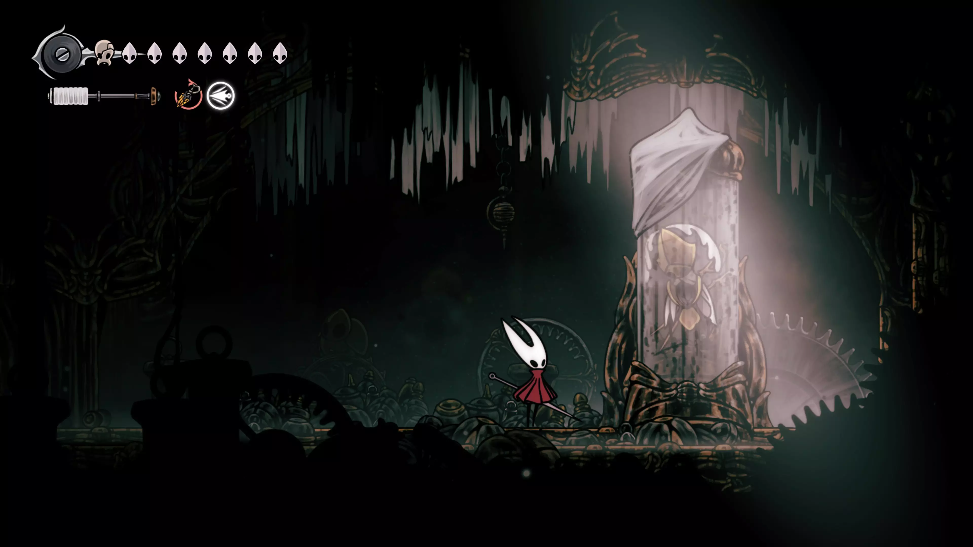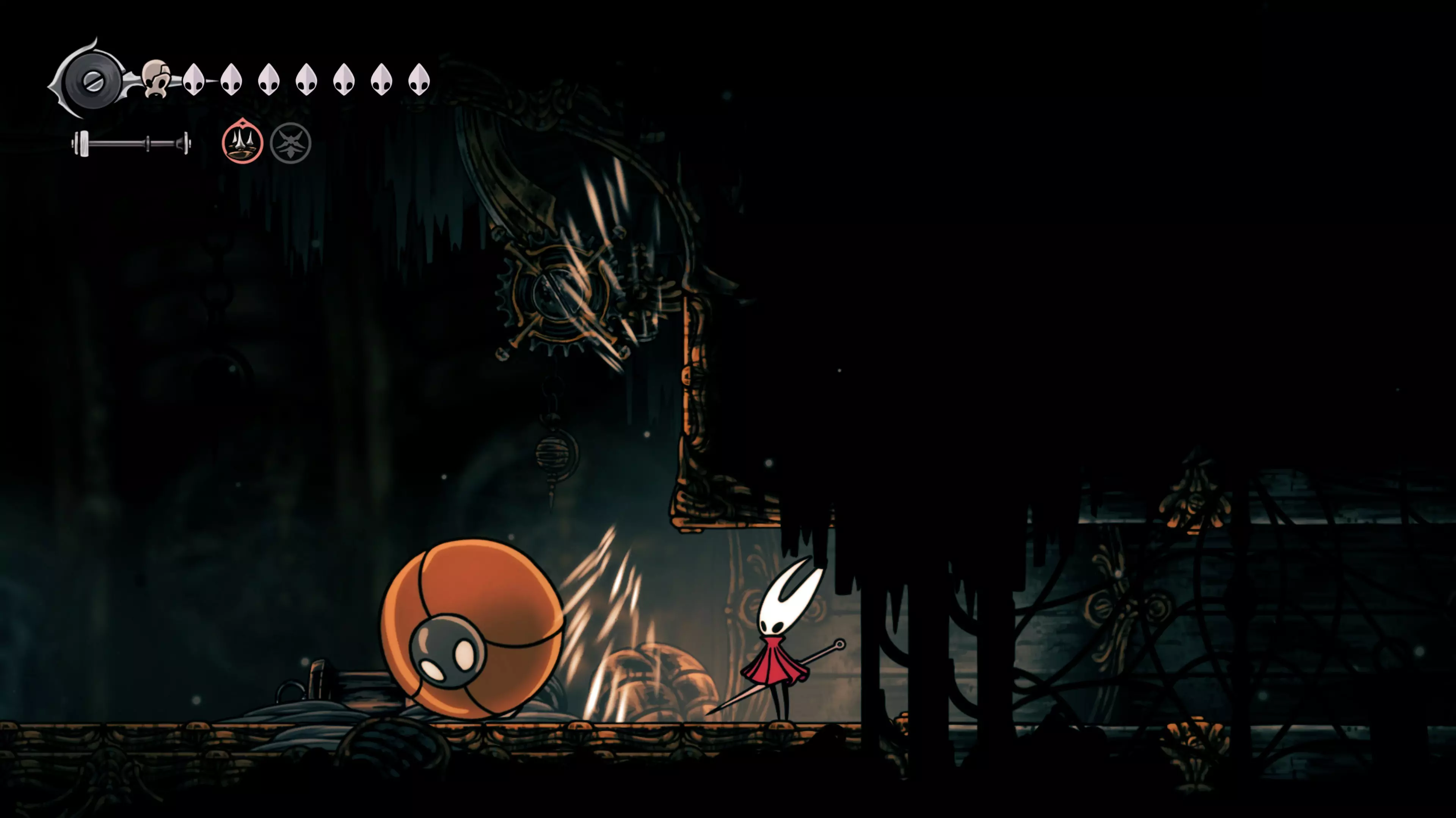 主要目标是前往下一个强化点,途中你会遇到蚂蚁,它们会掉落大量珠子。击败所有蚂蚁来获取一些资源。到达垂直区域后,你会在左下角看到一根管道,通向守护铃铛。这是一个实用的工具,常常能派上用场。