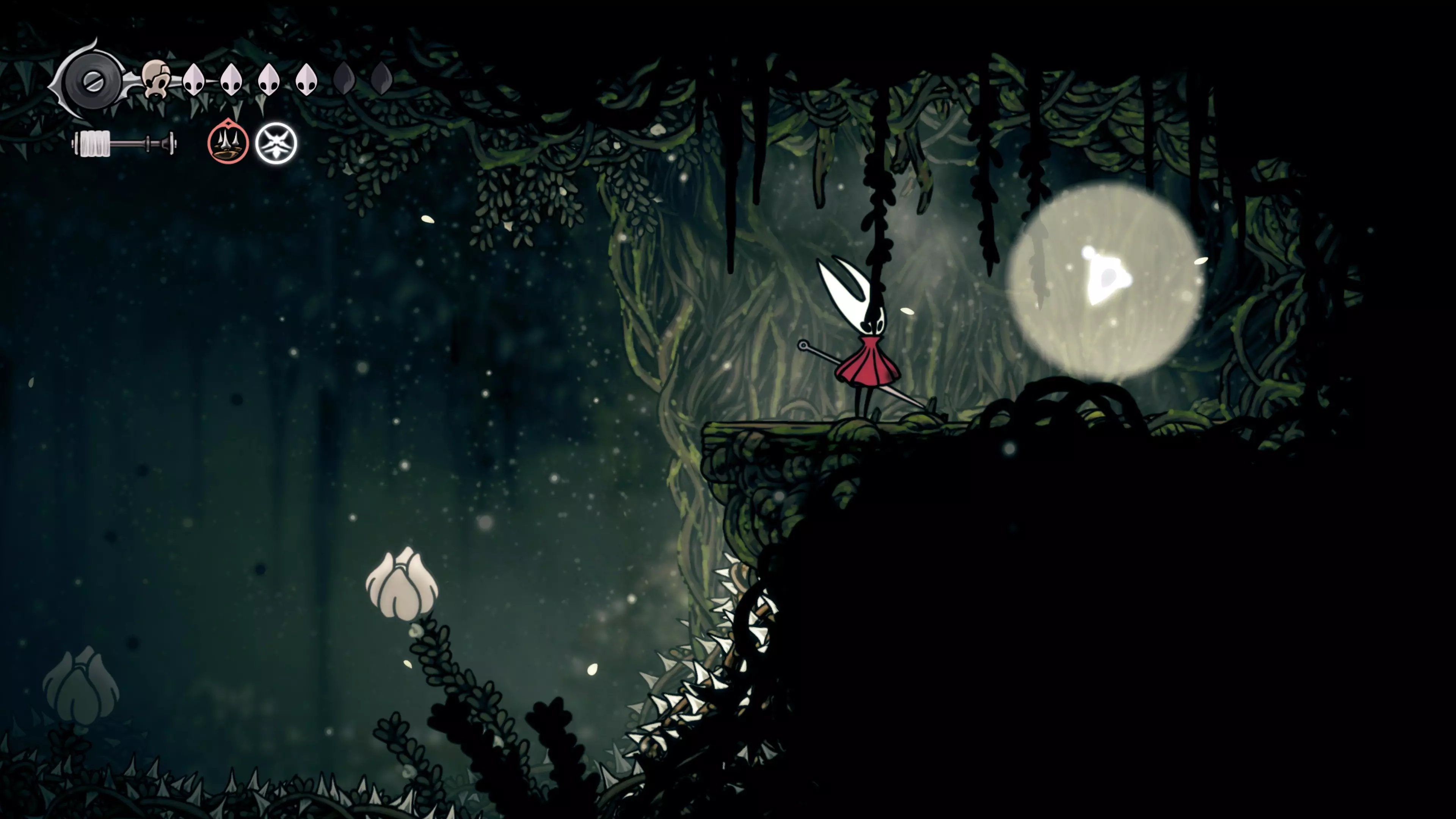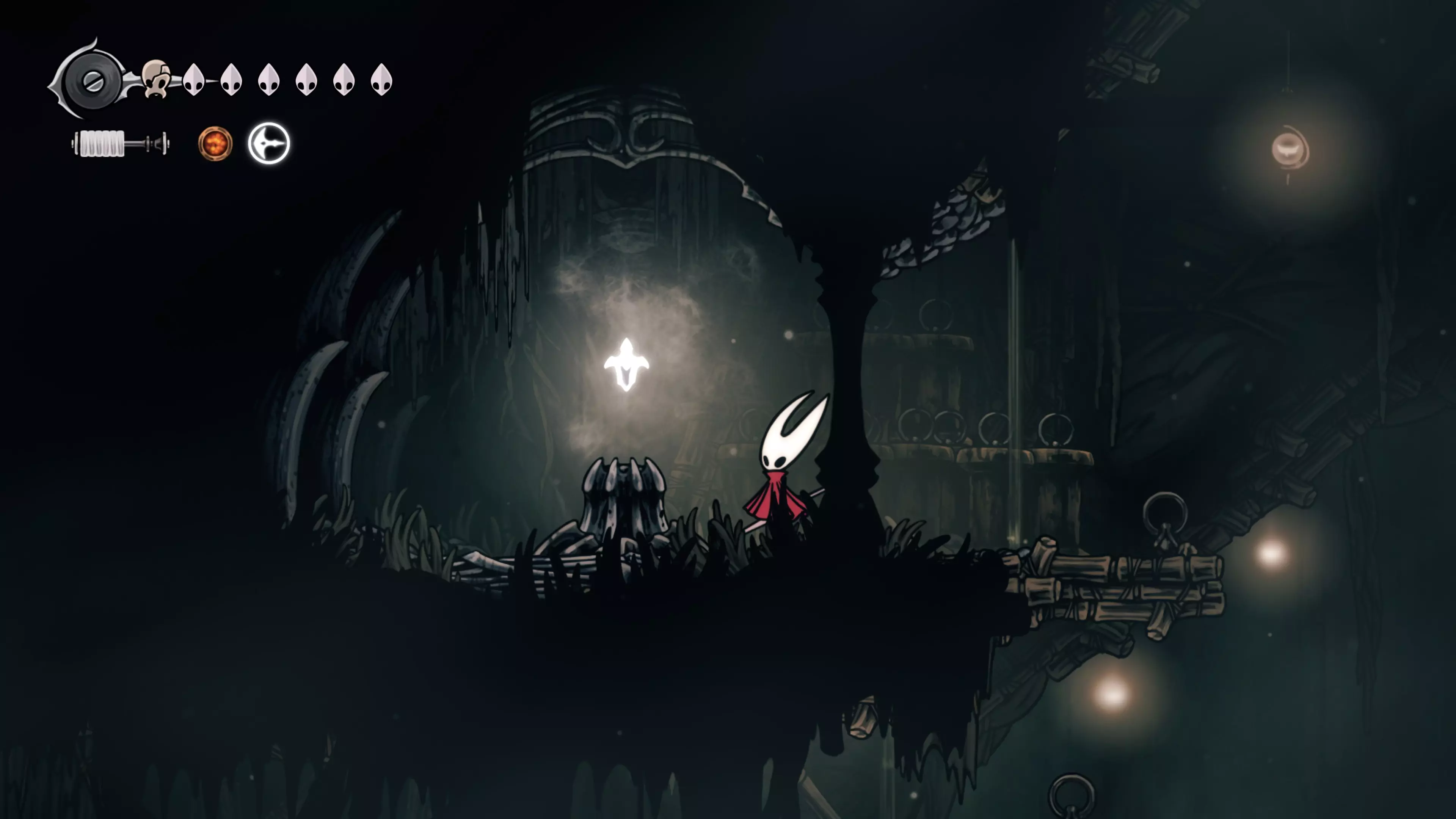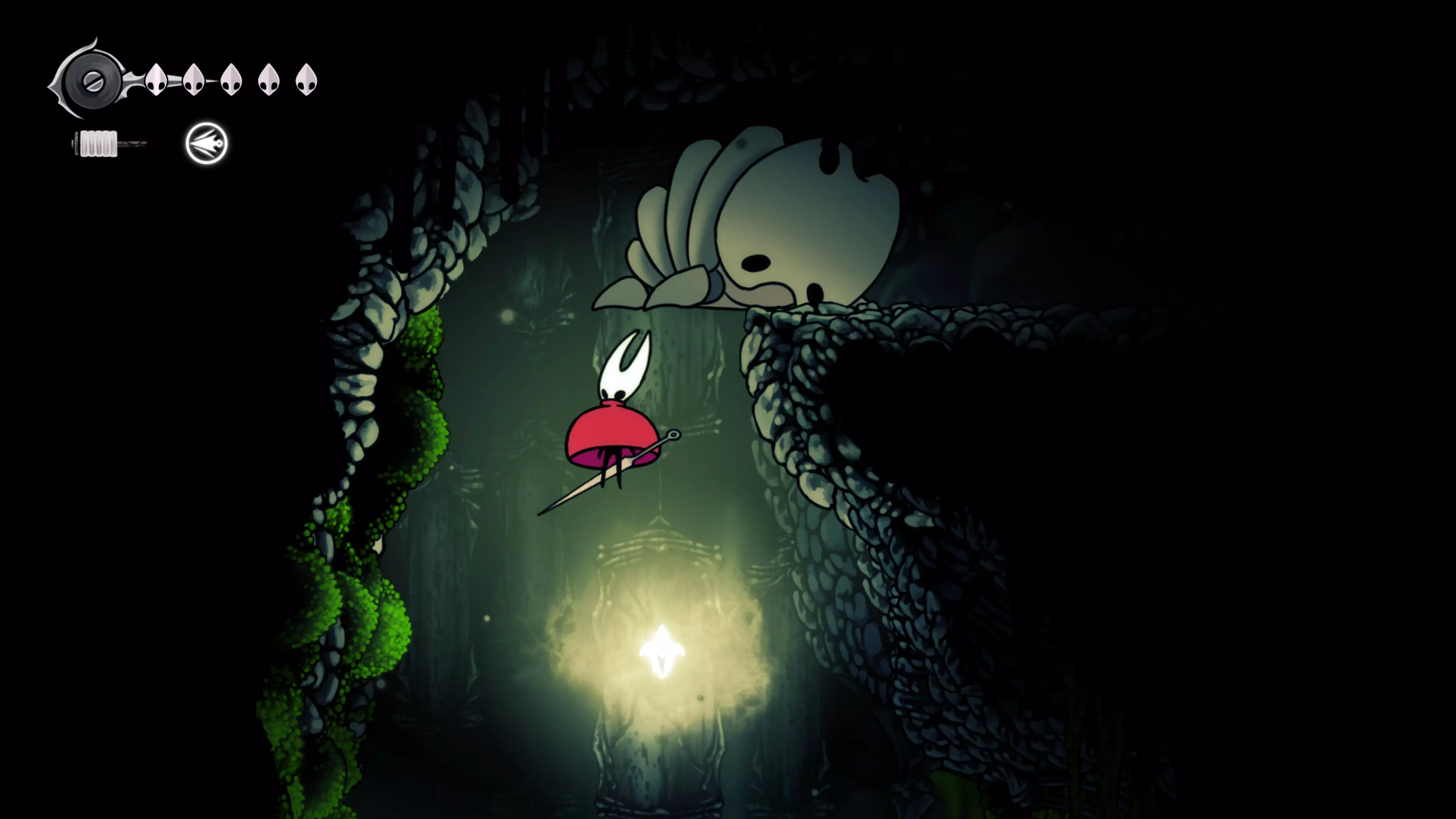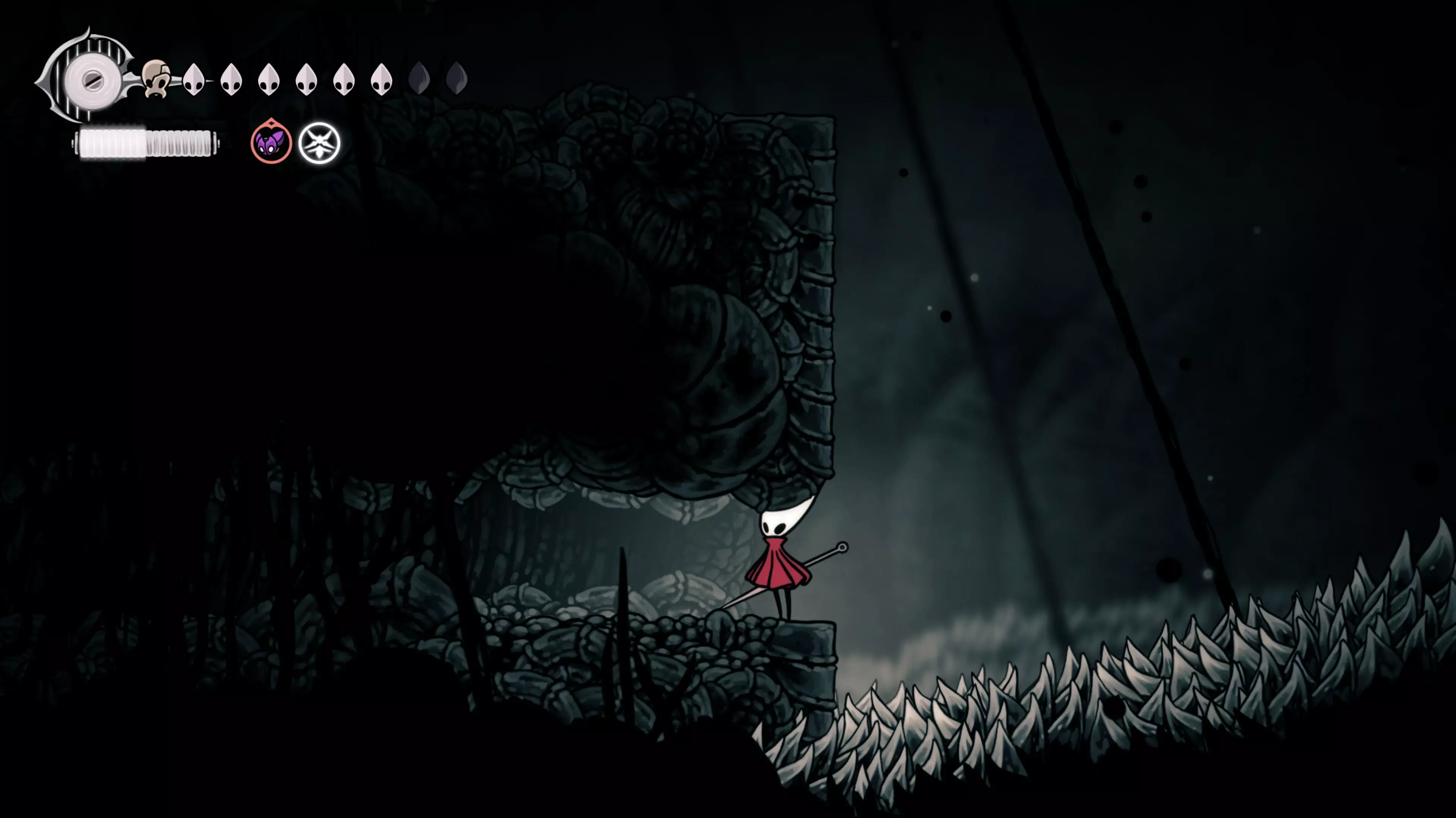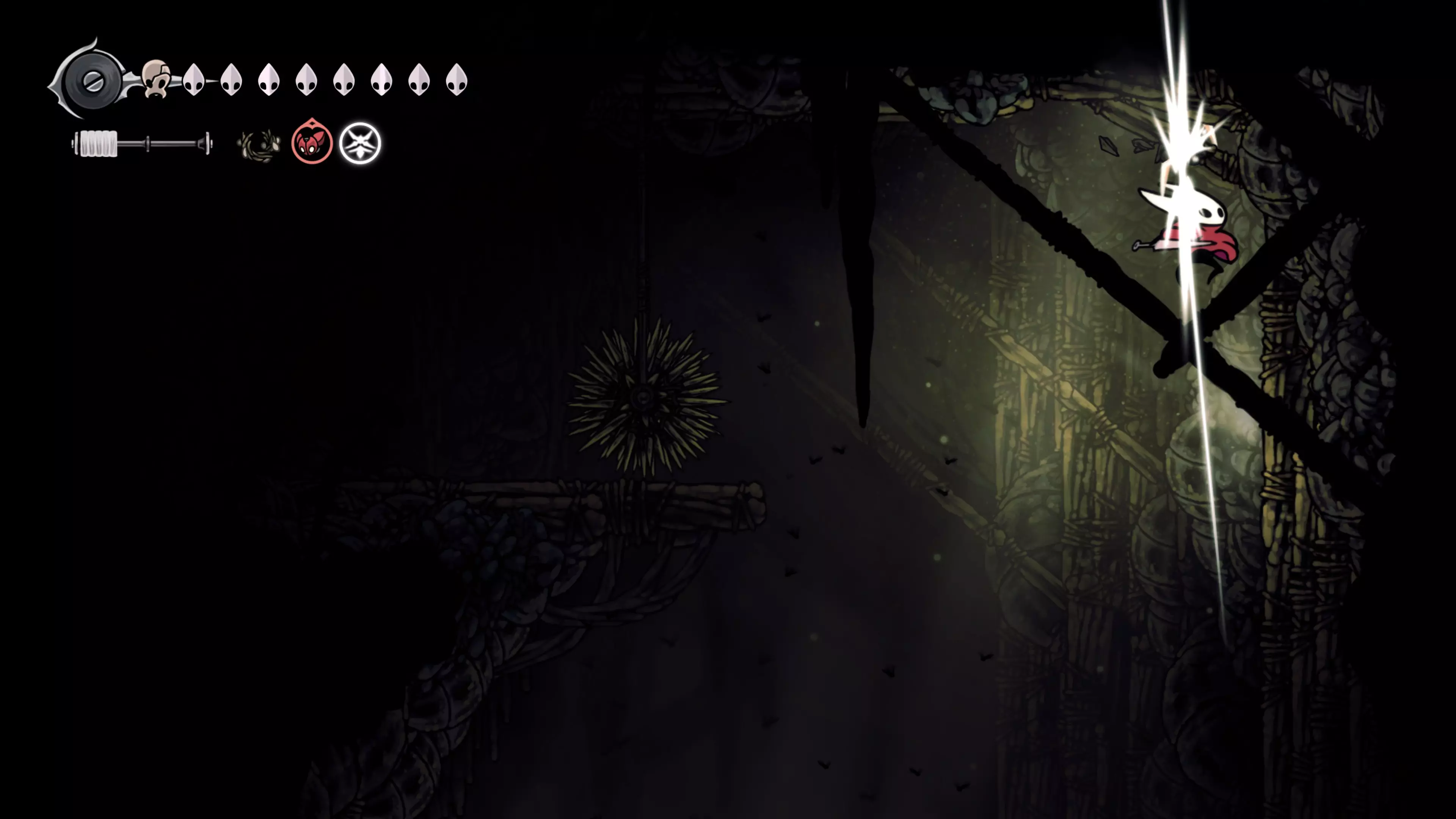 接下来需要穿过这片区域并完全探索它,直到抵达顶端。这里的平台跳跃可能并不简单——记住,你可以将钉子扔向带刺的石头,霍恩特会自动弹开。抵达顶端后,使用【王之翼】进入【电车门】。