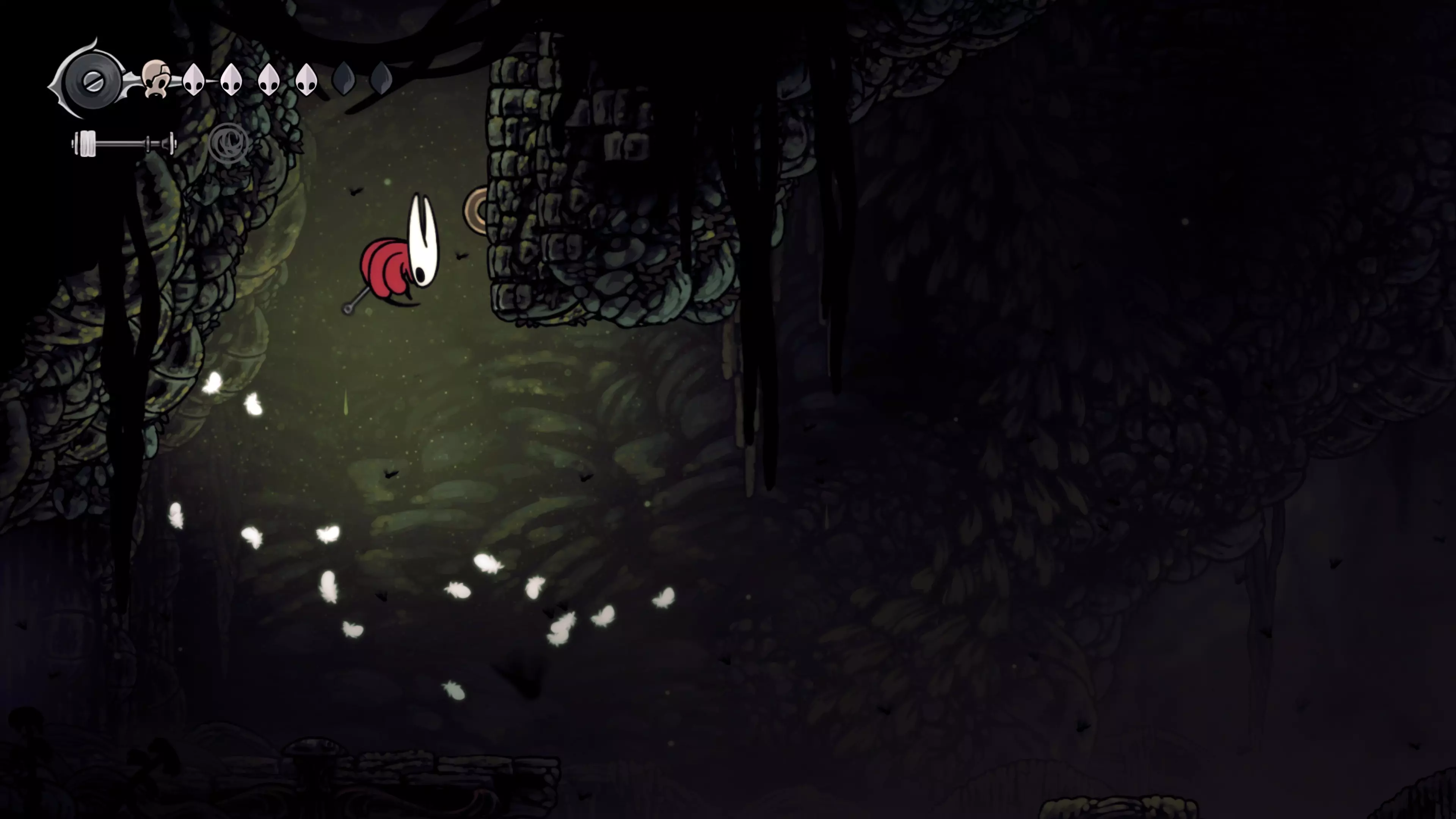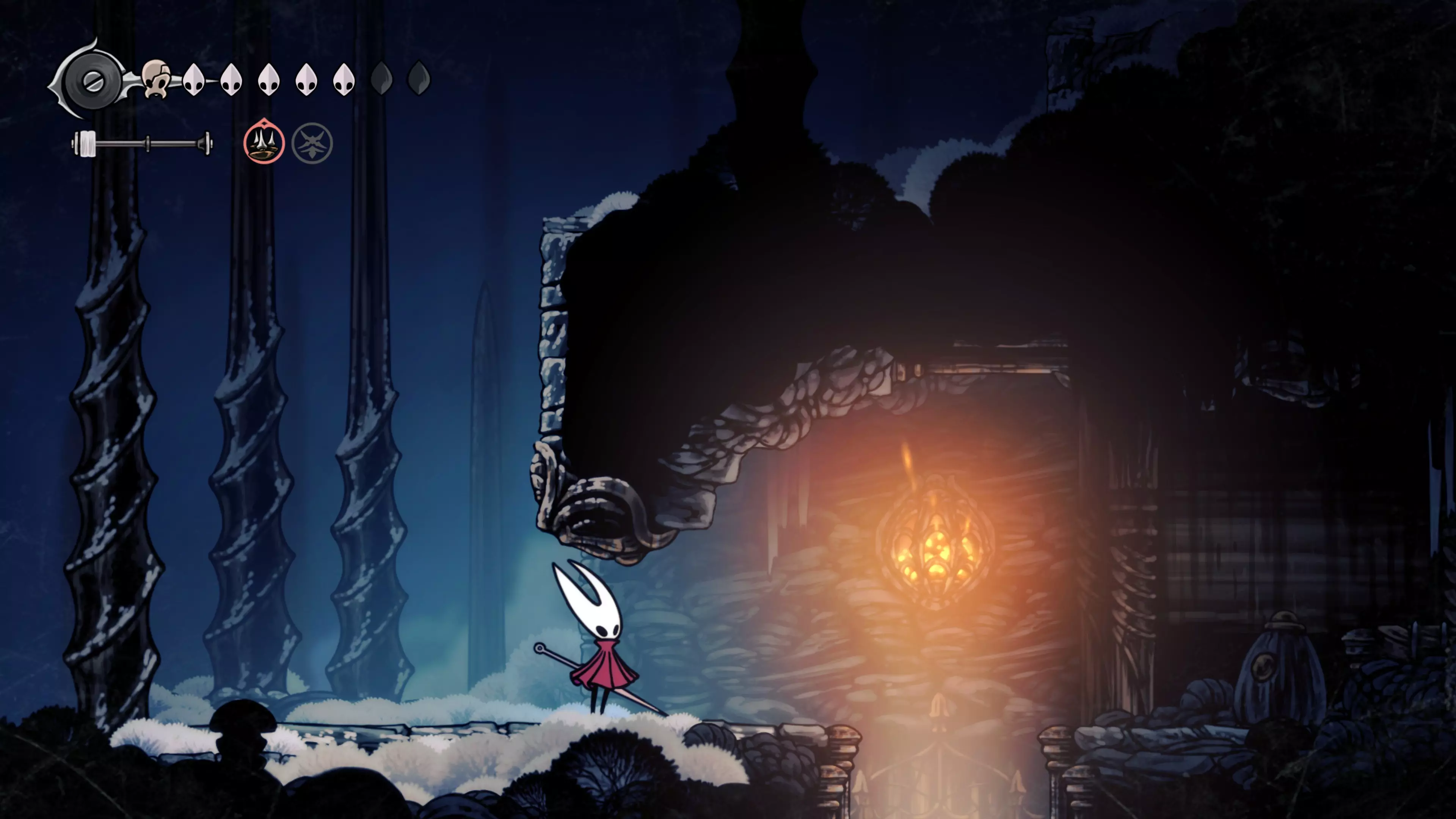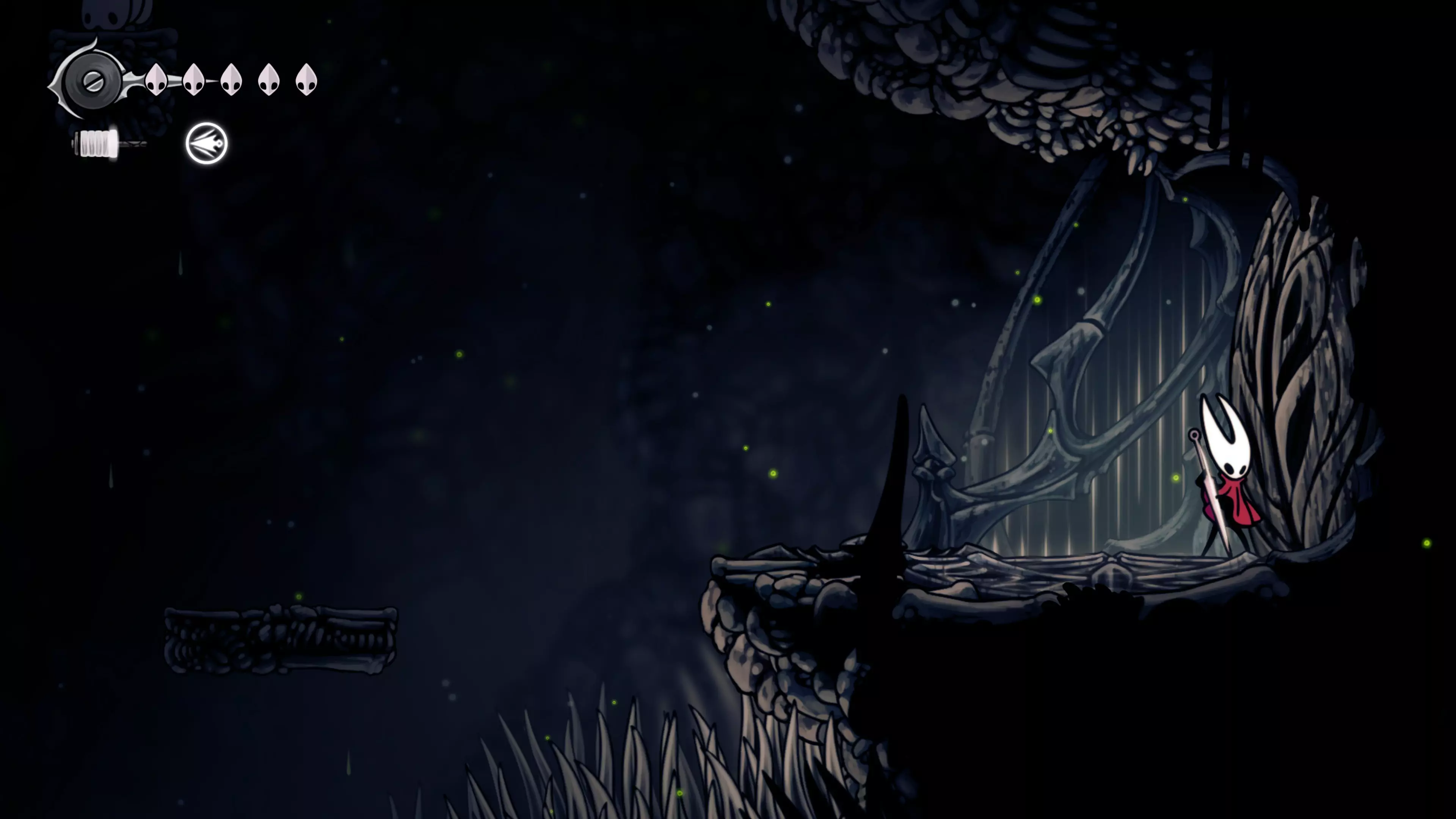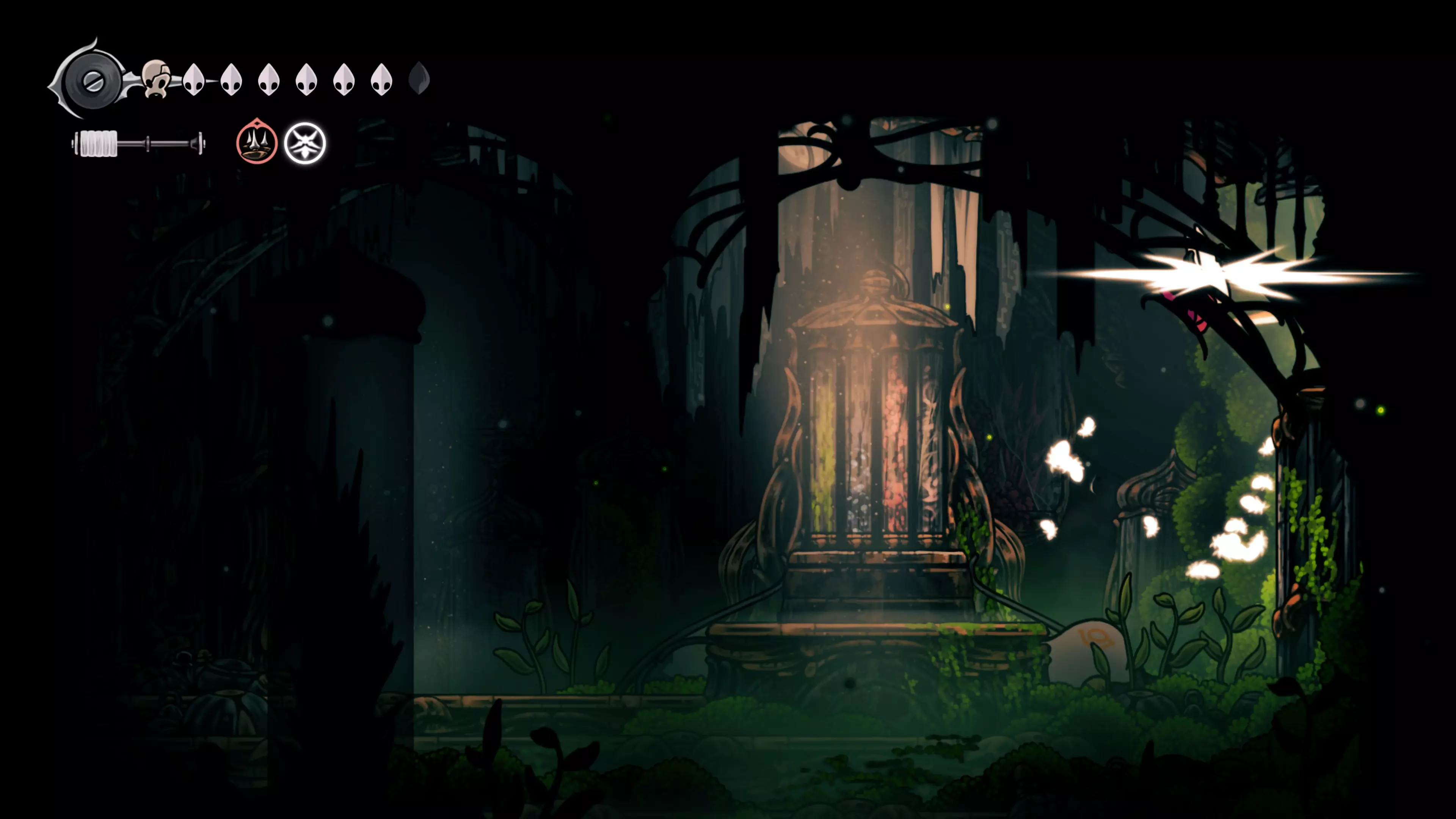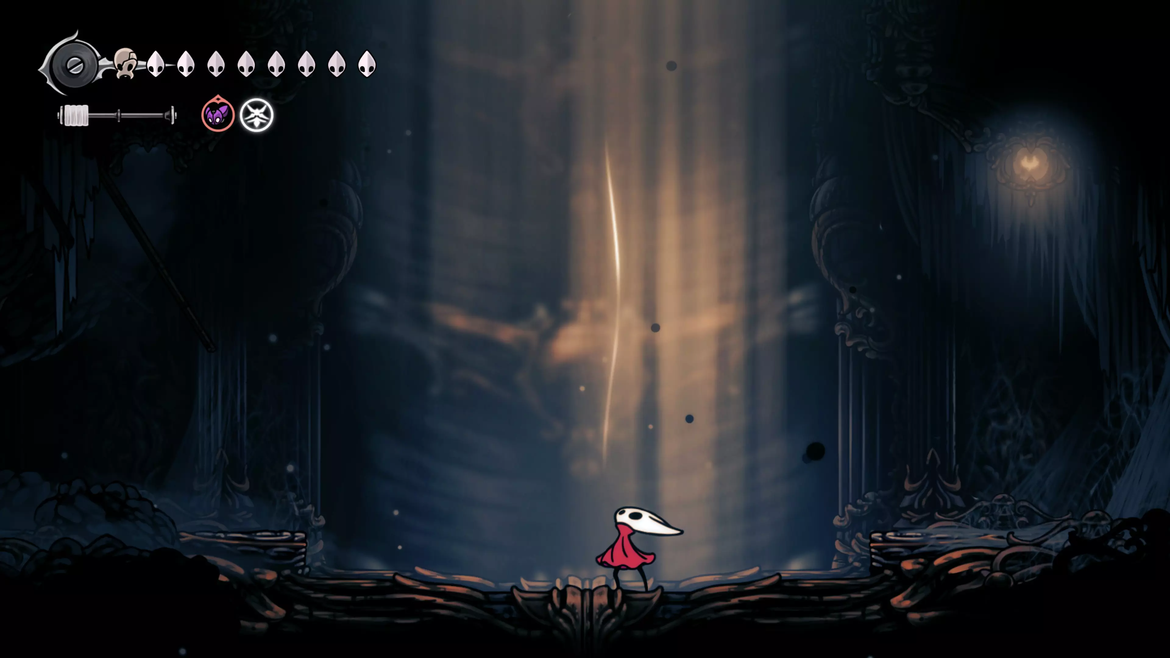 接下来需要穿过这片区域并完全探索它,直到抵达顶端。这里的平台跳跃可能并不简单——记住,你可以将钉子扔向带刺的石头,霍恩特会自动弹开。抵达顶端后,使用【王之翼】进入【电车门】。