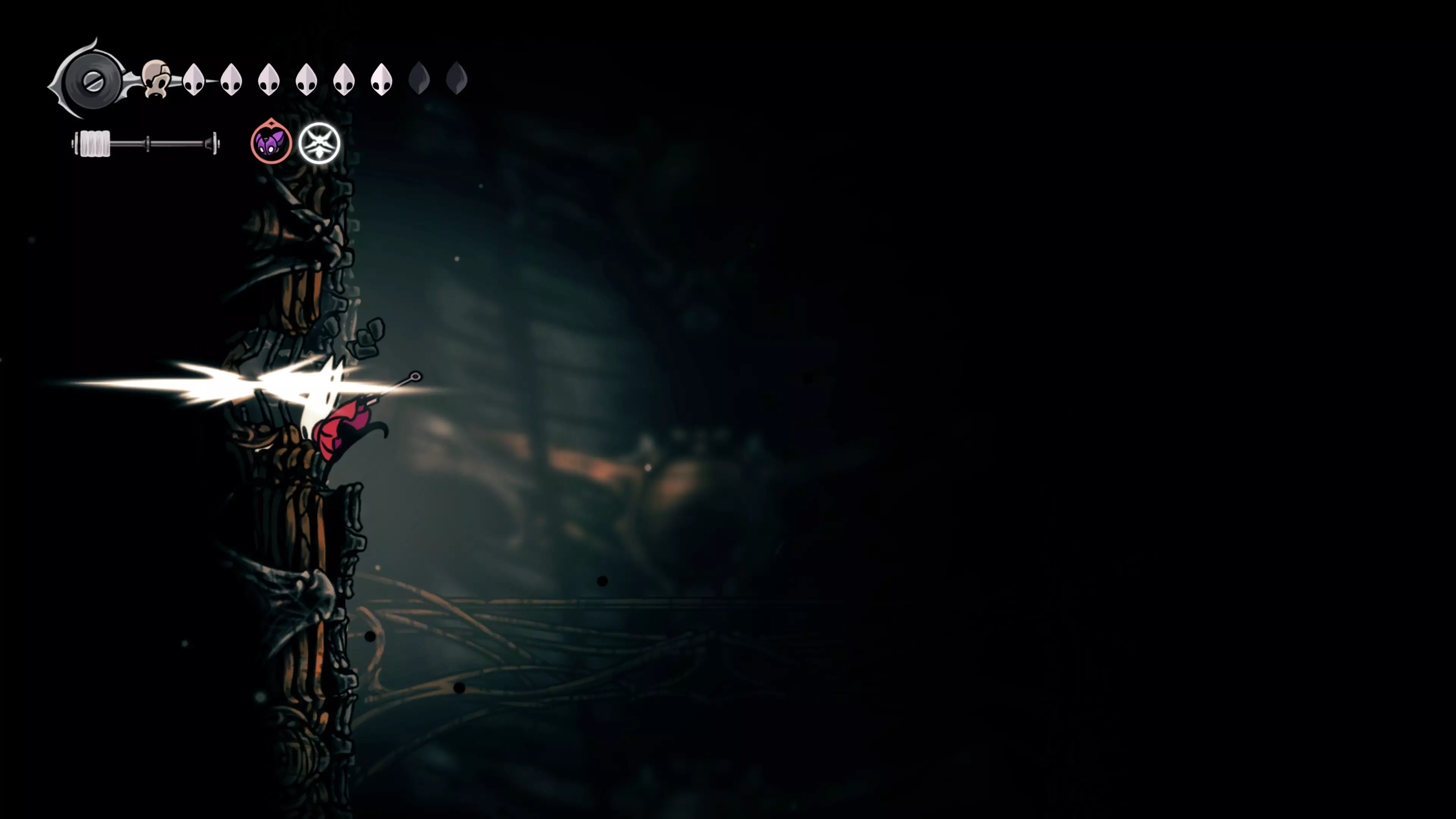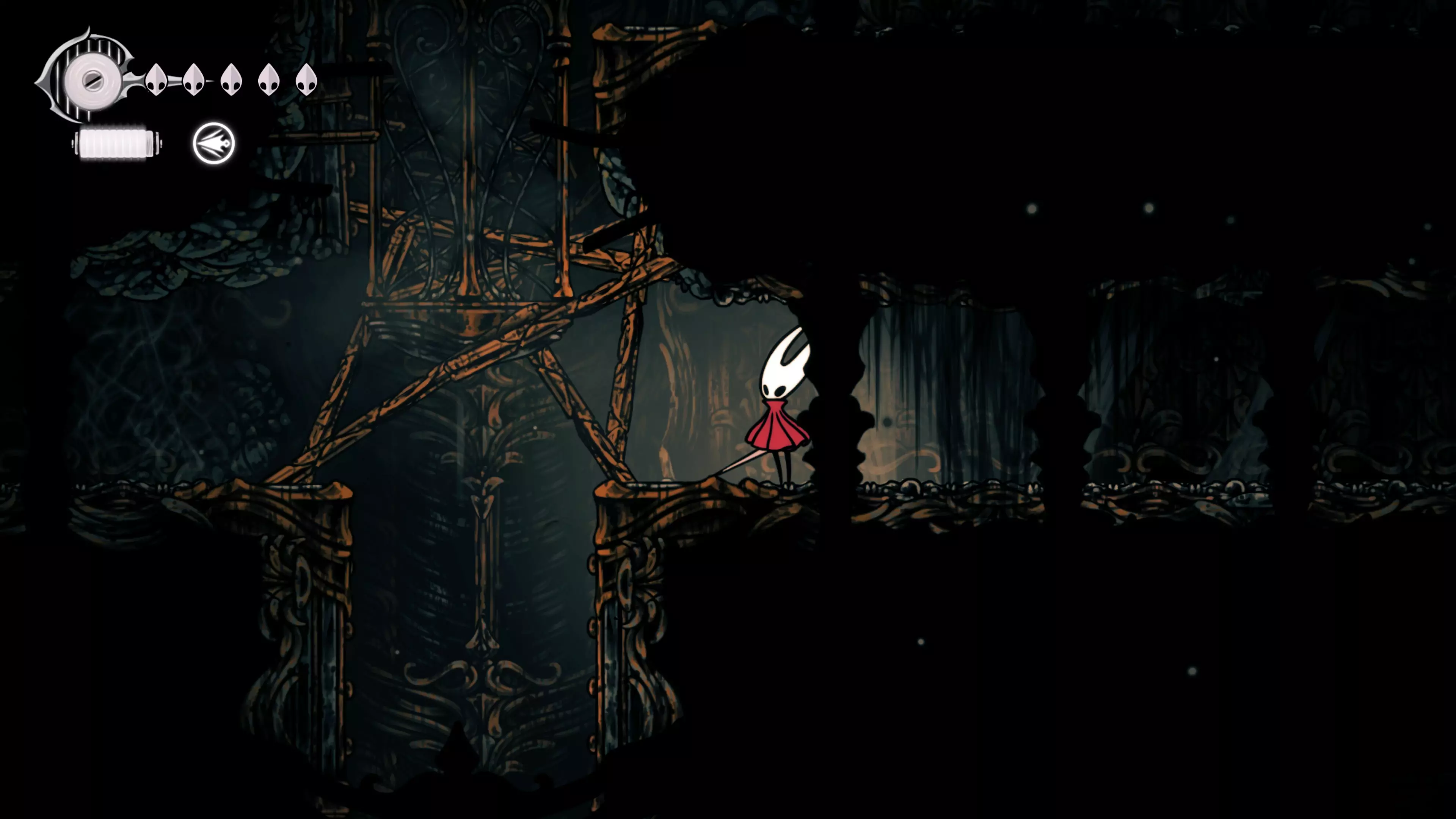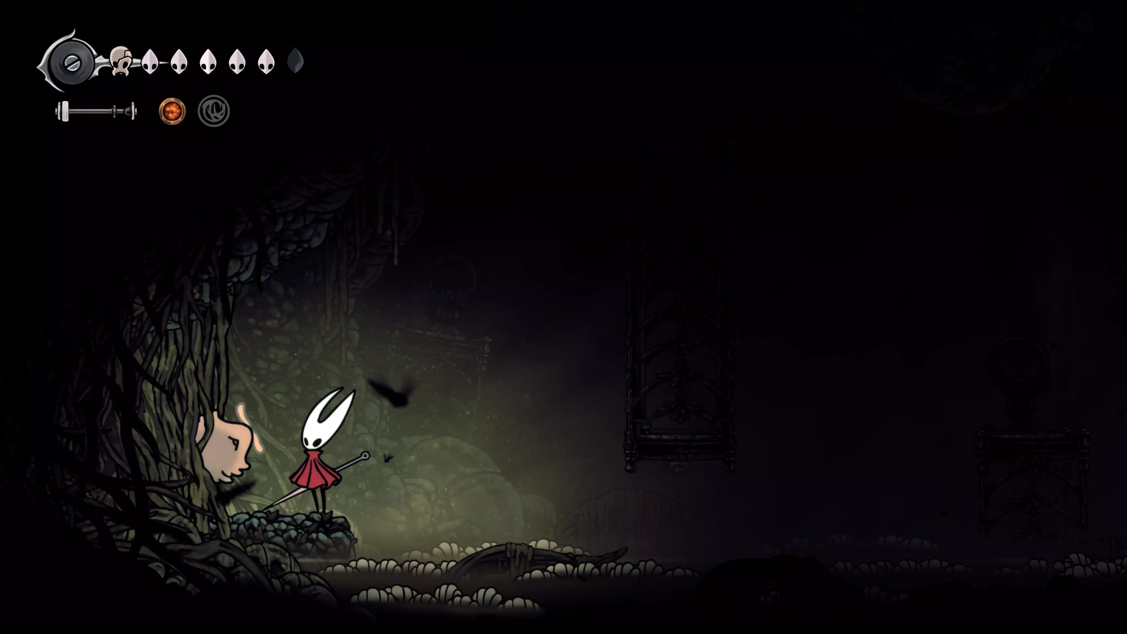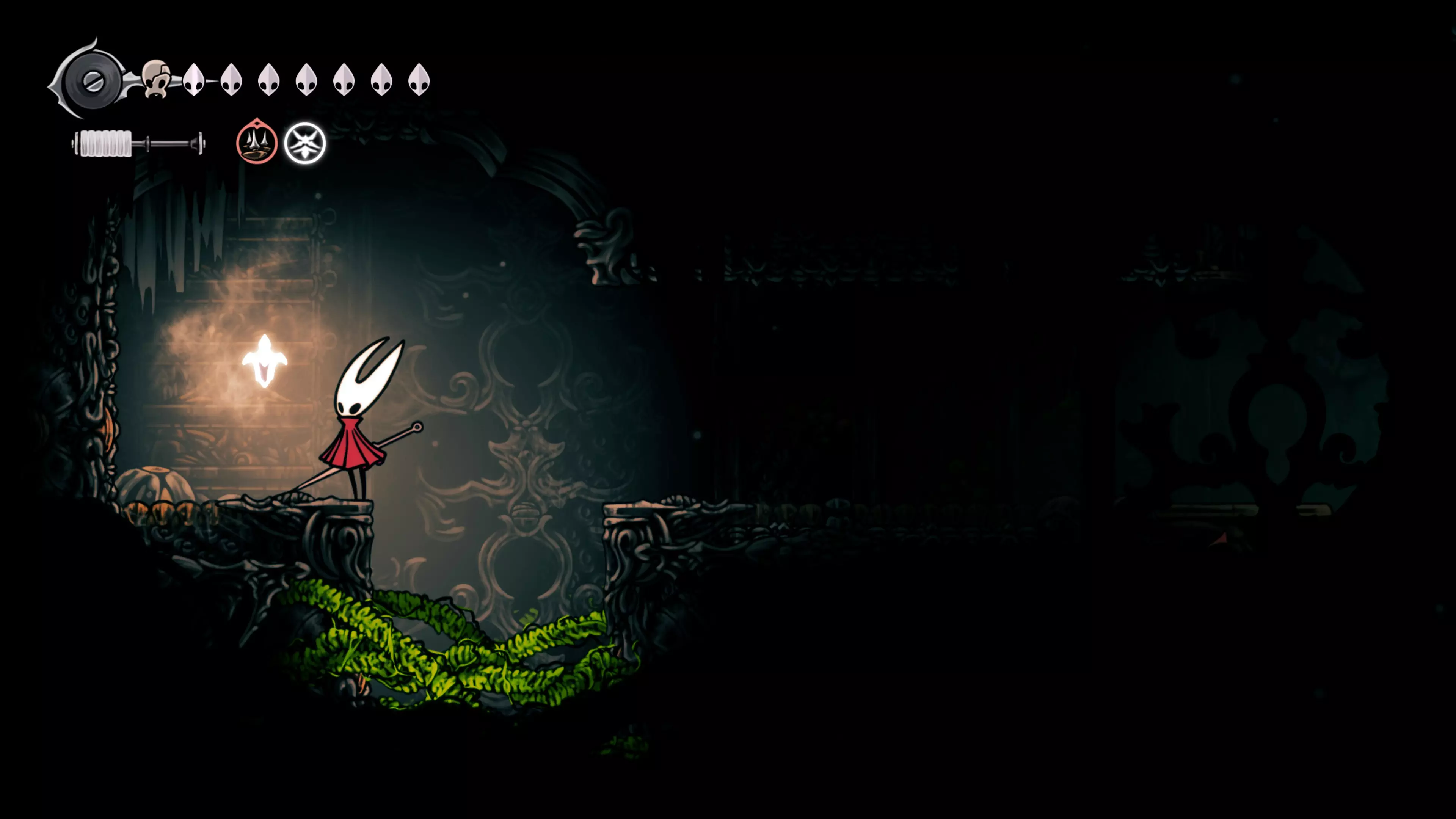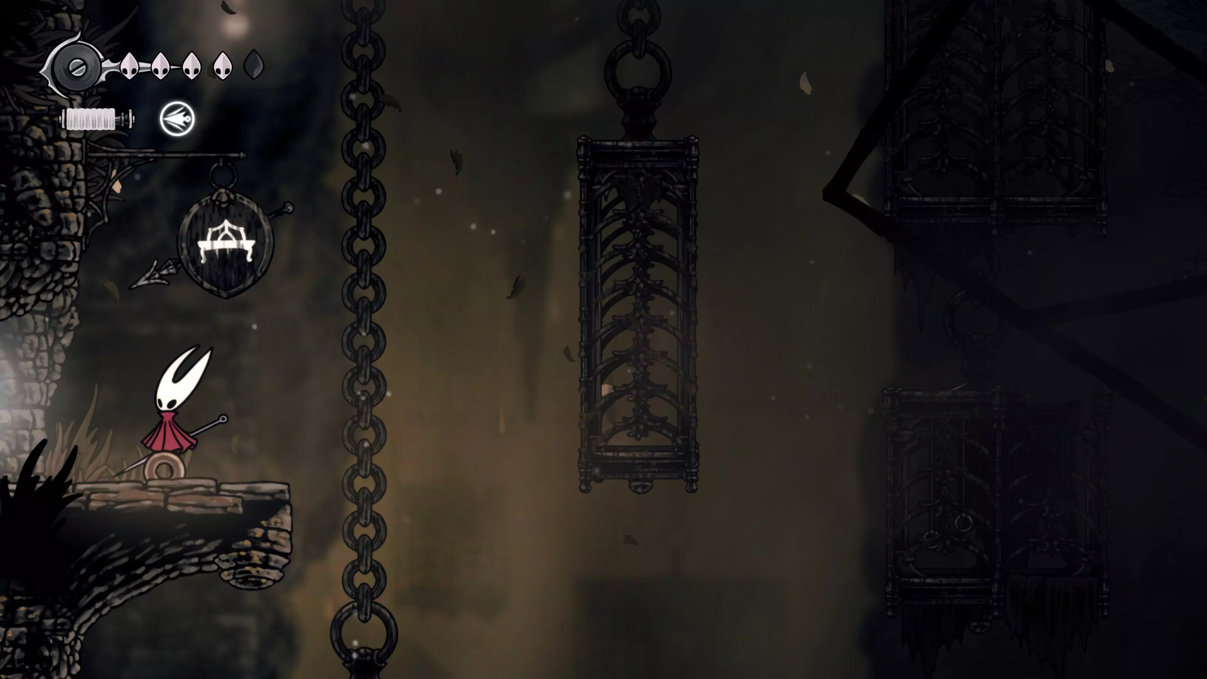 接下来需要穿过这片区域并完全探索它,直到抵达顶端。这里的平台跳跃可能并不简单——记住,你可以将钉子扔向带刺的石头,霍恩特会自动弹开。抵达顶端后,使用【王之翼】进入【电车门】。