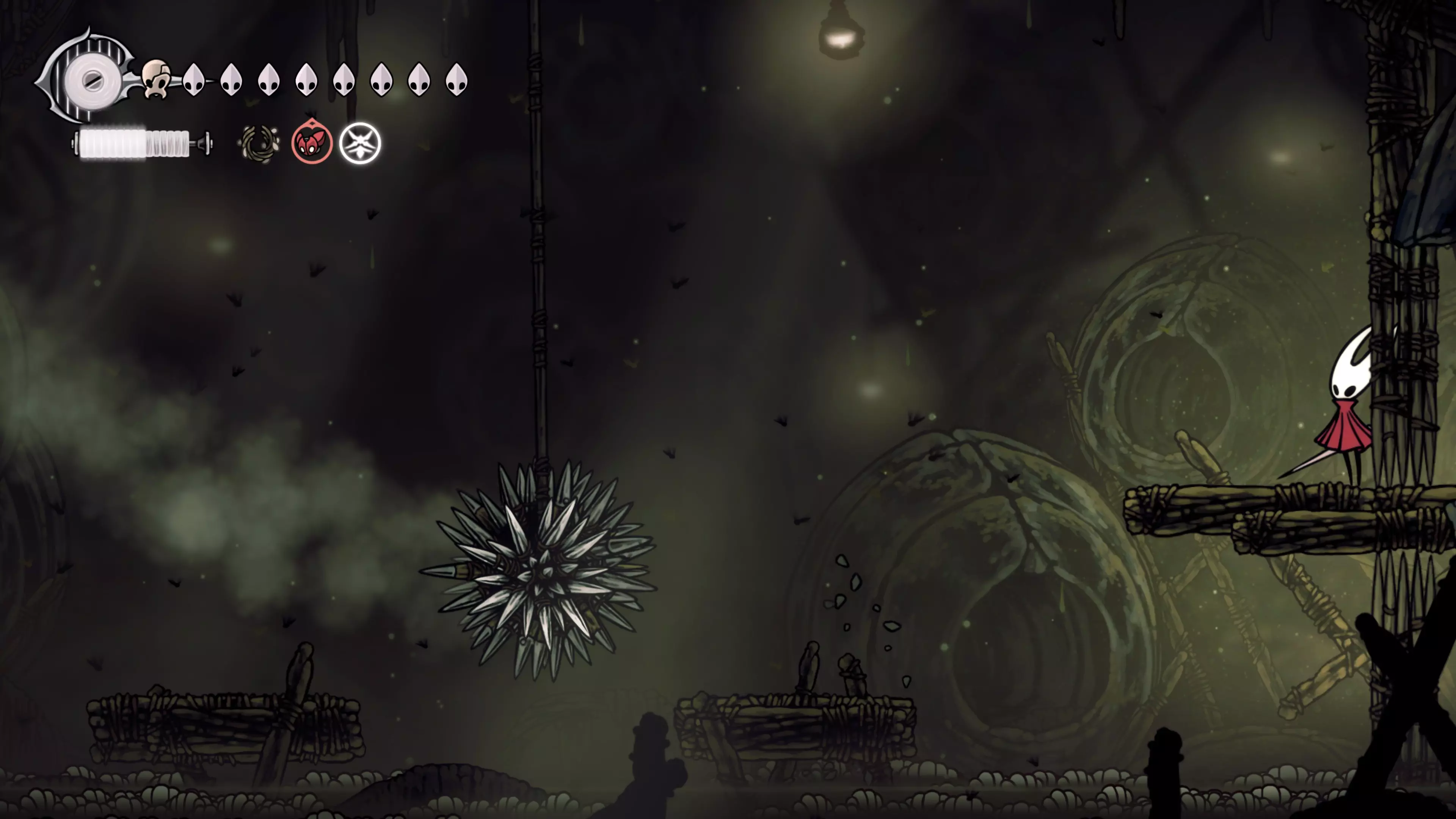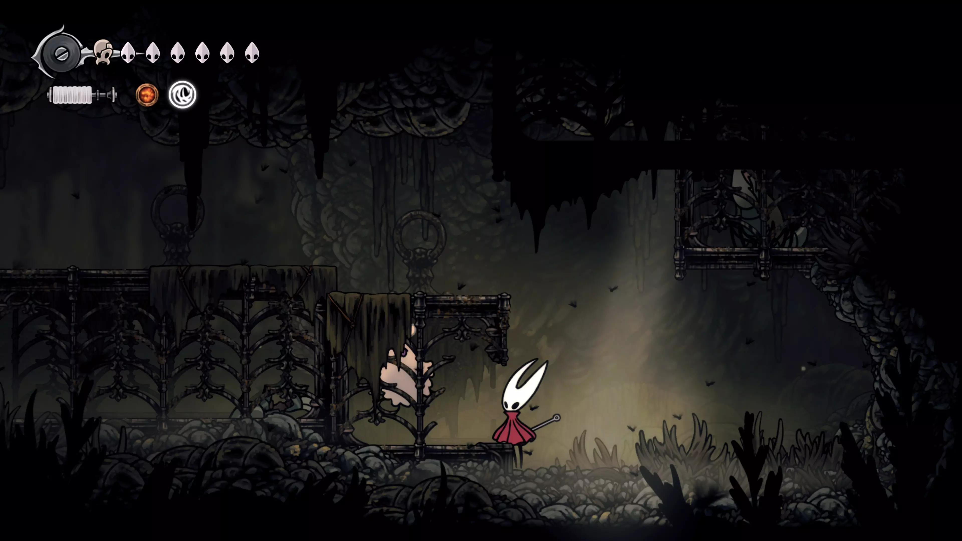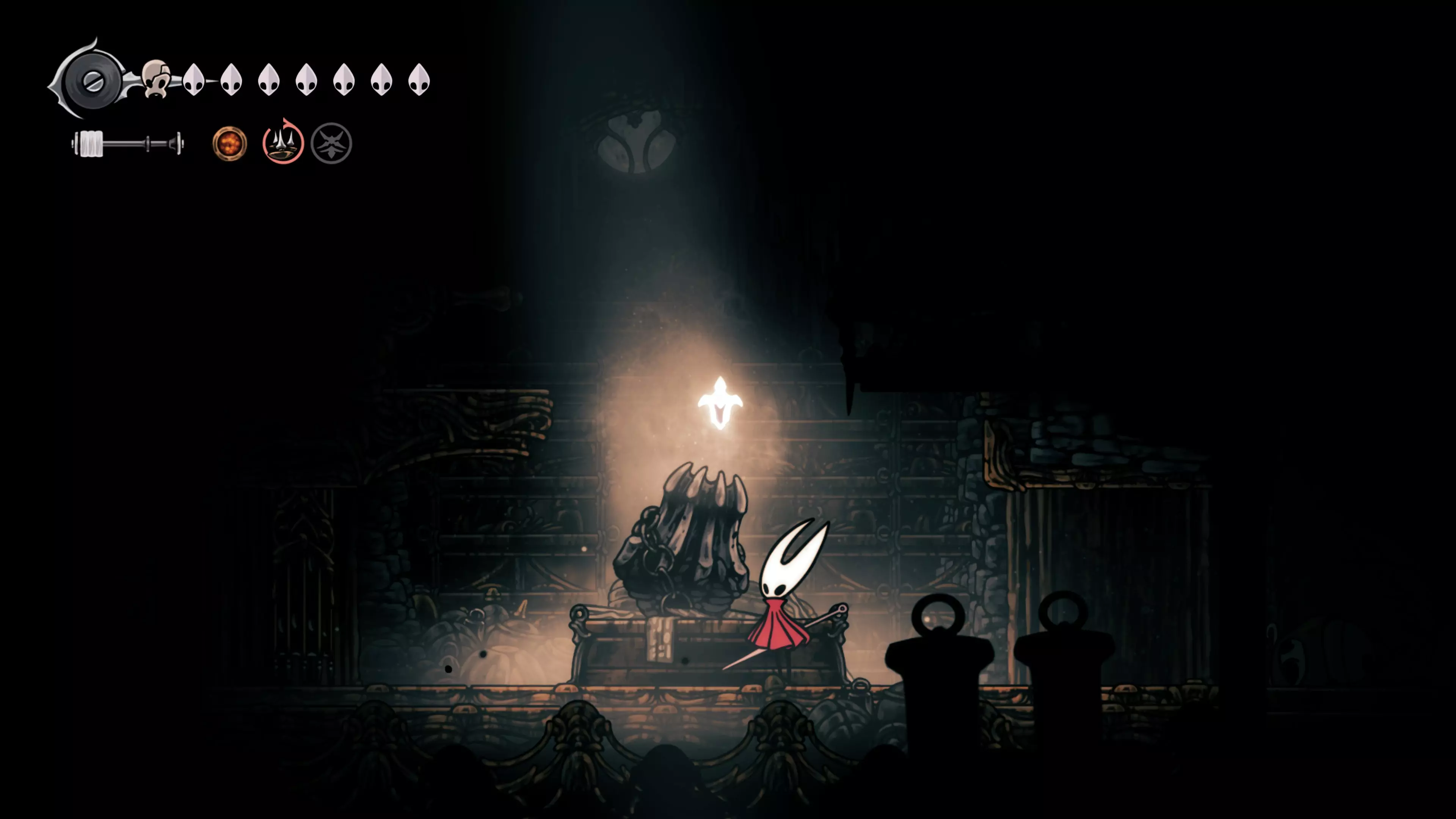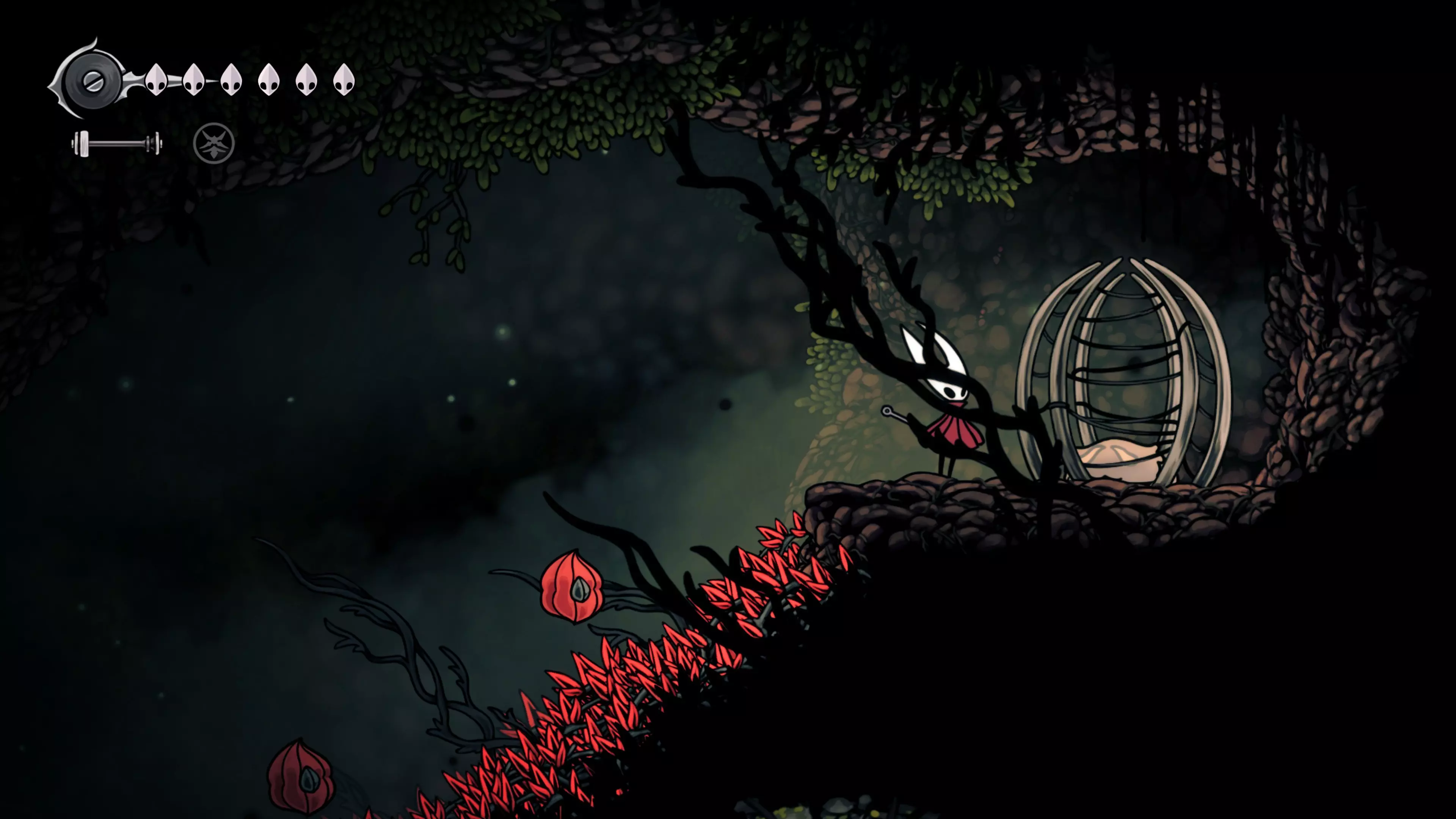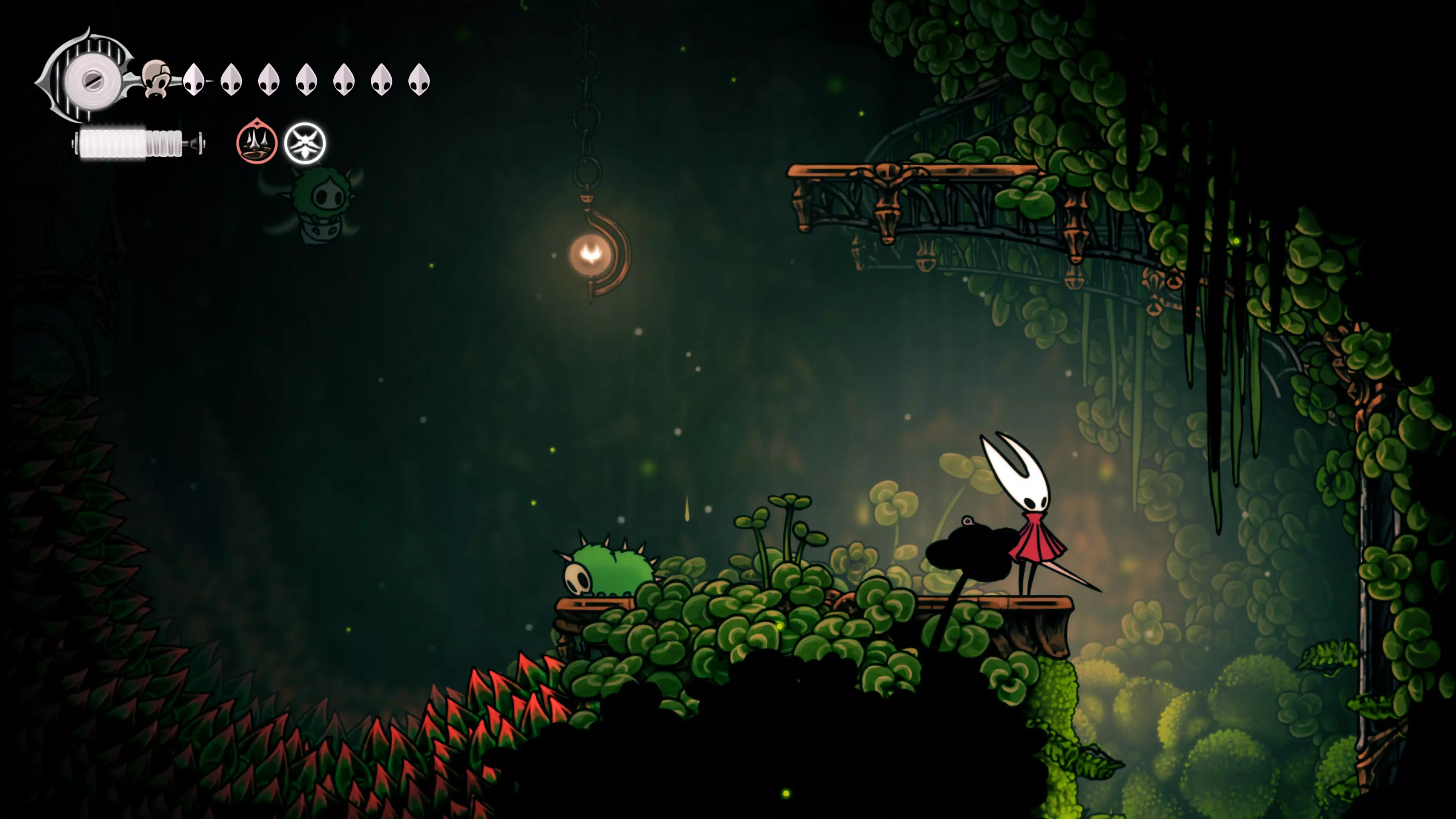 接下来需要穿过这片区域并完全探索它,直到抵达顶端。这里的平台跳跃可能并不简单——记住,你可以将钉子扔向带刺的石头,霍恩特会自动弹开。抵达顶端后,使用【王之翼】进入【电车门】。