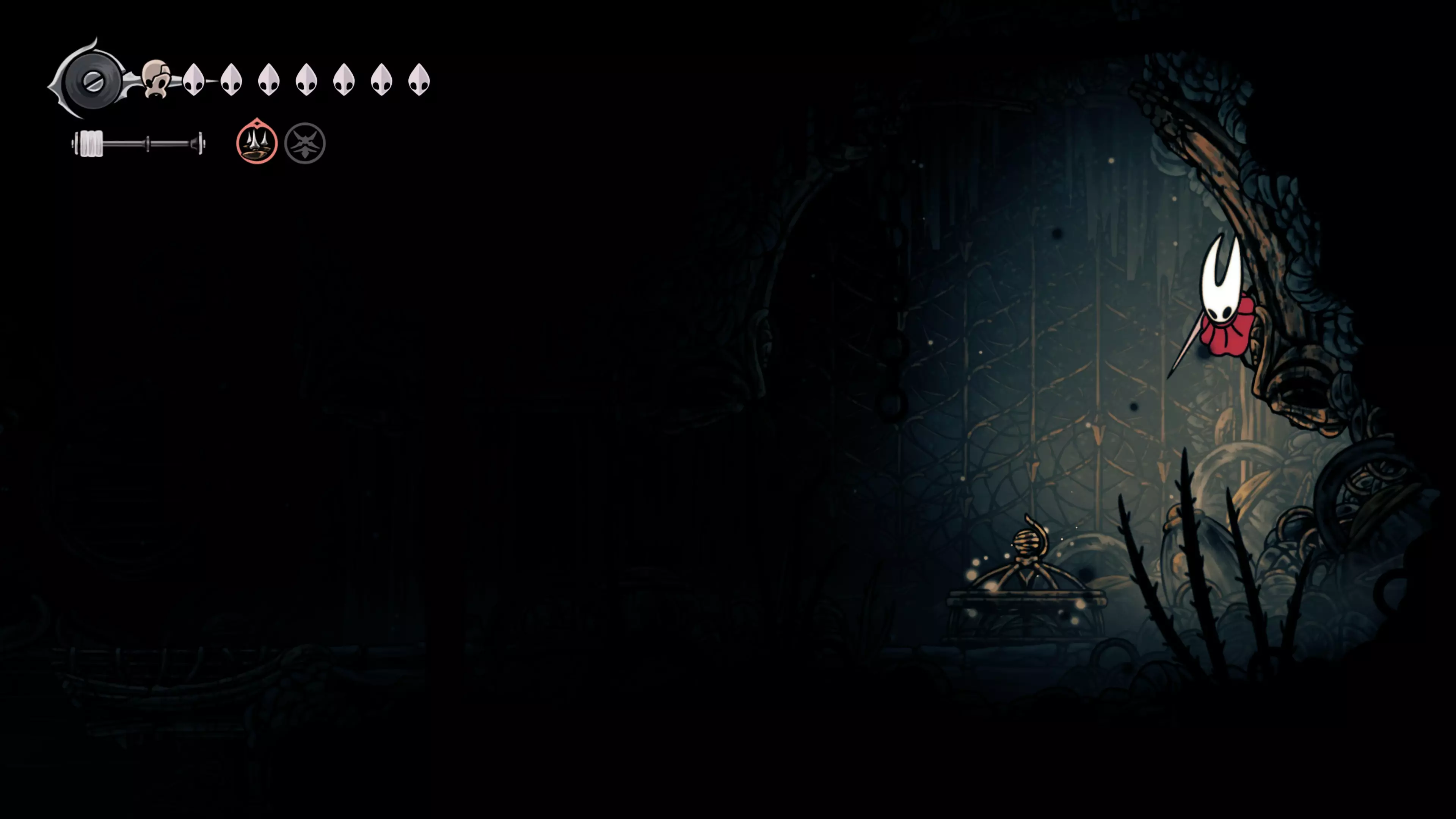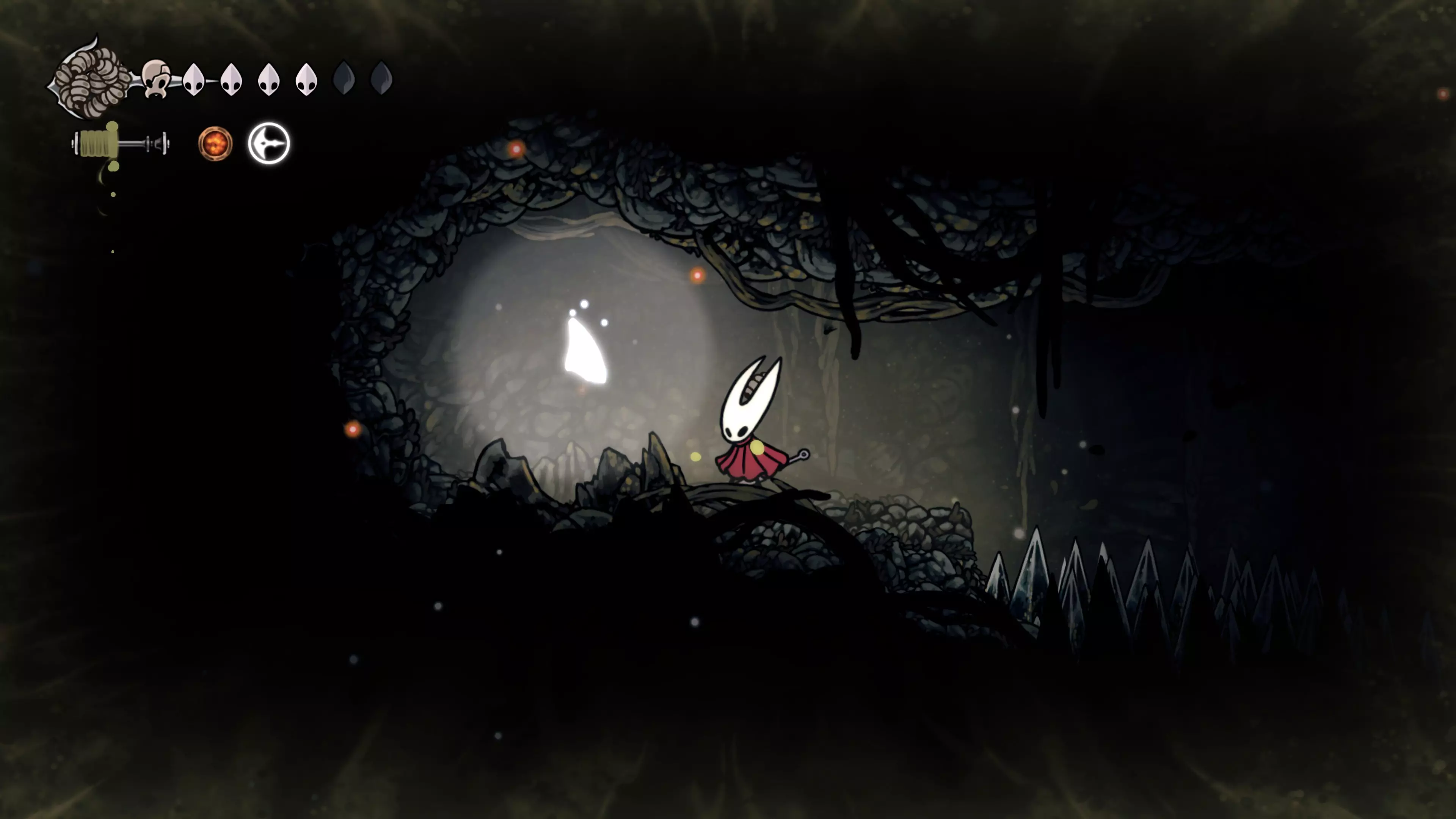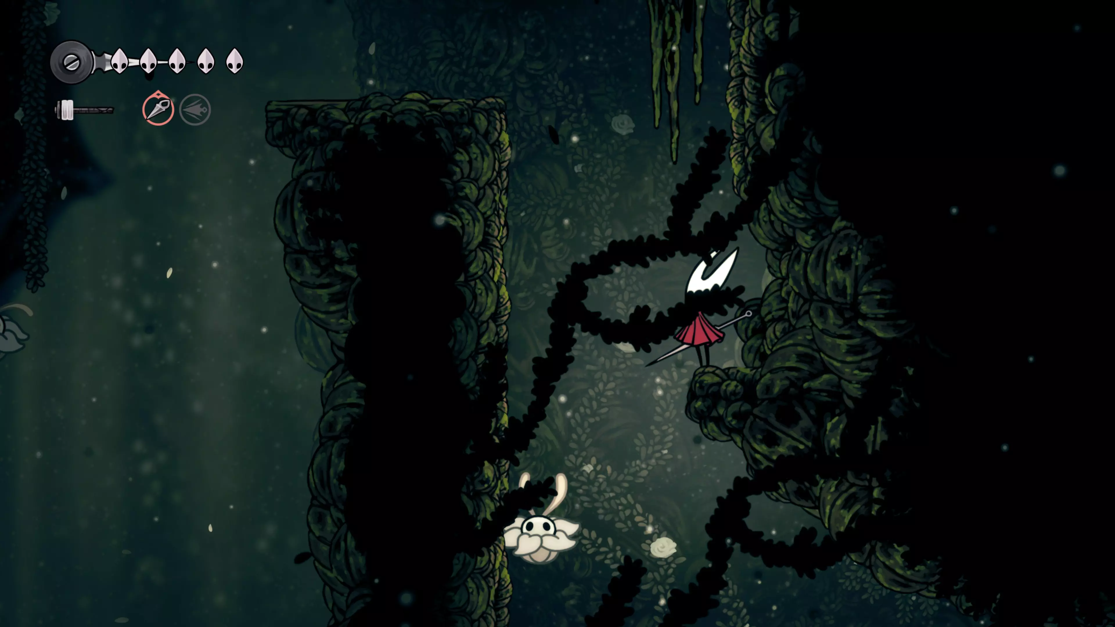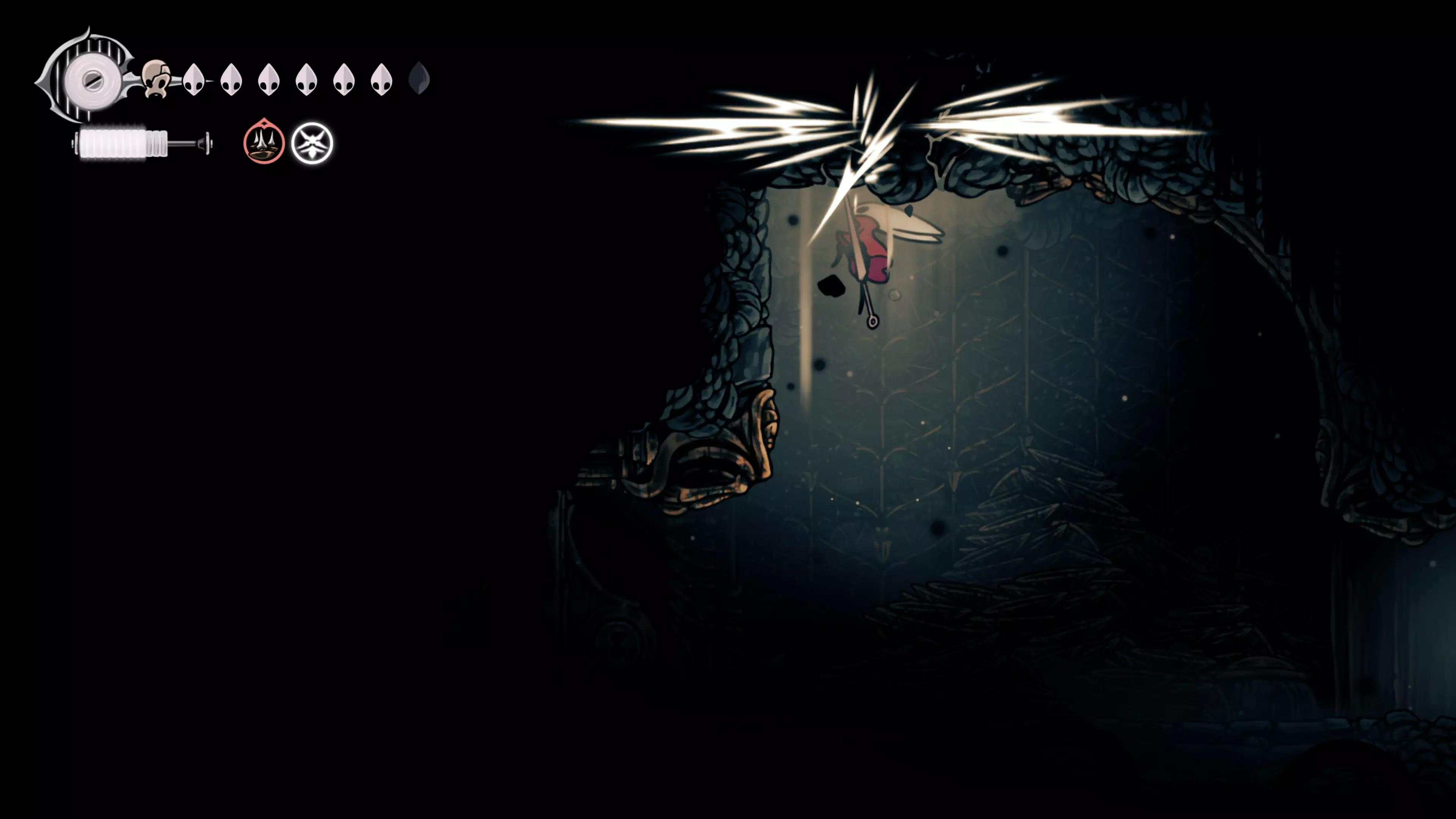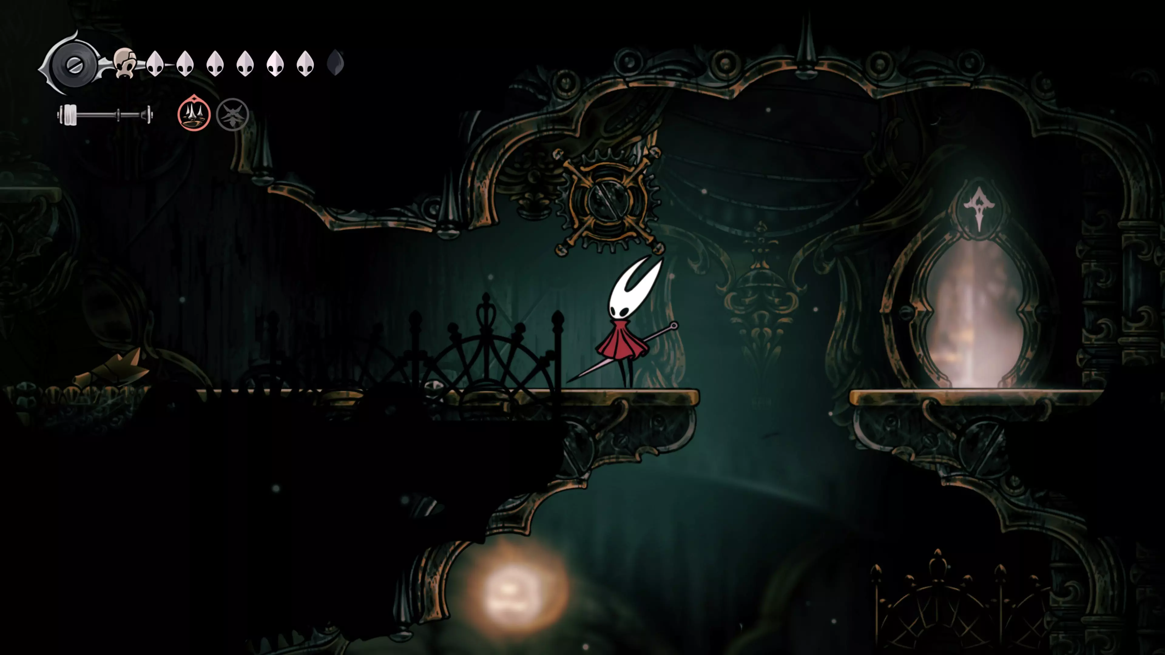接下来需要穿过这片区域并完全探索它,直到抵达顶端。这里的平台跳跃可能并不简单——记住,你可以将钉子扔向带刺的石头,霍恩特会自动弹开。抵达顶端后,使用【王之翼】进入【电车门】。