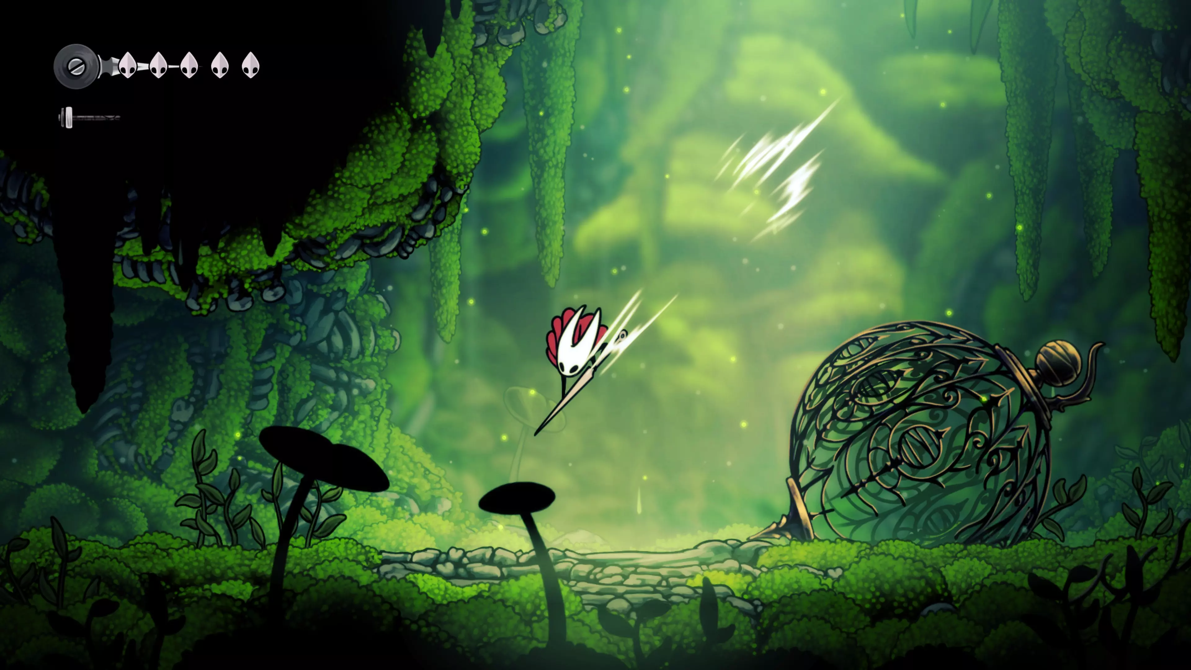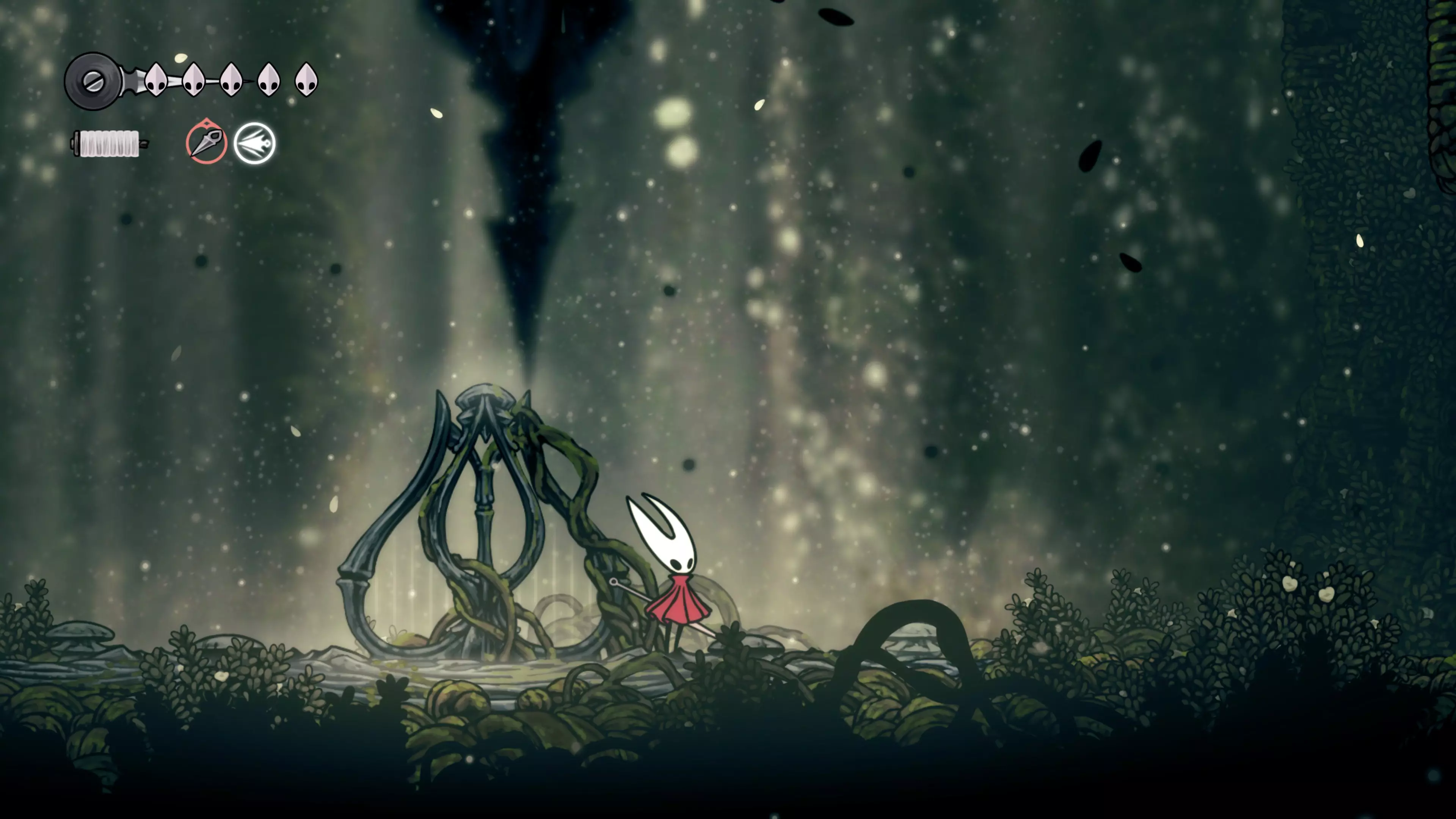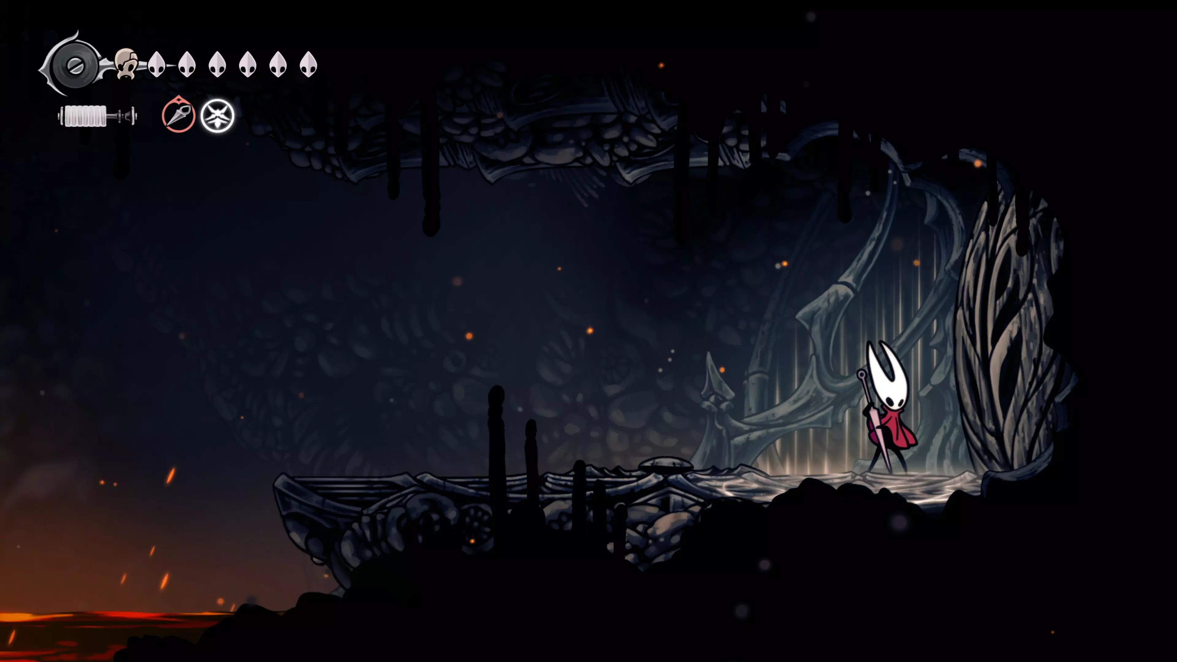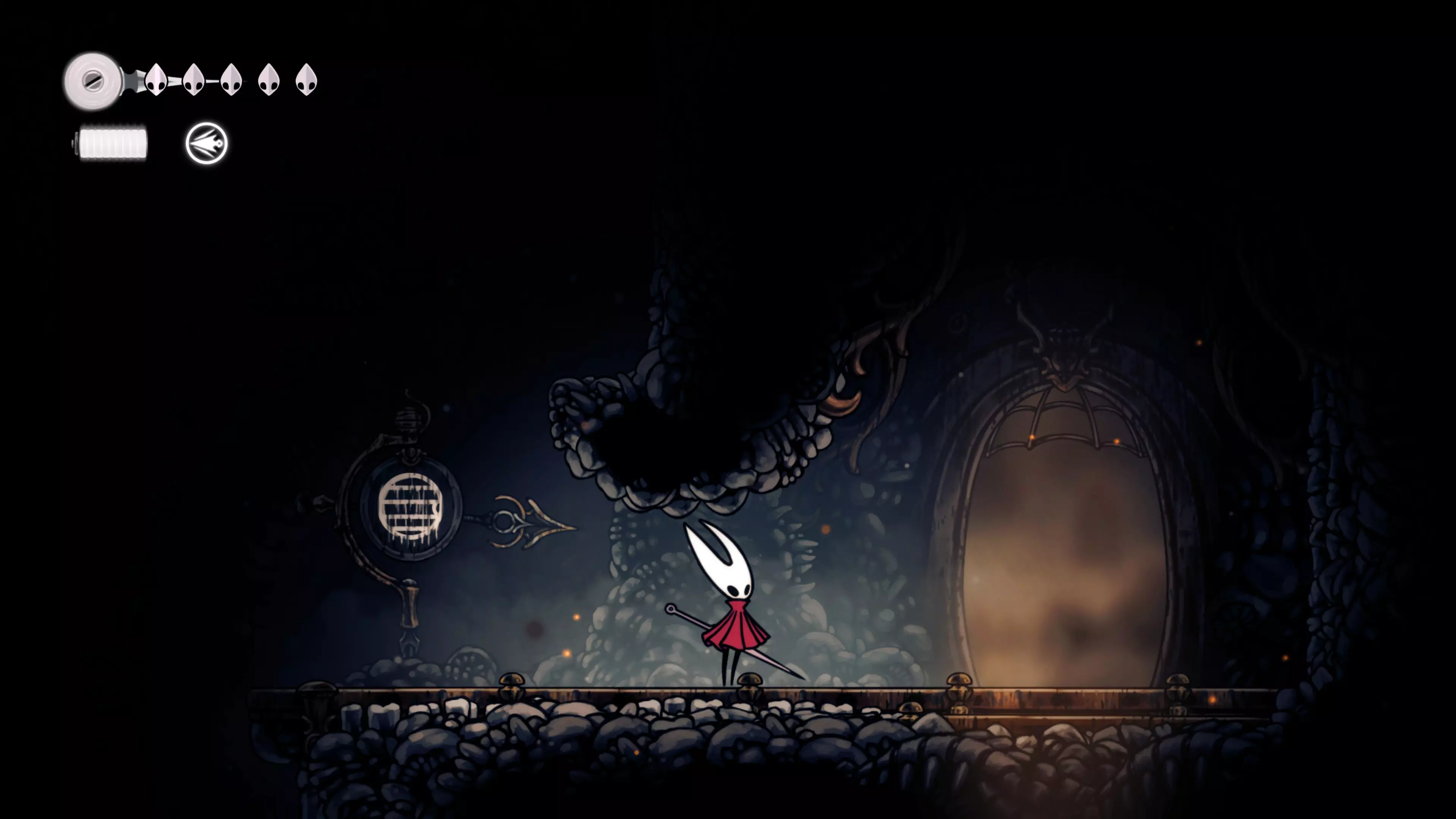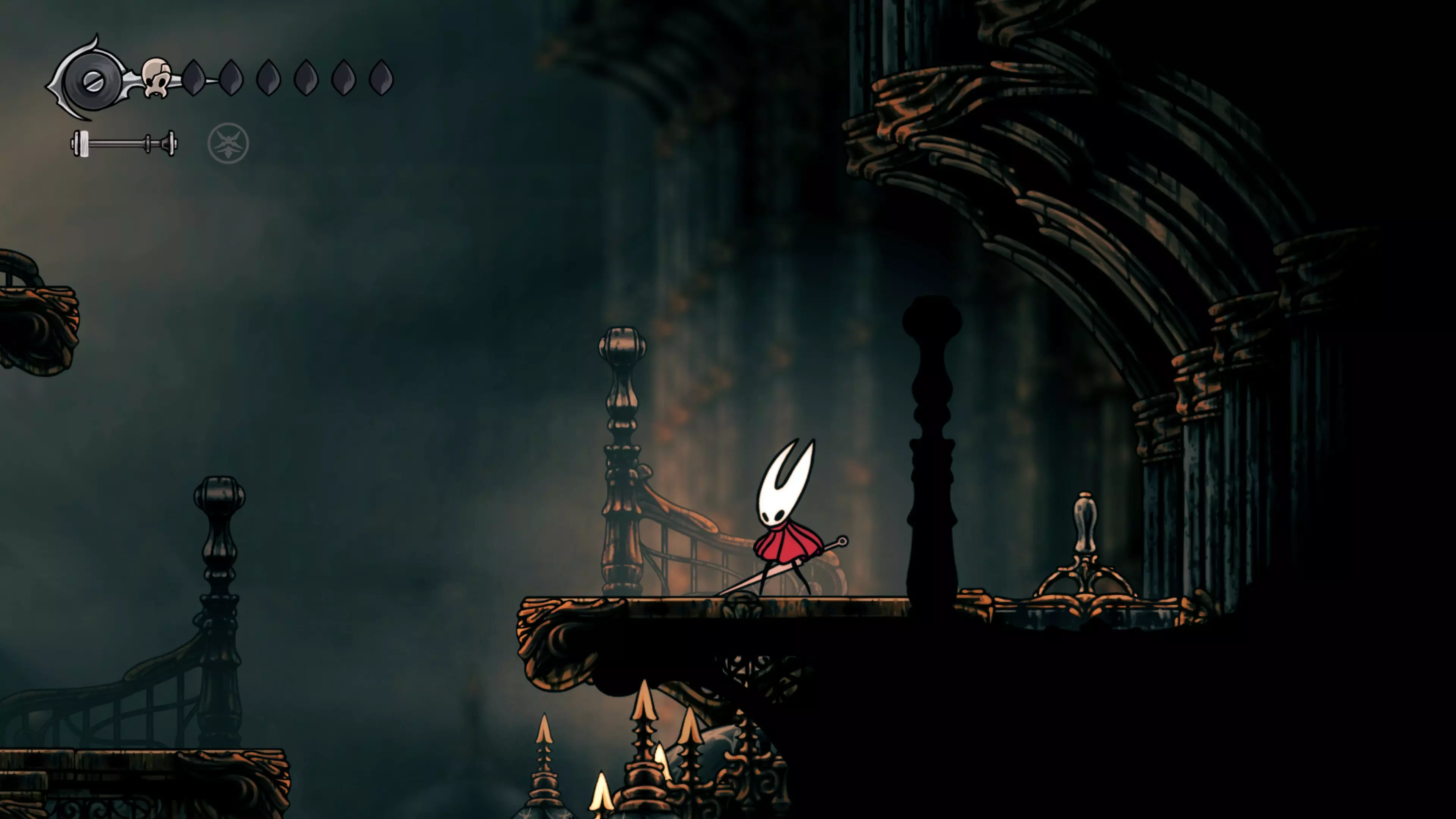 接下来需要穿过这片区域并完全探索它,直到抵达顶端。这里的平台跳跃可能并不简单——记住,你可以将钉子扔向带刺的石头,霍恩特会自动弹开。抵达顶端后,使用【王之翼】进入【电车门】。
