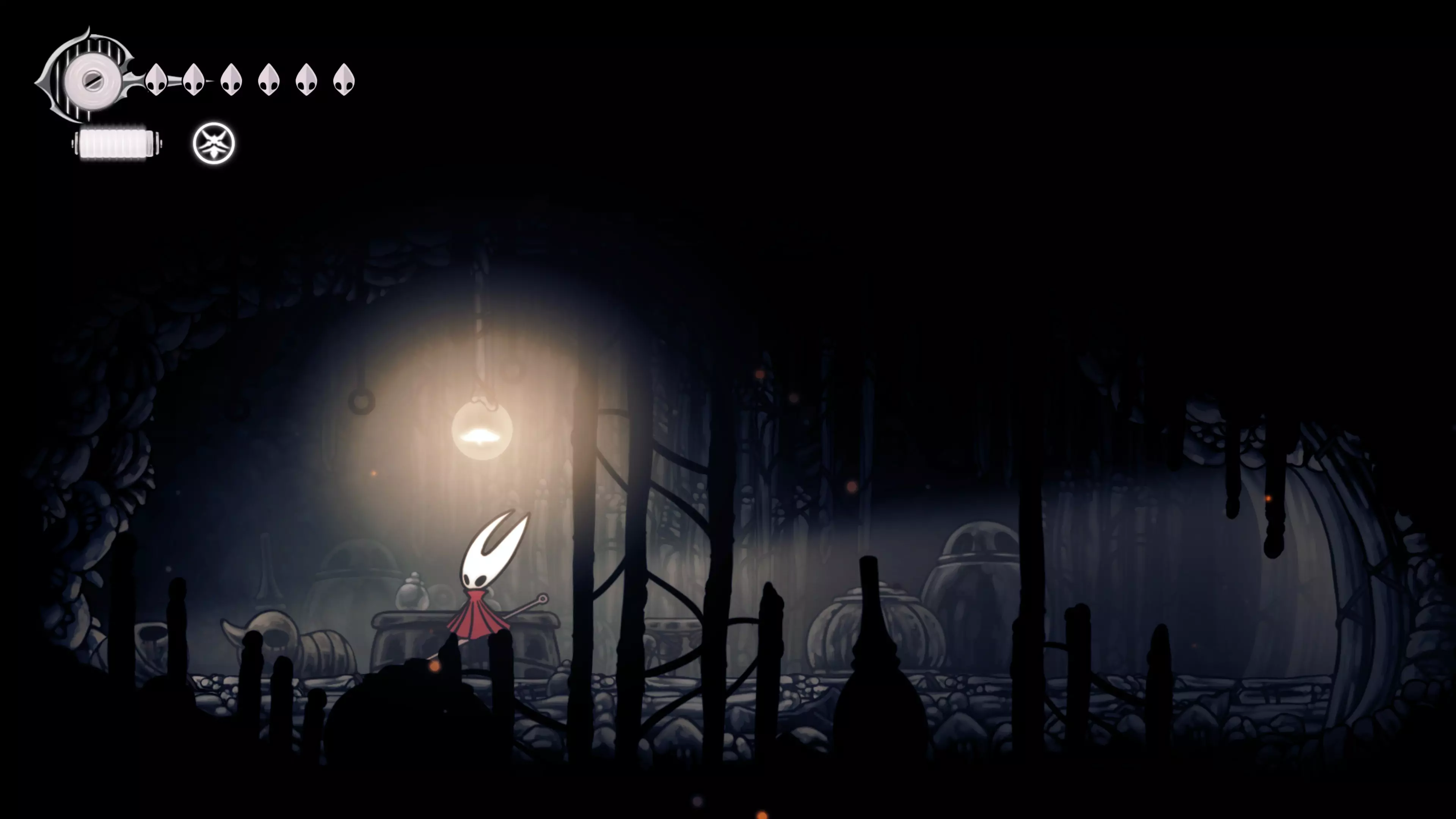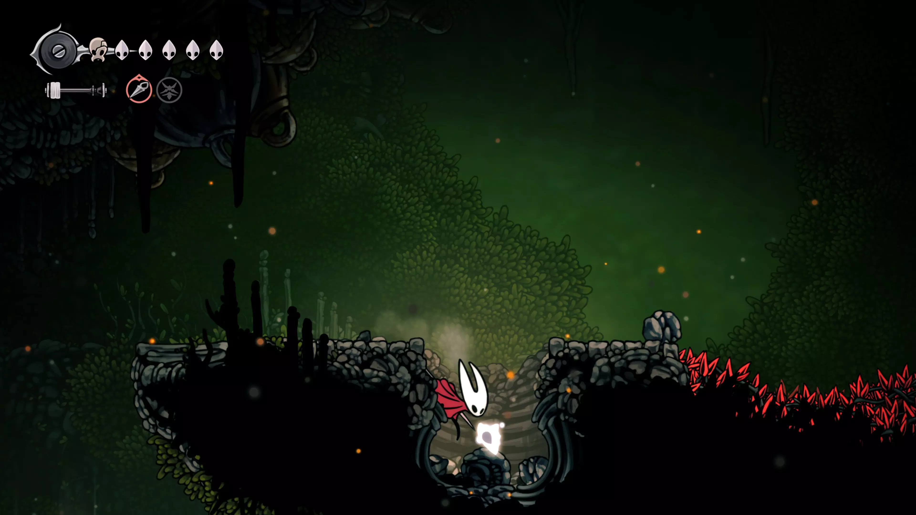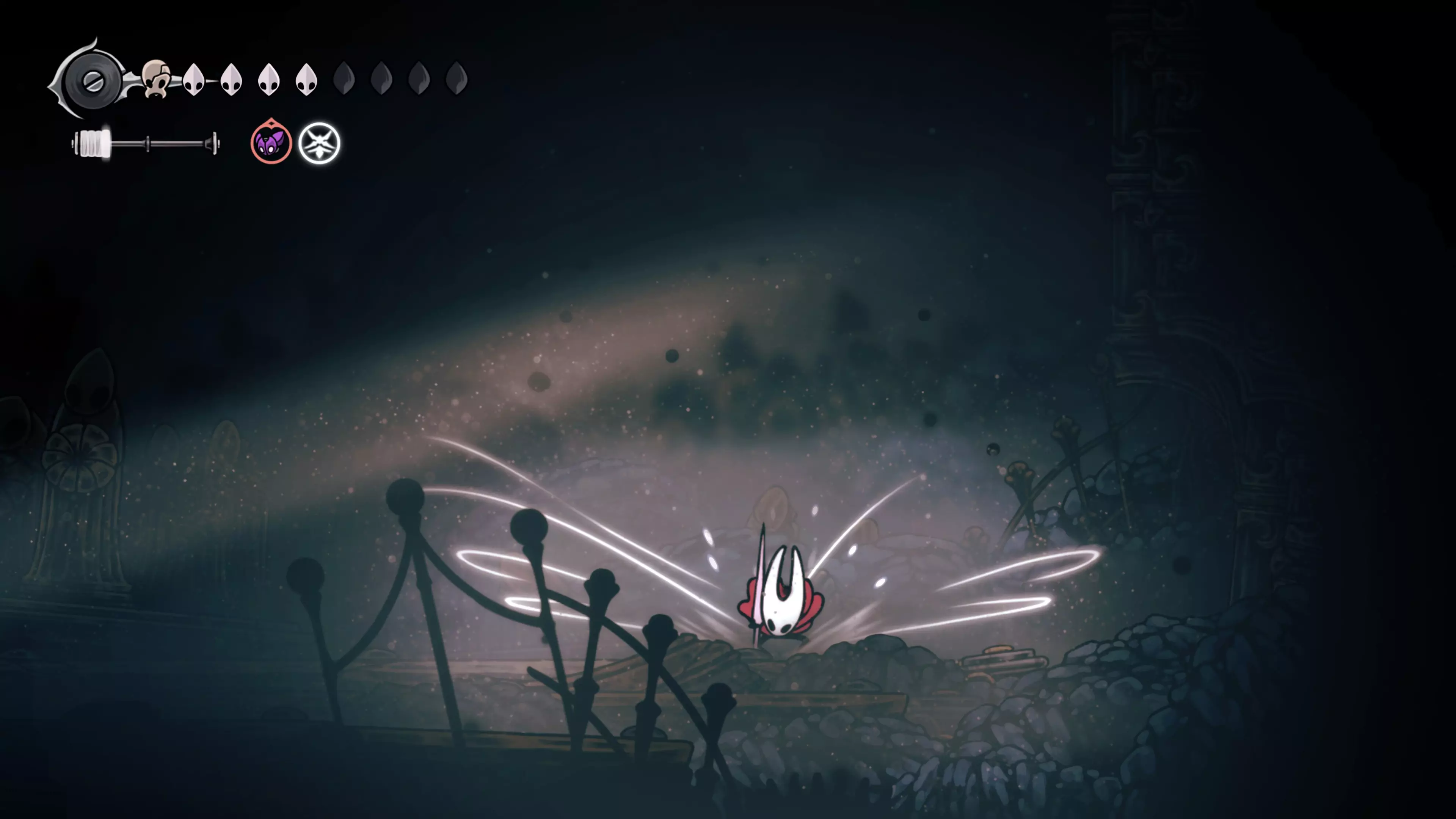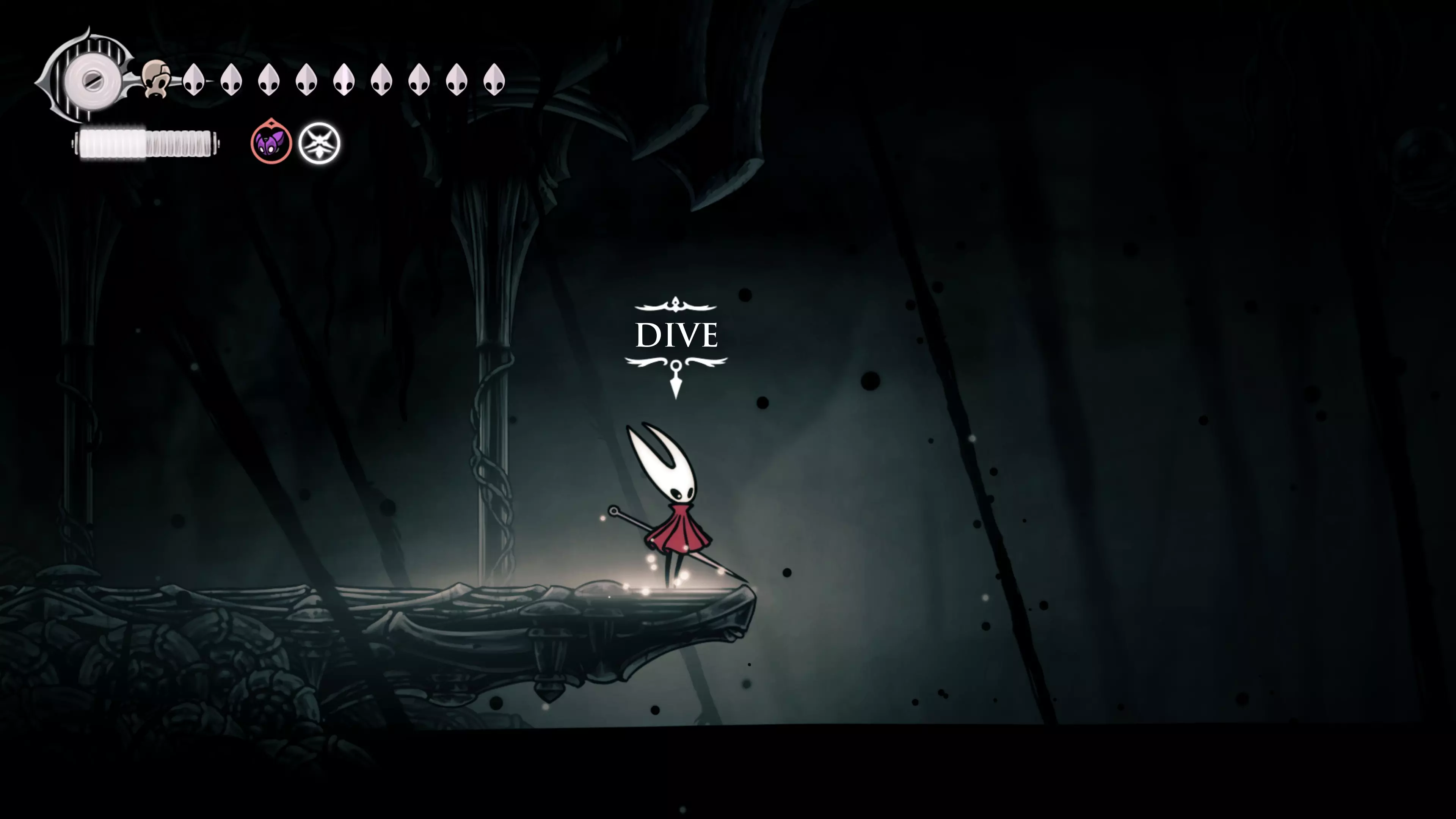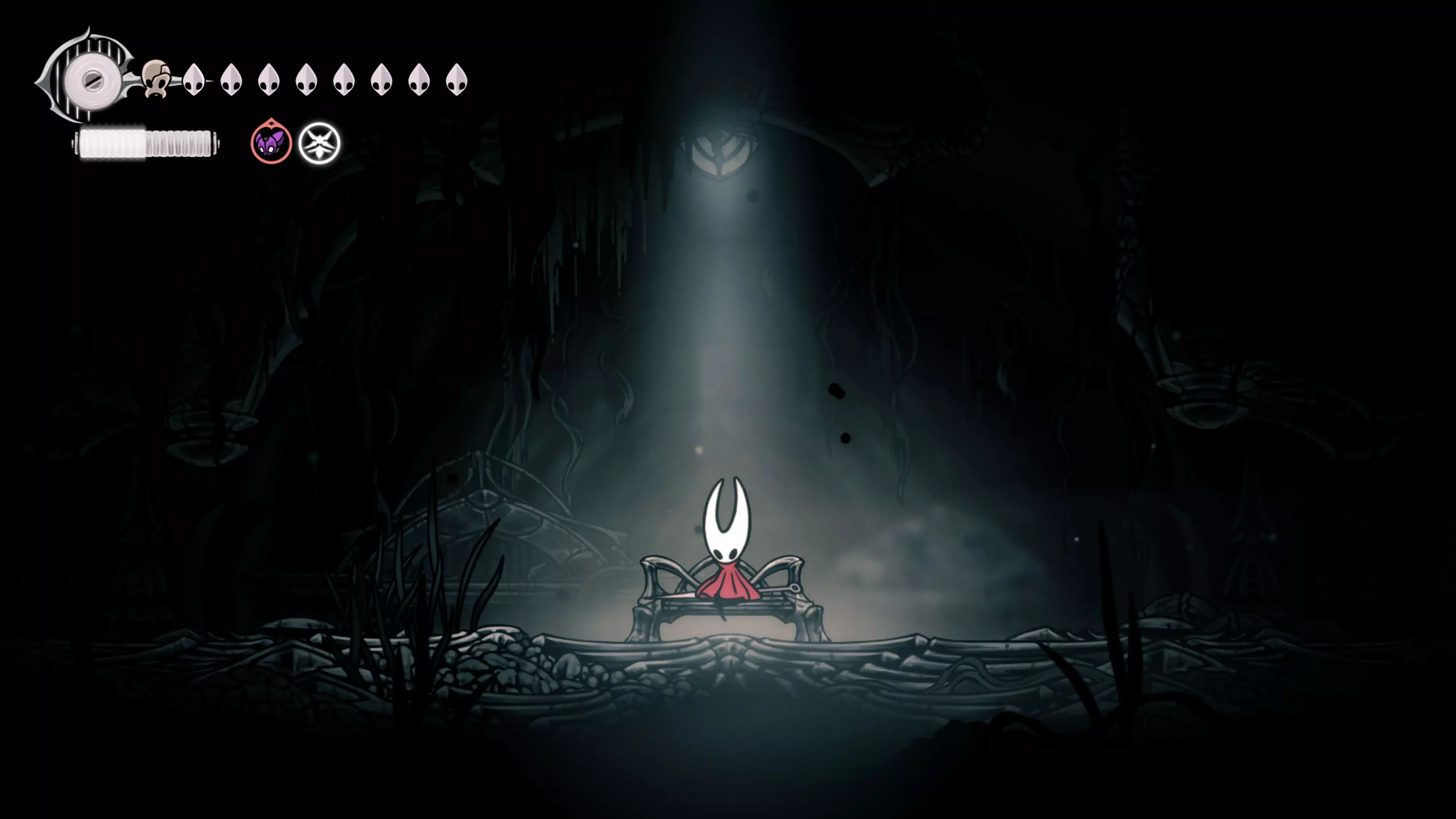 接下来需要穿过这片区域并完全探索它,直到抵达顶端。这里的平台跳跃可能并不简单——记住,你可以将钉子扔向带刺的石头,霍恩特会自动弹开。抵达顶端后,使用【王之翼】进入【电车门】。