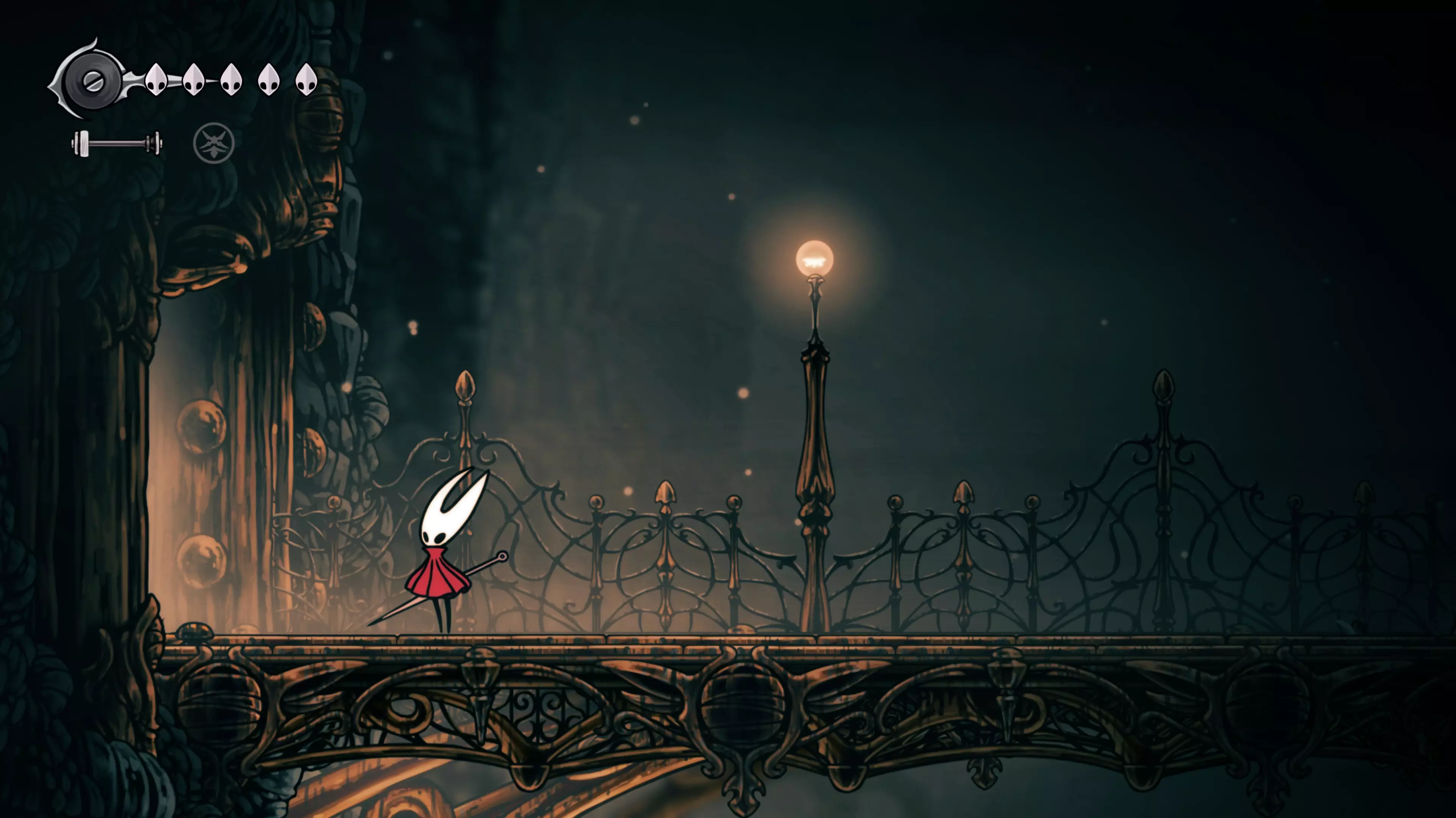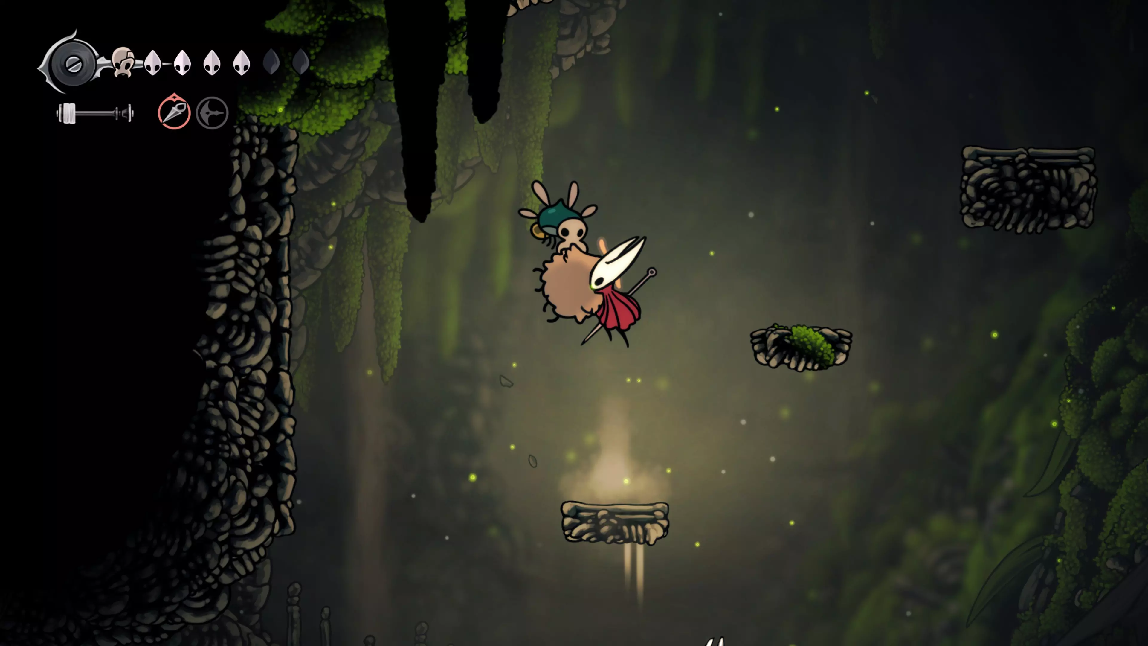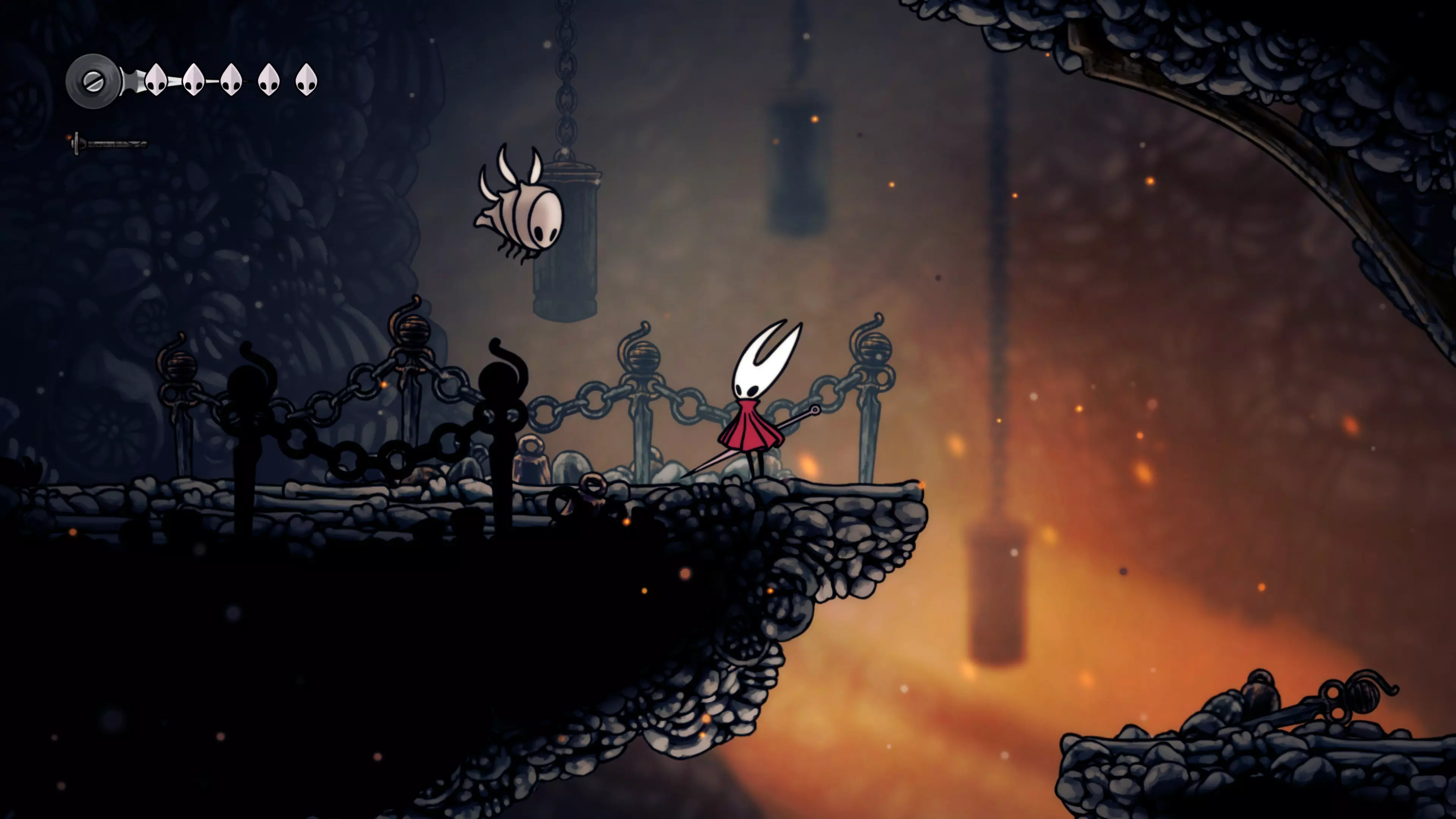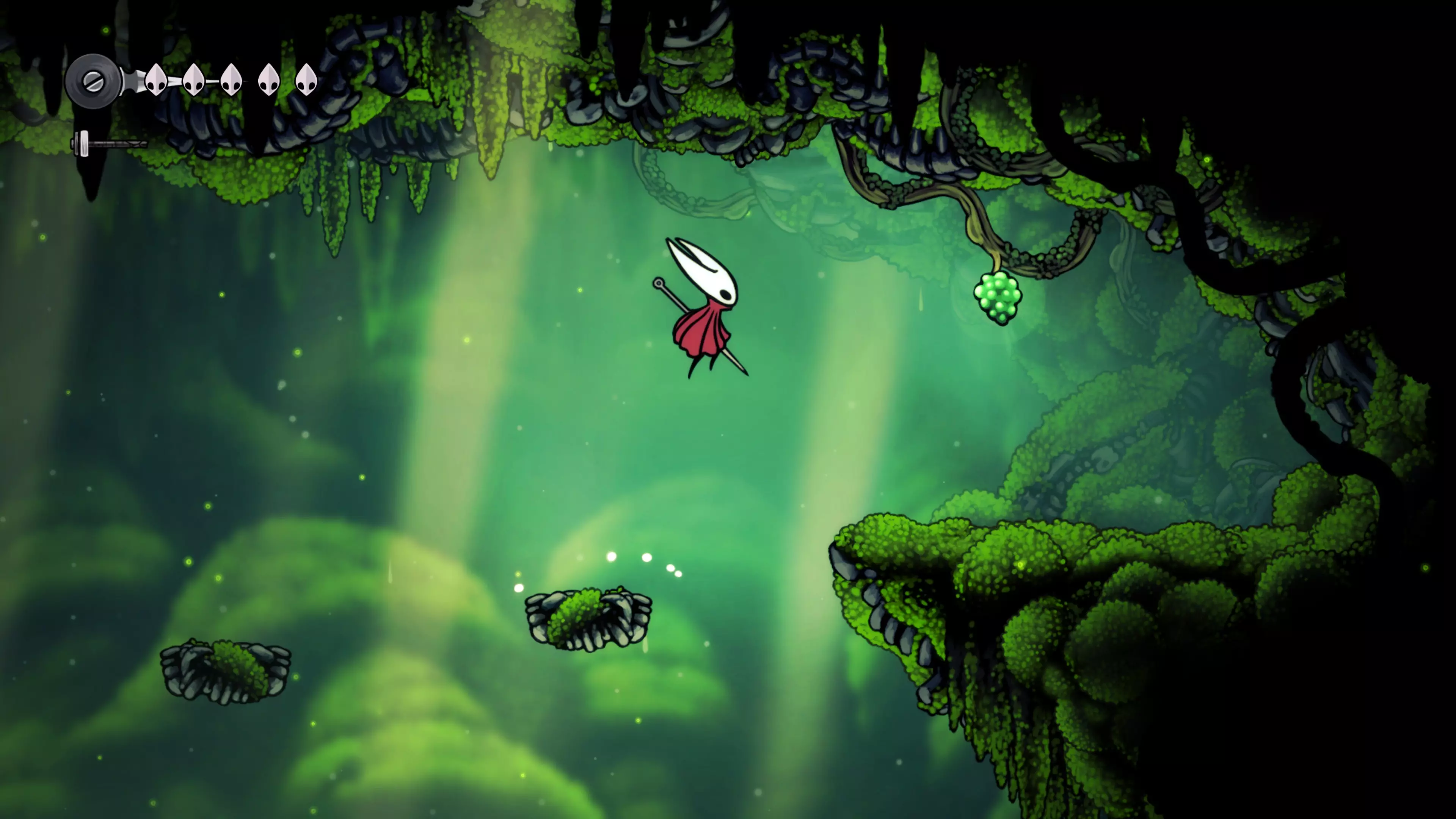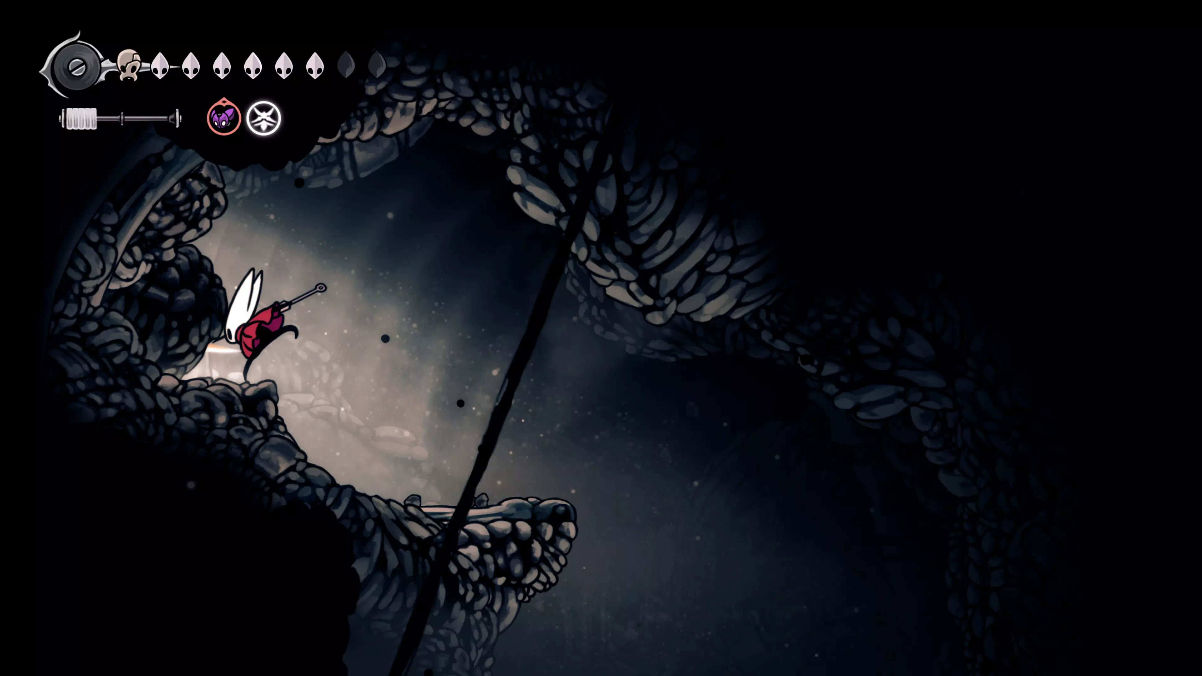 接下来需要穿过这片区域并完全探索它,直到抵达顶端。这里的平台跳跃可能并不简单——记住,你可以将钉子扔向带刺的石头,霍恩特会自动弹开。抵达顶端后,使用【王之翼】进入【电车门】。