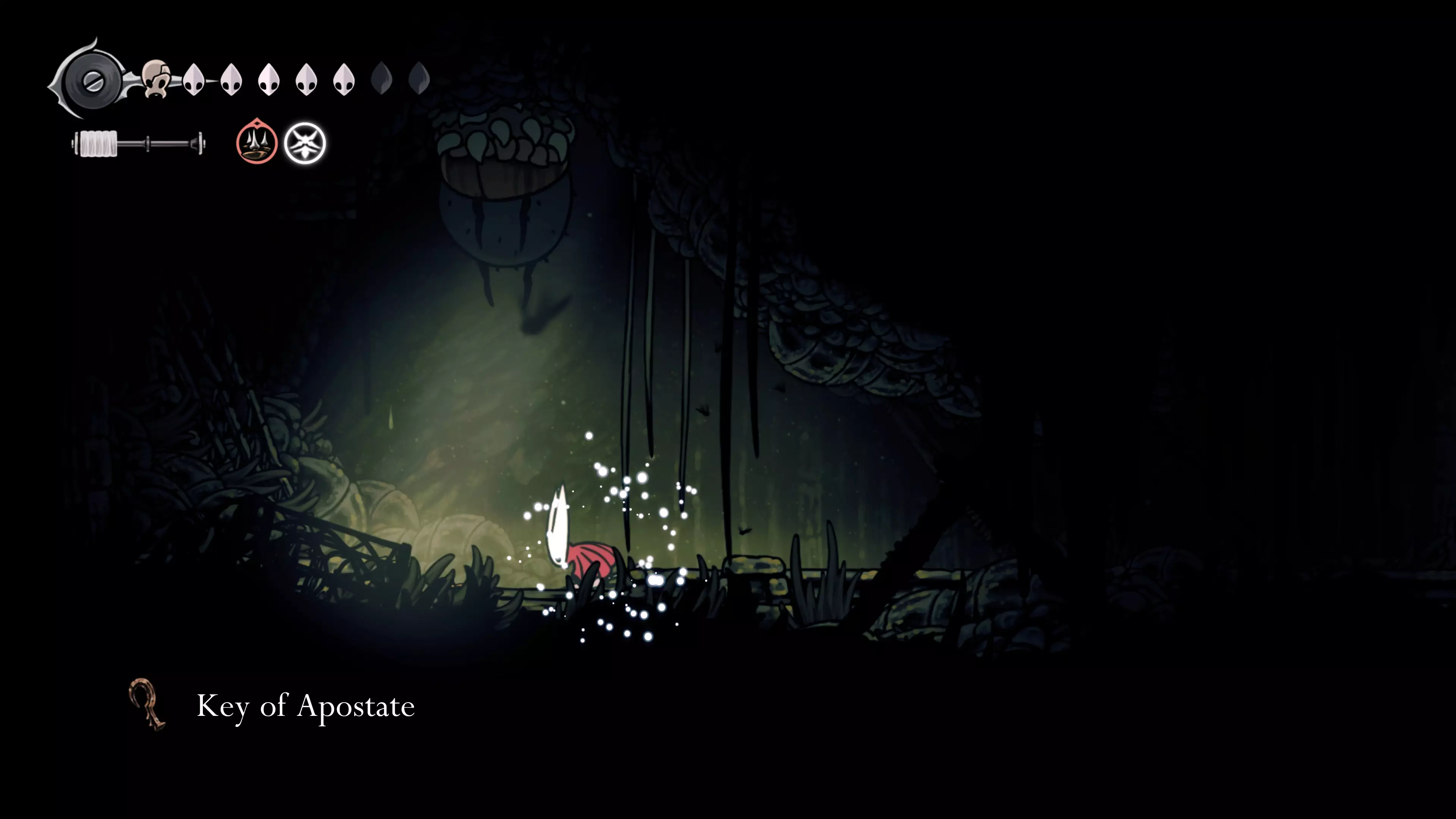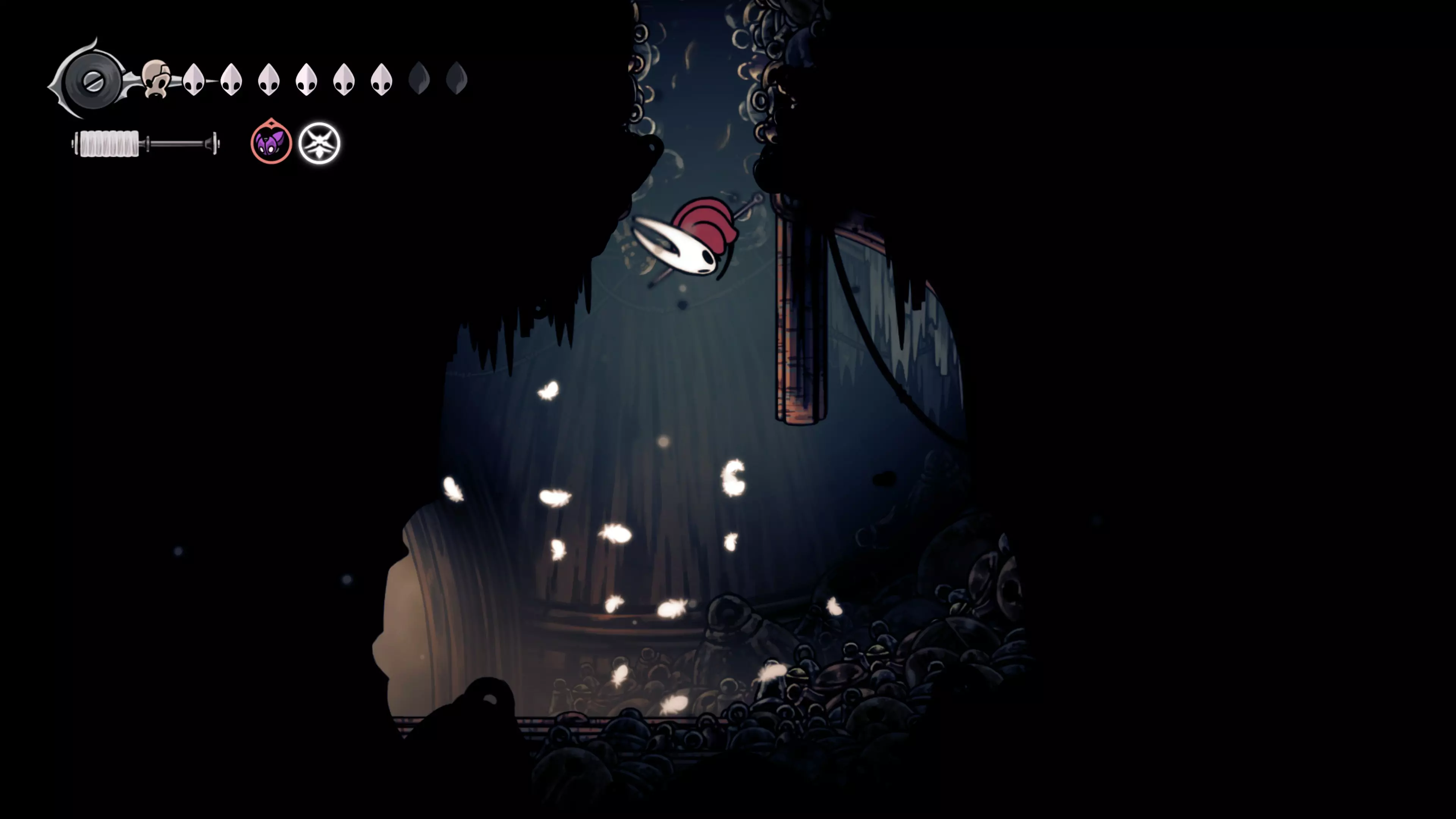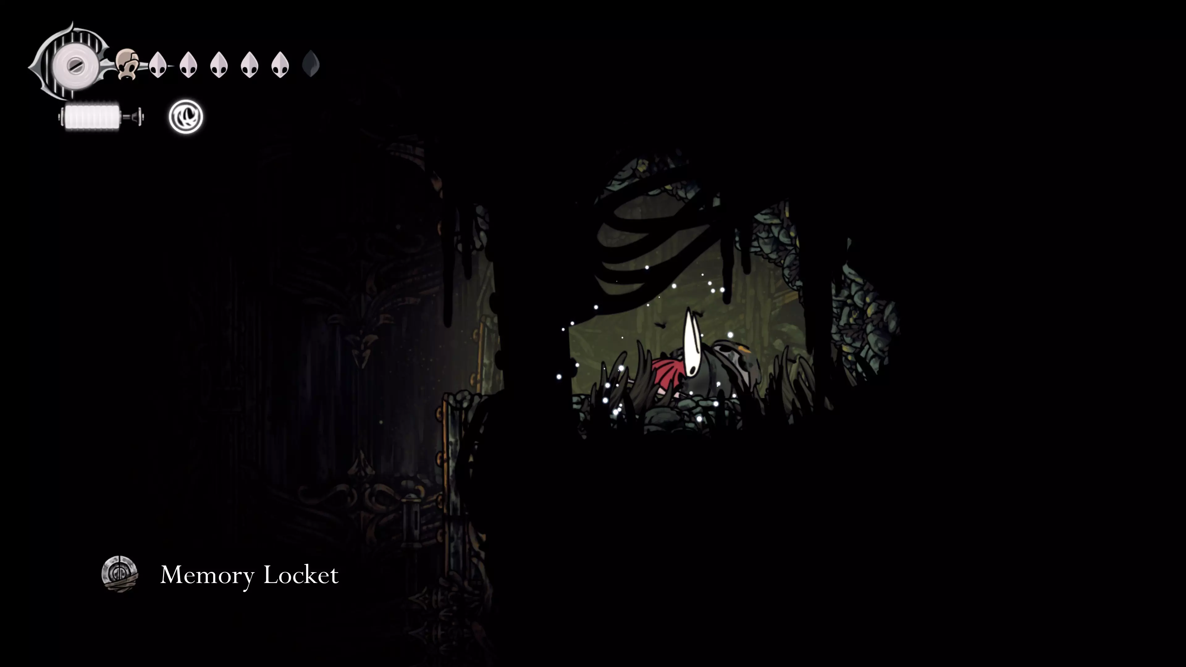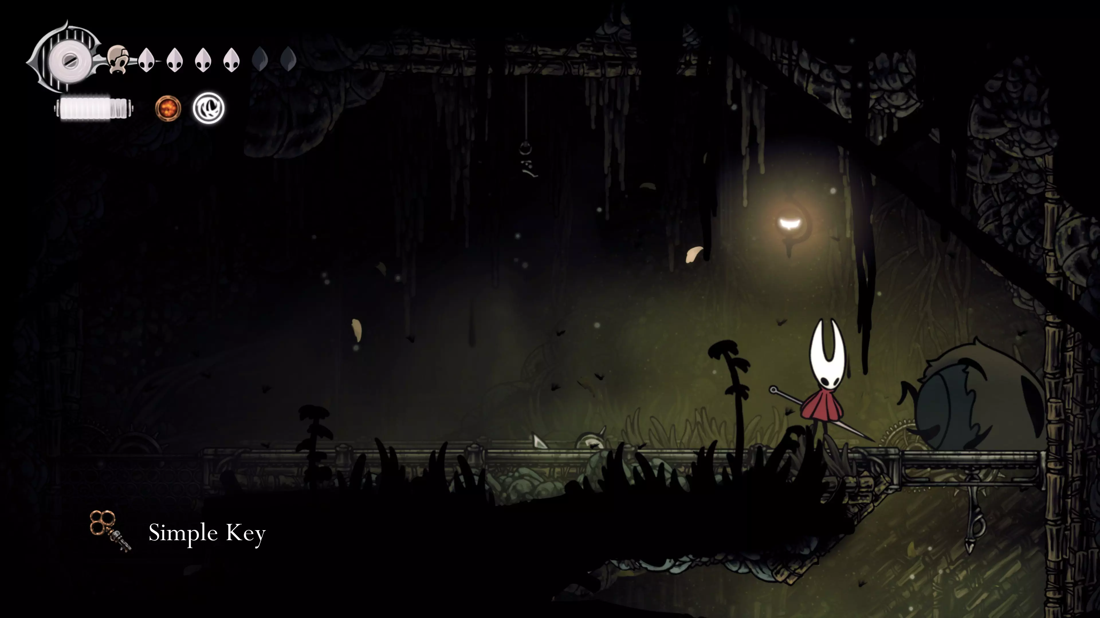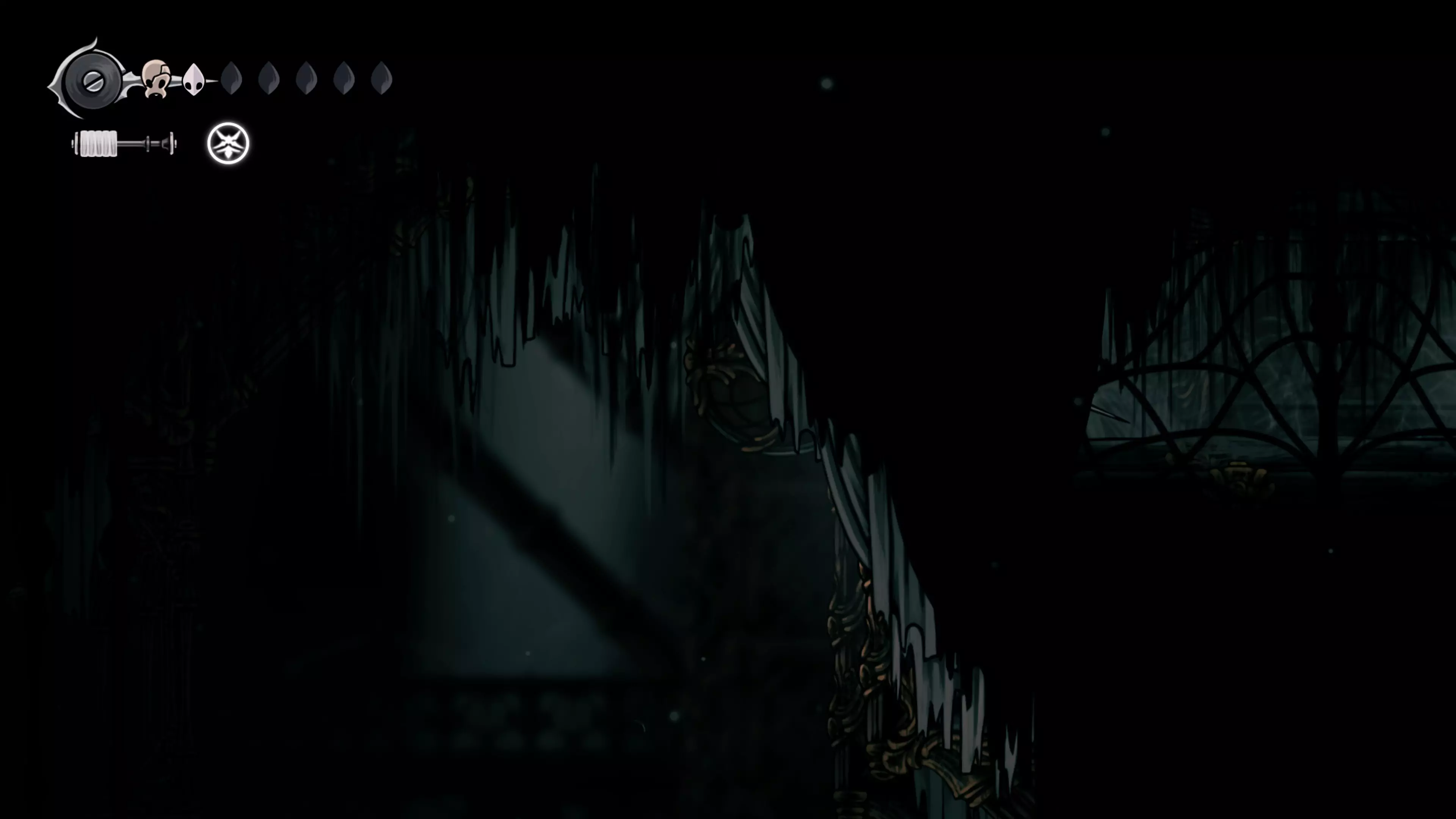 在我们之前找到沙克洛伊房间的区域,向上走一小段路,去探索右侧部分。很快我们会进入一个高高的垂直区域,从那里继续向右走,直到到达有蟑螂的沼泽。在这个房间的尽头,我们会找到下一块面具碎片。