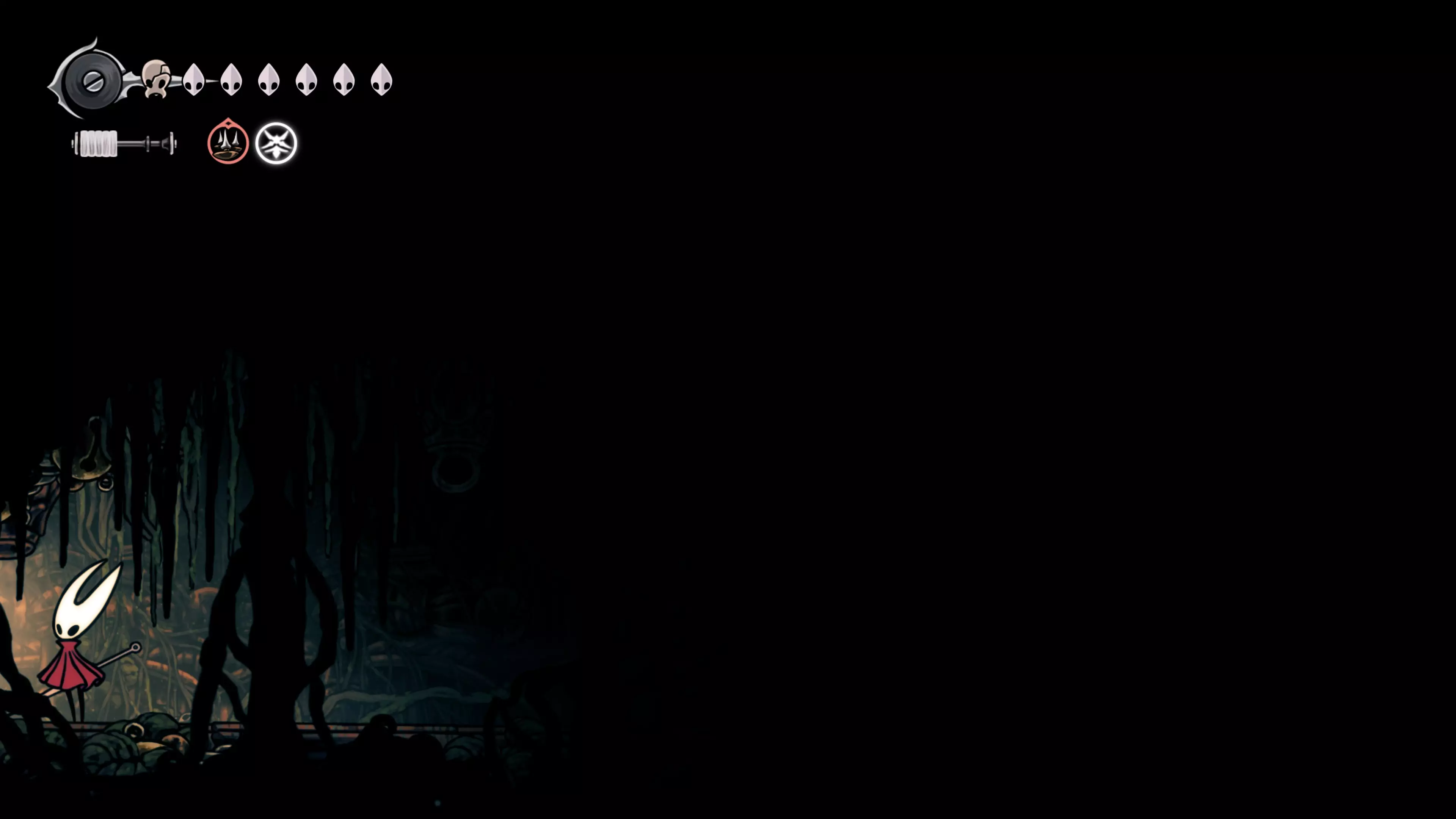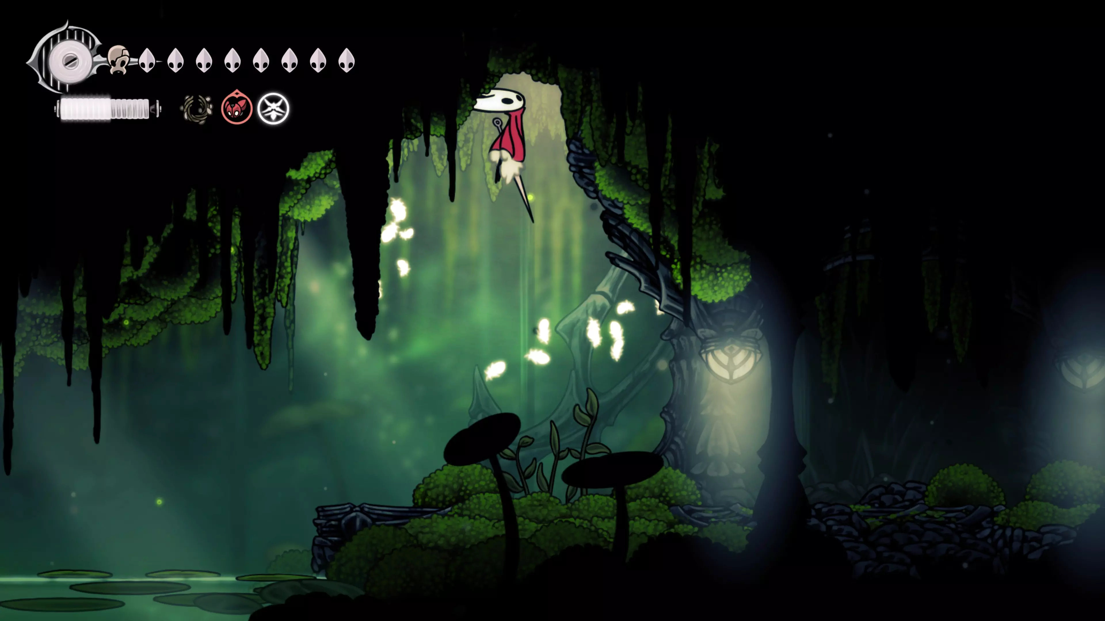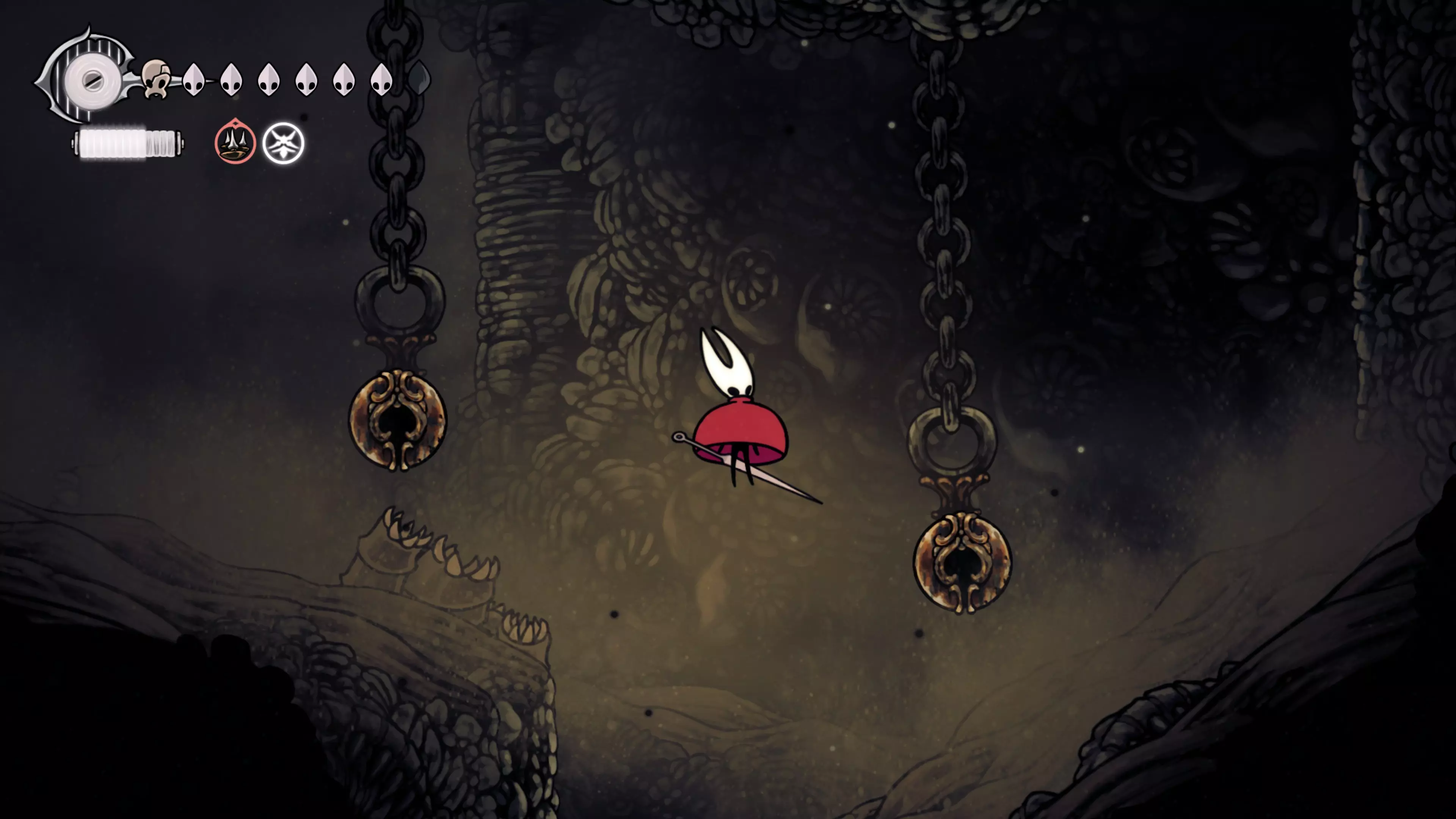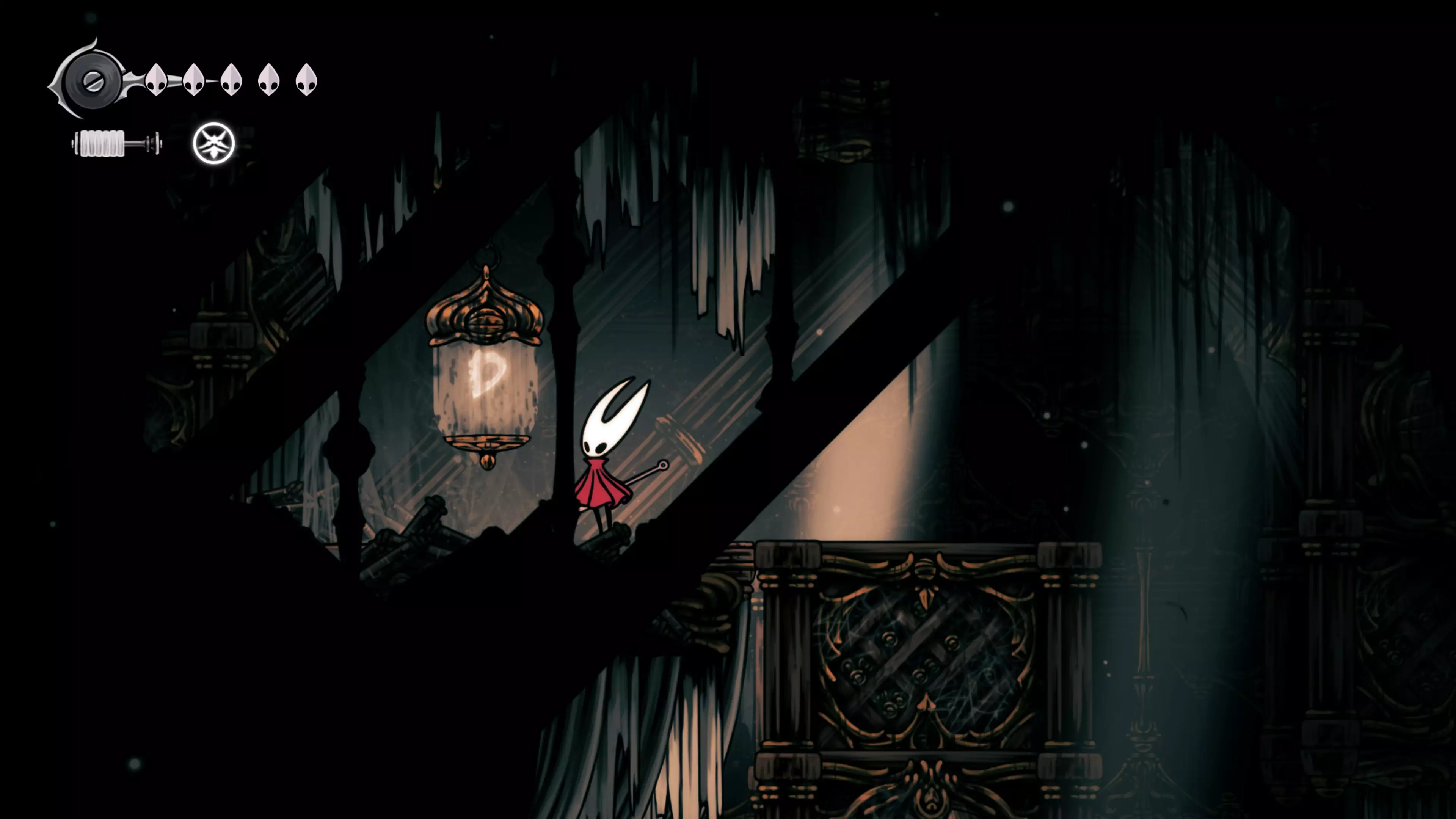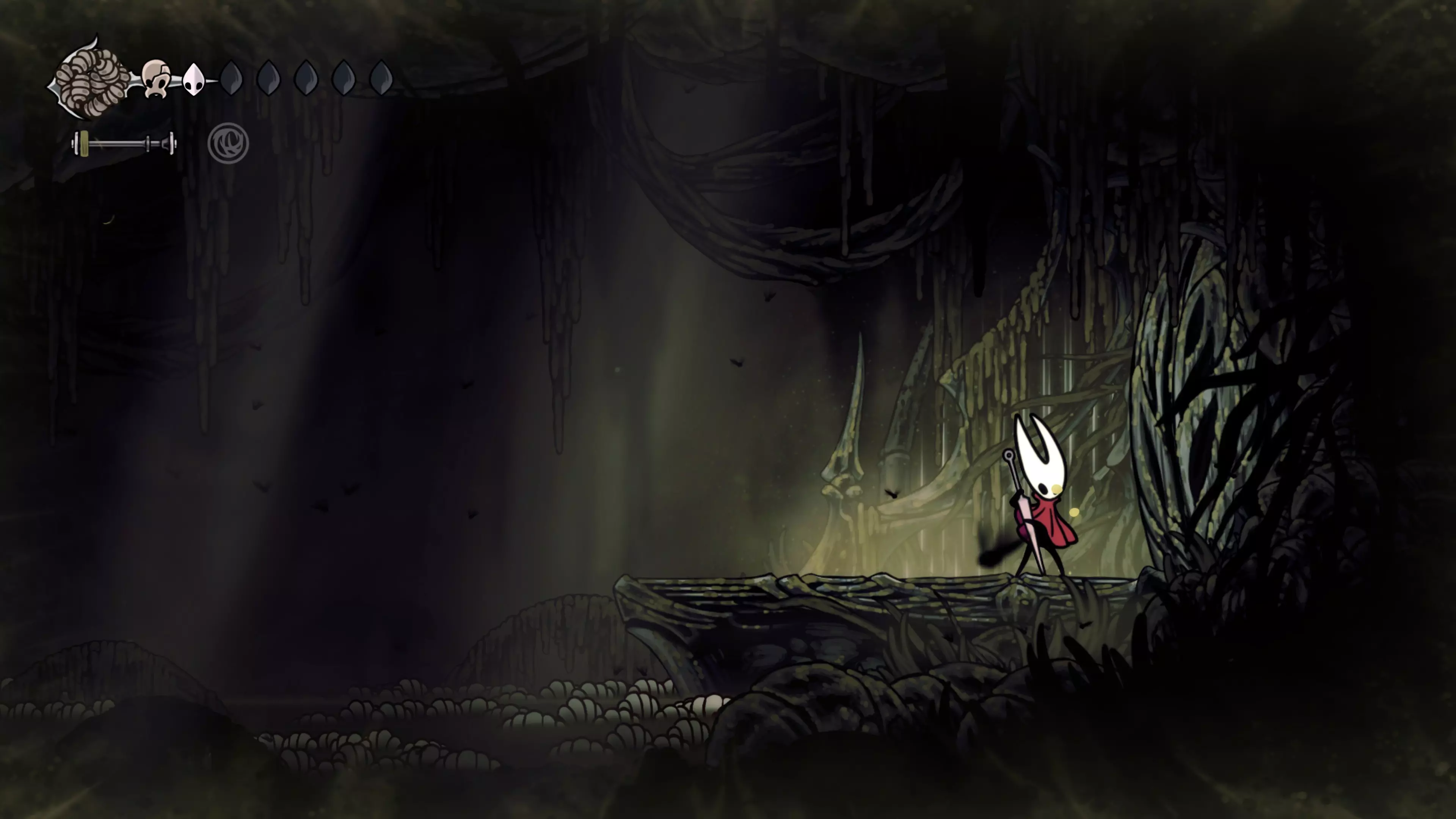 在我们之前找到沙克洛伊房间的区域,向上走一小段路,去探索右侧部分。很快我们会进入一个高高的垂直区域,从那里继续向右走,直到到达有蟑螂的沼泽。在这个房间的尽头,我们会找到下一块面具碎片。