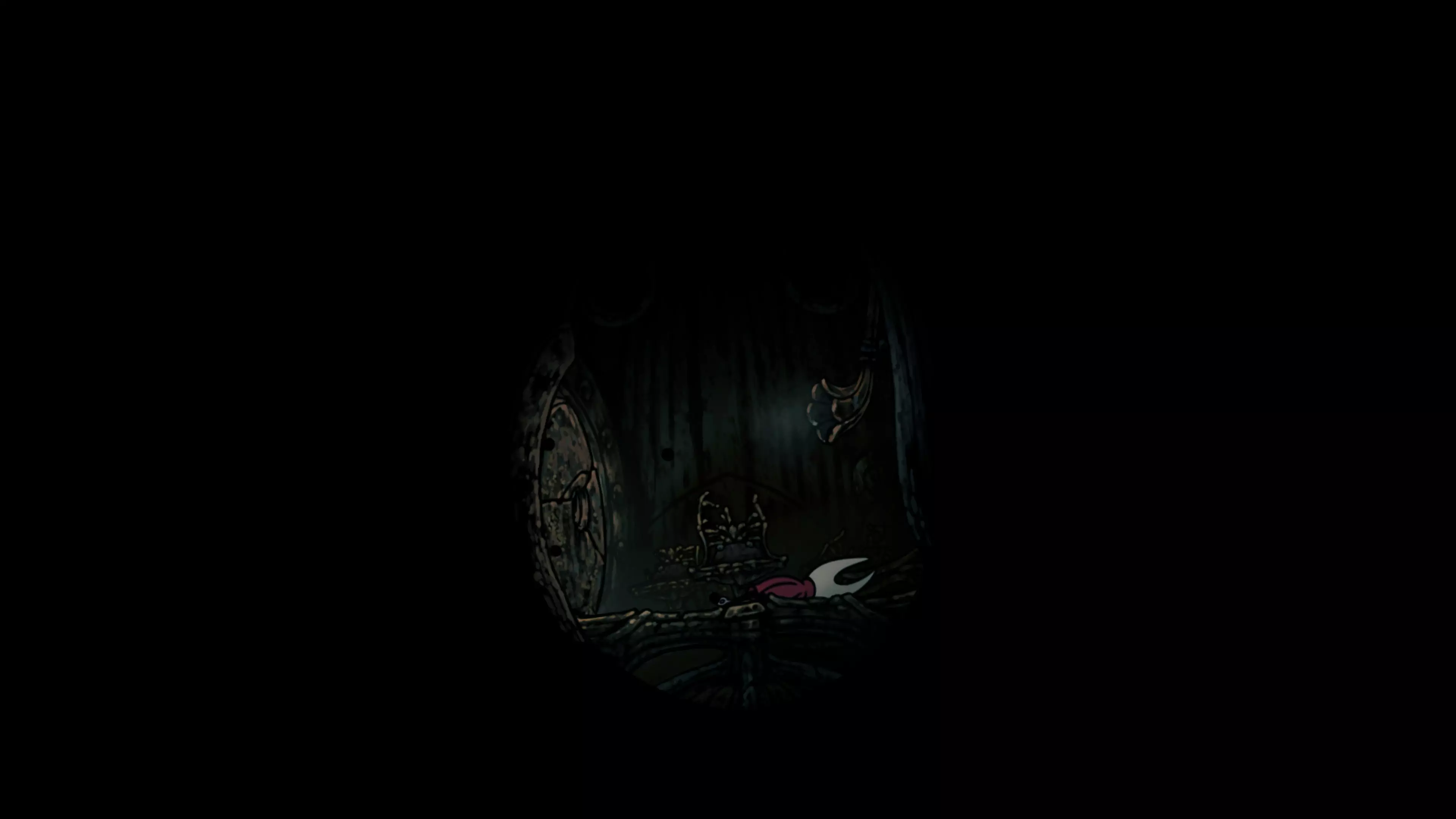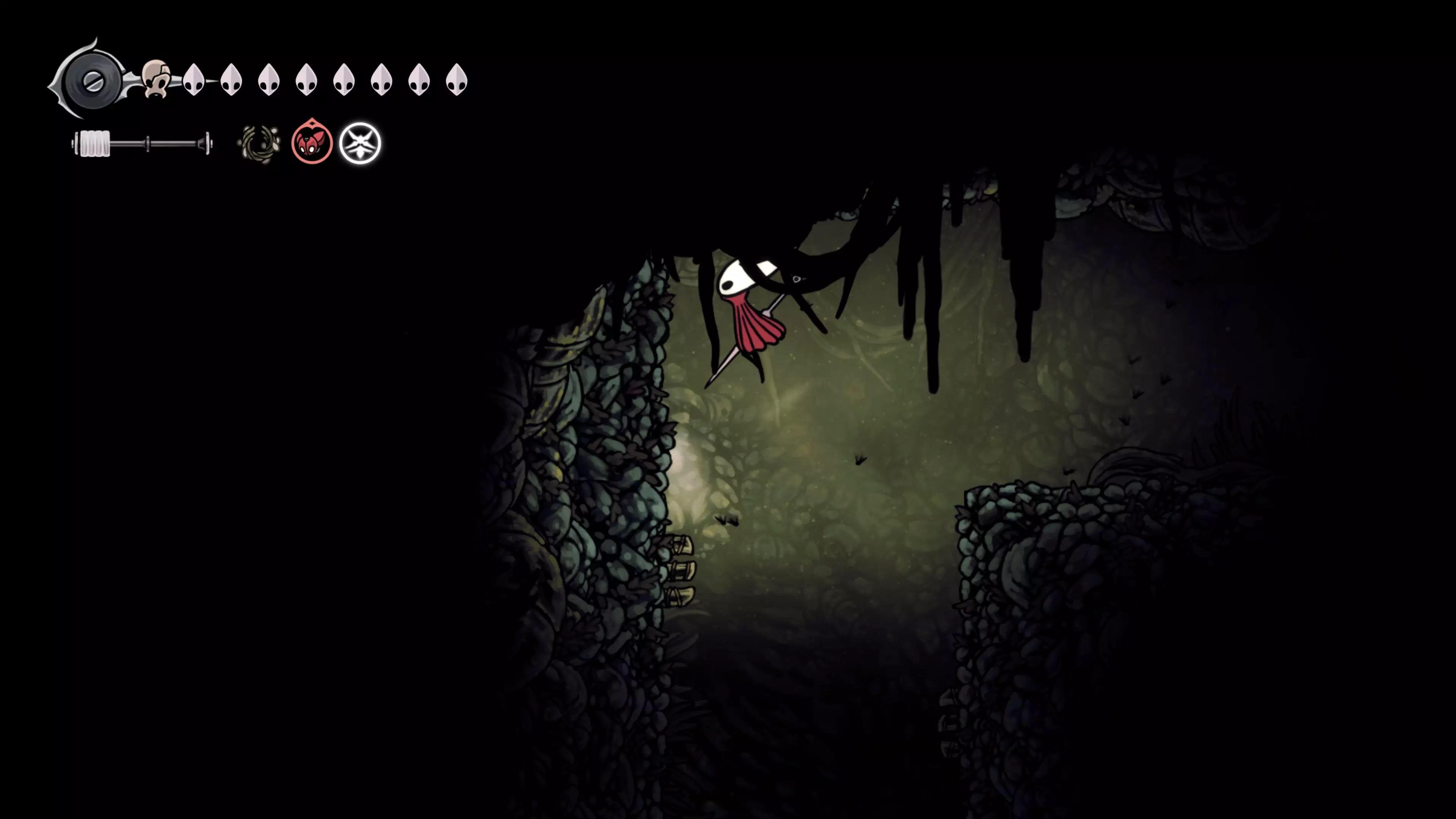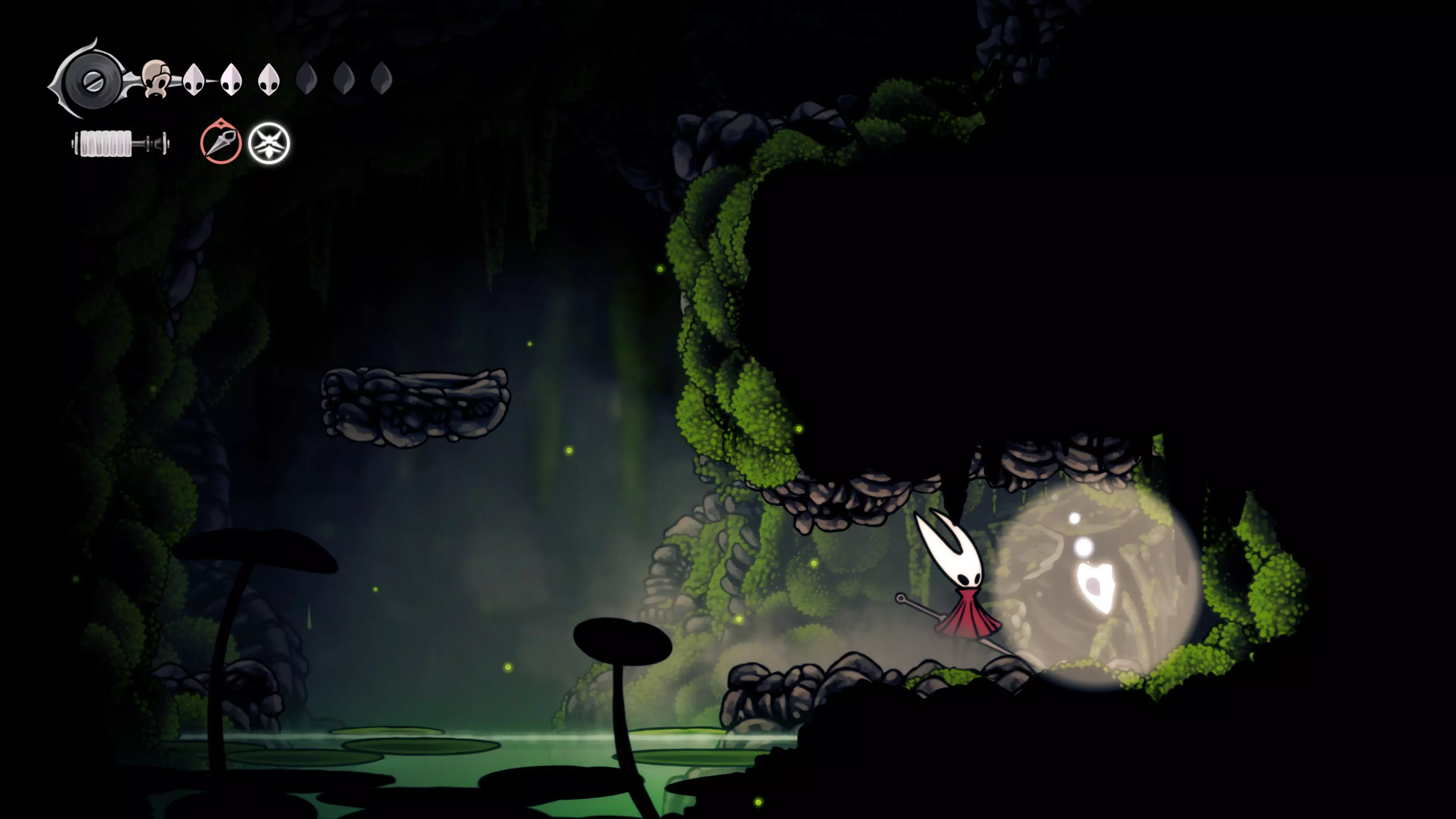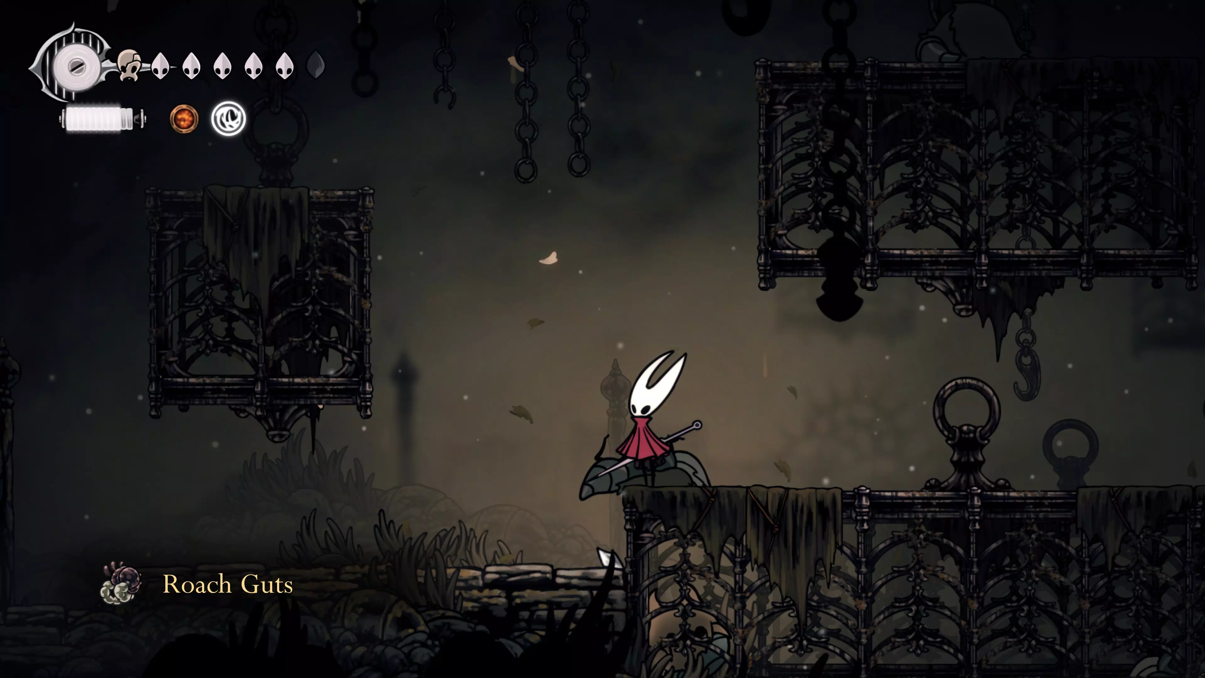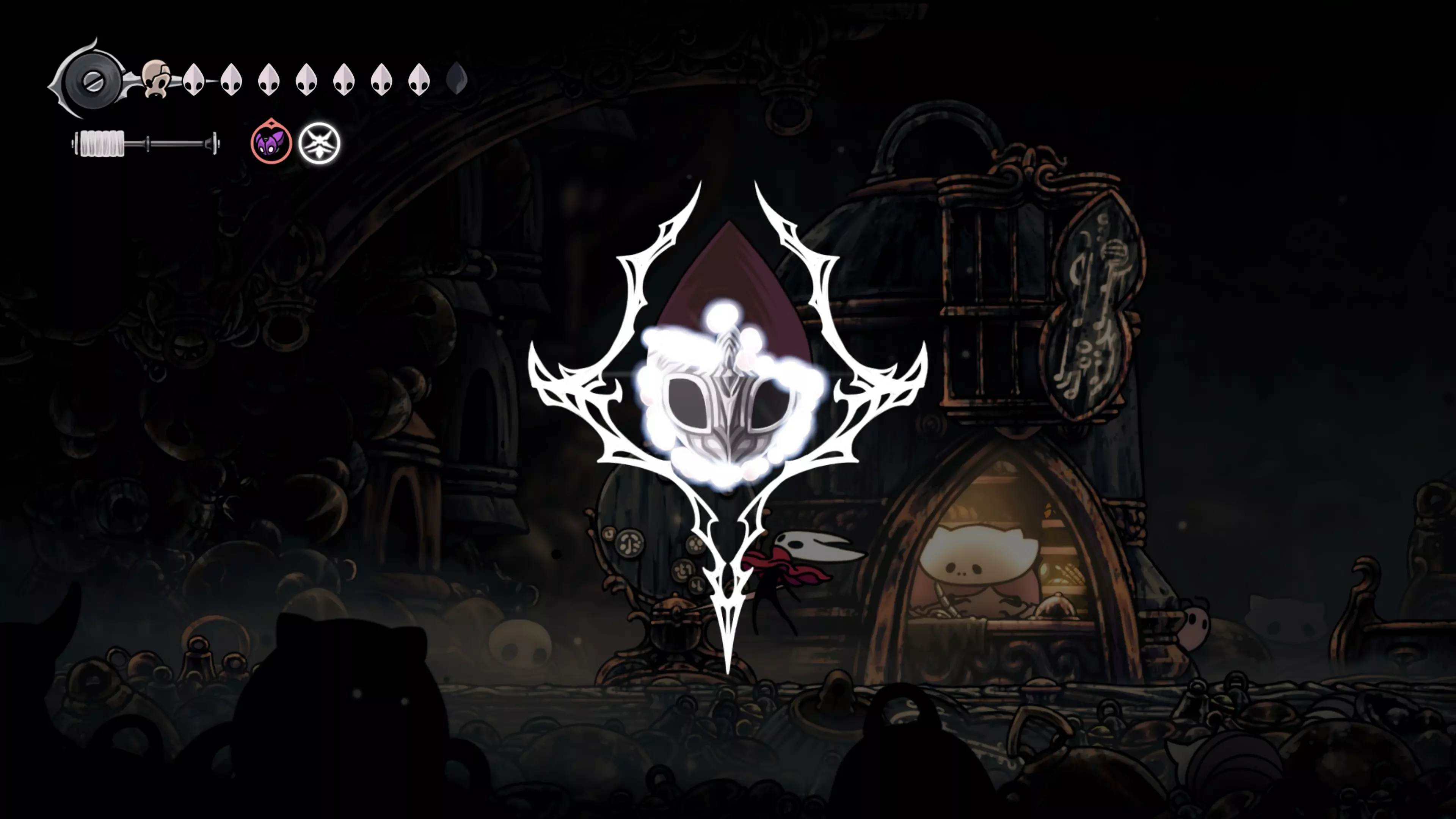 在我们之前找到沙克洛伊房间的区域,向上走一小段路,去探索右侧部分。很快我们会进入一个高高的垂直区域,从那里继续向右走,直到到达有蟑螂的沼泽。在这个房间的尽头,我们会找到下一块面具碎片。