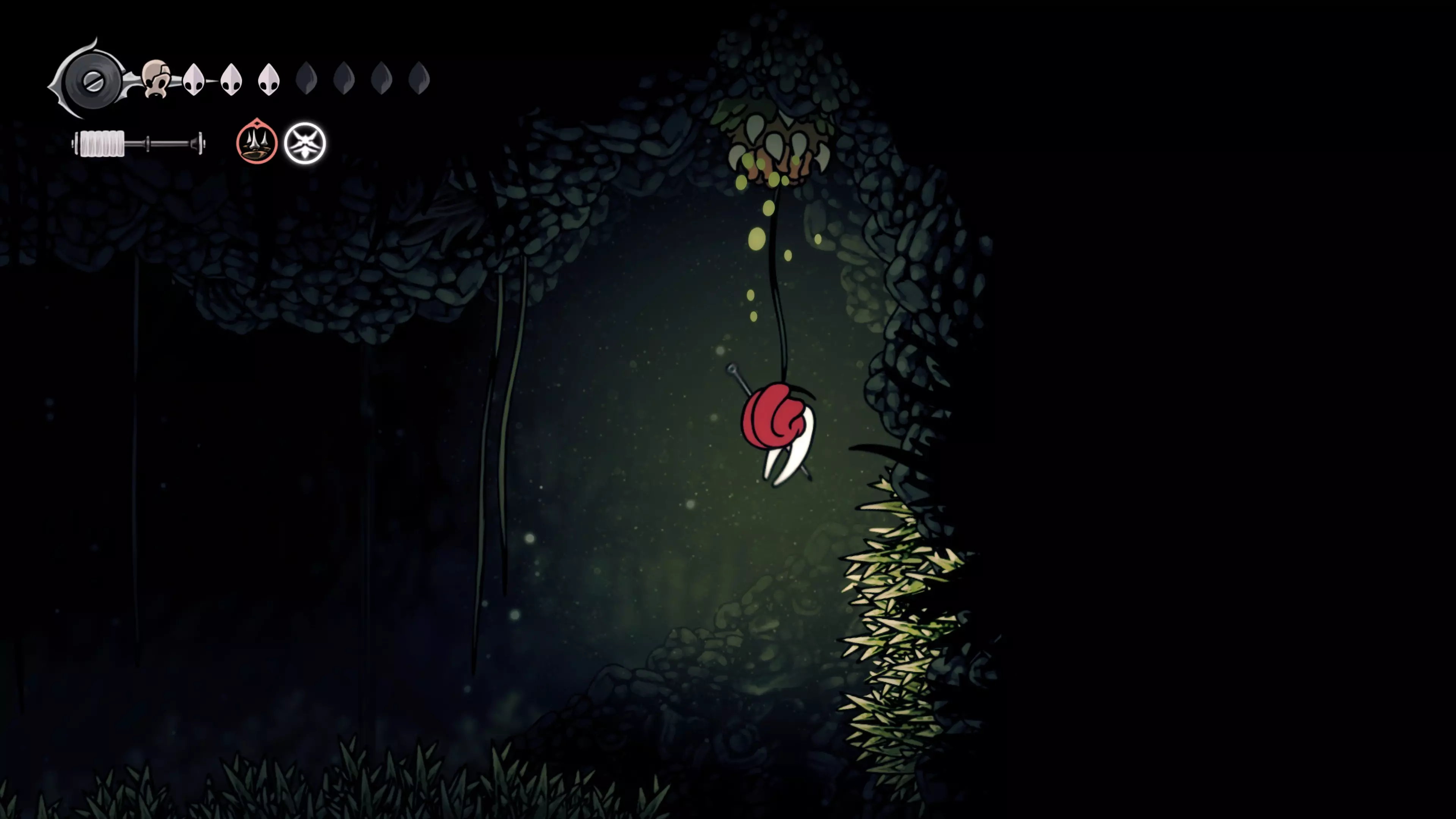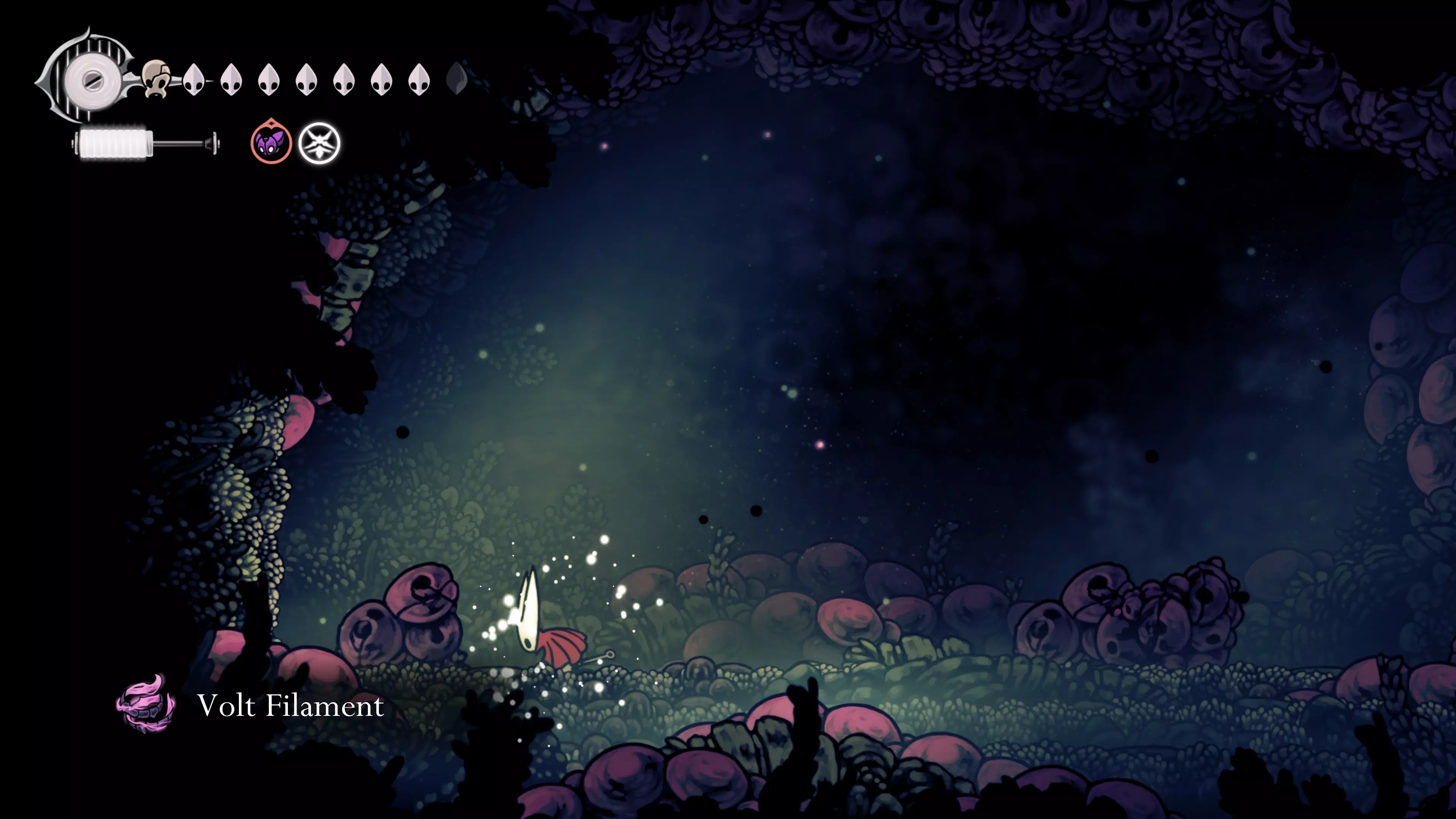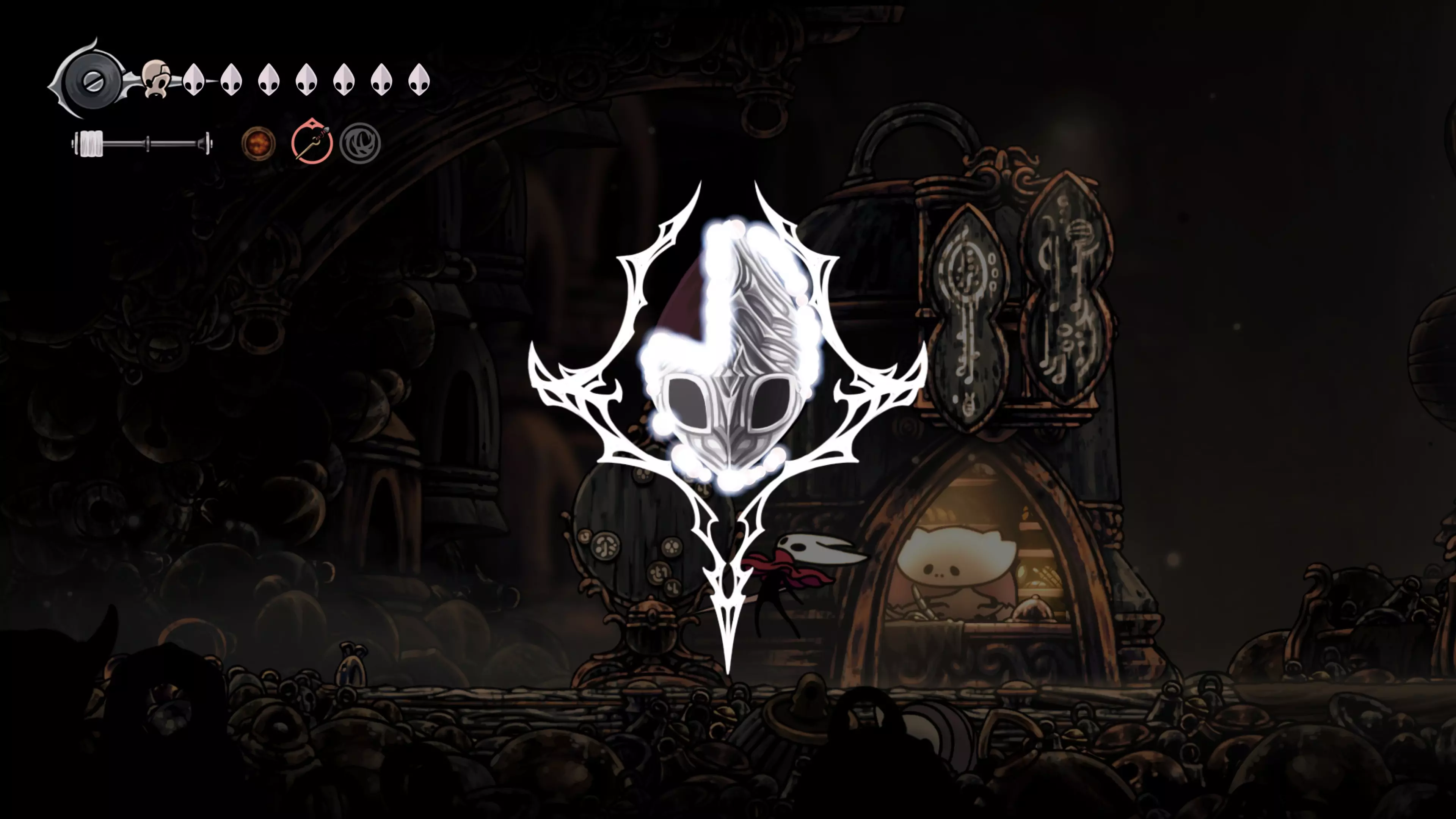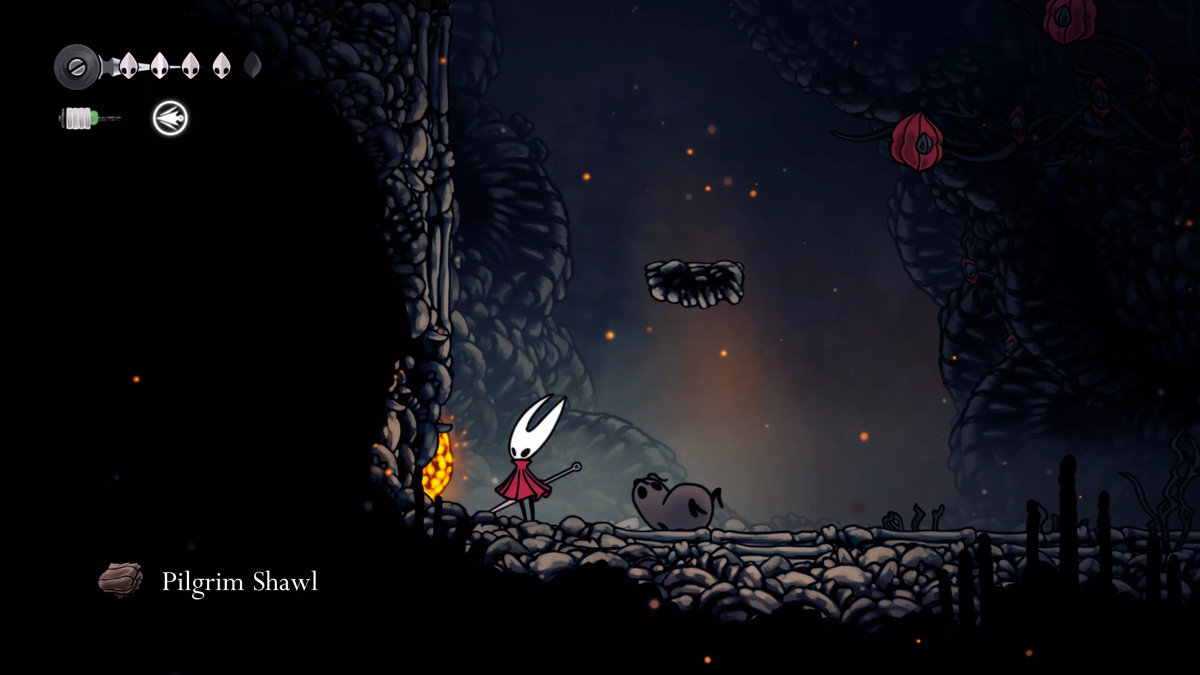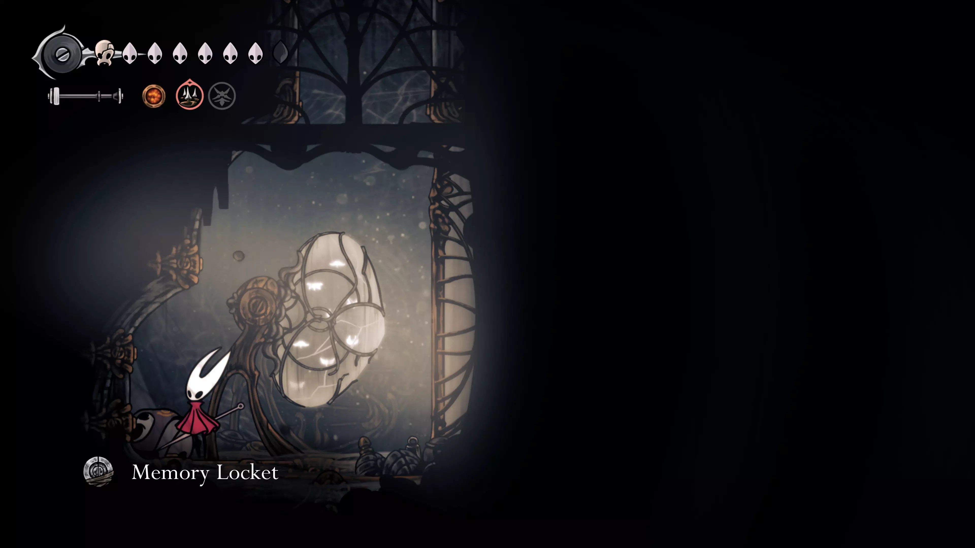 在我们之前找到沙克洛伊房间的区域,向上走一小段路,去探索右侧部分。很快我们会进入一个高高的垂直区域,从那里继续向右走,直到到达有蟑螂的沼泽。在这个房间的尽头,我们会找到下一块面具碎片。