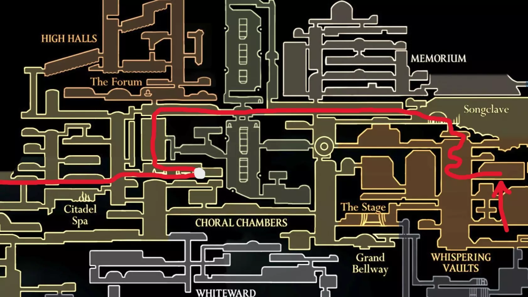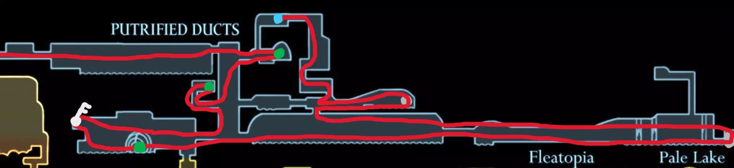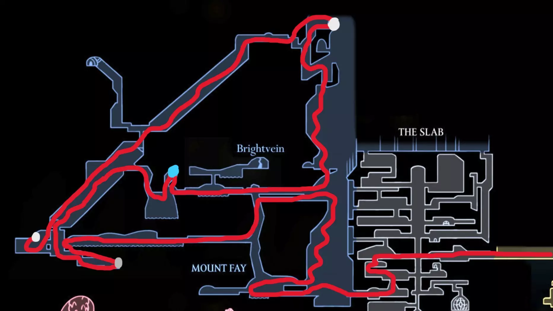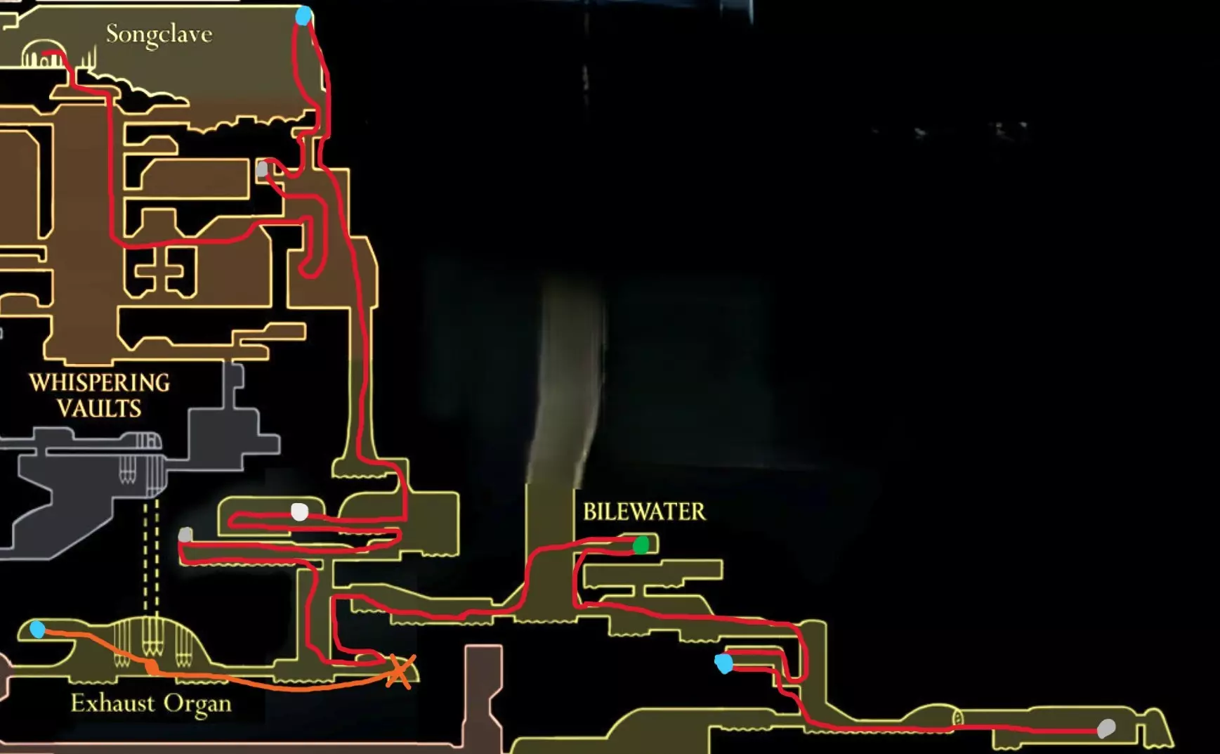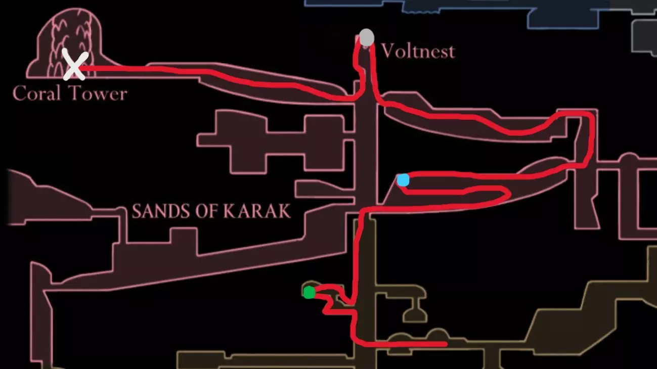 现在请完全向右移动,直到到达快速移动点。开始回溯阶段,以收集所有剩余物品。 100% 猩红洞窟 第一条路线(红色)