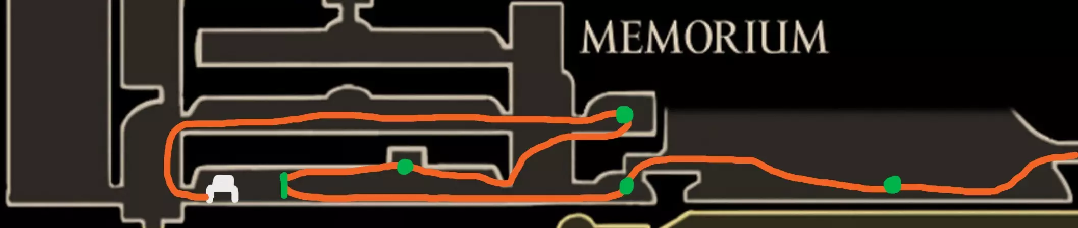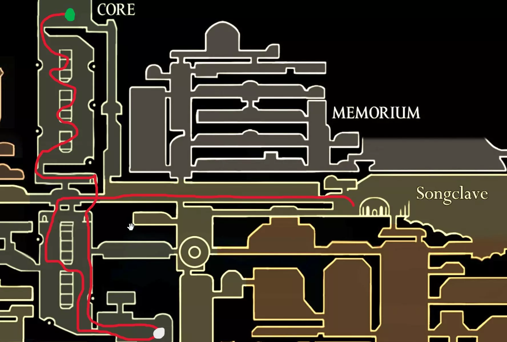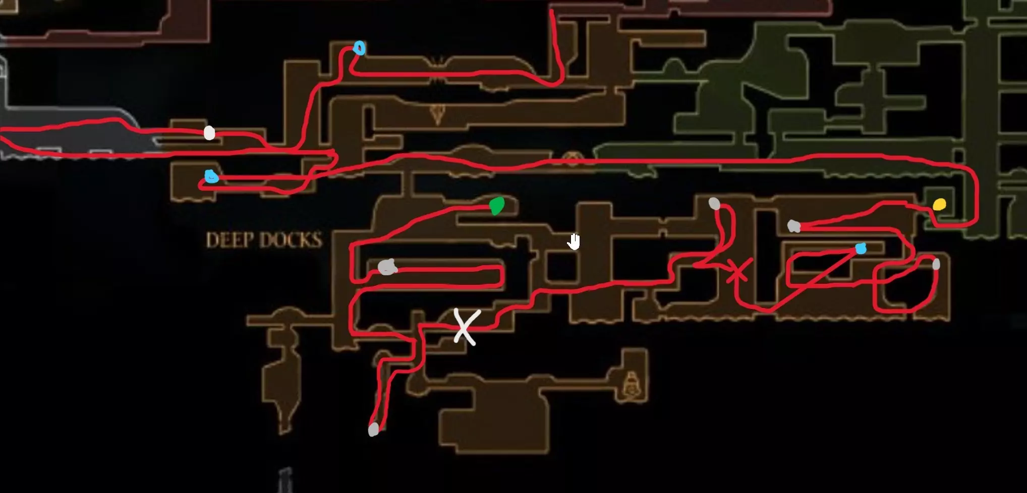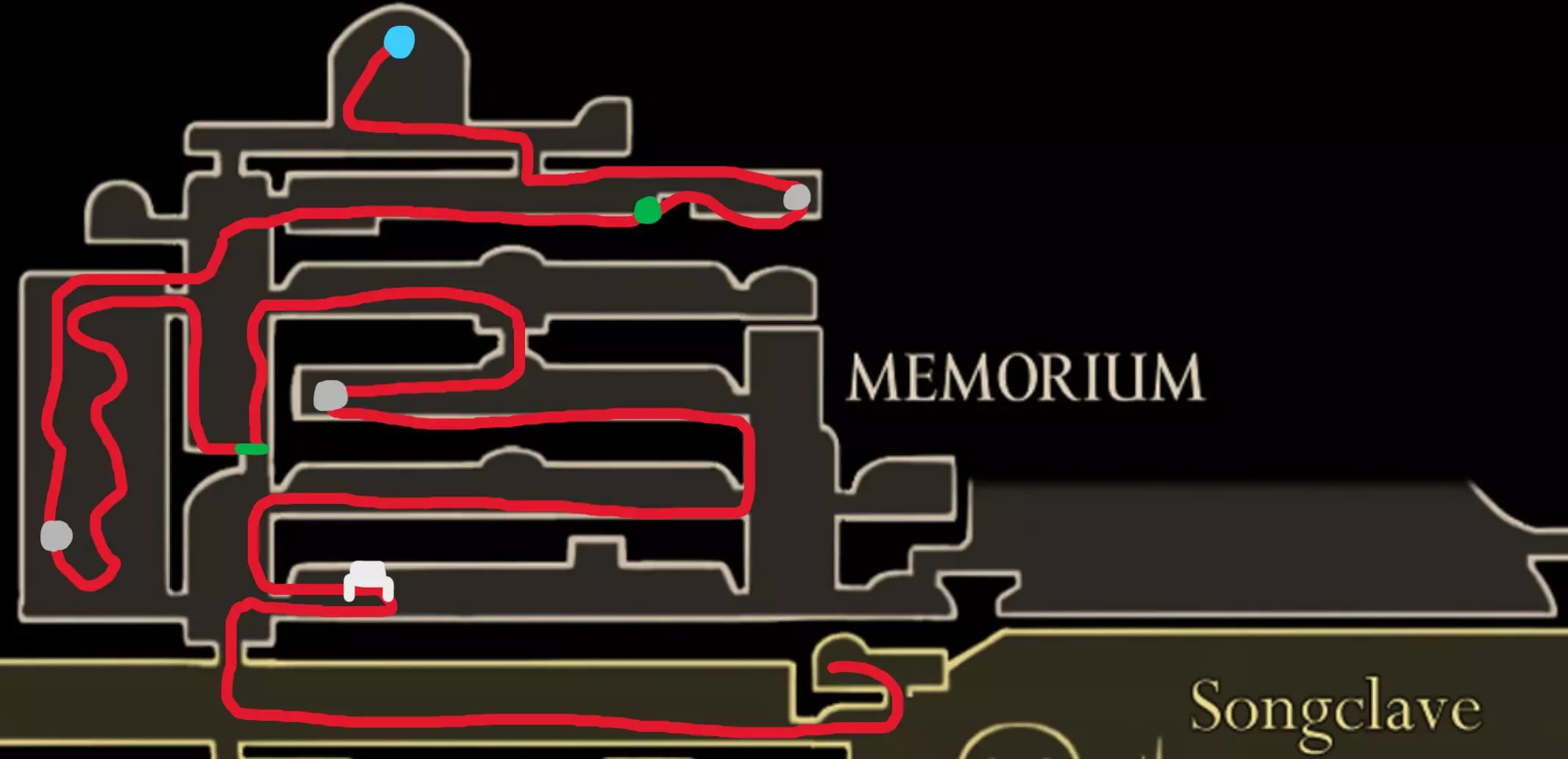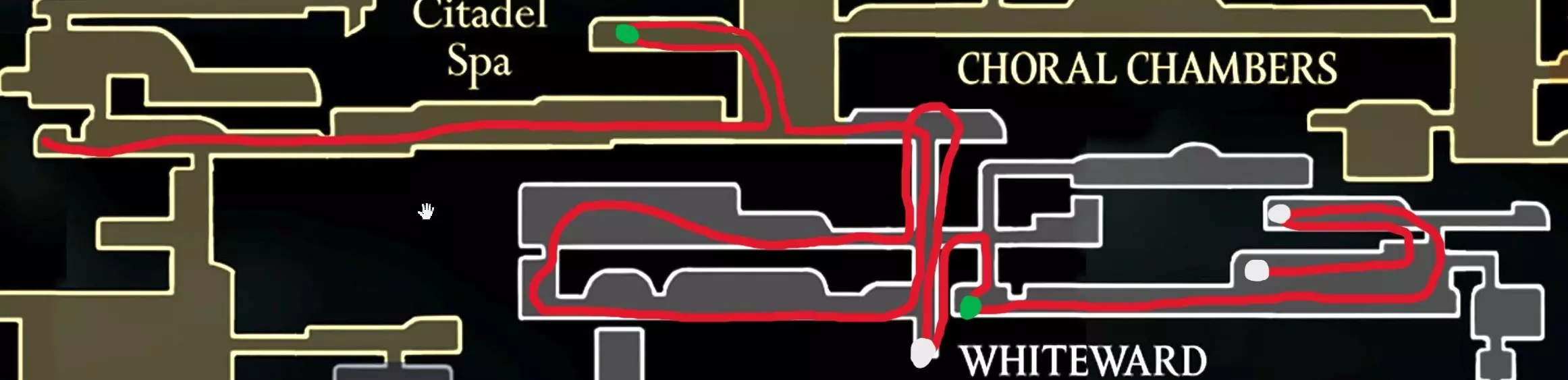 现在请完全向右移动,直到到达快速移动点。开始回溯阶段,以收集所有剩余物品。 100% 猩红洞窟 第一条路线(红色)