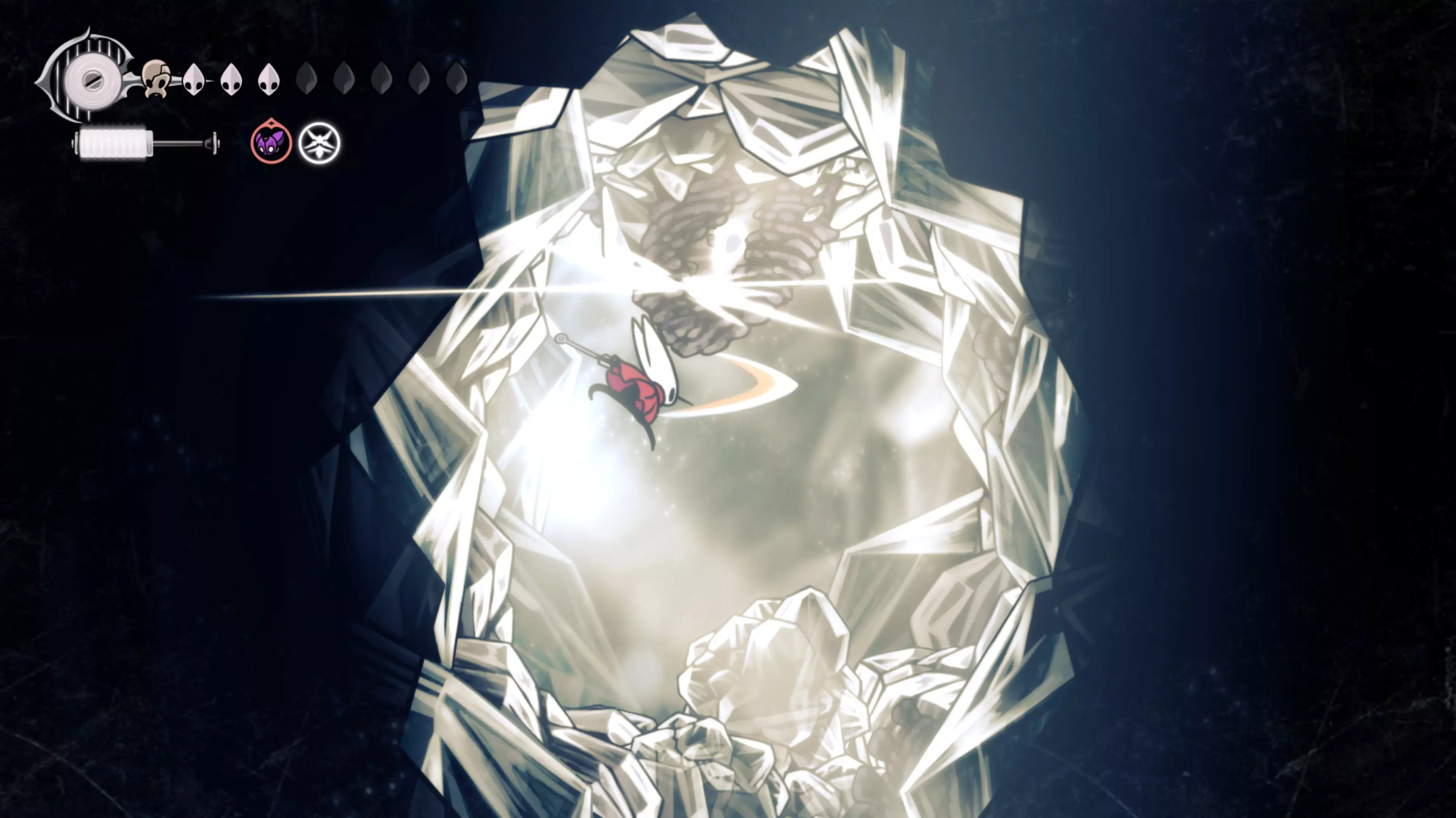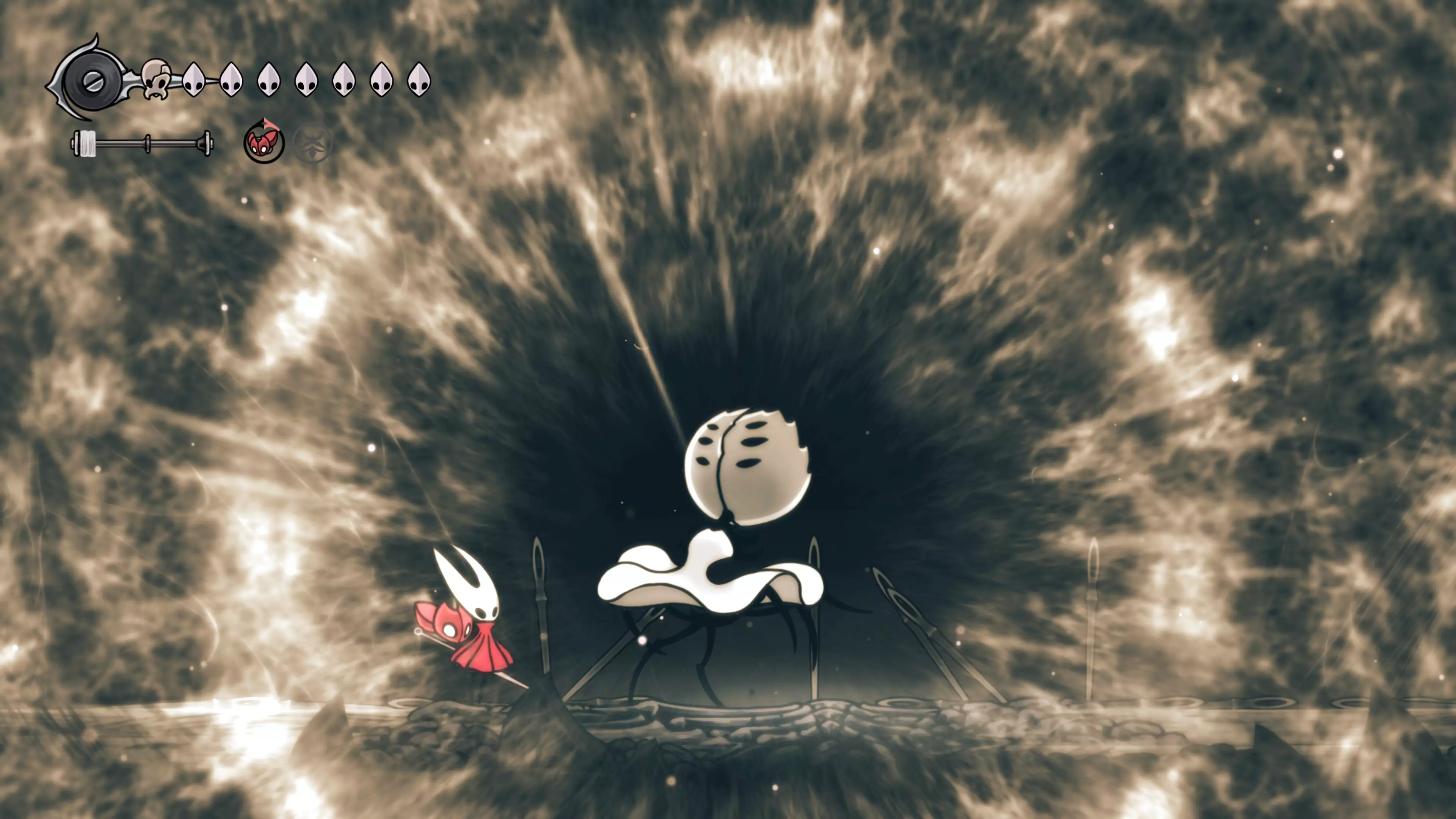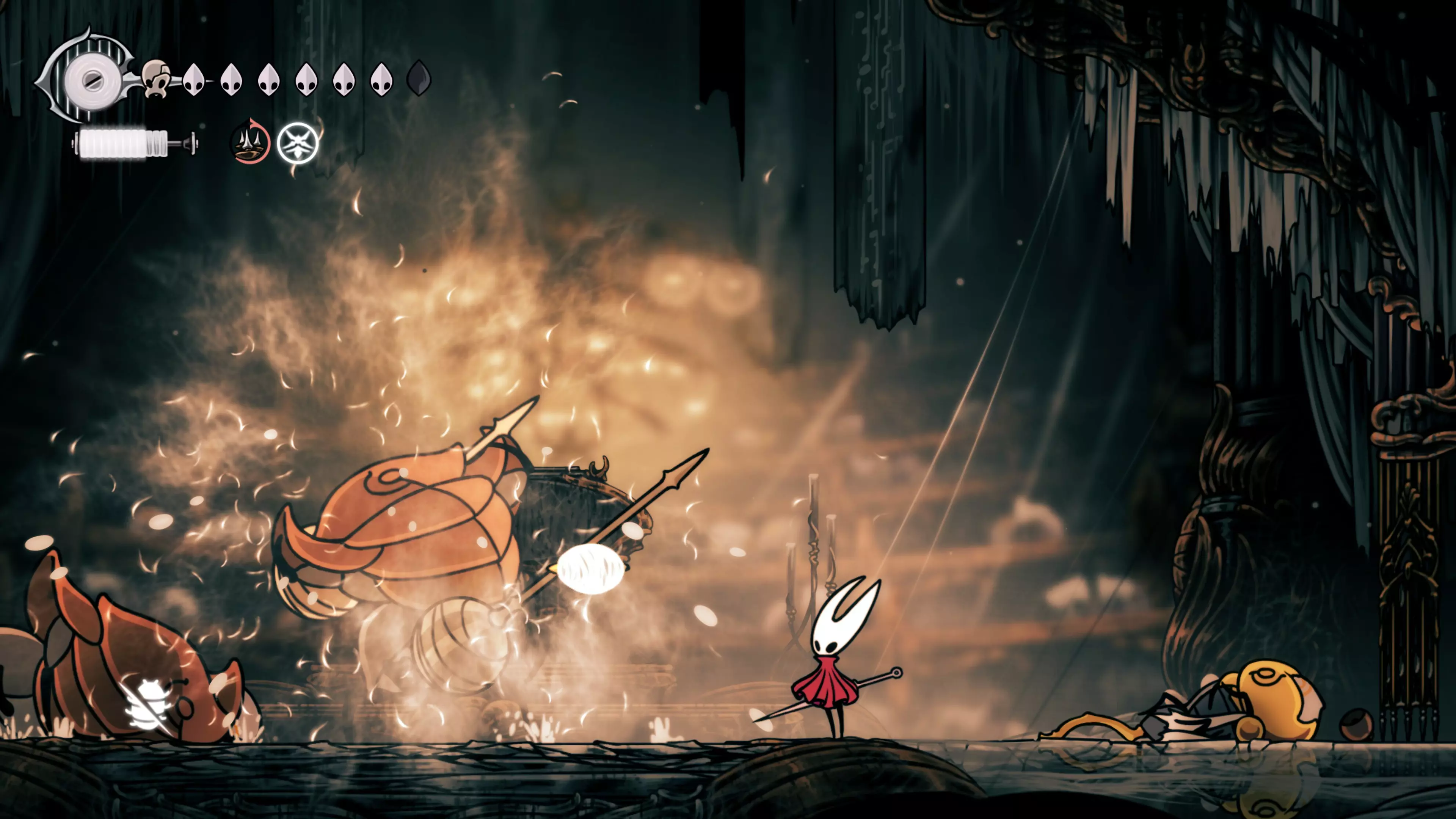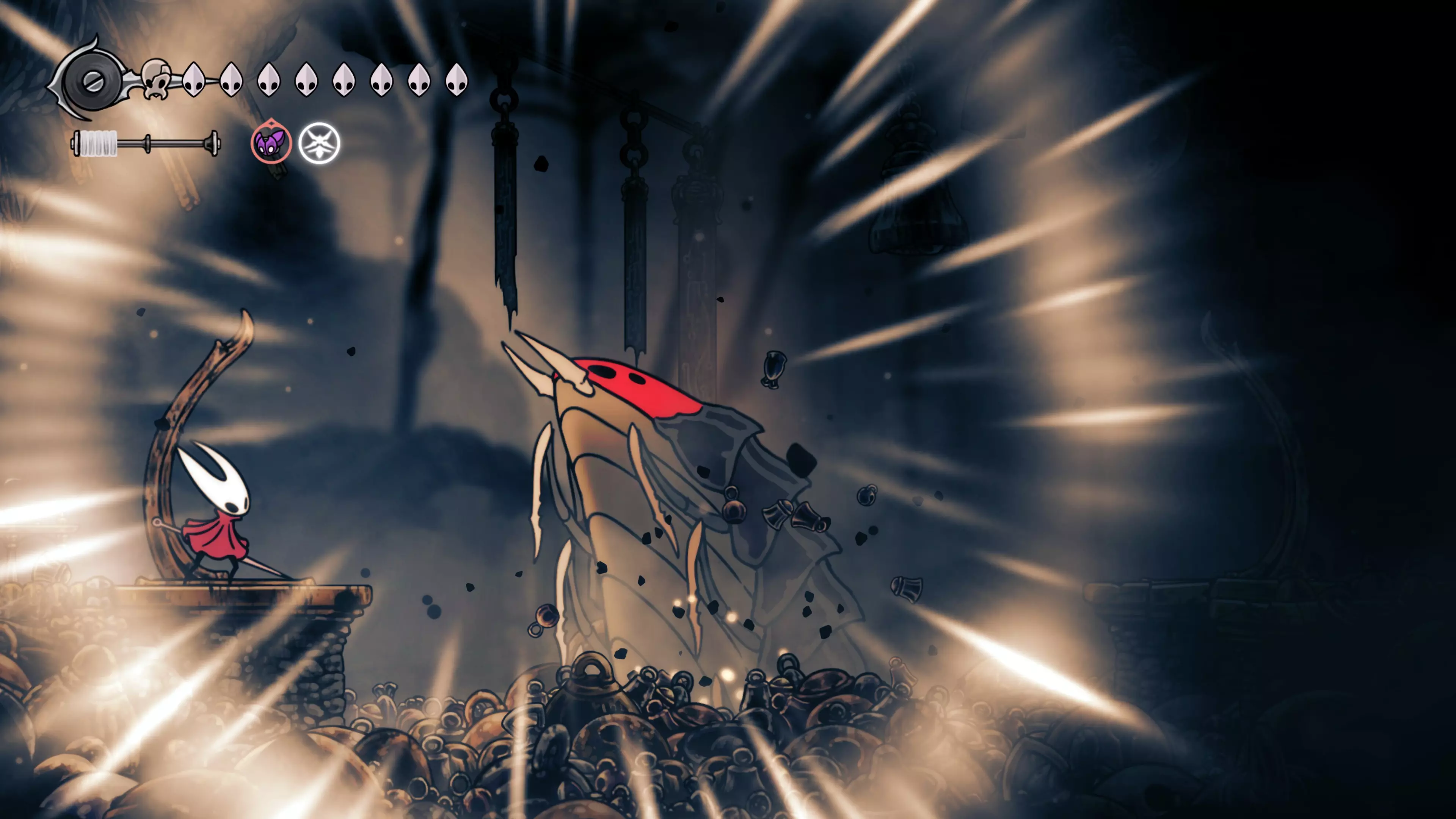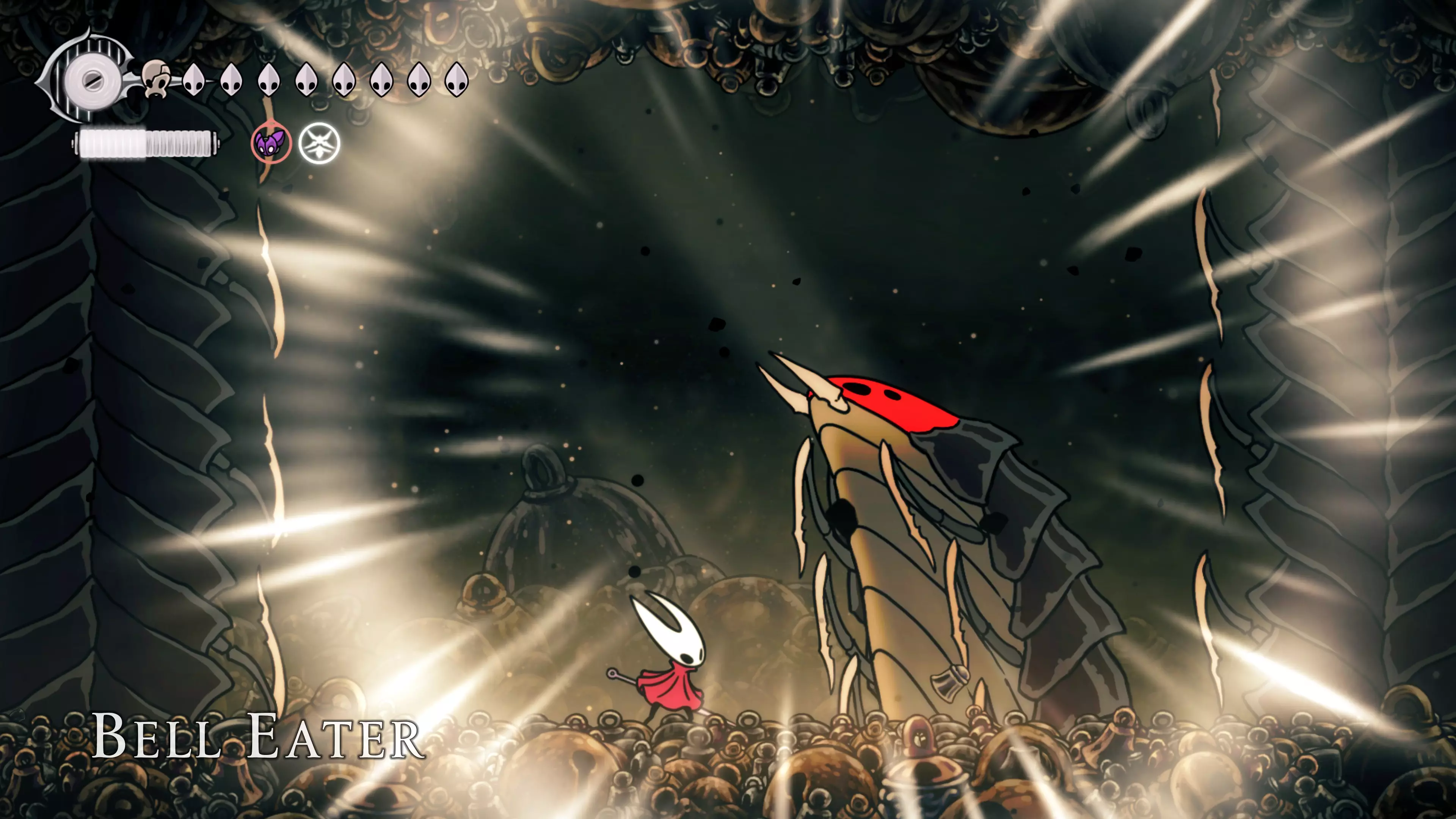注意:不要承受过多的接触伤害。我自己就差点丧命,因为忘记游戏会自动卸下破损面具。 战斗结束后,黄蜂会倒下,我们会在歌谣角落醒来。现在该去拜访我们在破败礼拜堂的老熟人了。 100%虚空 下到圣巢的回响之路时,你会遇到钟之吞噬者。这场战斗可能会很困难,如果你更注重攻击而不是躲避的话。这里的一切都取决于耐心——专注于敌人的背部(它总是按照同一个固定模式行动),这样就能顺利过关了。