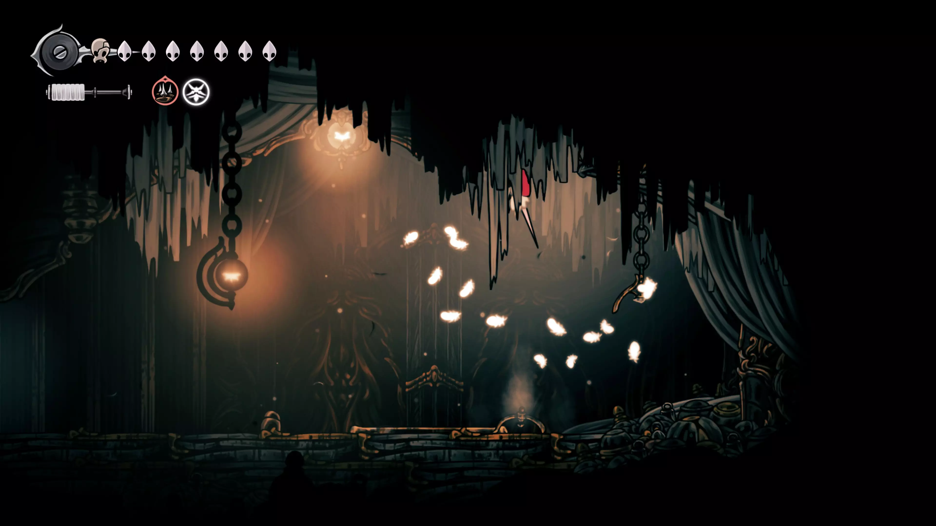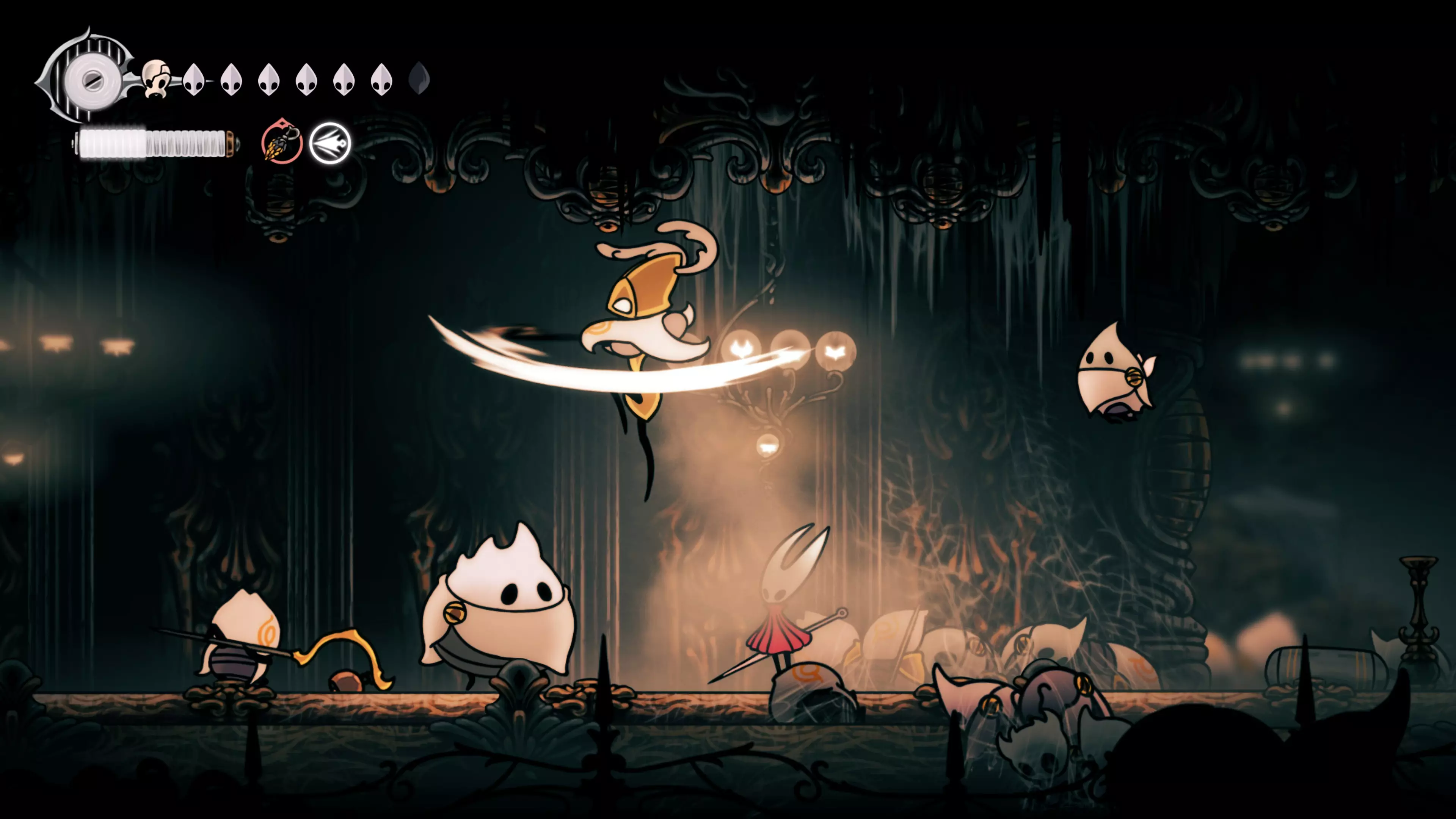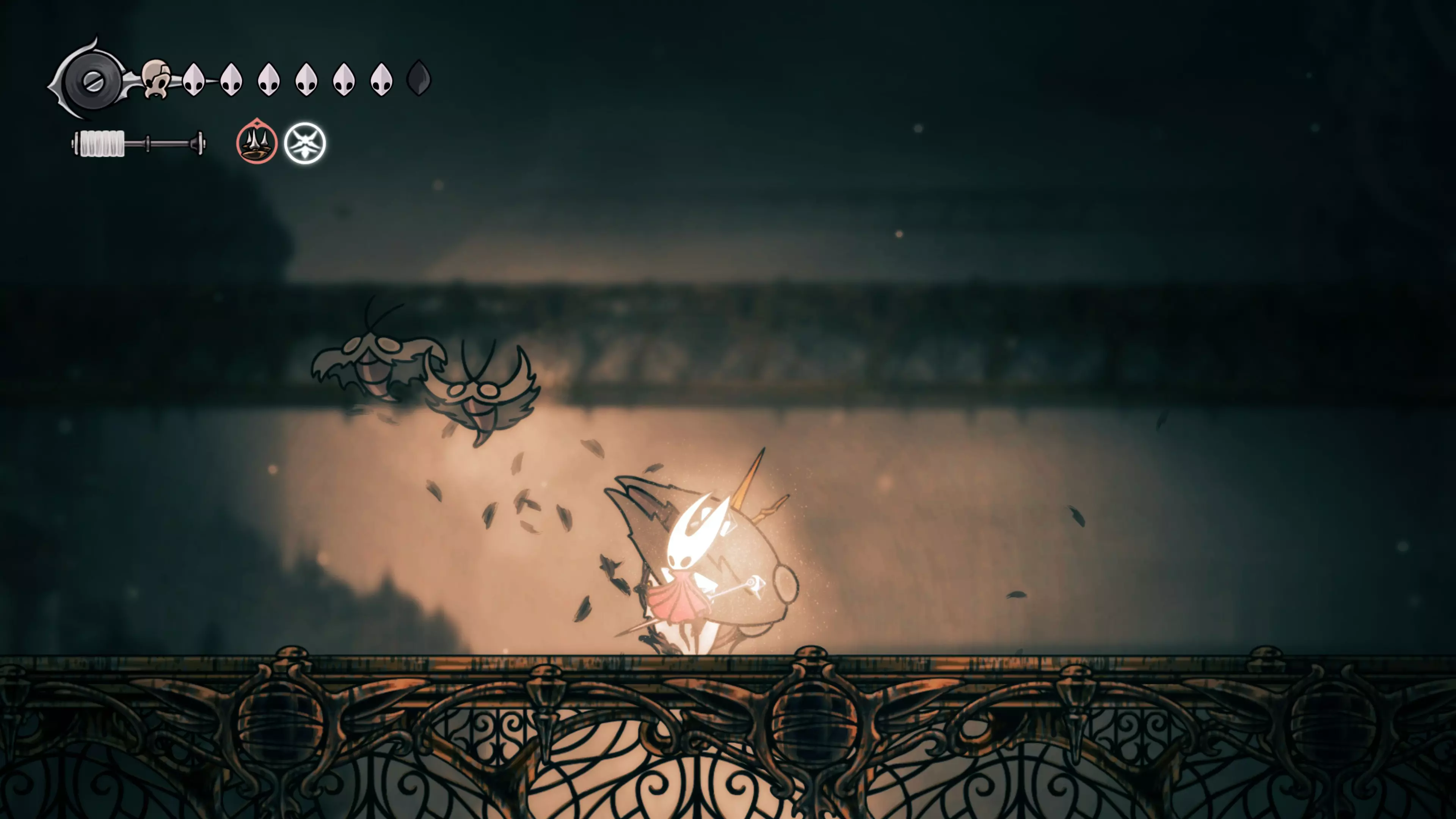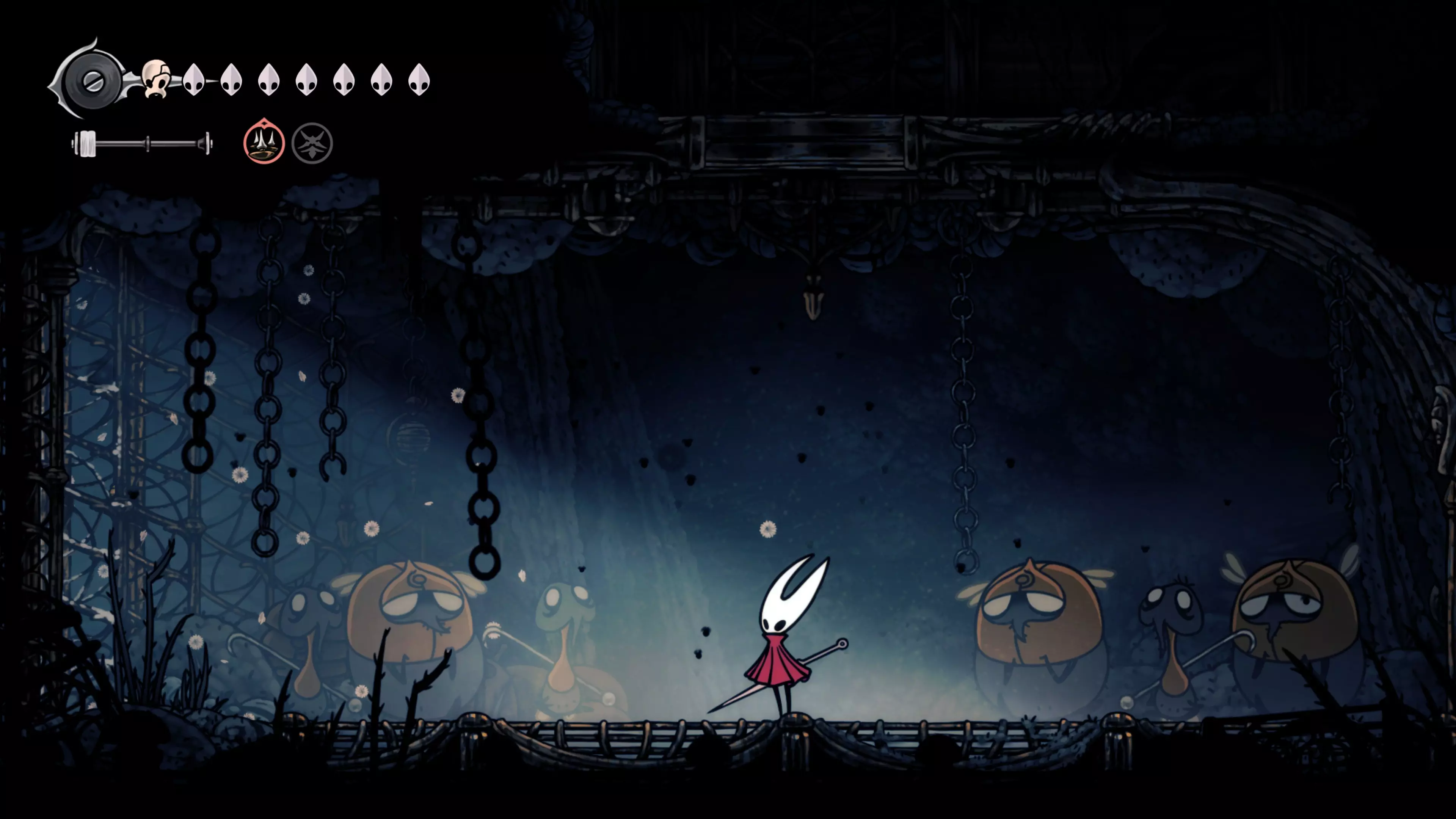 注意:不要承受过多的接触伤害。我自己就差点丧命,因为忘记游戏会自动卸下破损面具。 战斗结束后,黄蜂会倒下,我们会在歌谣角落醒来。现在该去拜访我们在破败礼拜堂的老熟人了。 100%虚空 下到圣巢的回响之路时,你会遇到钟之吞噬者。这场战斗可能会很困难,如果你更注重攻击而不是躲避的话。这里的一切都取决于耐心——专注于敌人的背部(它总是按照同一个固定模式行动),这样就能顺利过关了。