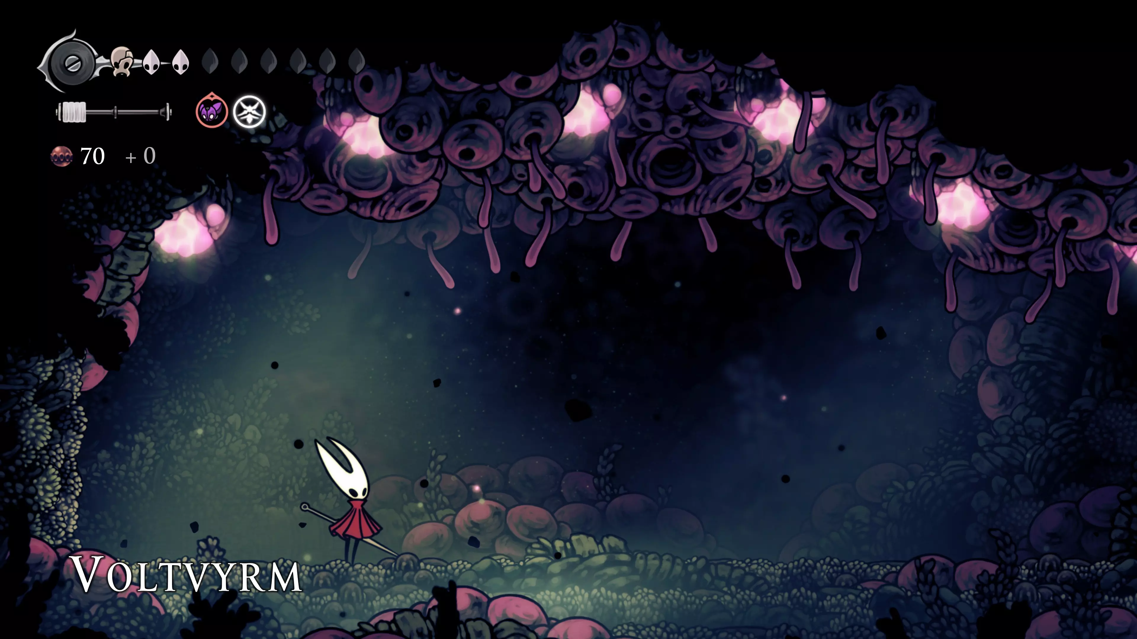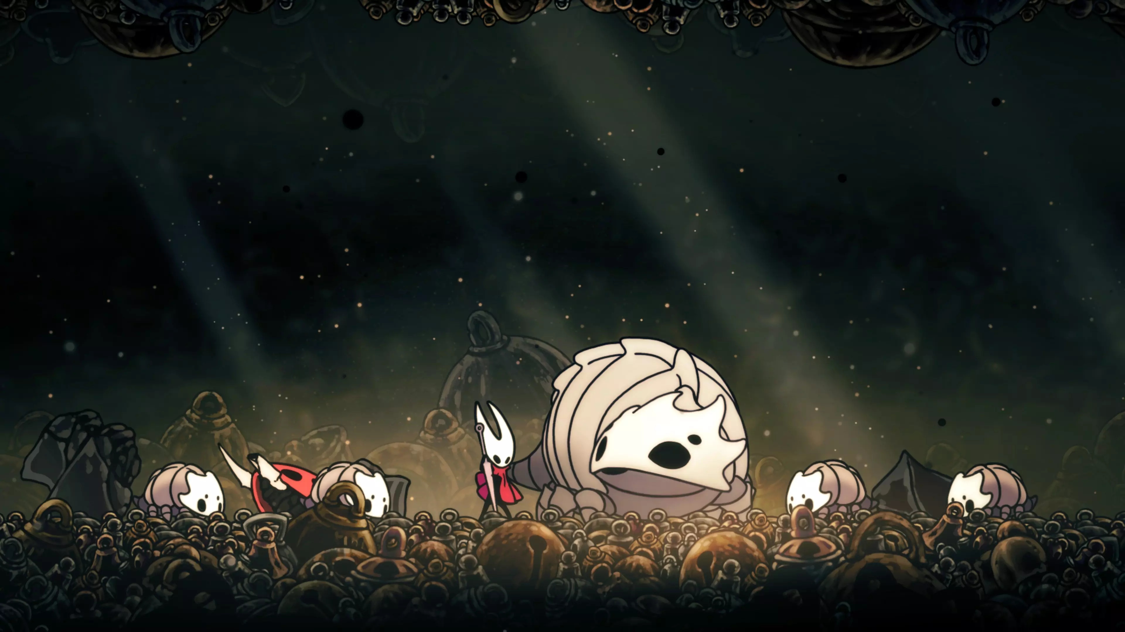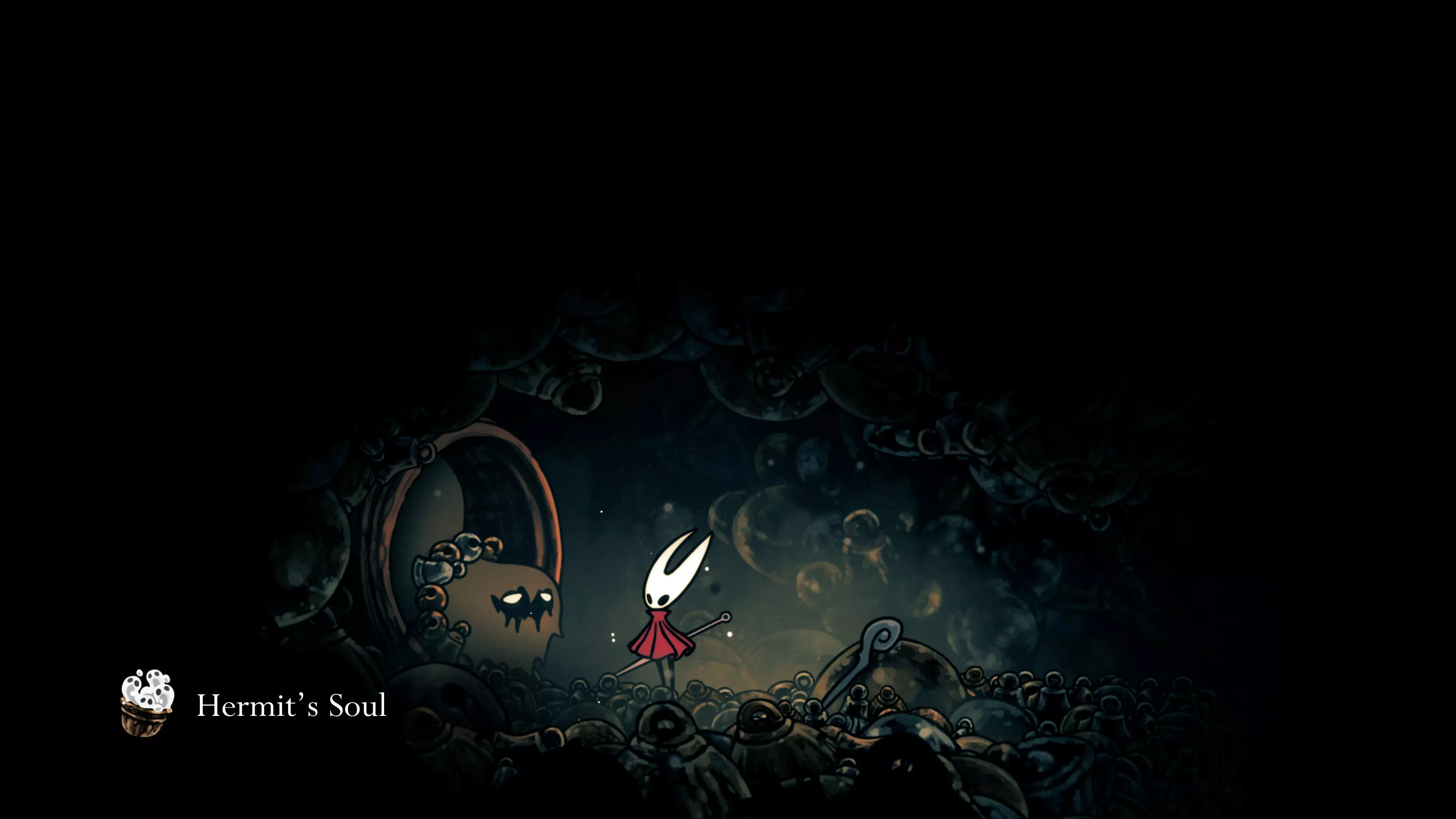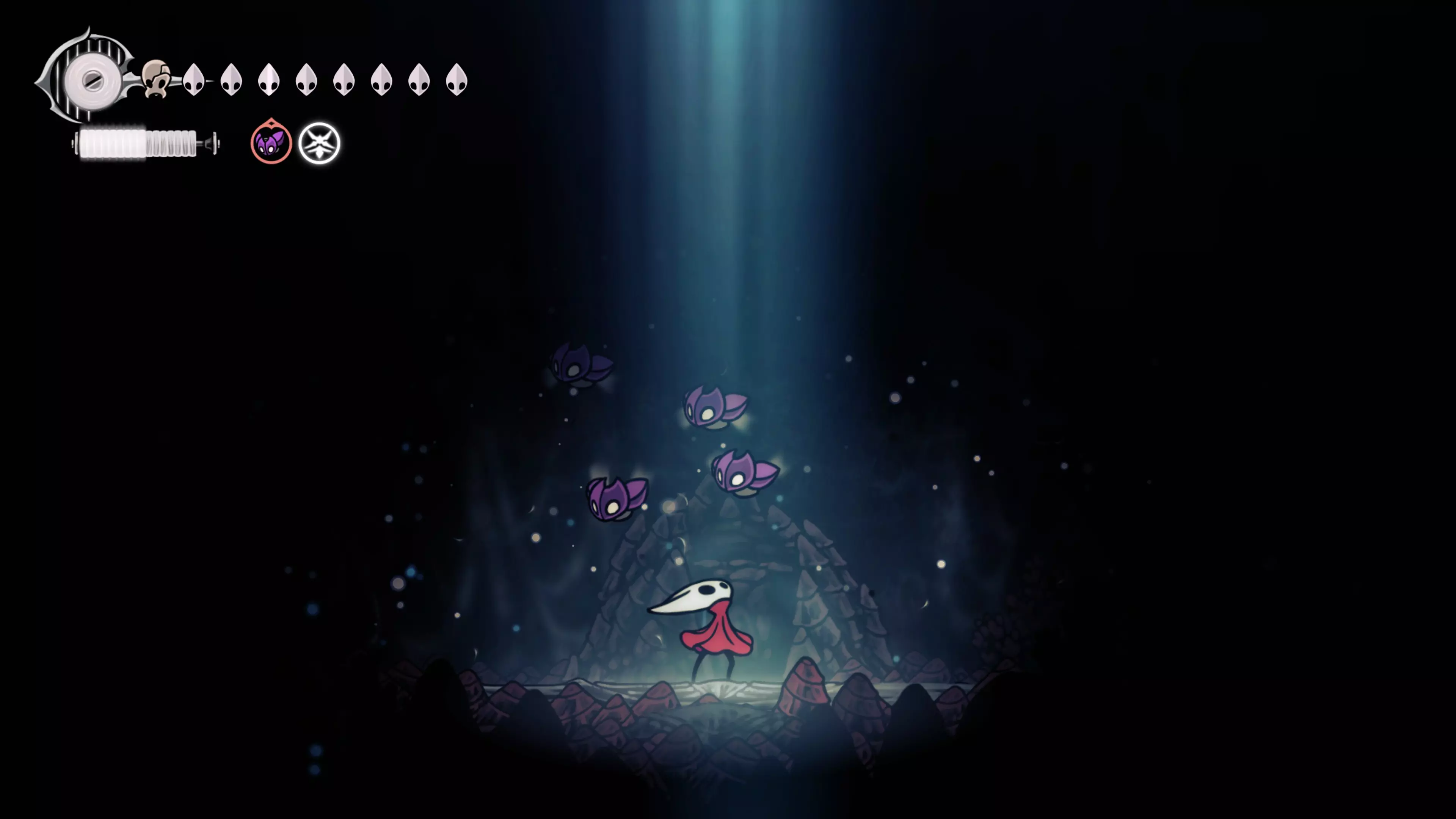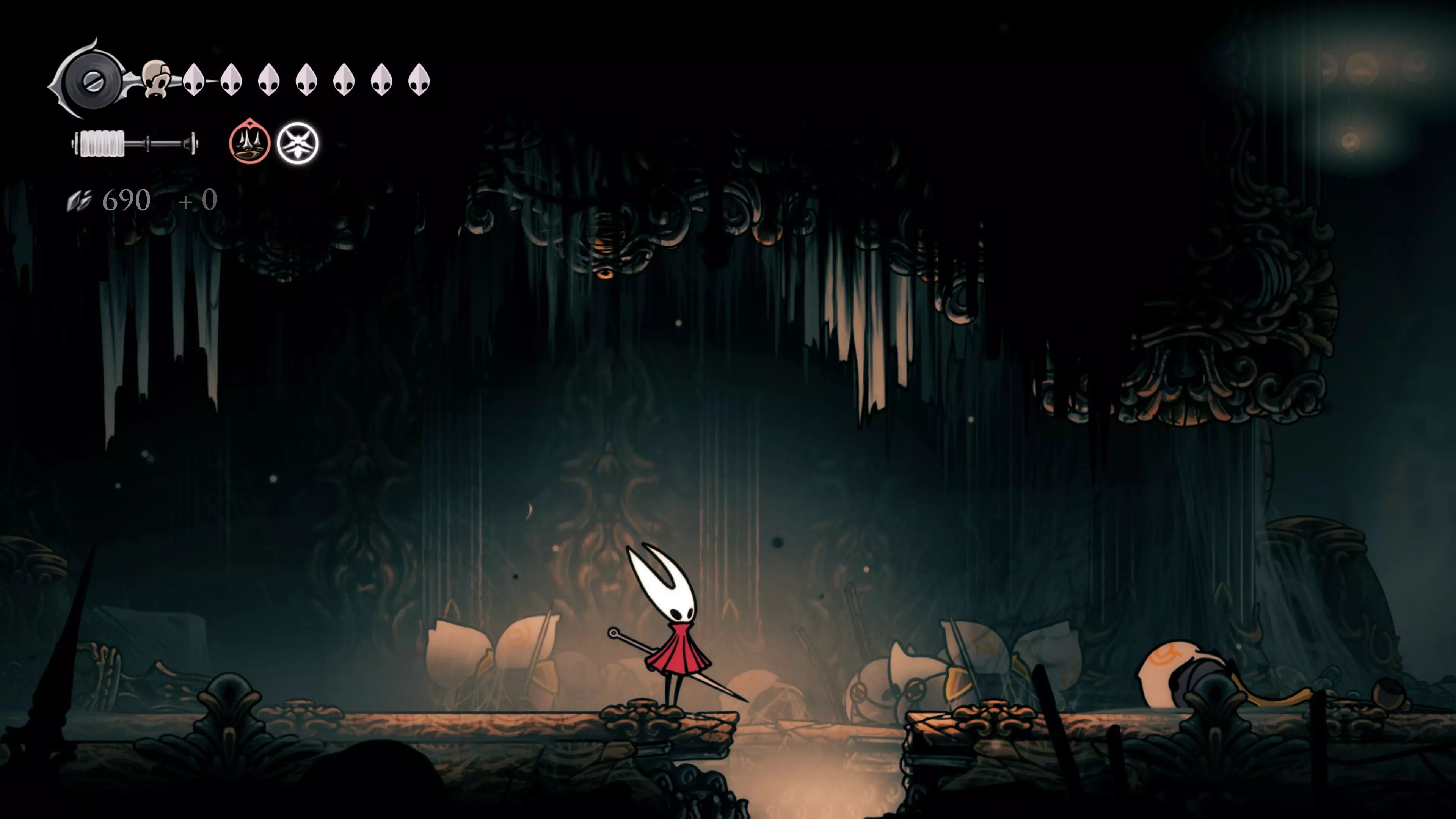 注意:不要承受过多的接触伤害。我自己就差点丧命,因为忘记游戏会自动卸下破损面具。 战斗结束后,黄蜂会倒下,我们会在歌谣角落醒来。现在该去拜访我们在破败礼拜堂的老熟人了。 100%虚空 下到圣巢的回响之路时,你会遇到钟之吞噬者。这场战斗可能会很困难,如果你更注重攻击而不是躲避的话。这里的一切都取决于耐心——专注于敌人的背部(它总是按照同一个固定模式行动),这样就能顺利过关了。