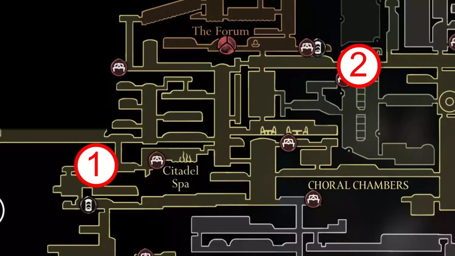 言归正传: 失踪的附庸 我们在“磨砺之阶”关卡中遇到了子,她在地图上标记了几个需要前往的地点。她选择的地点是从可能的地点池中随机挑选的(可能超过六个,但以下是我已知的):