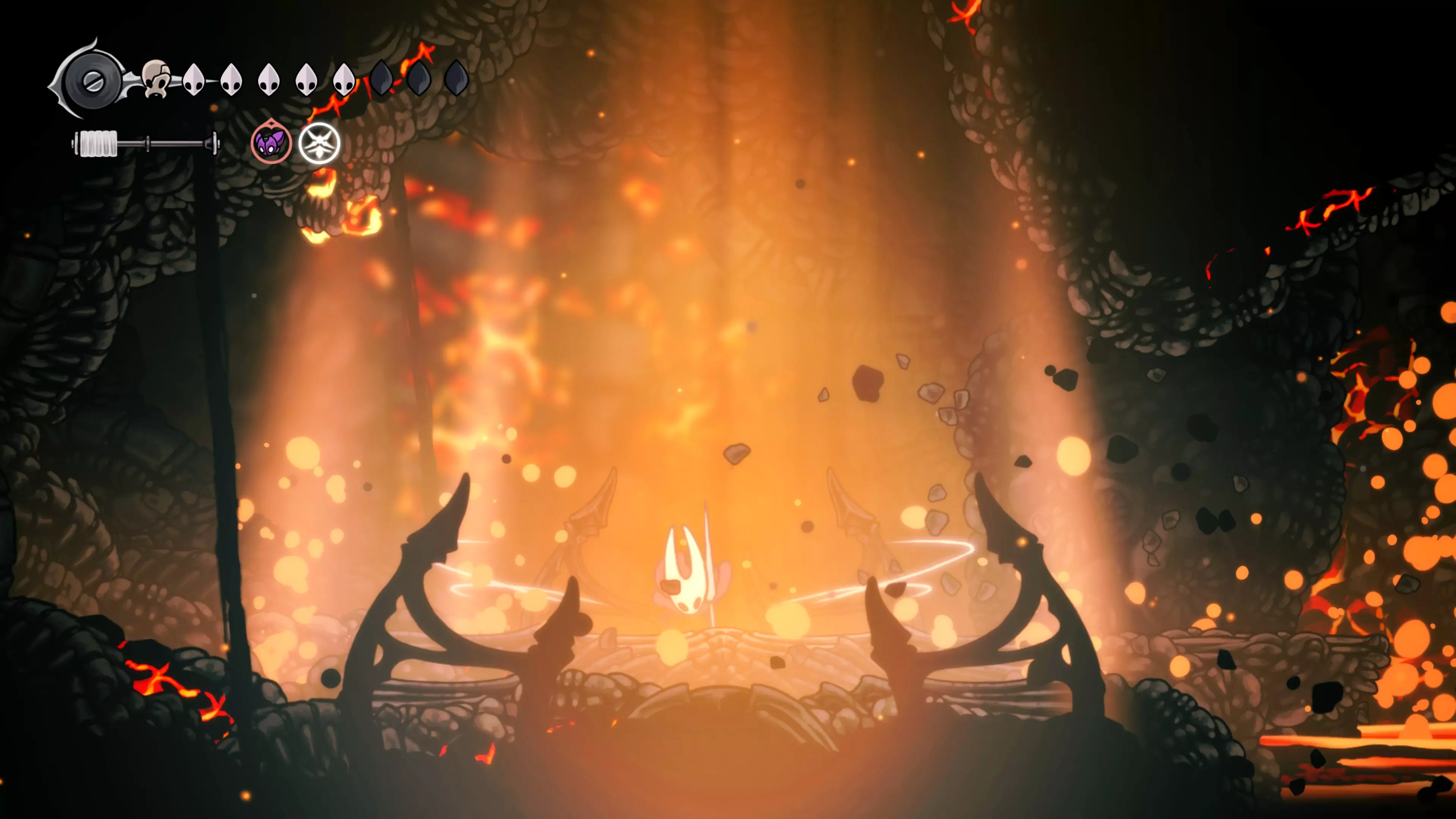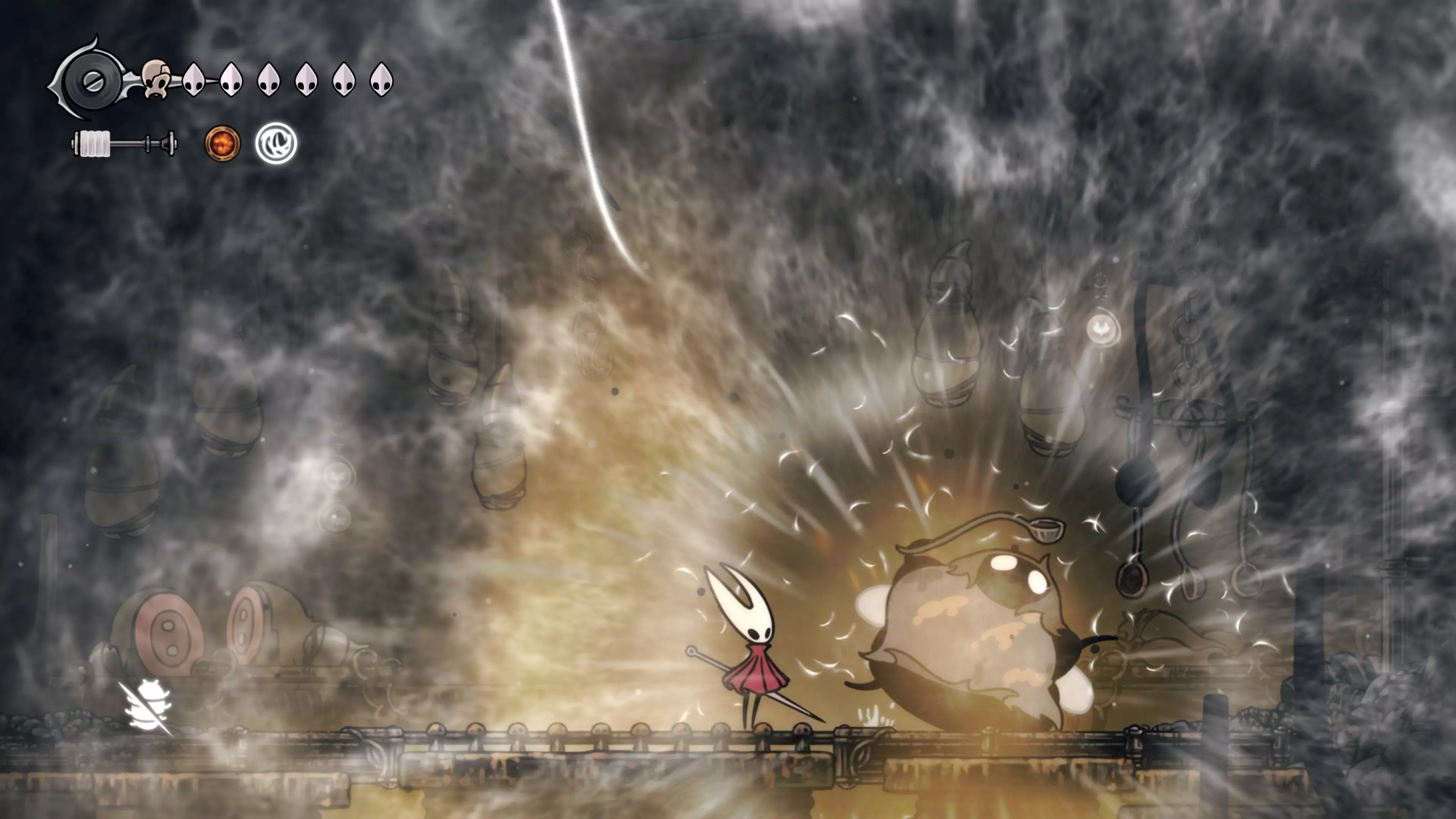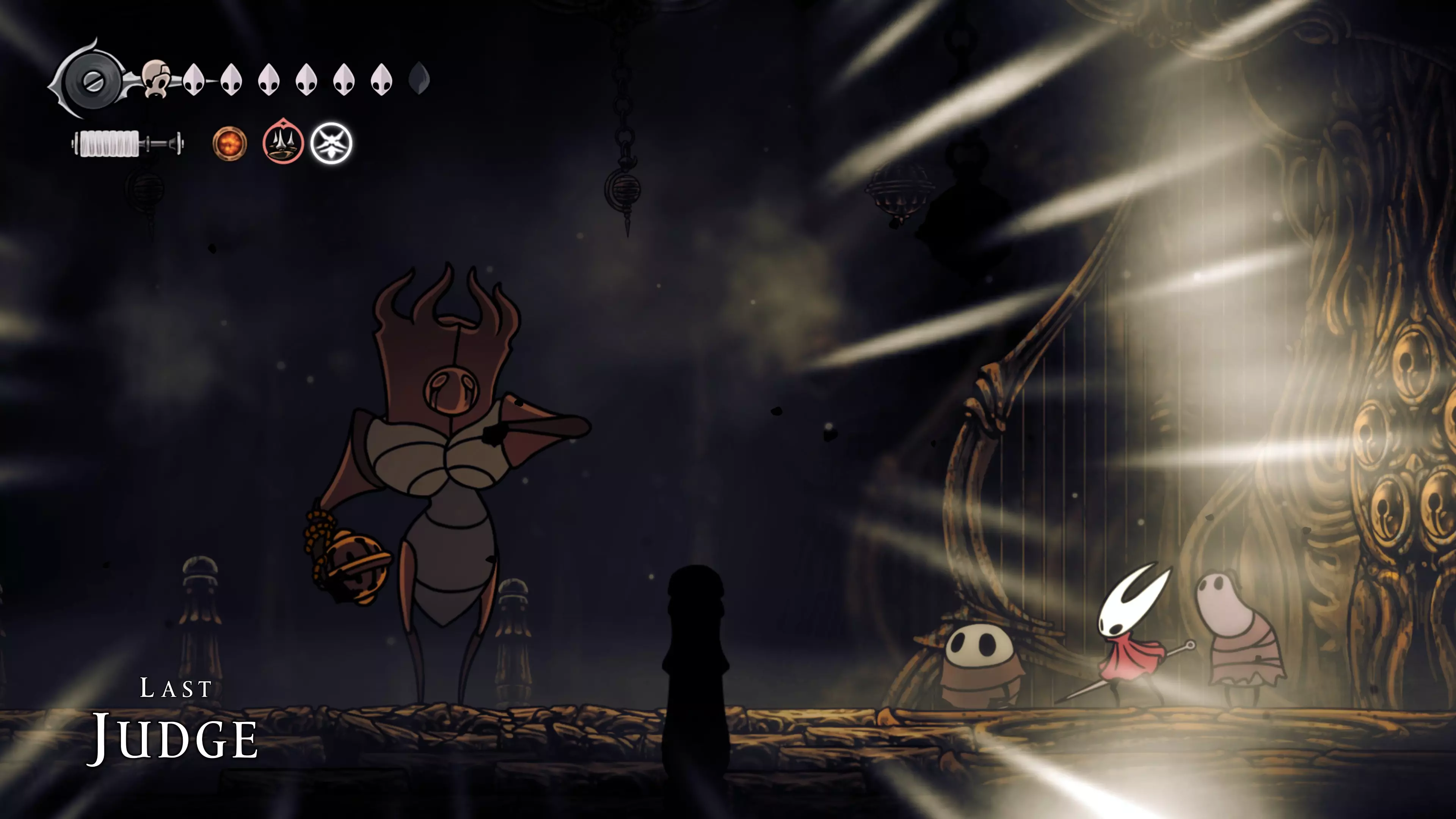 完成这一步后,只需向左走,就能遇到该区域的 Boss。在 Boss 之前,你需要通过一个有敌人的竞技场(跳跃向下攻击可以帮助对付他们)。如果情况实在太糟,可以返回菜单并重新加载存档以确保安全。