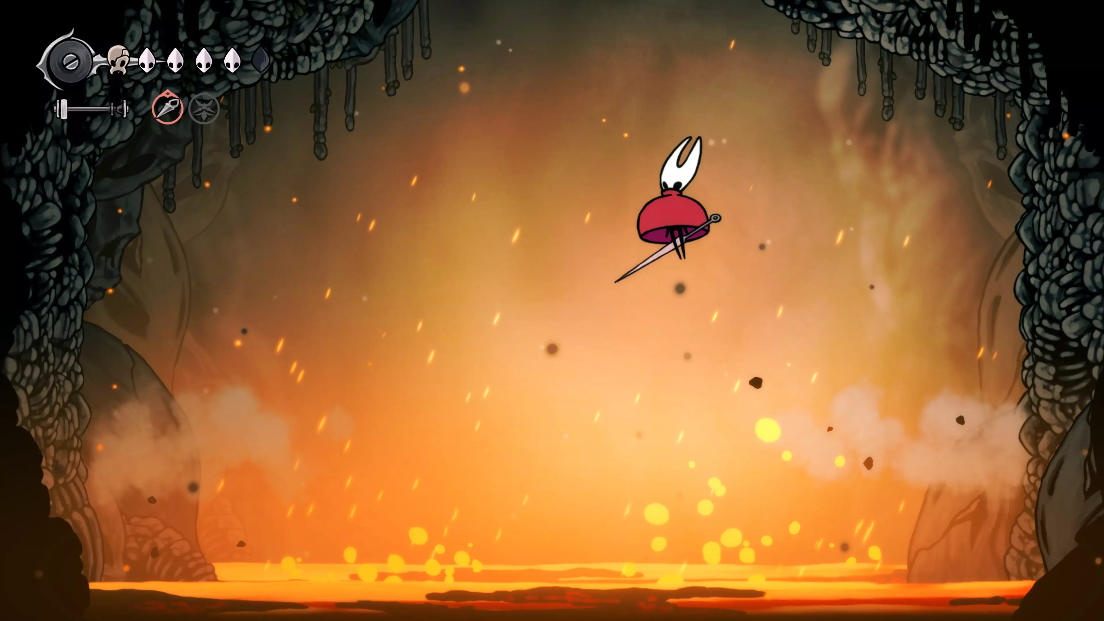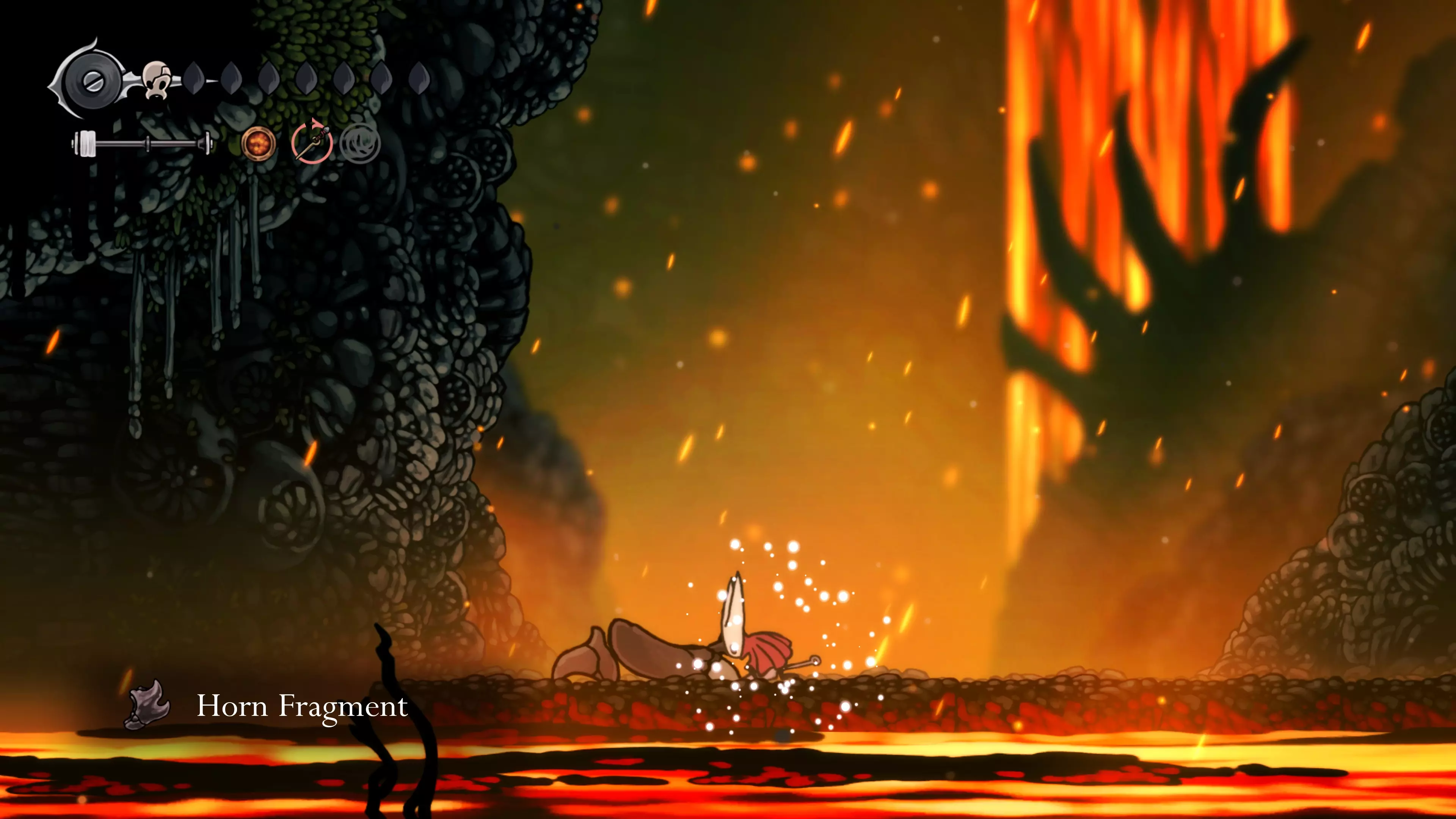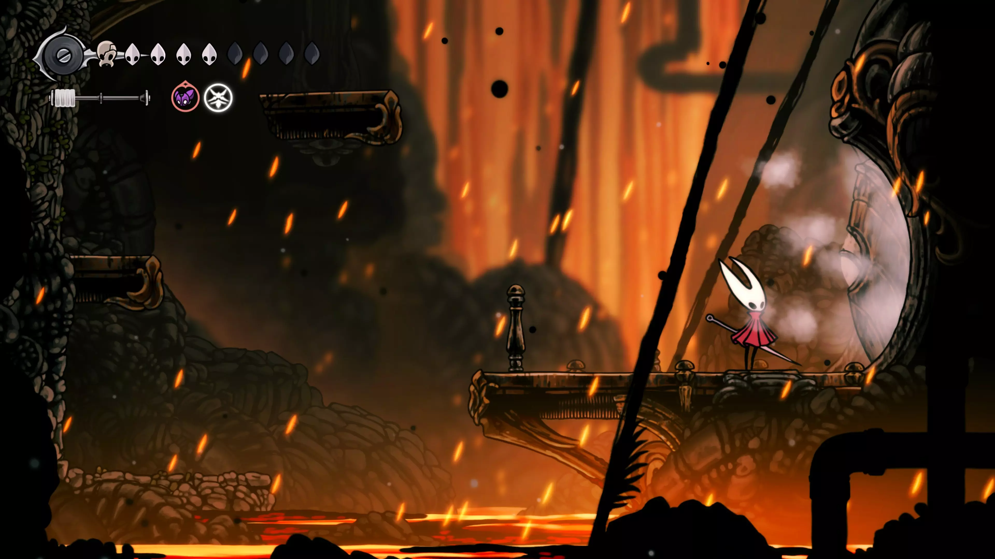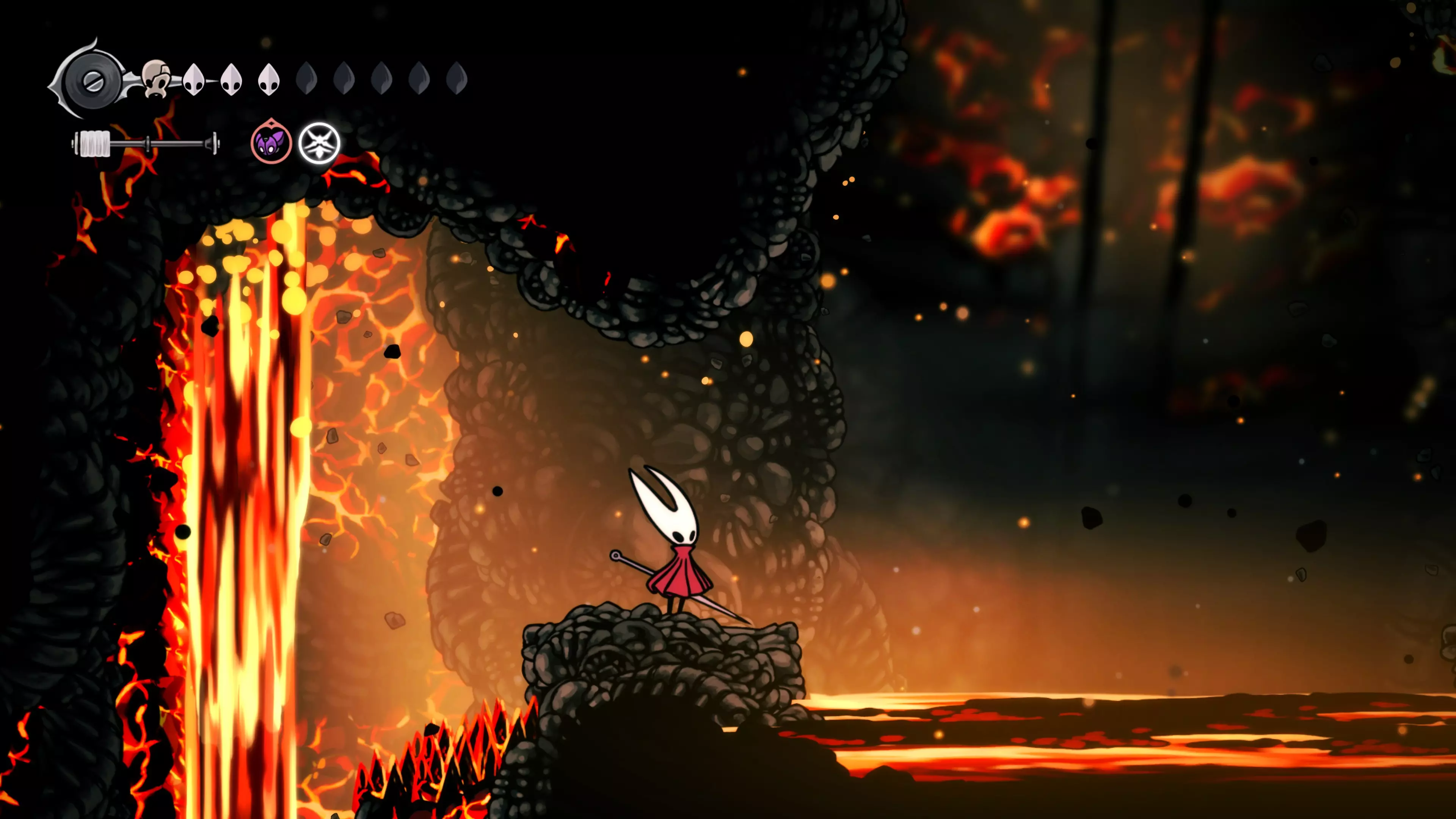 向右和向下前进,你将进入一个简单的平台跳跃区域。不要忘记装备【熔岩铃铛】。在区域尽头一定要开启捷径,它之后会派上用场。