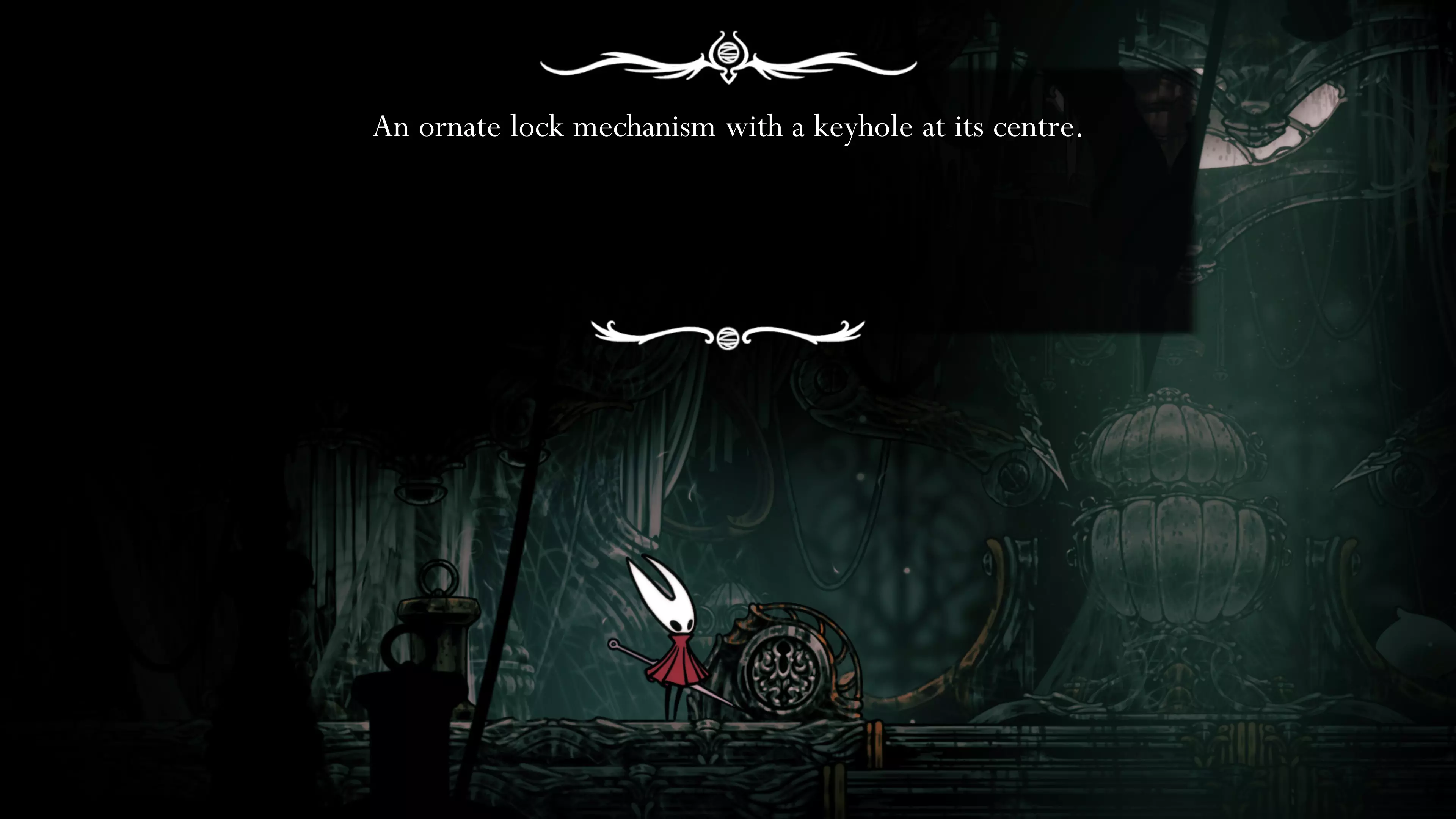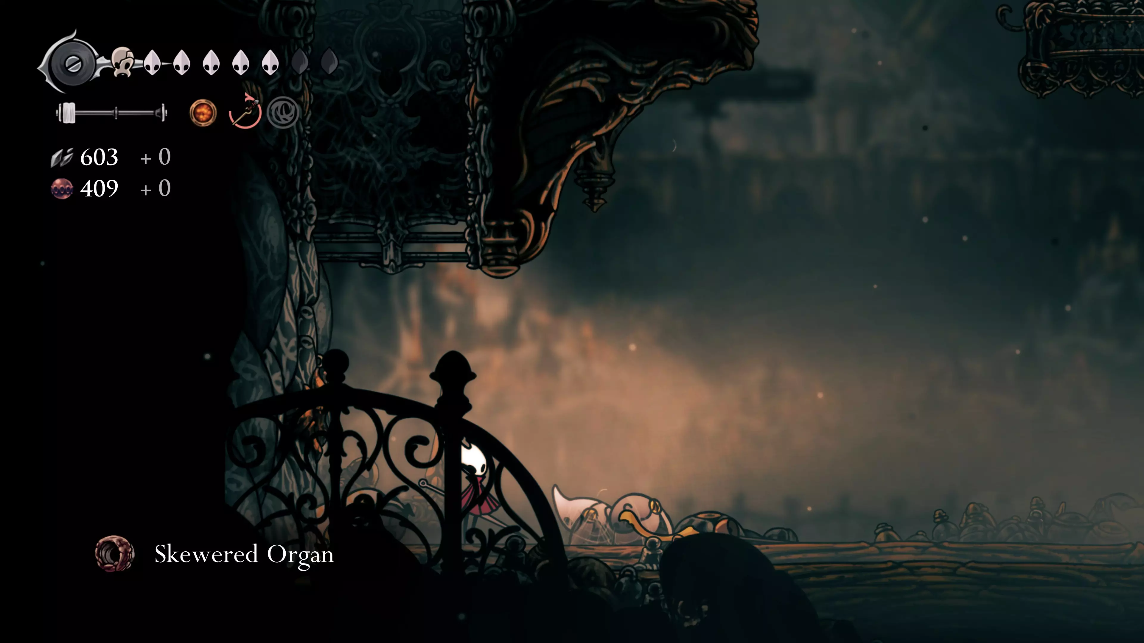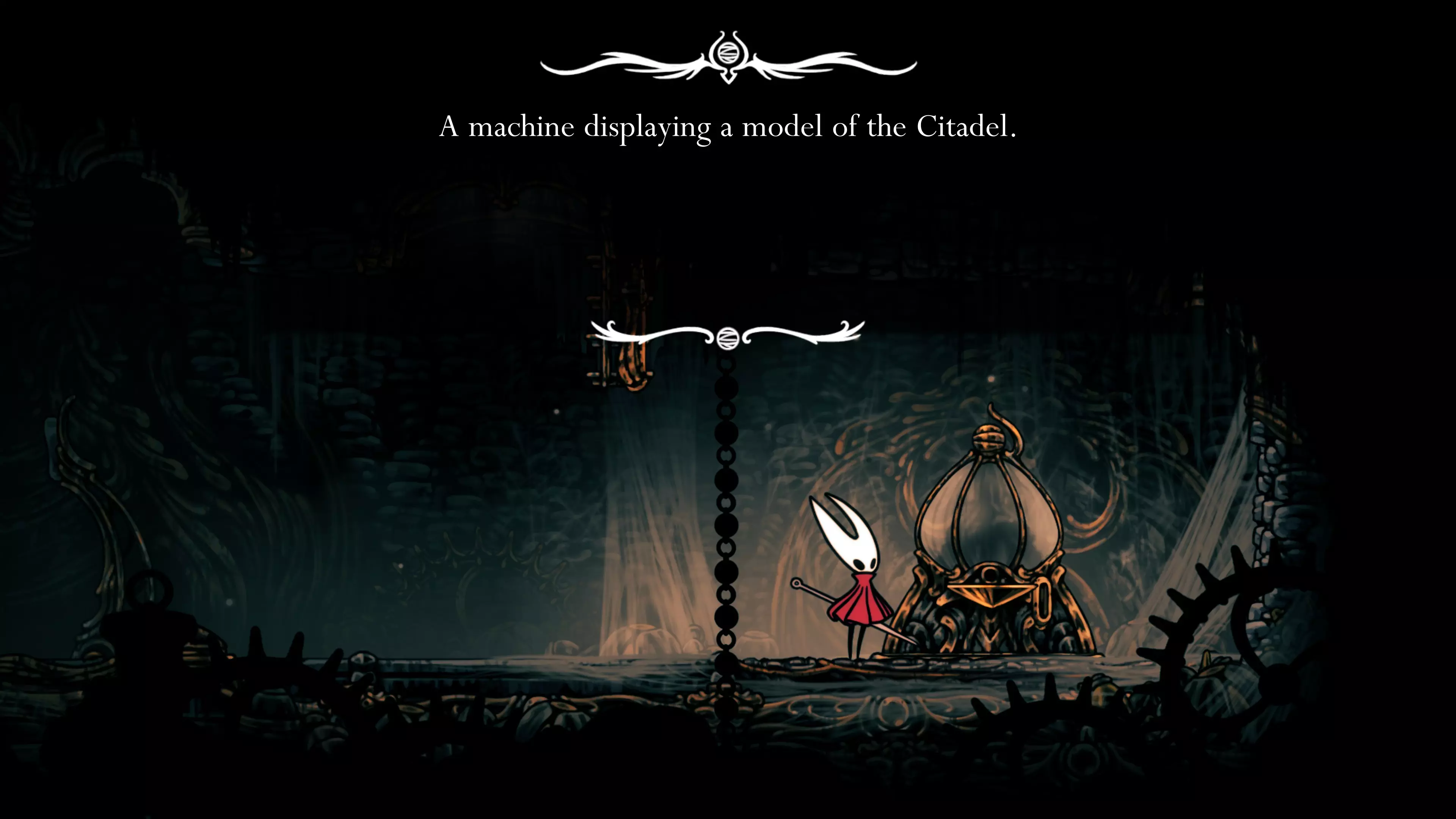 在区域内前进,解锁左侧的近路并离开该区域。返回钟楼巨兽处,传送到鸣响镇,再次强化钉子。之后回到城堡,与特罗比奥战斗。这场战斗相当简单。如果使用异乡印记,旋风攻击会变得几乎无害——只需跳跃并从上方攻击特罗比奥即可。此外,在与幻影战斗后,你现在拥有了格挡技能,这能让你更轻松地躲避大多数双重攻击。获胜后,使用电梯并向左前往下一个区域。