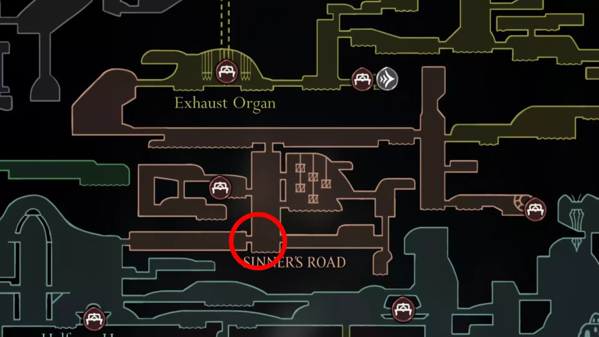 通过右上角的出口,你会进入罪人之路。继续向右走,直到第二个区域。在这里,你可以利用敌人进行二段跳,提前到达区域的上部;不过如果你愿意,也可以选择走长路再回到这里。打开捷径,然后前往有长椅的区域。