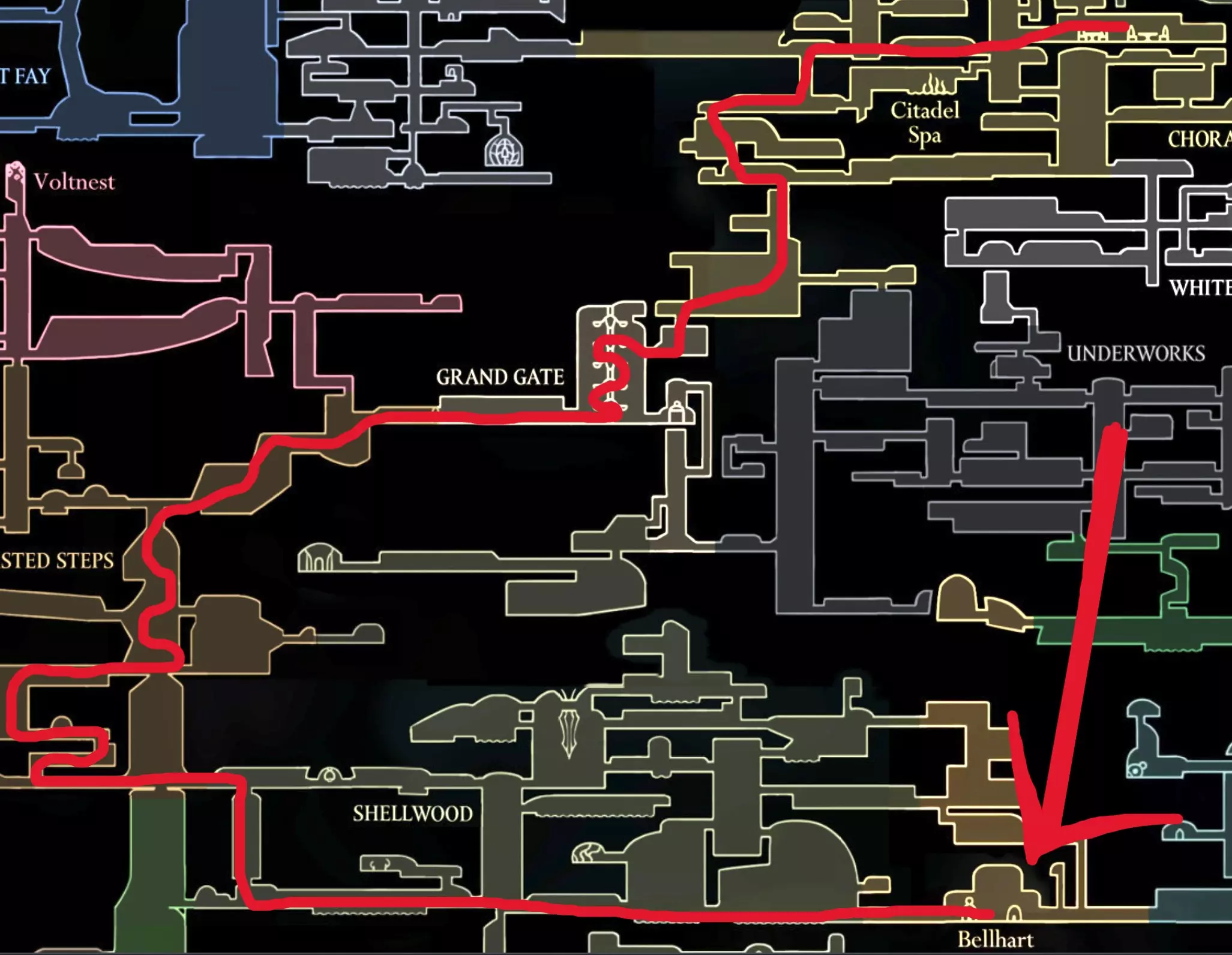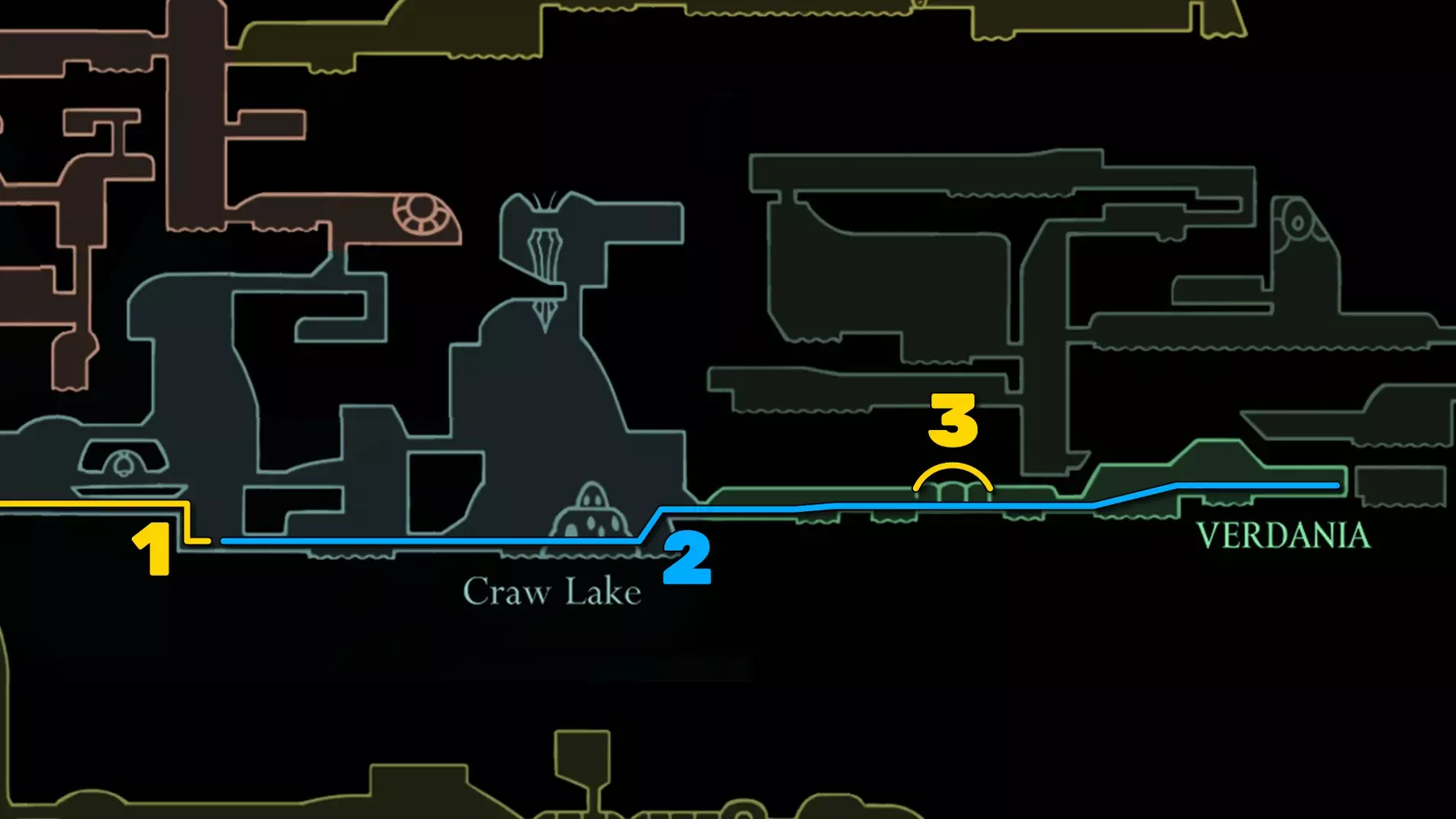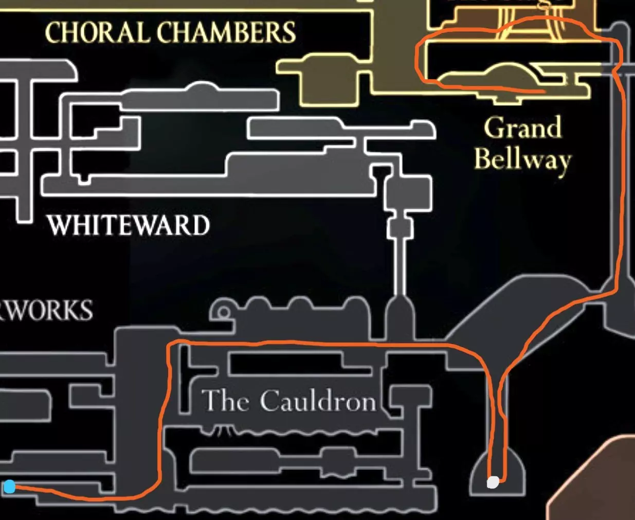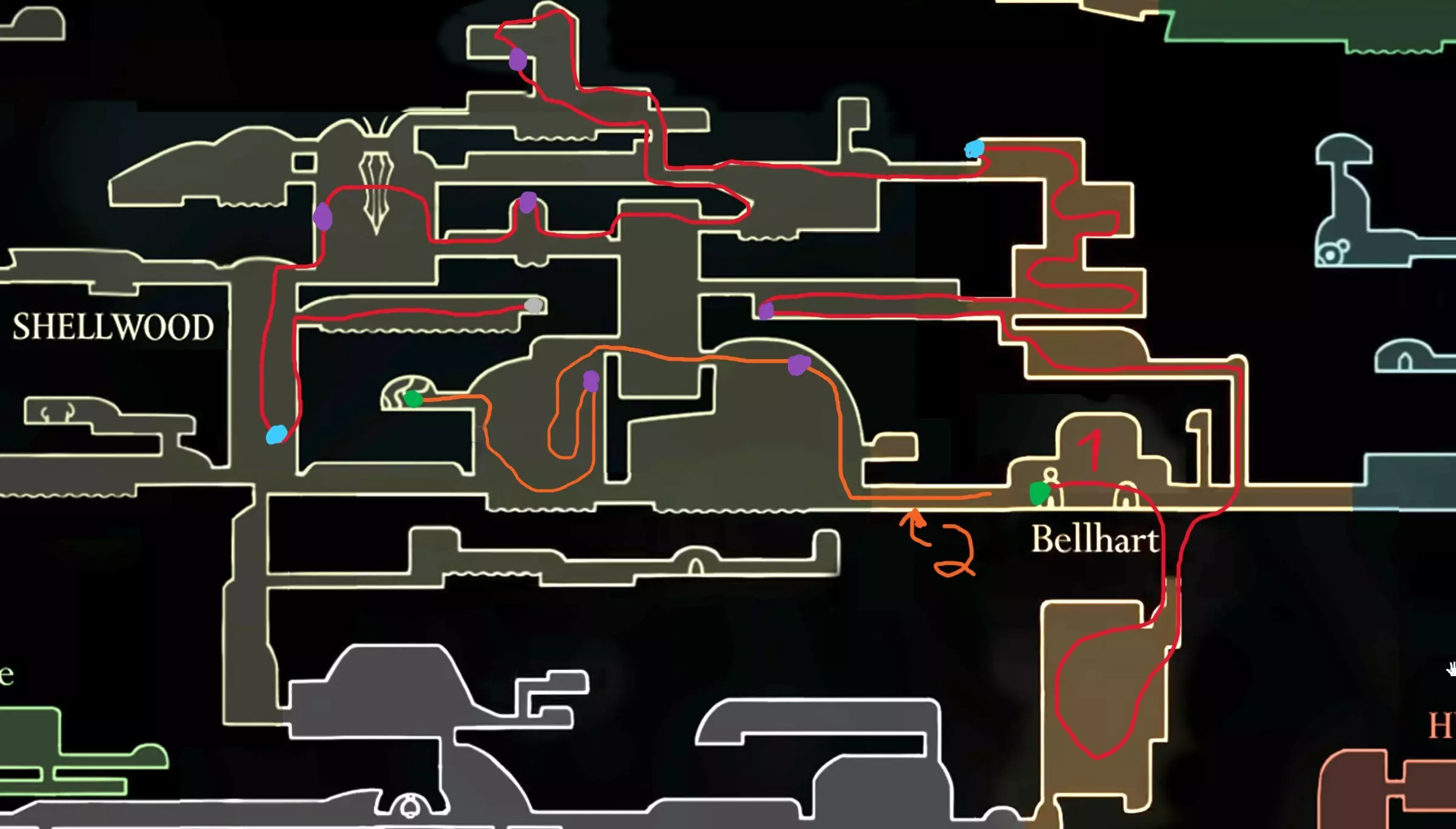 100%胆汁水道 装备上你最喜欢的build,带上我们必不可少的物品【纯净王冠】,因为我们要前往胆汁水道了!从左下角开始,按照以下路线前进: