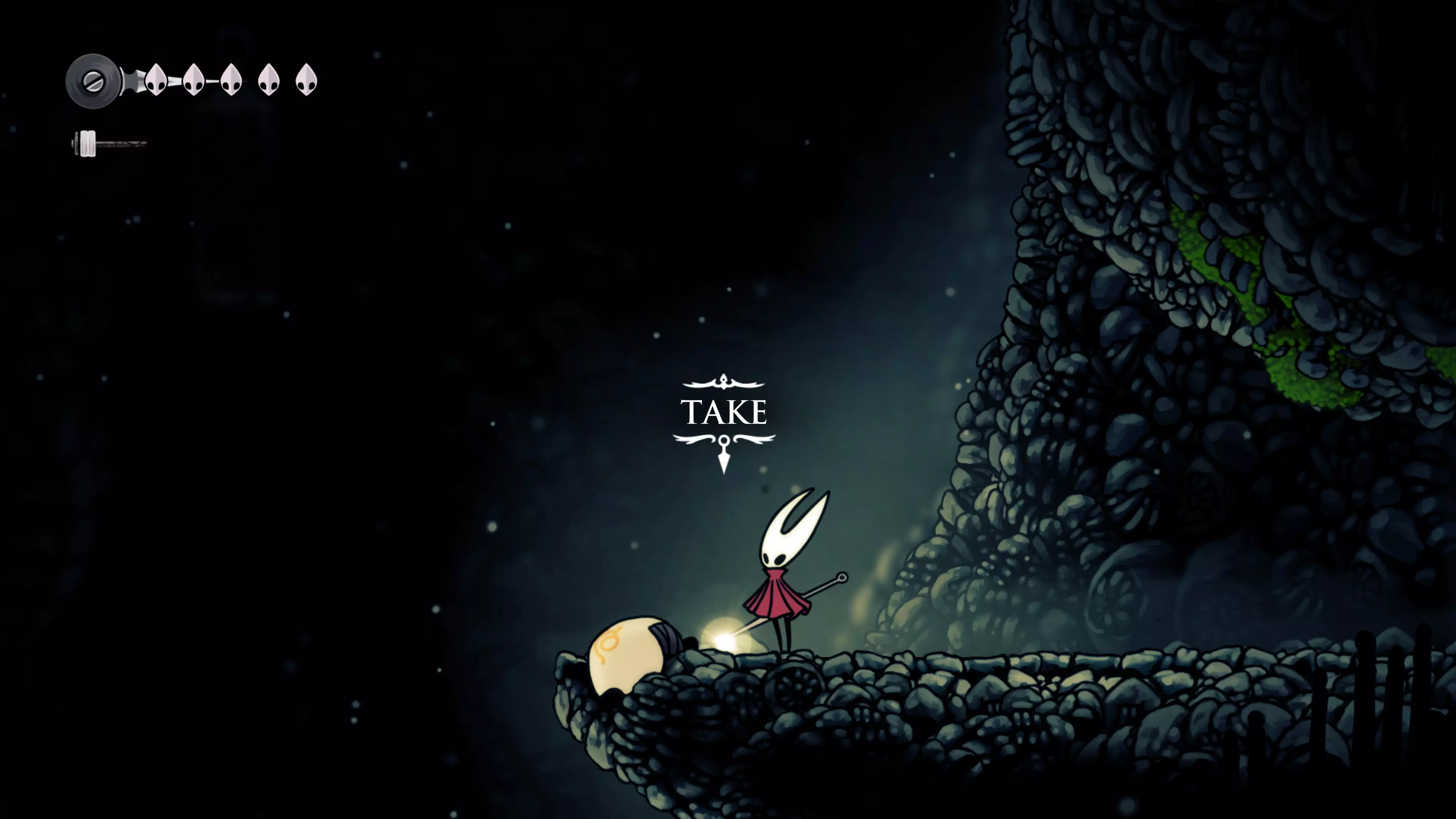 获得强化后,可以从山的左侧滑下去。在最左边的石阶旁,你能捡到另一块面具碎片。