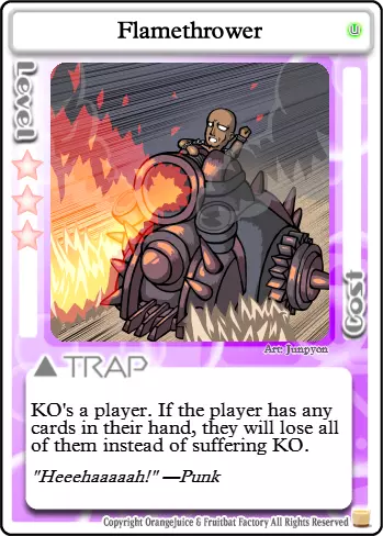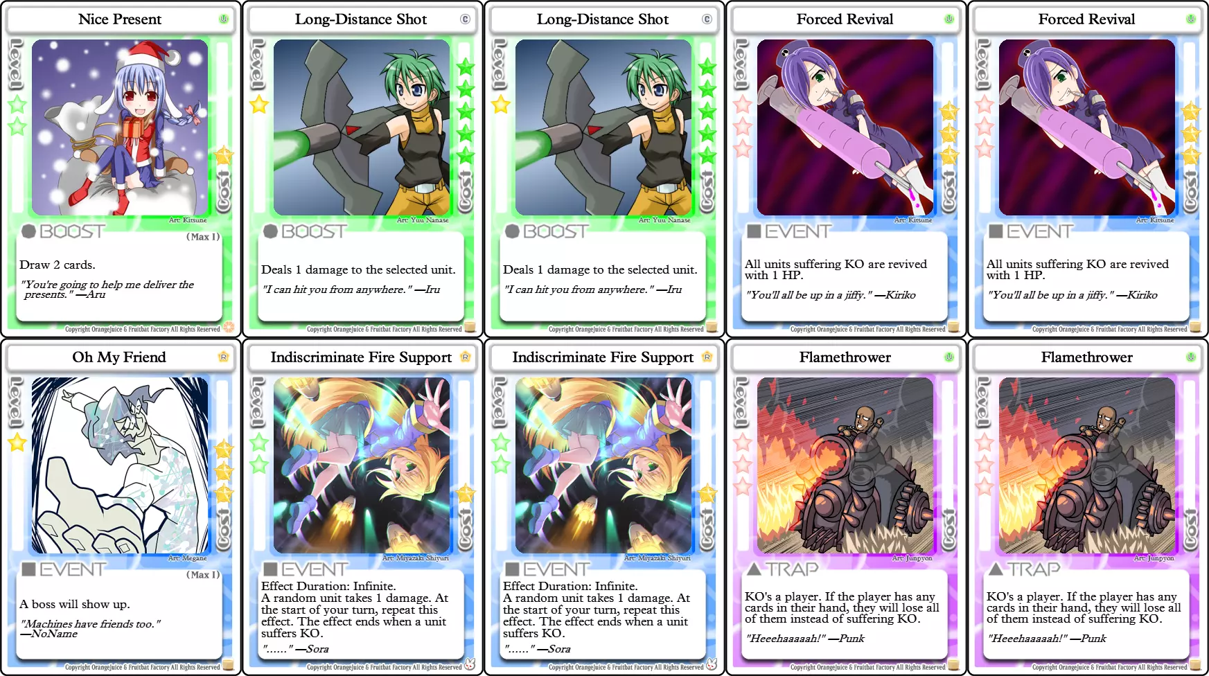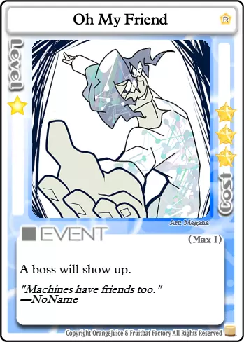 1张【Nice Present】 2张【Long-Distance Shot】 2张【Forced Revival】 2张【Indiscriminate Fire Support】 1张【Oh My Friend】 2张【Flamethrower】 这套卡组使用【Forced Revival】在对手复活后立即将其击败。【Oh My Friend】用于召唤 Boss,该 Boss 非常擅长击败玩家。【Flamethrower】主要用于手牌控制,但也有机会击败对手,并在复活时窃取其星星。 极限脱出