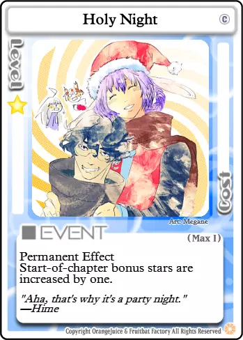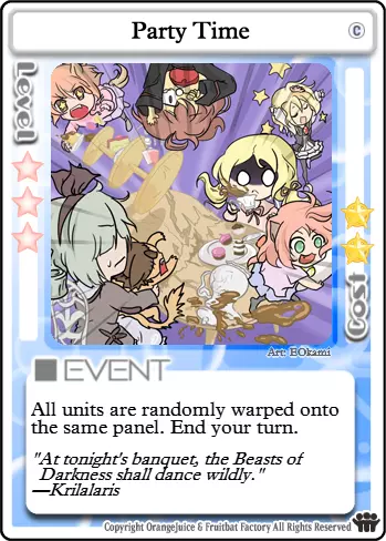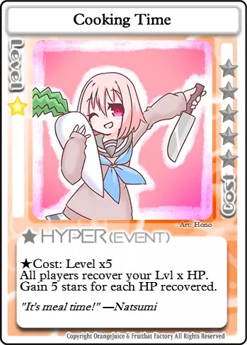 烹饪时间 类型:事件 等级要求:1 消耗:等级×5星 所有玩家恢复你的等级×生命值。每恢复1点生命值获得5星。 烹饪时间的功能与晚餐类似,但消耗和治疗量会随你的等级提升而增加,并且还会给予使用者5星×总治疗生命值的奖励。此卡牌恢复的生命值以及由此产生的星星数量会随你的等级提升而增加。烹饪时间还会触发夏美的被动技能,使她每有一个恢复了至少1点生命值的对手,就能额外获得5星。使用烹饪时间的最佳时机是所有玩家生命值都较低的时候,但在其他情况下,即使收益较低也可能值得使用。例如,治疗一名即将被其他角色击败的玩家,是阻止对手获得星星和胜利的有效方法,因此有时为了达到这个目的,即使获得较少的星星,使用【烹饪时间】也是值得的。另一种情况是当你的生命值较低,但其他玩家至少也损失了一些生命值时。 游戏阶段 第一阶段:夏海必须在进攻和极度被动的玩法之间取得平衡,以充分利用她的被动技能。攻击玩家的唯一目的是对他们造成少量伤害,然后治疗他们以获得星星。【烹饪时间】在游戏的这个阶段是收集星星的极其强大的工具。如果所有玩家都至少受到1点伤害,考虑到其消耗,【烹饪时间】能提供高达30颗星星。第二阶段:此时要更加小心,因为许多拥有战斗卡超必杀技的角色现在已经能够使用它们了。尽量与这些角色保持友好关系,同时小心地试探他们。 第三阶段:在这个阶段,【烹饪时间】和【晚餐】的价值大致相当。【晚餐】消耗的星星更少,但【烹饪时间】有更大的回报潜力。如果你同时拥有这两个,最好在星星消耗变得过高之前使用【烹饪时间】。哦?大家都已经完全恢复了?真好奇这是怎么发生的。 【碎星者】?她现在在烤饼干而不是攻击别人了?那太棒了!也许我们可以成为朋友!我可以教她如何好好保养她的厨具!不过,现在获取星星可能会有点困难了…… 我好几天没赢过游戏了。自从【碎星者】不再攻击后,需要治疗的人就少多了。我是说,星厨开始变得友善了。游戏结束前,我好不容易才攒够星星通过第三关。不过至少现在大家看起来都开心多了。嘿…… 梅好像总不在附近。她和其他人总是围着星厨转。梅真的很喜欢她做的饼干,对吧?我希望她能多陪我玩一会儿。我得提醒她,我的料理才是这里最棒的食物。反正吃那么多糖肯定没好处。有两个厨师在,她总是吃得饱饱的。我得更努力地玩,帮她消耗一下,让她有胃口。 我不是故意的。 这不对。一切都不对。 梅的动作不像平时那么快了,可能是因为她吃了太多饼干。我们以前总是一起玩,从来没发生过不好的事。她通常很擅长躲避我的攻击,就算没有红蓝 buff 也是。但这次…… 怪胎。 疯子。 叛逆的猪猡。 所有人都说我那样伤害我最好的朋友,简直是个怪物。雾子笑着说她没想到我会这么做,但她也很糟糕。我很糟糕。没人想再一起玩了。甚至没人想再跟我说话了。我知道他们还在议论我。我不能相信他们。现在我孤身一人了。对不起,小美。请你没事。 她走了。 好痛。 痛得厉害。 这就是她现在的感受吗? 这种痛苦? 是你。 是你干的。 是你的饼干造成的。 是你的错。 全都是你的错。 现在她受伤了,都是你的错。 我永远不会原谅你。 永远不会。 这种感觉? 我要你明白。 我现在的感受。 小美现在的感受。我需要所有人都明白。 哈 哈哈 哈哈哈哈哈哈 舒服~♪~♫ 概述