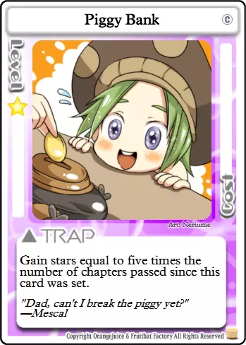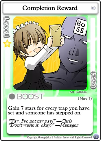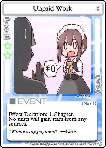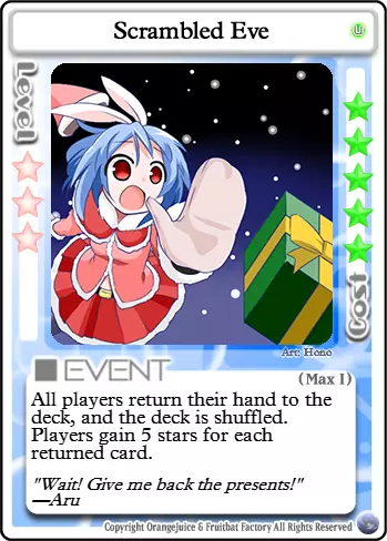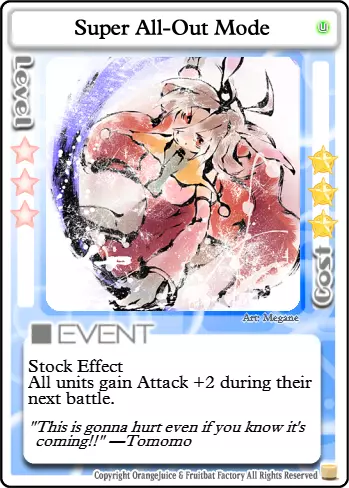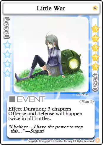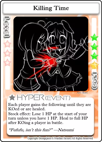 消磨时间 类型:事件 等级要求:3 消耗:13 每位玩家获得以下效果,直至其被击倒或被治疗。 常驻效果:在你的回合开始时失去1点生命值,除非你仅剩1点生命值。在战斗中击倒一名玩家后,恢复至满血。 让我们来玩一场杀戮游戏吧。每位玩家的生命值每回合都会缓慢流失。多么麻烦啊。幸运的是,有一种简单的获胜方法。唯有鲜血能让你摆脱这一诅咒。击倒另一名玩家将使你恢复活力,让你在面对虚弱的对手时占据优势。当然,你们也可以互相放过,回家疗伤,但你真的能信任他们吗?即便是最弱小、最温顺的生物,在面对死亡时也会露出獠牙。你的敌人会不择手段地活下去,而我的笑容从不说谎。我的刀若找到你,会让一切迅速结束,你会怎么做? 为了游戏顺利进行,设施内严禁出现任何食物。进食是不被允许的行为,会破坏所有人的游戏体验。 游戏阶段 【第一关】此时,除了【海鸥之云】外,夏海无法使用许多她需要的卡牌来削弱对手,否则会阻碍自身升级。通常来说,更安全的做法是保留星星和卡牌,尽快集齐10颗星星进入第二关。如果对手运气不佳,生命值大幅下降,在不浪费过多资源的前提下,不要手下留情。 【第二关】现在你可以使用夏海最强大的卡牌之一:【无差别火力支援】。此外,敌人现在可以使用大部分战斗卡牌,这让它们在战斗中更加大胆。现在你可以开始策划击杀其他玩家,但要确保这样做的收益是值得的。 3-4级 结合【无差别火力支援】和新解锁的【杀戮时间】,你的对手将需要谨慎行动。记住,这两张卡牌也会对你产生影响。尽量待在你的目标身后,以免猎人反成猎物。 5级 这里唯一的真正变化是,你现在可以在不使用【力量代价】的情况下强行打出【封印守护者】。如果你能通过使用它来恢复星星,或者能连续击杀多个对手,那么50星星的消耗可能是值得的。 Boss 夏美喜欢Boss。它们体型庞大、凶狠无比,被击杀时会掉落大量星星和胜利点数。尽量远离 Boss 的攻击范围,直到其生命值较低,比如只剩 1-3 点 HP。否则,你可能会在承受巨额反击的同时,为其他玩家削弱 Boss。相反,应突袭那些误闯 Boss 领地且生命值已损失 1-4 点的玩家。 卡组构建概述 S:必需。具有极强的协同效应或角色发挥作用所必需。(注:并非每个角色都有此类卡牌。) A:强力。优先级高,通常会加入卡组。 B:非常优秀。非必需,但应始终纳入考虑。 C:普通。不错的卡牌,但可能被其他卡牌超越。也包括情境卡牌。 D:较差。对对手的帮助大于对你自己。 F:糟糕。携带这类卡牌实际上是在伤害自己。概览 不分青红皂白的火力支援 生死关头 冲刺!远程射击 美好礼物 强制复活 哦我的朋友 弹药耗尽 风之附魔B 最终之战 瑞比特伏击 突袭 后门交易 拟态 热情研究 海鸥之云 小小战争 派对时间 神明的游戏 封印守护者 波波阵型 嗜血 迷路的孩子 走开 热度300% C加速 超级延伸 彩虹色圆环 孤独战车 悦耳铃声 加速天空 礼物交换 圣夜 混乱前夕 我们是瓦鲁达 幸运符 掠夺者波波 力量的代价 不幸符 火焰喷射器 危险布丁 再来一次 交换 火焰喷射器 米缪之锤 小猪存钱罐 礼物小偷 公主特权 天空餐厅“普雷斯” 深夜悲剧 通缉D 孤注一掷的改造 护盾 战术撤退 完成奖励 情绪失控 绅士之战 路径阻挡者 总统的特权 僵硬水晶 甜蜜破坏者 宝藏小偷 四处游走 恐怖招揽 宁静寂静 星爆之光 无偿工作 糟糕布丁 为了玩具店的未来 我想见你 入侵 叽叽游行 封印记忆 F 大玛格南 商业的阴暗面 扩展 我着火了! 便携布丁 反转属性领域 快速恢复 护盾反击 严肃战斗 布丁 咲的曲奇 晚餐 超级全力模式 金属硬壳 S级卡片 图像 名称 评价