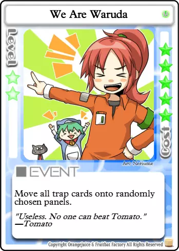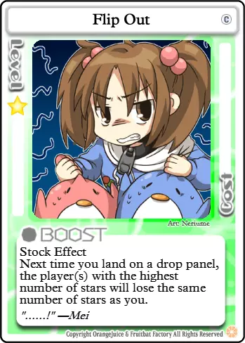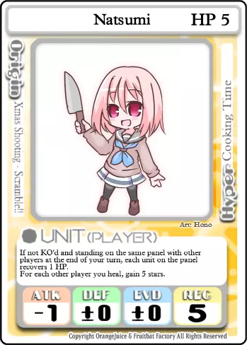 生命值:5 | 攻击力:-1 | 防御力:0 | 闪避率:0 | 恢复力:5 若未被击倒且在回合结束时与其他玩家处于同一格子,则该格子上的每个单位恢复1点生命值。 每治愈一名其他玩家,获得5颗星星。 夏海的属性分布略低于平均水平,与QP的属性相同,但攻击力低1点。虽然她的防御属性使她具有不错的生存能力,尤其是配合她提供的治疗效果,但她的负攻击力修正和治疗被动技能会使她很难击倒对手,除非依靠幸运骰点或攻击生命值极低的目标。尽管这让夏海难以自卫,但也使她可以攻击敌人,目的是对他们造成少量伤害,然后通过被动技能将其治疗回来。不过在这么做的时候,选择不会对你造成大量伤害的目标很重要。攻击攻击性角色可能会让你在他们反击时难以招架。闪避型角色通常不值得攻击,除非他们已经积累了伤害。夏海的-1攻击力对他们来说很容易闪避,这会导致你无法获得治疗。坦克是最适合攻击的目标,因为他们能轻松承受攻击,很难闪避,而且攻击力也不高。 夏海有两个被动技能来弥补她糟糕的属性。第一个技能是在你的回合结束时,如果你没有被击倒且你的格子上至少还有另一个单位,你和格子上的其他所有单位都会恢复1点生命值。即使其他单位已被击倒或无法被治疗,此效果仍会触发,但只会治疗存活的单位。即使面板上没有其他单位能够被治疗,你仍会恢复1点生命值。 第二个被动技能使夏海在支援对手的同时有机会获胜。每当夏海治疗另一个单位时,她获得5颗星星。这包括来自她被动技能的治疗以及“晚餐”等卡牌效果的治疗。获得的星星数量是固定的,每次治疗触发一次,与治疗量无关。用“晚餐”为对手恢复3点生命值与用被动技能为对手恢复1点生命值获得的星星数量相同。如果同一效果治疗了多个对手,该效果可以多次触发。对手必须实际恢复生命值,你才能获得星星。因此,如果对手已处于满血状态或无法被治疗,你将不会获得任何星星。自我治疗不会触发此被动效果。超级卡牌