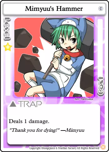 我需要一个怪物来痛扁那个QP 这是一个不如米米优之锤可靠的替代选择,而米米优之锤本身因为是陷阱卡所以也并不可靠。这张卡的效果很大程度上取决于出场的角色,只有三分之一的概率会出现具有正面攻击力的单位。