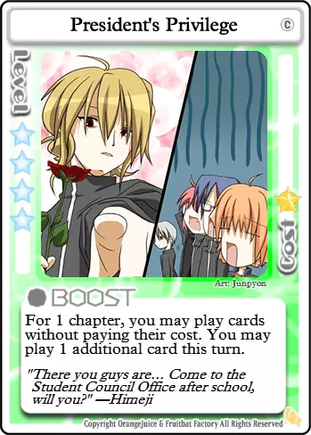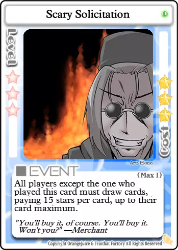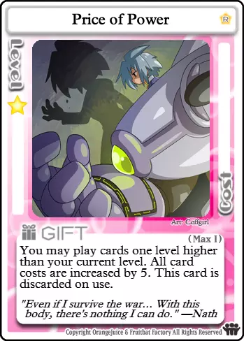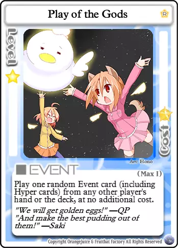 这是我的卡牌!它是为我量身打造的!(刺击声愈发密集) 打出此卡时,可搭配【神明的游戏】和/或【总统特权】来抵消其高昂的星数消耗。若不在乎星数,也可使用【力量的代价】。