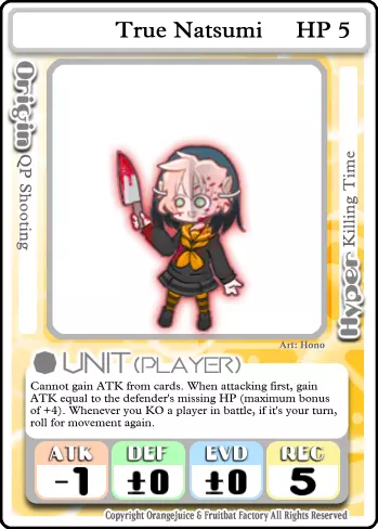生命值:5 | 攻击力:-1 | 防御力:0 | 闪避率:0 | 恢复力:5 无法通过卡牌获得攻击力。 先手攻击时,获得等同于防御方损失生命值的攻击力(最大加成+4)。 每当在战斗中击倒一名玩家,若当前为你的回合,则再次进行移动掷骰。 夏海的初始攻击力仅为-1。但她对敌人鲜血的渴望会根据敌人当前受到的伤害量提升自身攻击力。当敌人受到4点或以上伤害时,她最多可获得+3的攻击力加成。请注意,此加成仅在她先手攻击时触发,因此(除了伊琉和雪莉之外)主动发起攻击的敌人将在战斗中对你拥有巨大优势。此增益还能让她更有效地对抗高生命值单位,例如【玛丽·波普】,这类单位能更快提供最大增益且通常防御力较低;而对低生命值单位效果较差,例如【皮特】,这类单位提供的增益小得多。 由于这个极强的攻击增益,夏美无法通过卡片提升攻击力。像【大口径麦林】这样的战斗卡片以及【超级全力模式】之类的活动卡片对她来说基本无用。不过,设定她属性的效果可以提升其攻击力,因为这些效果并非专门为该属性提供增益。在对手没有受到伤害时,【属性反转领域】和【认真战斗】理论上可以提升她的攻击力。 她的最终被动技能允许她在自己的回合通过战斗击倒对手后再次移动。若她在其他玩家的回合受到攻击,或使用了如“绅士对决”之类的结束回合战斗卡,则此被动不会触发。该被动使得“冲刺!”等移动加成效果在所有对手都处于虚弱状态时变得极为强大,让她能够对低生命值的玩家进行连续击杀。由于她的攻击力较低且无法通过战斗卡提升攻击力,因此很难拿到第一滴血,所以携带大量战斗外伤害卡以充分利用其技能组合也很重要。 【超武卡】