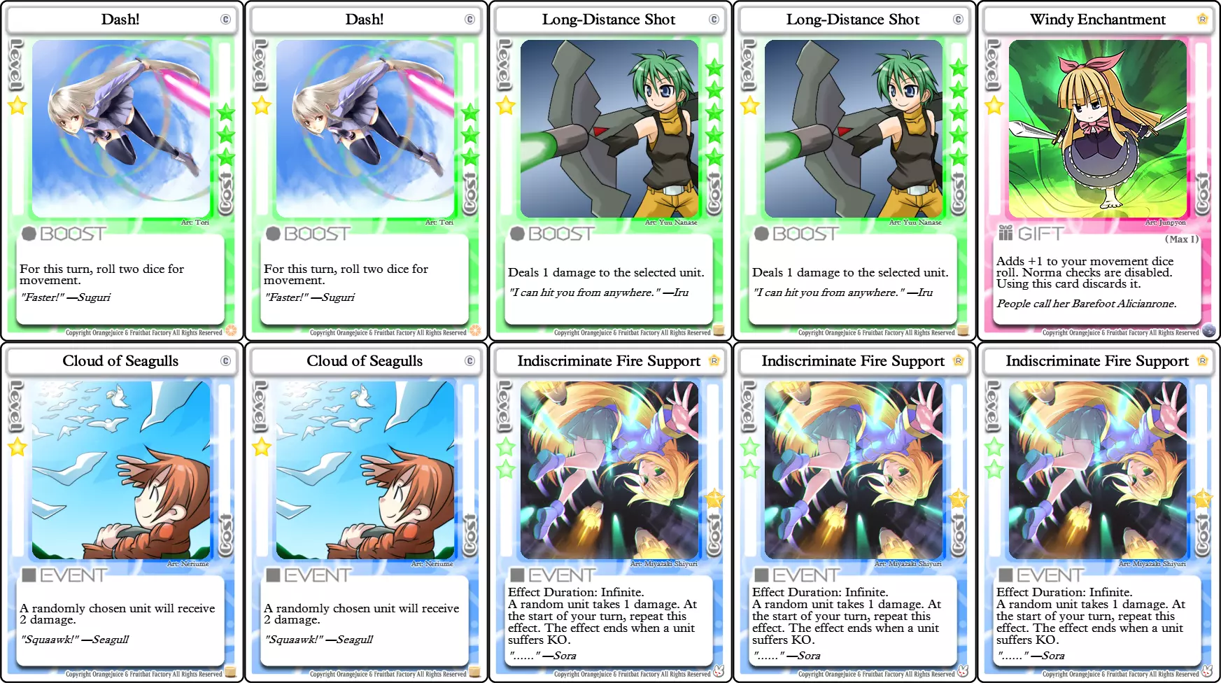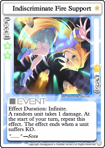 你需要一架更大的飞机 此卡牌不会阻止【Killing Time】,因为它不被视为伤害,但会阻止【Indiscriminate Fire Support】和她的其他伤害卡牌,这是绝对不行的。 示例套牌 寒蝉鸣泣之时