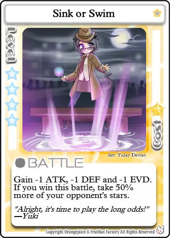 我们都在这下沉 由于夏美的被动攻击加成,生命值为1或2的对手不会构成太大威胁。这张战斗卡能让你从虚弱的对手身上获取更多收益,但对于拯救他们并没有什么特别作用。不过不要携带超过一到两张,因为这张卡实际上并不能帮助你将对手打到那种状态。