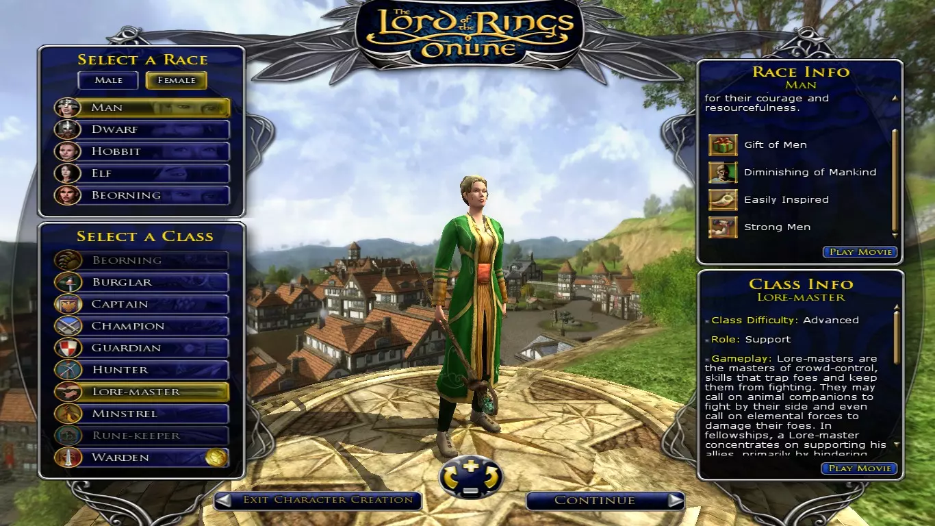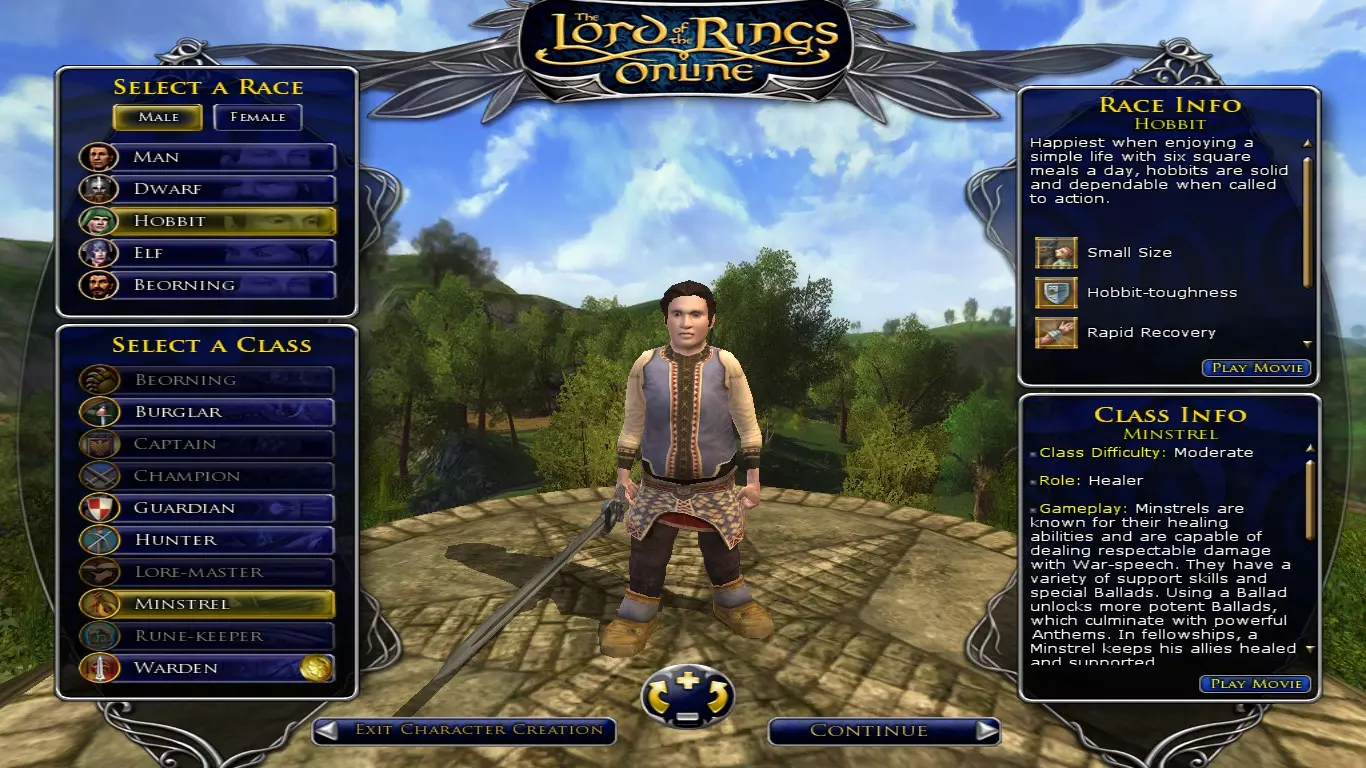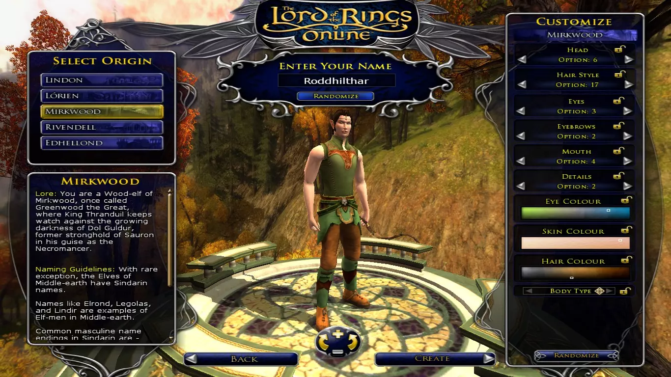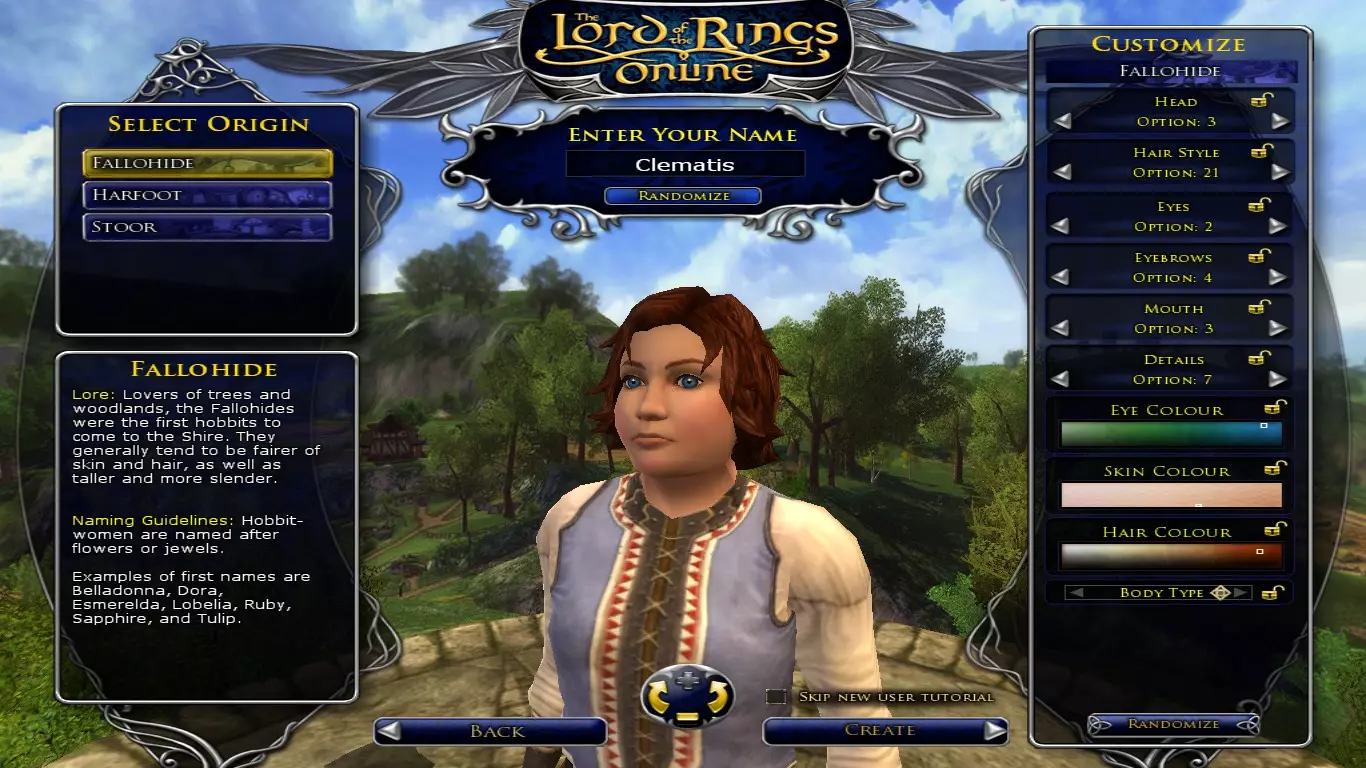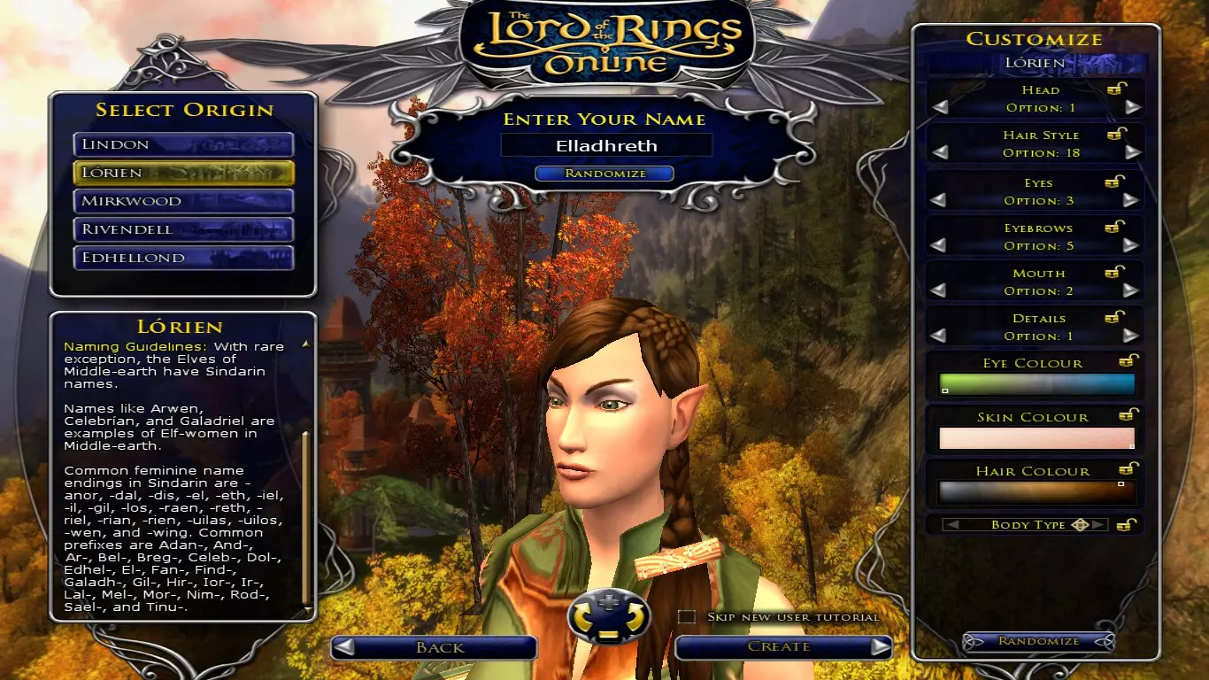 就算你迫不及待想开始游戏,也请不要急于创建角色。角色的外观看似无关紧要,但如果你真的喜欢这款游戏并决定长期使用这个角色,你会经常看到它,所以确保你不会讨厌矮人那圆鼓鼓的鼻子,或者精灵女孩瘦得像厌食症患者的样子。在游戏中你可以改变发型、发色和 facial hair(面部毛发),但无法改变现实中不容易改变的特征(也不允许增减体重)。所以请花几分钟时间确定你对角色的外观是否满意;即使你觉得我强调这点很奇怪或肤浅,我保证这比听起来重要得多。名字也一样可以更改,但并非免费(需要995 LOTRO点数,你可以选择购买,或者在游戏中通过大约一百小时的刷取来获得这么多点数)。