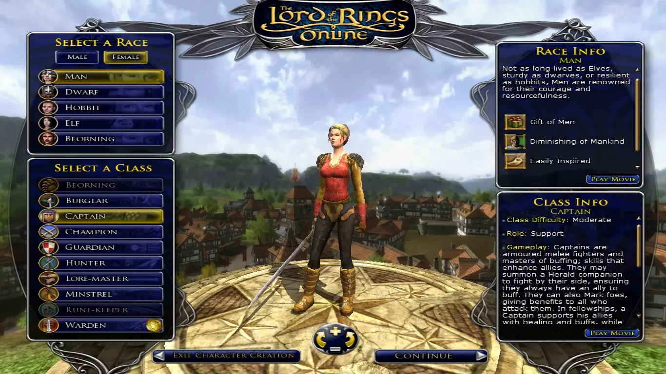 至于三个“特质树”,它们都旨在通过不同方式最大化伤害输出。首先,你可以选择一个机动、中距离、单体目标的流派(蓝线)——这个流派过去有点不尽如人意,但在几个更新前得到了大幅增强,所以现在这个特质树表现出色。这是我日常使用的首选,因为你可以轻松风筝以保持安全,几乎不会受到伤害,这正是猎人应有的特点。第二个(红线)特质树是一个静态、远程的强力输出流派,同样针对单体目标。基本上,你站在原地释放强力攻击,(希望能)在敌人到达你面前很久之前就将其击杀。最后是(黄色)范围伤害/群体控制流派,该流派专注于布置陷阱(所有猎人都能布置陷阱,但除非选择此流派,否则一次只能布置一个)。放置各种陷阱并将一群敌人拉向自己。大多数敌人会被陷阱困住,这样你就可以从容地逐个解决他们。 与其他两个基础难度职业不同,这里有一个绝对优势的种族选择。无论你选择哪个特质树,都需要最大化远程伤害输出,而精灵的种族特质能提升5%的弓箭伤害。(精灵还能获得不错的敏捷加成,这在前期有帮助,但到20-25级时就不那么重要了)。其他种族提供的任何加成都无法与5%弓箭伤害提升相媲美,因此【精灵】无疑是首选。不过话又说回来,如果你真的喜欢霍比特人、矮人或人类,那就选它们吧——你的原始伤害可能会略低一些,但你可能会玩得更开心,所以不要因为我说精灵是输出职业的唯一选择就放弃选择你想玩的种族。 (抱歉猎人部分有点冗长——关于猎人确实有很多东西要讲,因为他们有很多能提供帮助的非战斗技能。接下来的大部分内容会是相似的,因为从这里开始,角色的复杂度只会不断提升) 2. 中等难度选择 在 solo 方面,我认为基础难度和中等难度的角色在操作难度上没有太大区别。然而,当你进入需要与其他玩家组队的阶段时,这些职业确实拥有更广泛的职责选择,或者说它们在队伍中的职责会比单纯的坦克或输出更加复杂。另一方面,如果你打算在 solo 时坚持走输出路线,吟游诗人(Minstrel)其实和任何基础职业一样简单直接(而且乐趣十足!)。所以,如果你是《指环王 Online》(LOTRO)的新手,甚至是整个 MMORPG 的新手,不要排除这两个职业,因为当你准备好组队时,你对游戏和自己的职业都会有更深入的理解。 队长(Captain) - 万金油(样样通但样样不精,但仍然非常有用)。- 近战/召唤者/治疗者/辅助者 - 仅限男性 - 穿戴重型盔甲,可装备轻型盾牌(但可能不建议)
