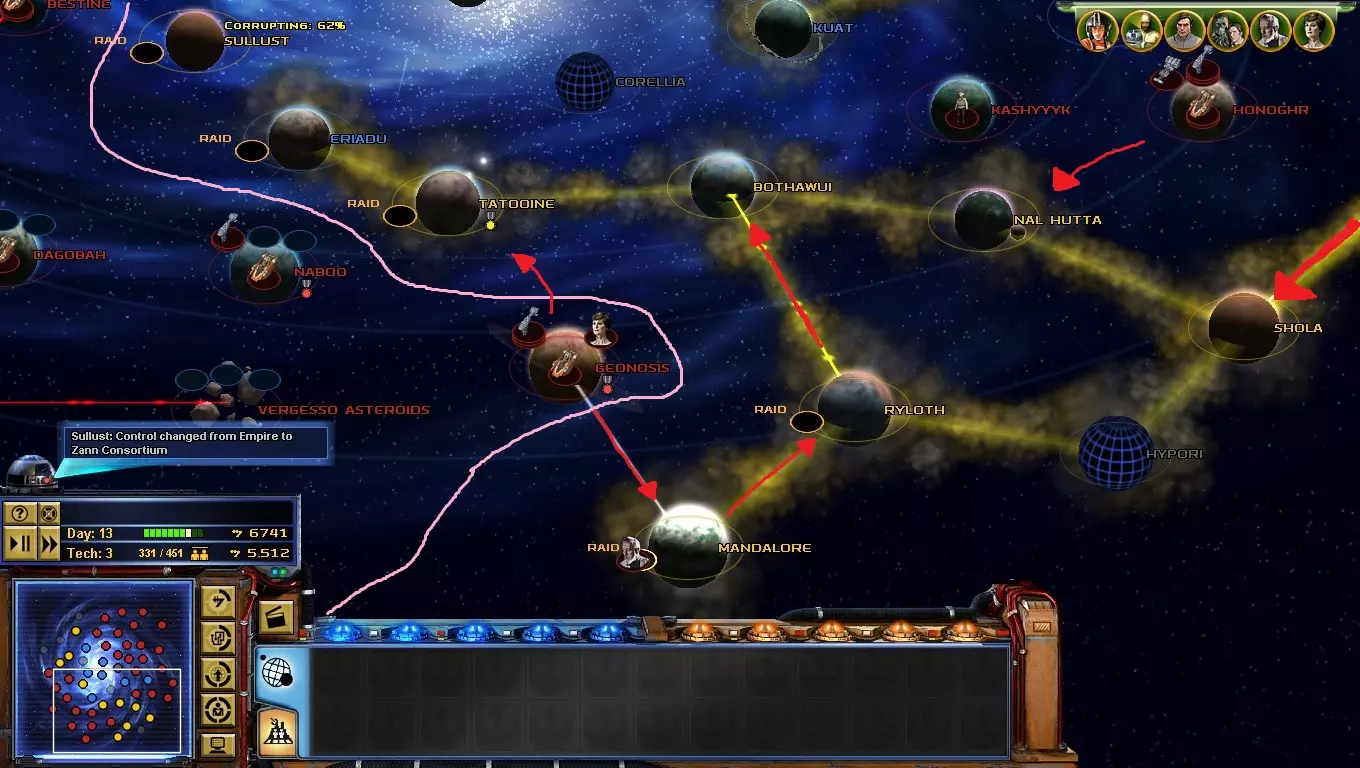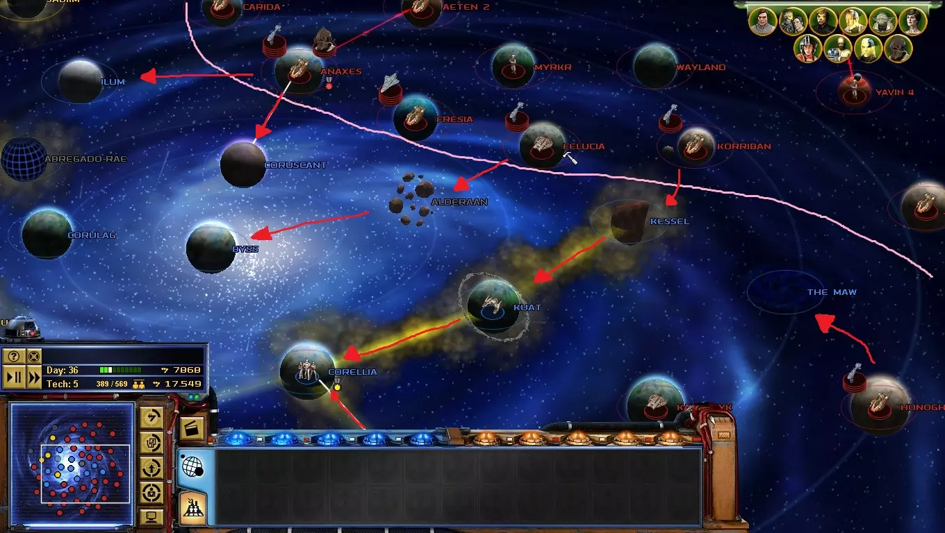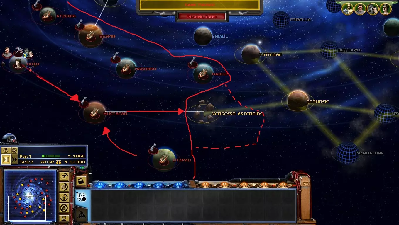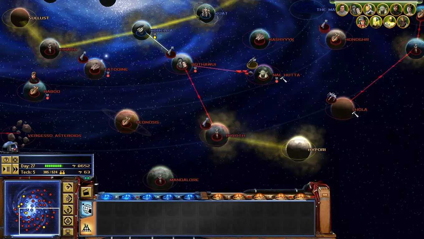 到了游戏的这个阶段,【星区联盟】是你面临的主要问题!只要发动决定性一击,你就能离胜利更近一步! 如何做到这一点?你必须突袭吉奥诺西斯、曼达洛、赖洛思、博萨威、肖拉、纳尔赫塔和塔图因……听起来很难!但你必须一个星球一个星球地完成! 不要急于求成,否则你会变得过度扩张! 祝你玩得开心! 吉奥诺西斯