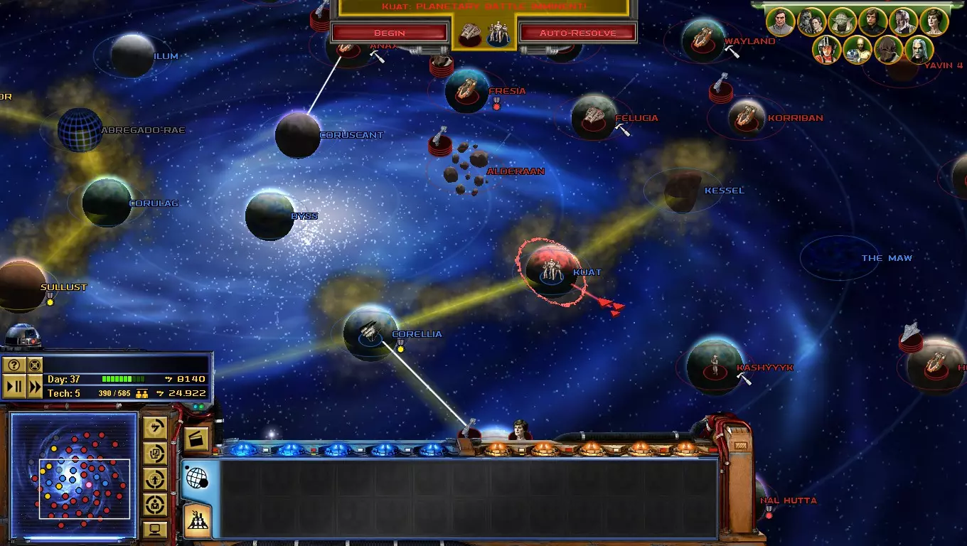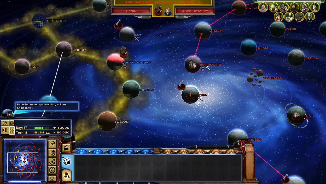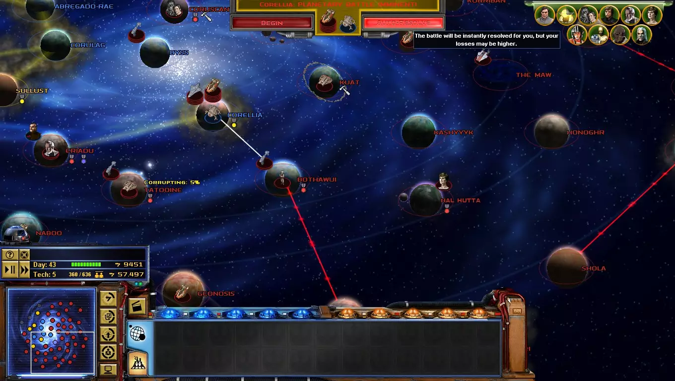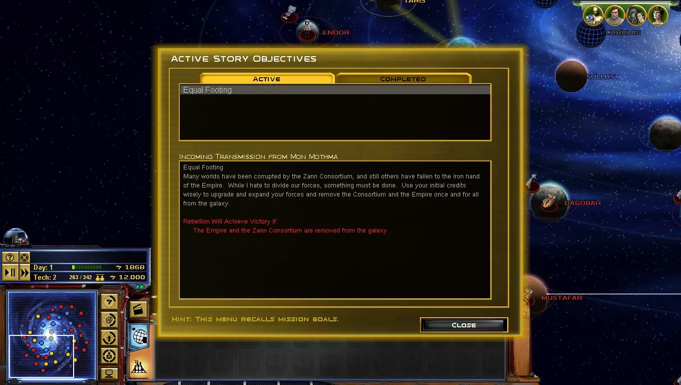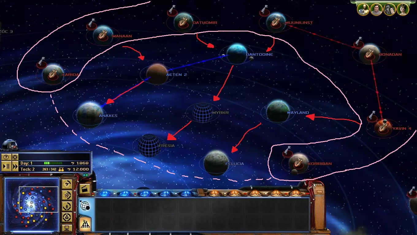 到了游戏的这个阶段,【星区联盟】是你面临的主要问题!只要发动决定性一击,你就能离胜利更近一步! 如何做到这一点?你必须突袭吉奥诺西斯、曼达洛、赖洛思、博萨威、肖拉、纳尔赫塔和塔图因……听起来很难!但你必须一个星球一个星球地完成! 不要急于求成,否则你会变得过度扩张! 祝你玩得开心! 吉奥诺西斯