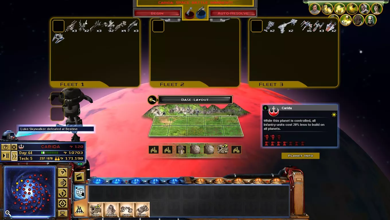 最后两个星球最为重要,要不惜一切代价加固防御。 蒙卡拉马里(允许生产主力舰) 卡米诺(免费步兵) 若被占领,按如下要求防御这些星球: 韦尔格索小行星带(仅限太空) 马瓦(仅限太空) 卡希克(仅限地面) 萨卢斯特、夸特、方多和贝斯廷(仅限地面) 仅防御指定类型!!