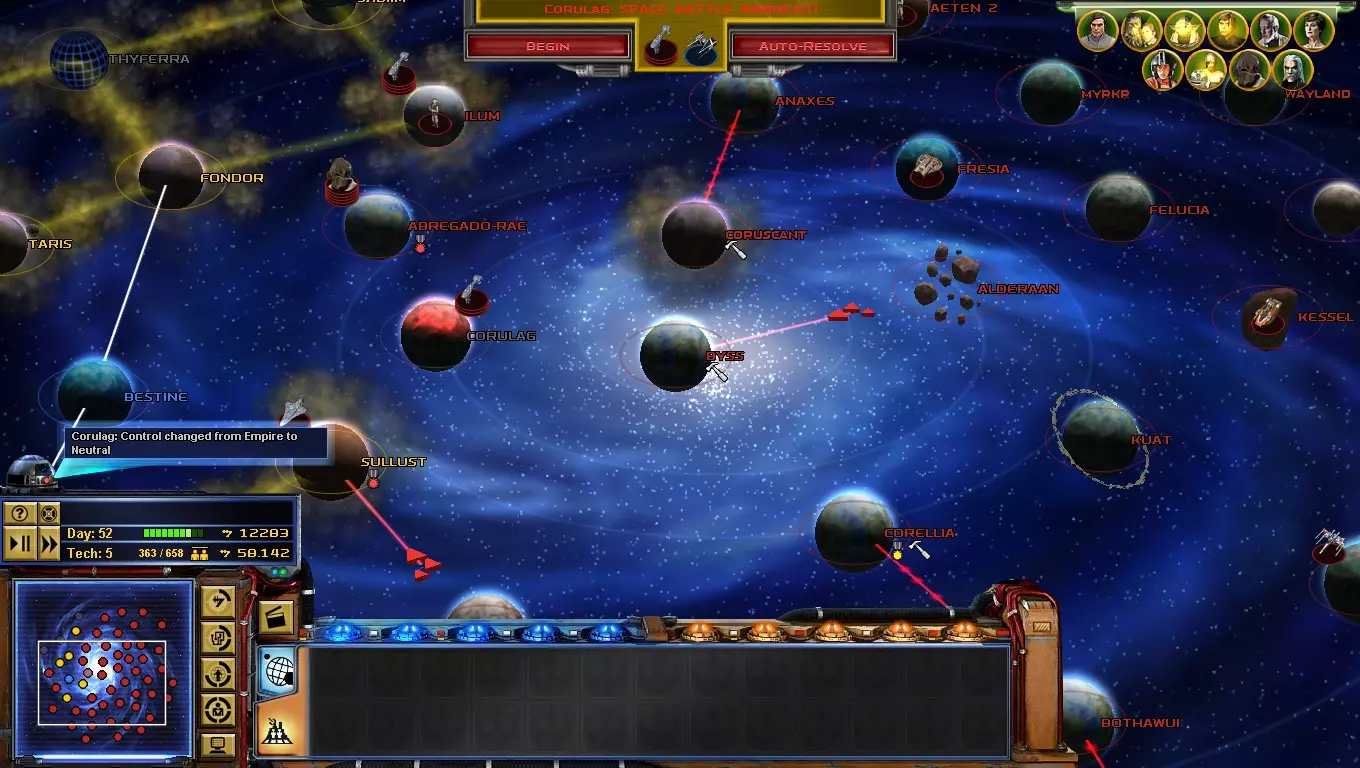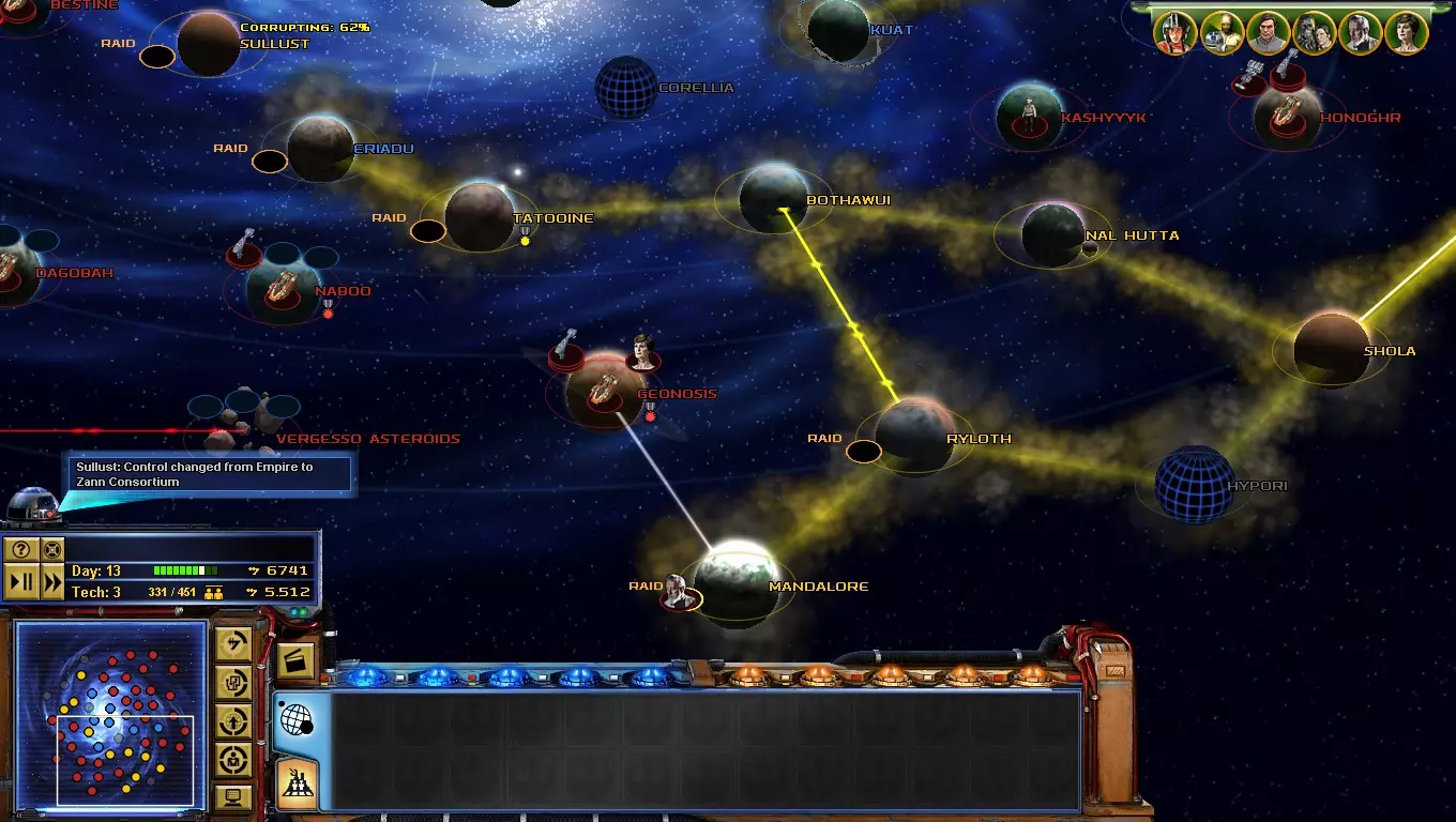 如果你的星球存在腐化现象且显示“腐化民兵”,请出售所有建筑(右键点击即可操作)并消灭他们……不过,这会引发星球革命,将你的部队驱逐出去,但如果你行动迅速,就能在两到三分钟内重新夺回该星球! 星系地图 星系